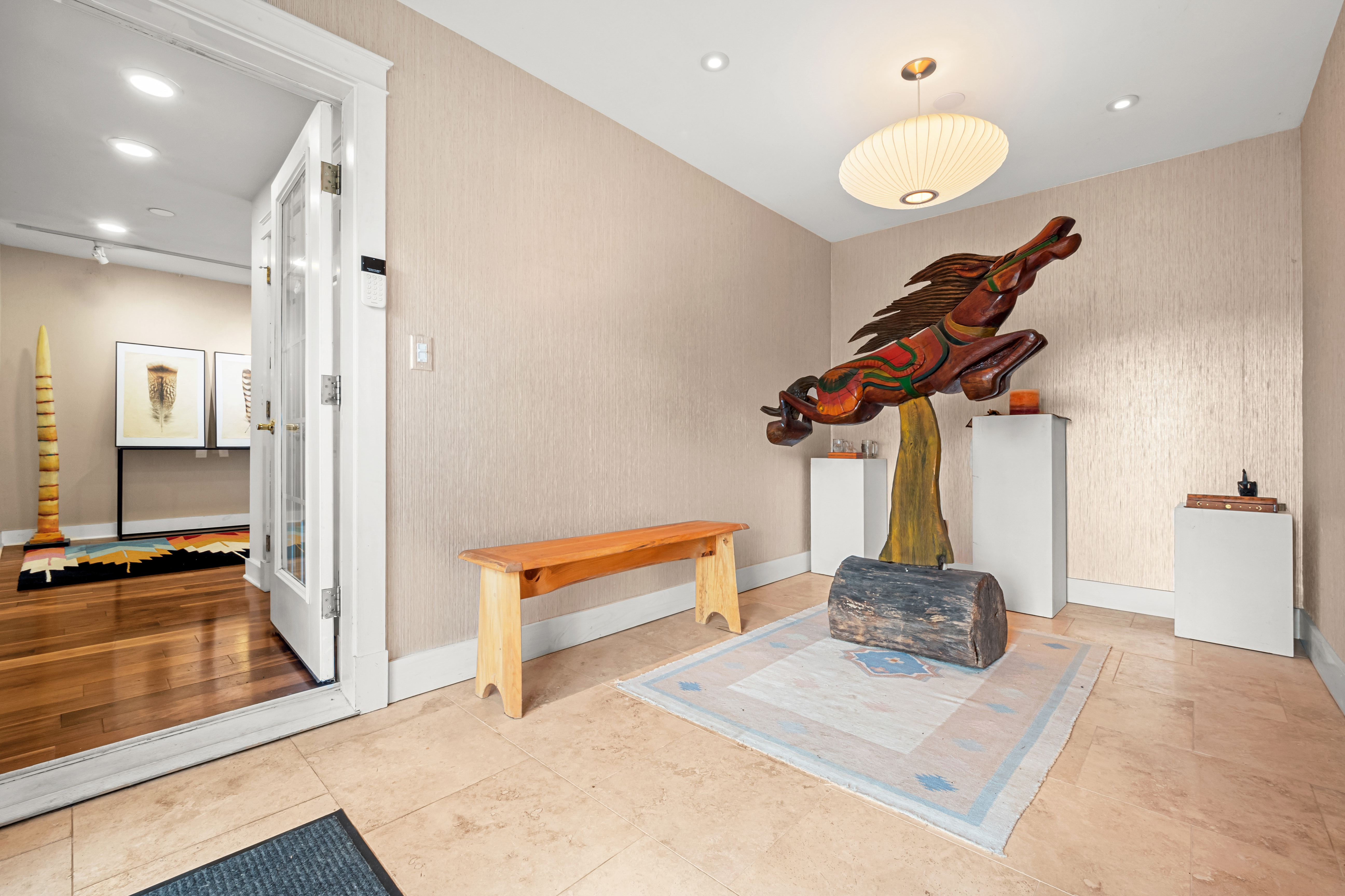 The grounds feature a private pond and a brook, both visible from various vantage points within the house. Additional structures include a four-car garage with both attached and detached options and a dedicated workshop with a potential studio loft above, making it an ideal retreat. While offering total seclusion, the estate remains minutes away from local cultural hubs and offers the unique financial advantage of Hancock's property tax rates, which are among the lowest in the region.