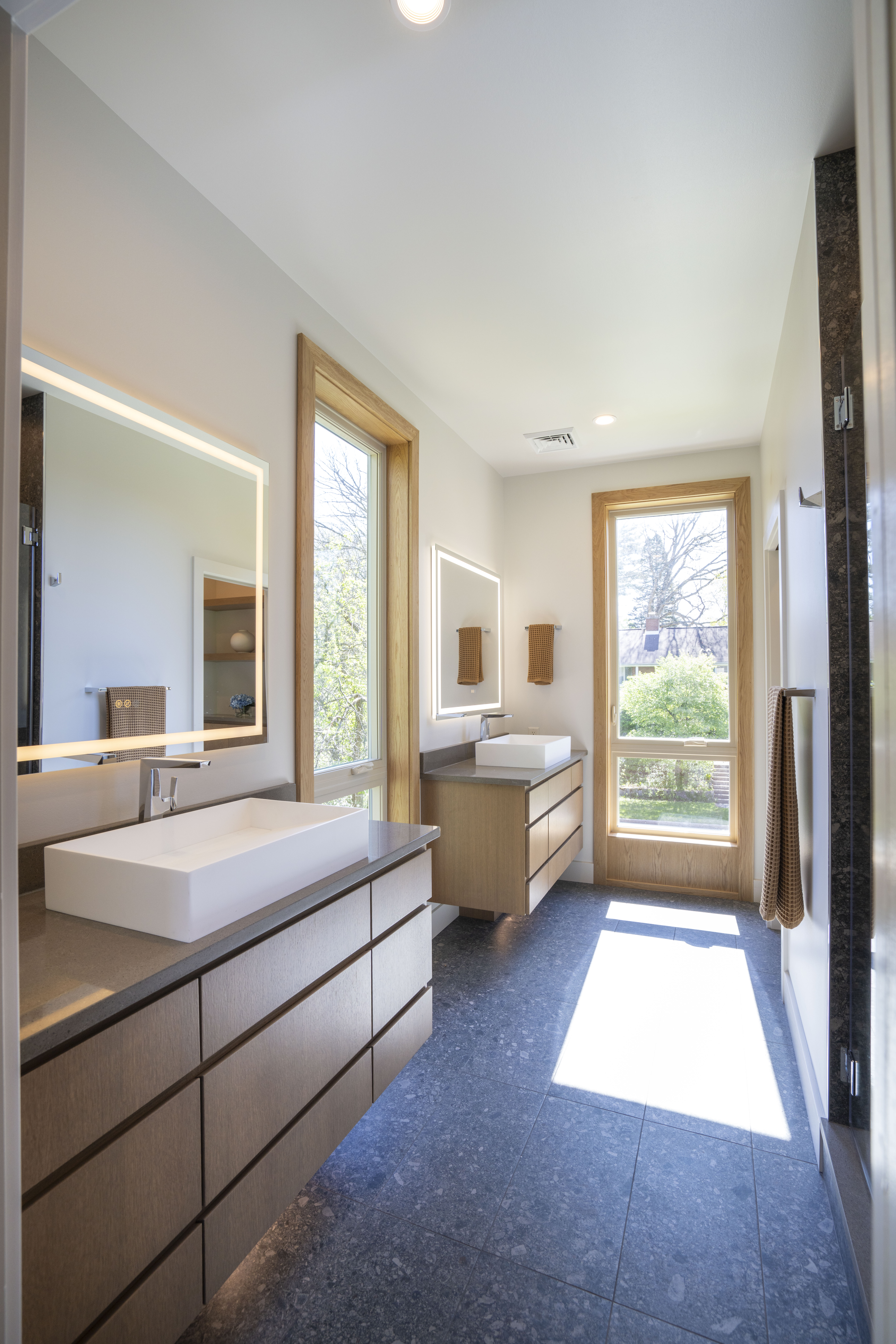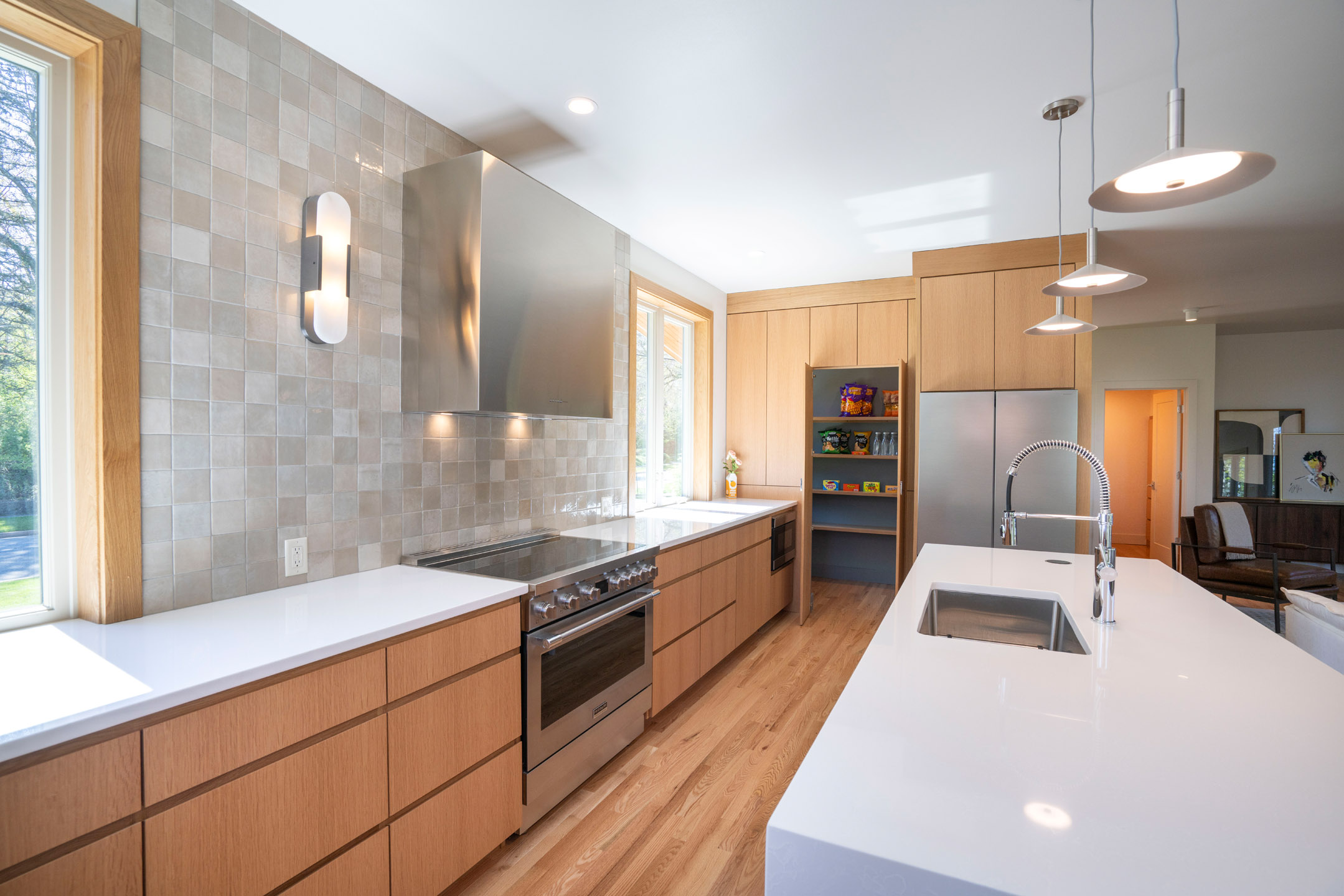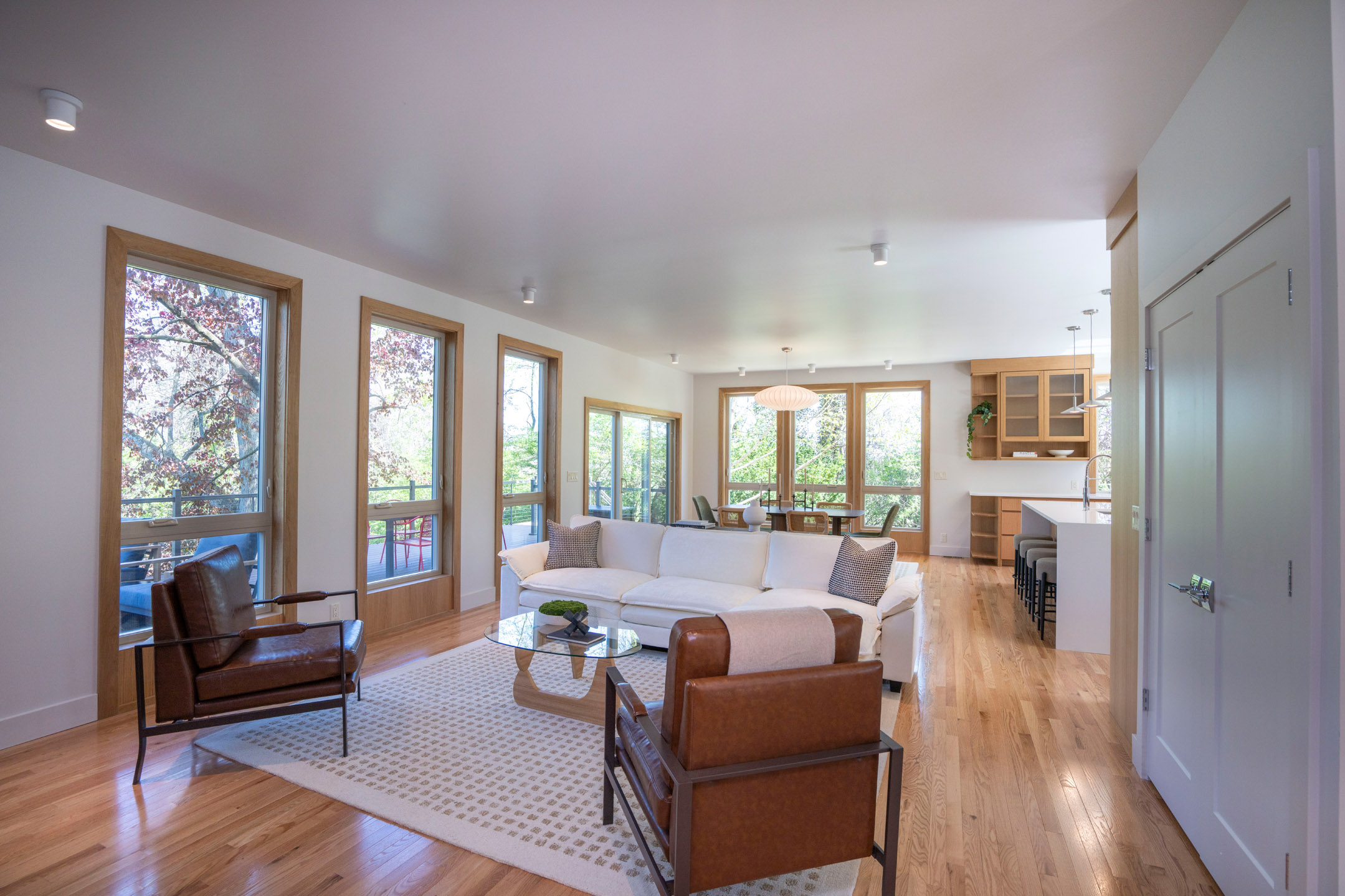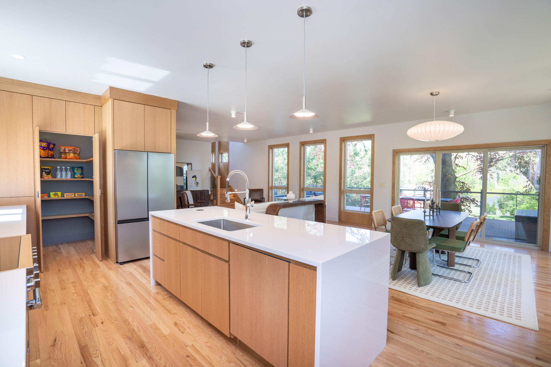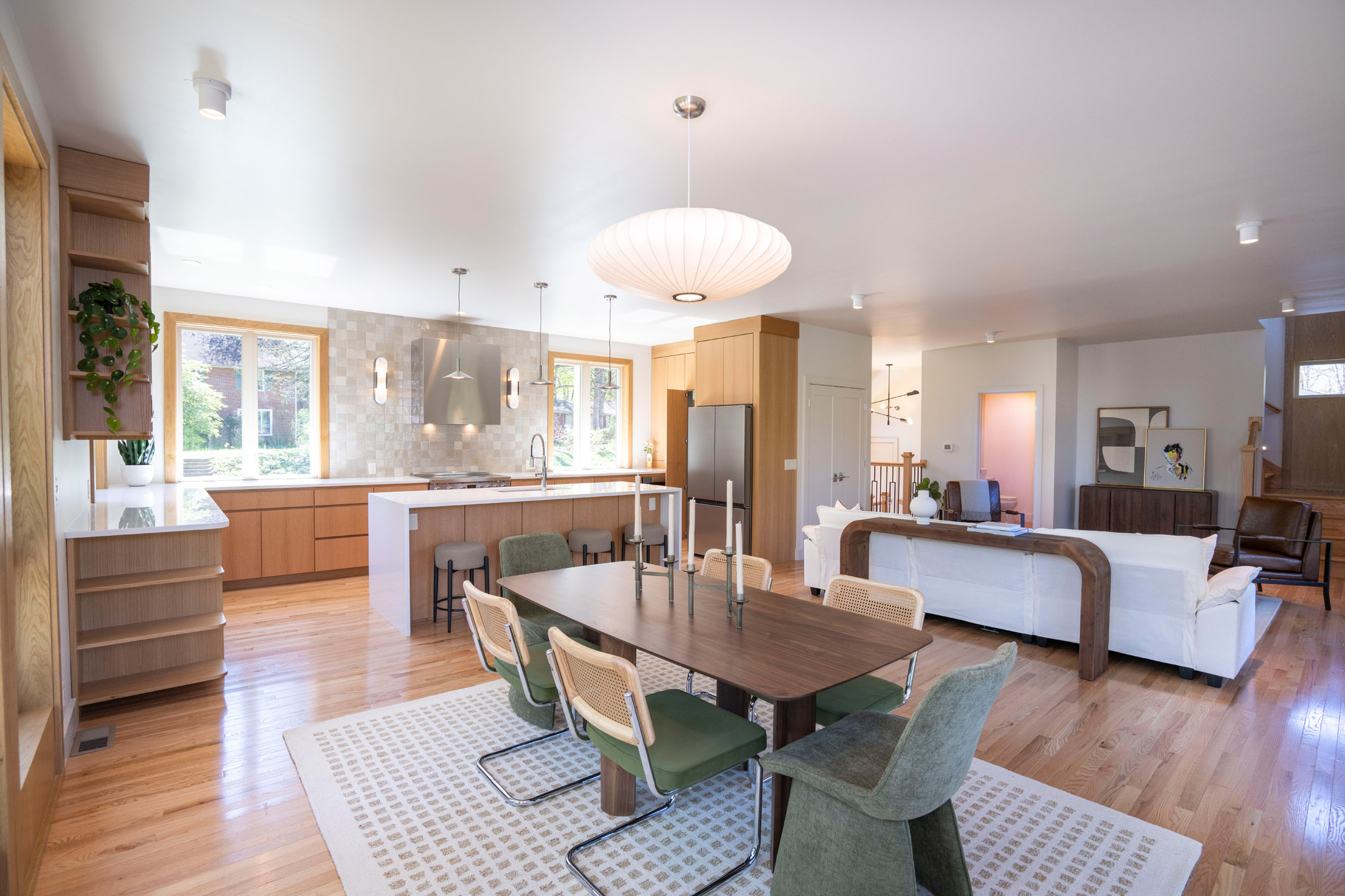 Blending architectural character with modern refinement, 435 Ferguson Avenue is a thoughtfully reimagined residence in the heart of College Heights. Originally built in 1952 and expanded and renovated in 2025, the home offers 3,036 square feet of curated living space just moments from Penn State and nearby access to the Arboretum trail system. Floor-to-ceiling windows introduce natural light throughout, framing peaceful views of the surrounding landscape. Solid red oak flooring and custom soft close white oak cabinetry—handcrafted by Amish artisans—establish a warm, cohesive interior. The kitchen is both striking and functional, anchored by a quartz waterfall island and complemented by handcrafted zellige tile, sleek appliances, and a generous walk-in pantry, all flowing seamlessly into the main living and dining areas. Upstairs, four bedrooms are arranged with intention, including a primary suite with treetop views and a well-appointed en-suite bath featuring dual vanities, terrazzo tile flooring. A secondary bedroom offers a private bath, while two additional bedrooms share a Jack and Jill layout. All full bathrooms offer radiant heat flooring. The walkout garden level provides a versatile recreation space with a service kitchen featuring refrigeration, beverage storage, and an ice maker, along with direct access to the backyard. Outdoor living is equally considered, with a composite deck, paver patio, and a generous open lawn area surrounded by mature trees. Ideally positioned near Sunset Park and Penn State’s campus, this fully reimagined turn-key home presents a rare offering within one of State College’s most established neighborhoods.