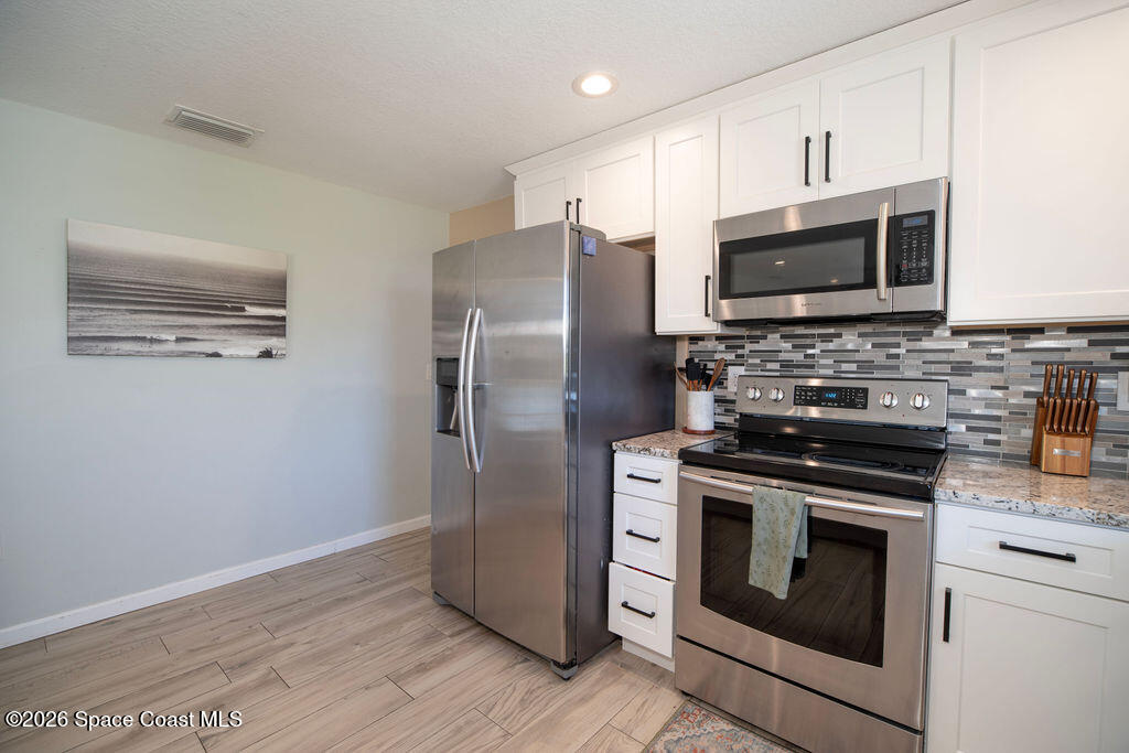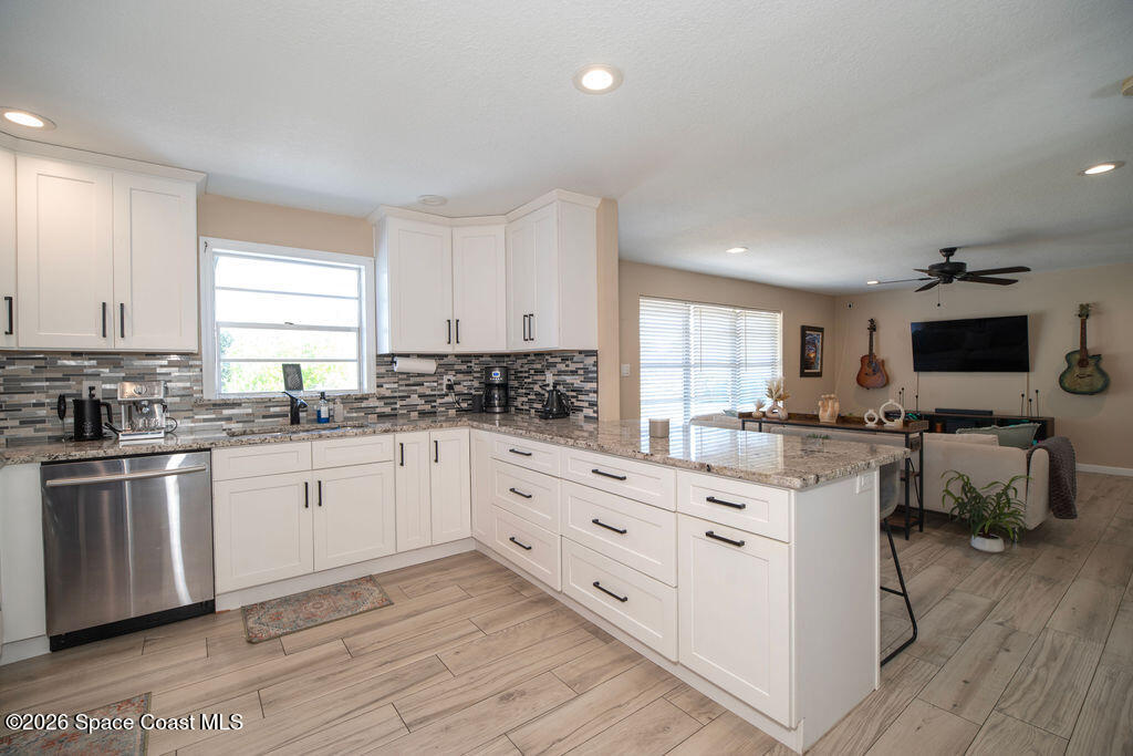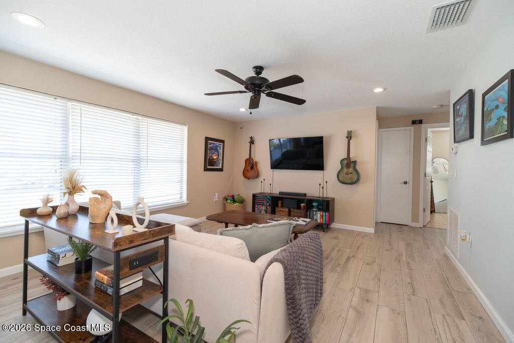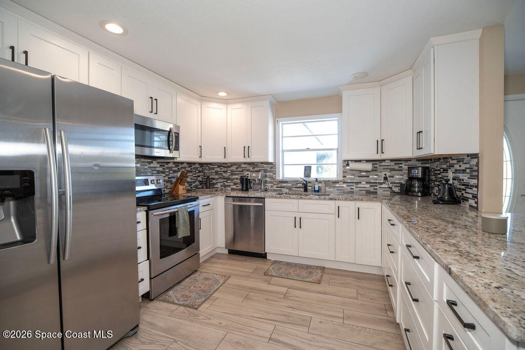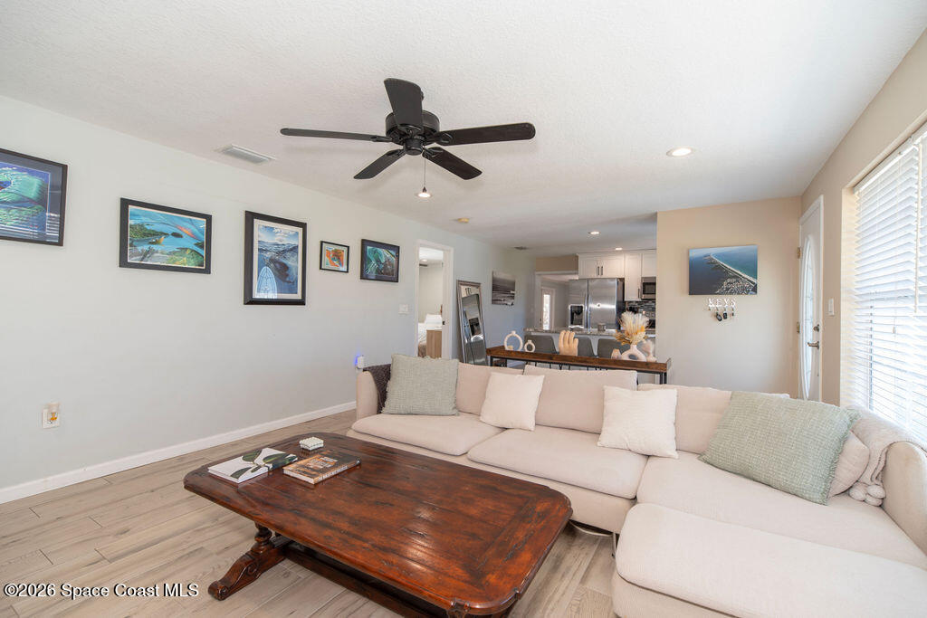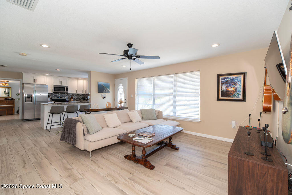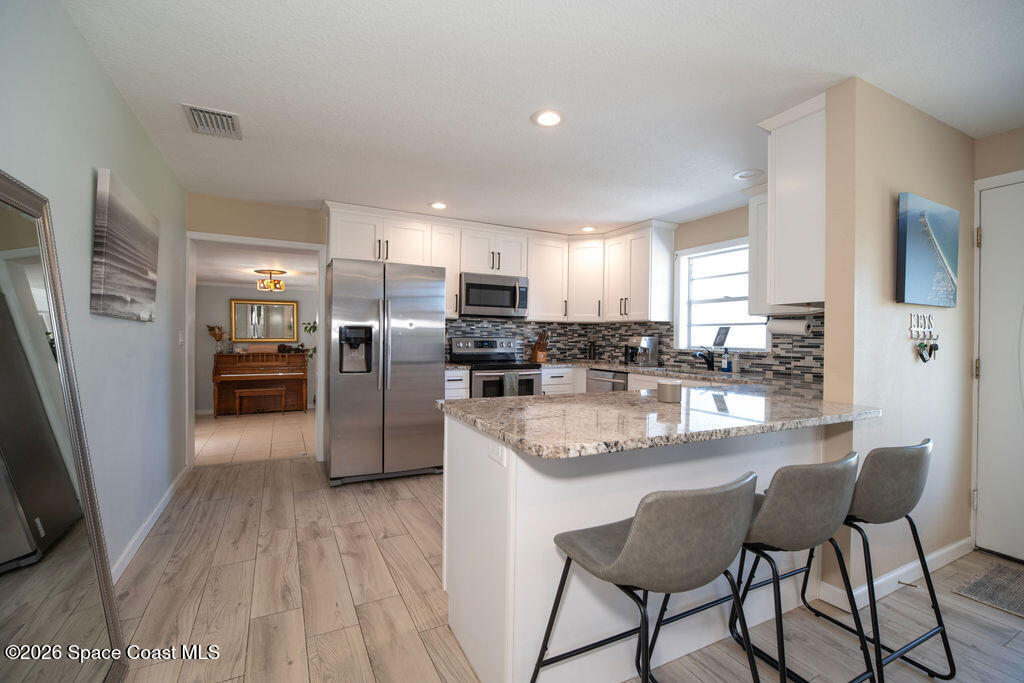 Welcome to your coastal oasis in the highly sought-after neighborhood of Indian Harbour Beach. This three-bedroom, two-bath pool home features a spacious, open floor plan, a two-car garage, and abundant natural light.The property has been completely remodeled and features wood plank tile throughout. The kitchen boasts granite countertops, crisp white cabinetry, stainless steel appliances, and a breakfast bar that flows into the family room. The master suite offers a spacious sitting area, a redesigned bathroom with a modern shower, a walk-in closet, and updated sliders opening to a peaceful tropical pool and spa.The guest bathroom includes updated granite countertops, white cabinetry, and a large tiled walk-in shower. An additional room off the kitchen provides the perfect space for a den, playroom, or workout room. This area opens to a tranquil, private oasis featuring a spacious lanai and a sparkling pool with a spa.Additional updates include a new roof (2019) and new plumbing (2020)