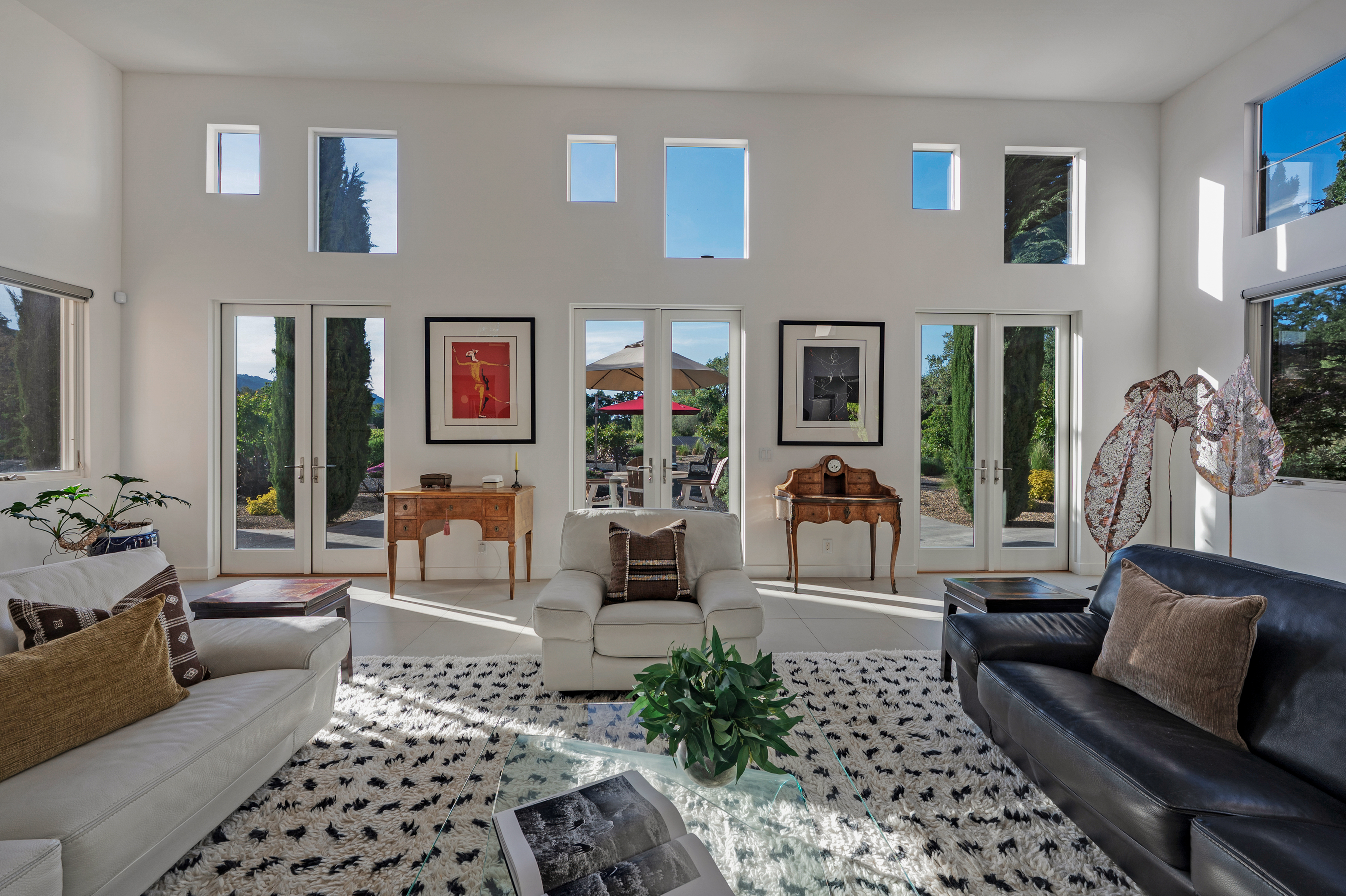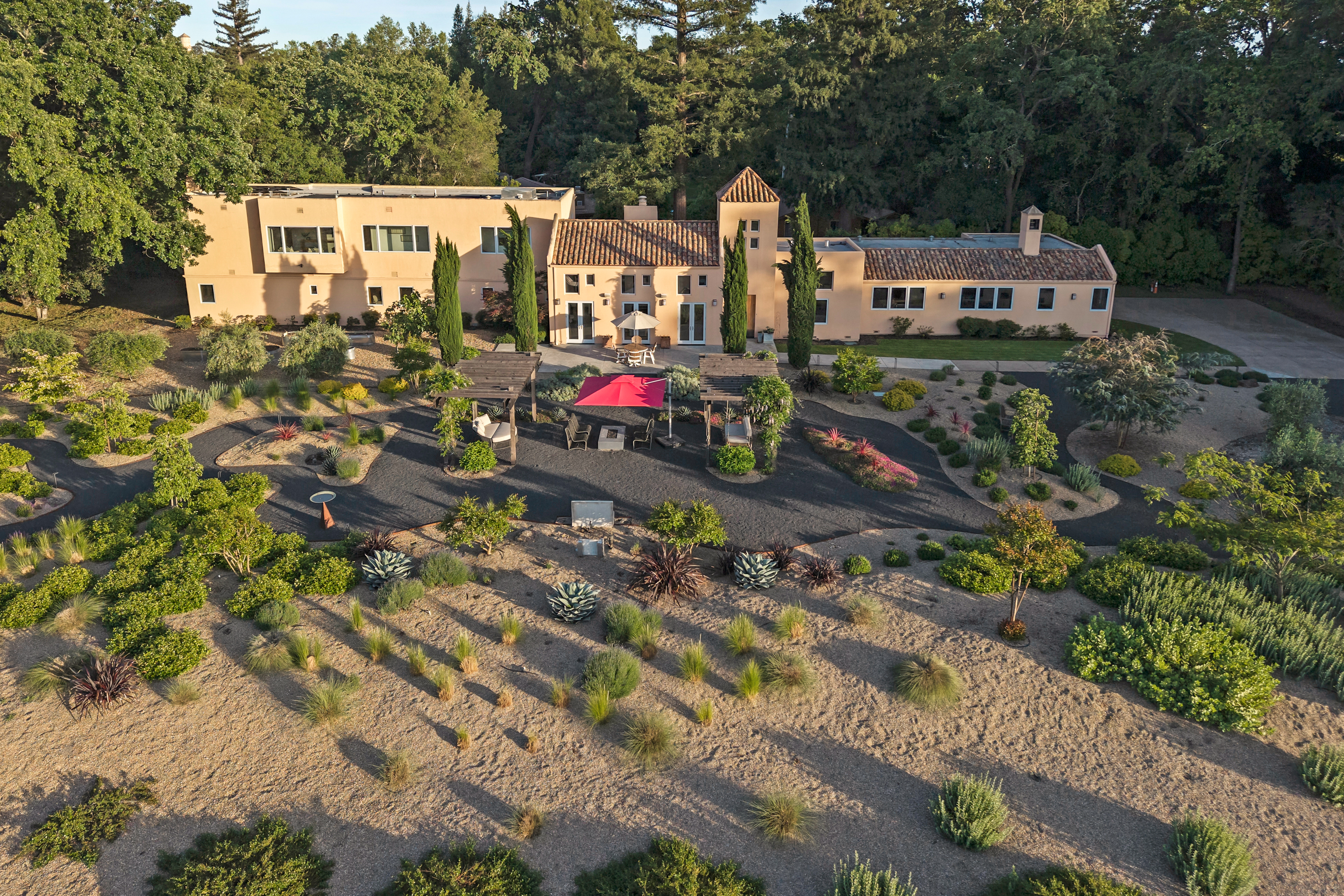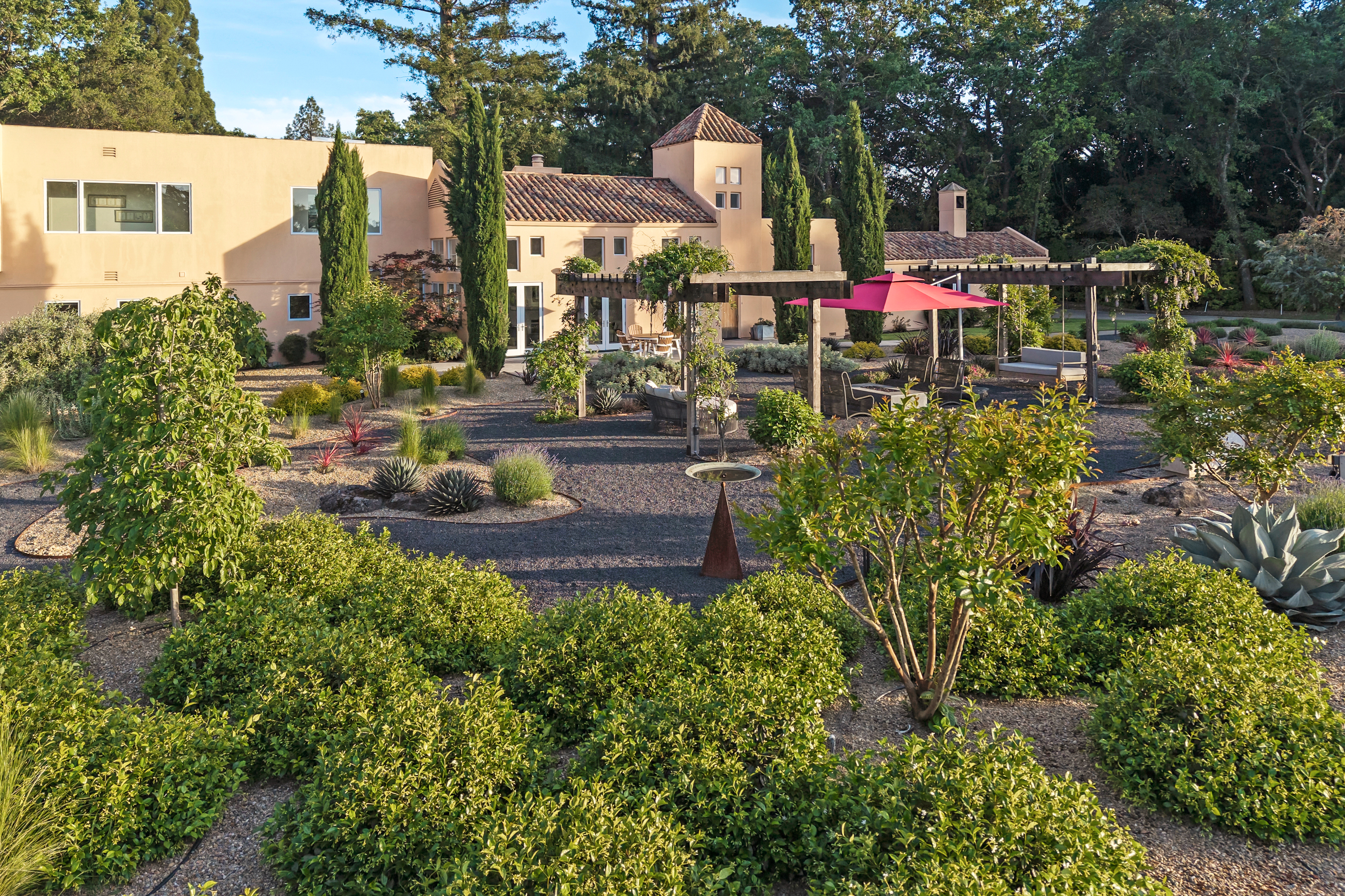Ideally located just minutes from the historic Sonoma Plaza and Glen Ellen, 942 Country Club Lane offers a rare blend of convenience and privacy. Set behind a gate on approximately 3 acres, this Tuscan-inspired villa is approached via a private road and enjoys sweeping vineyard and hillside views. The grounds are thoughtfully landscaped for beauty and ease, featuring meandering garden paths, mature olive trees, citrus, dogwood, and crepe myrtle. Outdoor amenities include two trellises, a fountain, fire pit, pergola for sunset gatherings, and a comfy bed swing. A whimsical playhouse is tucked beneath a majestic oak, adding to the property's character. Inside, walls of glass flood the home with natural light, highlighting soaring ceilings in the formal living and dining rooms. The gourmet kitchen is equipped with top-of-the-line appliances and opens to both a casual seating area and a spacious family room. Seamless indoor-outdoor living extends to the patio and outdoor kitchen with grill, burners, refrigerator, and Italian pizza oven ideal for entertaining.