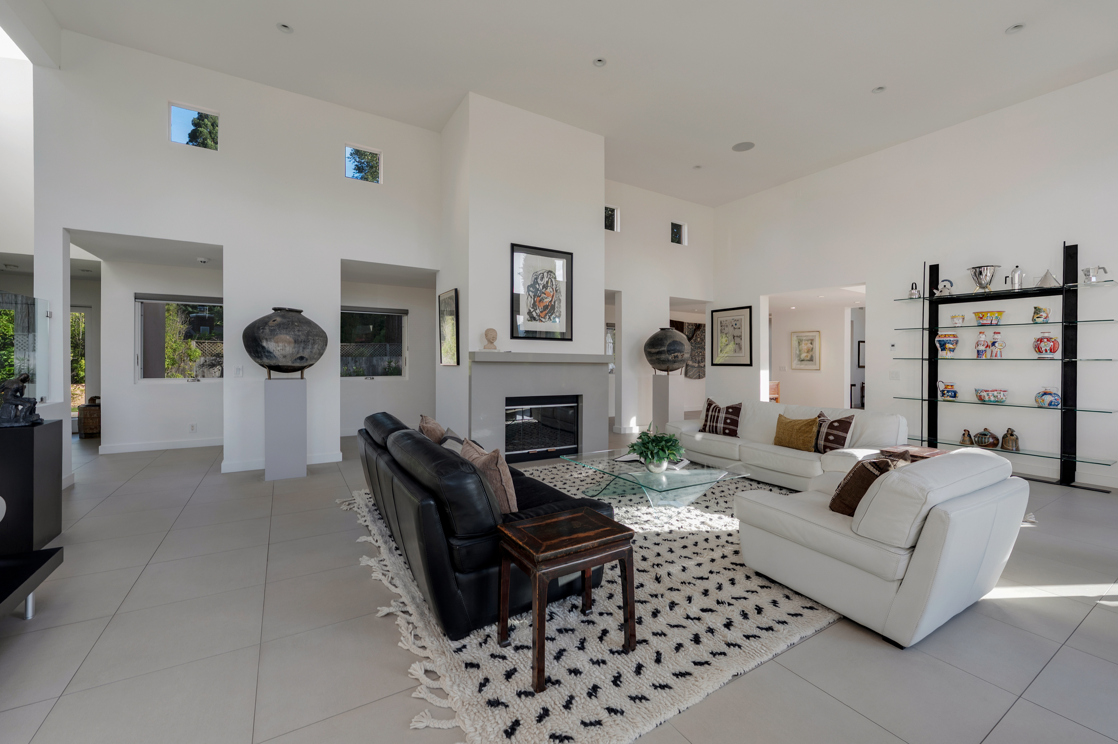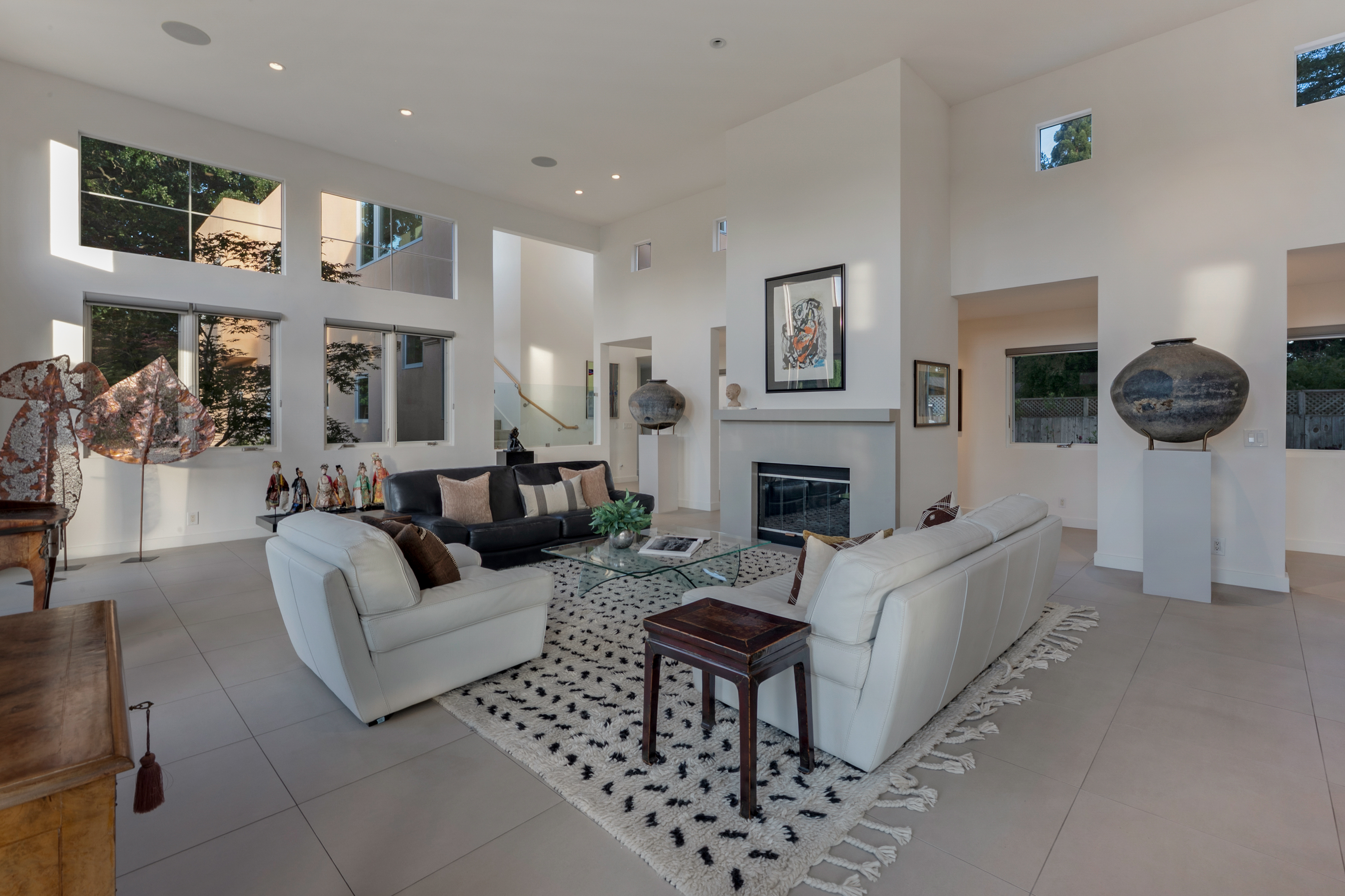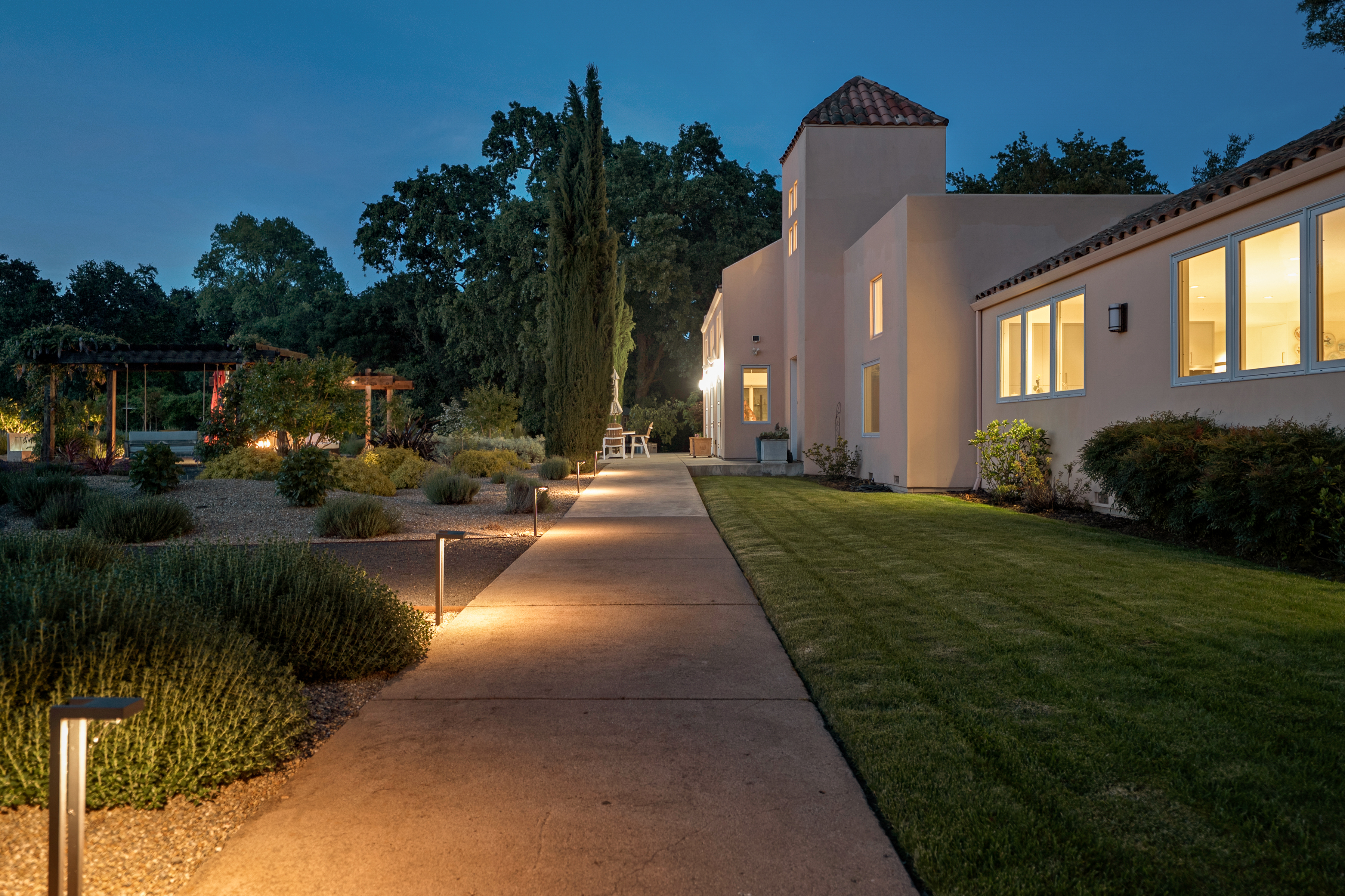 A sparkling pool completes the resort-like setting. The approximately 5,544 sq ft residence offers 4 ensuite bedrooms, including 2 on the main level. Upstairs features an additional suite and a luxurious primary suite with sitting area and custom-designed closet. A dedicated office, additional full bath, and powder room provide added flexibility. Sustainable features include solar power, battery backup, generator, and a temperature-controlled wine room.