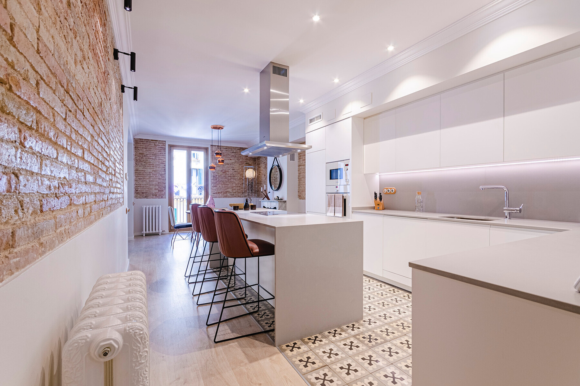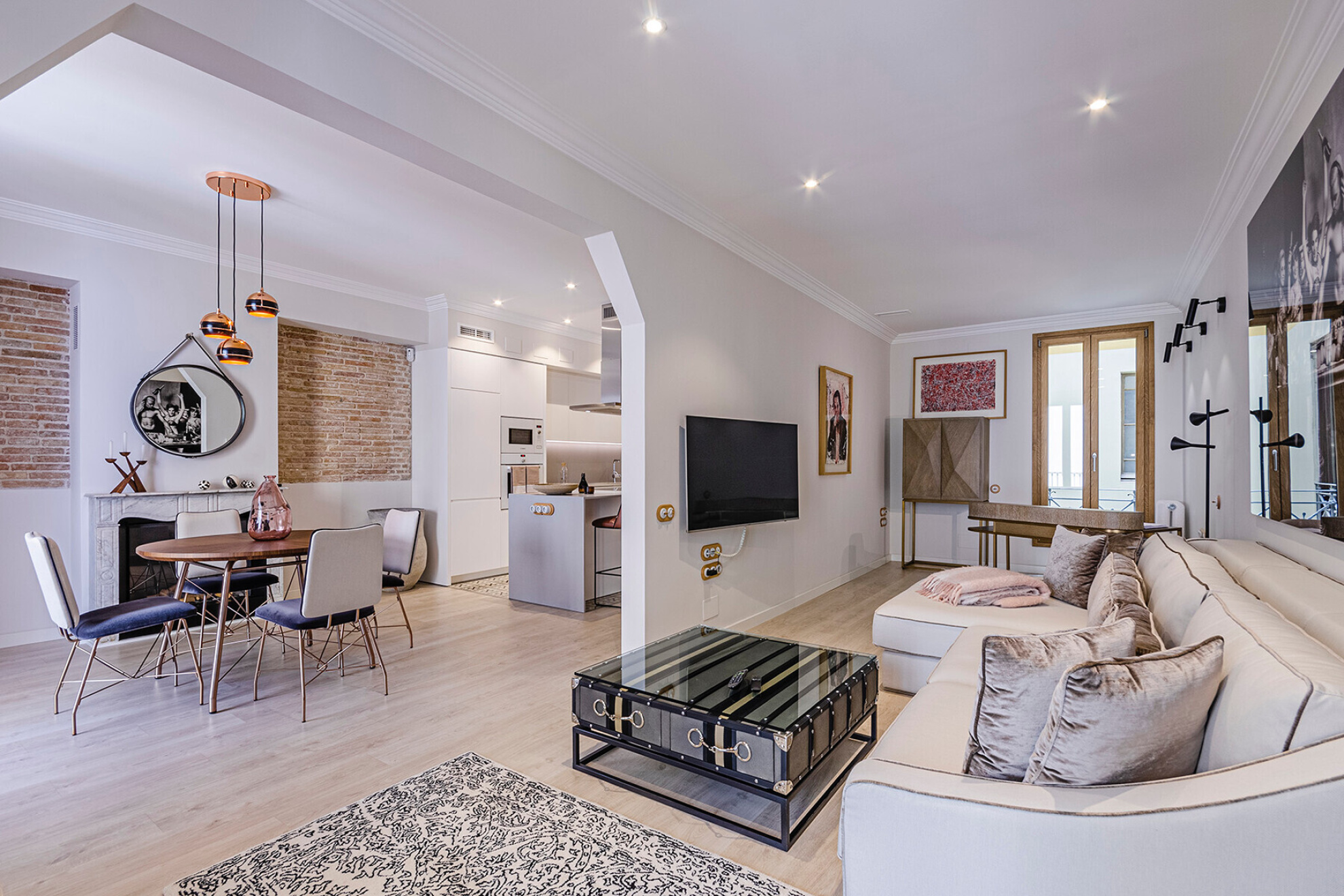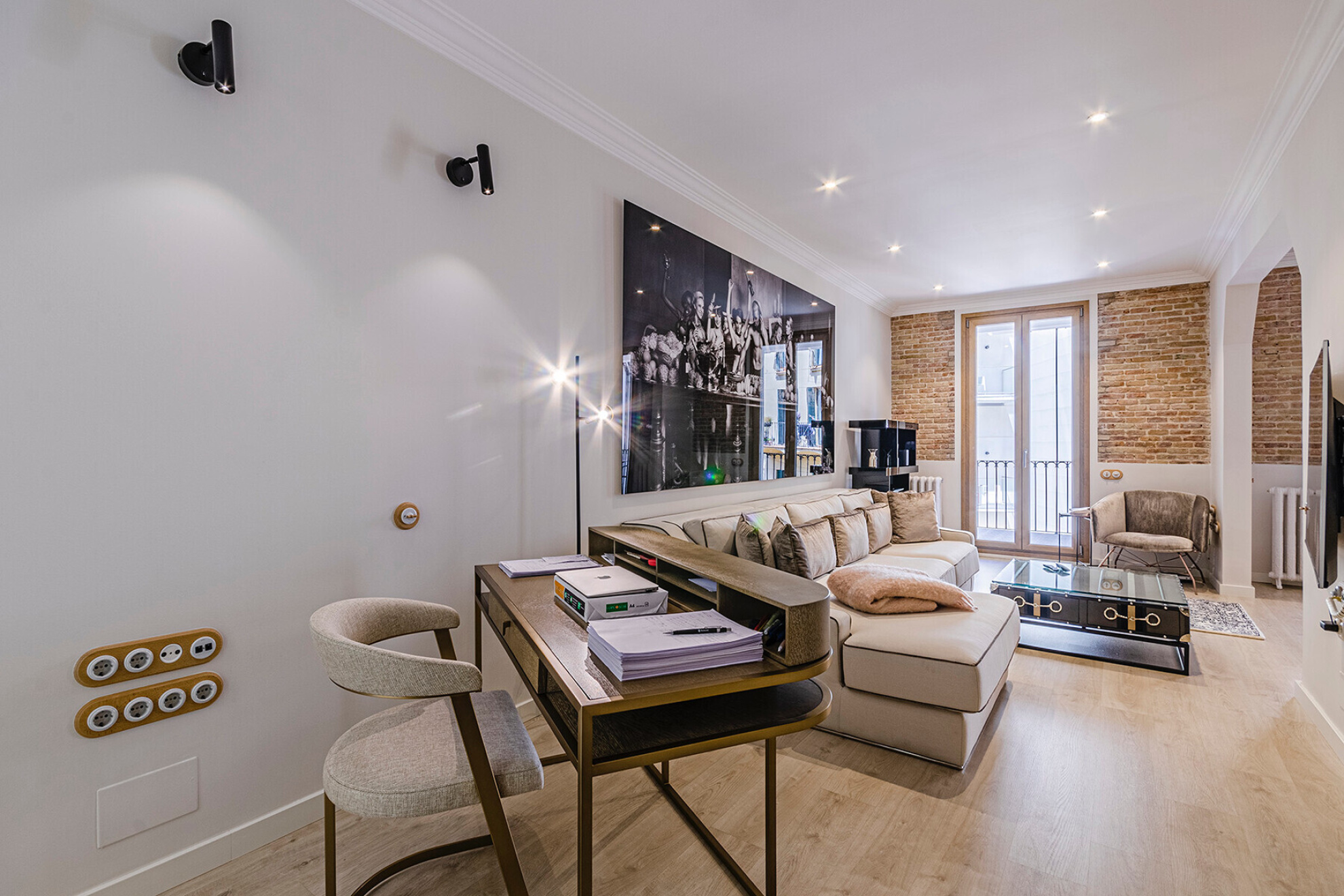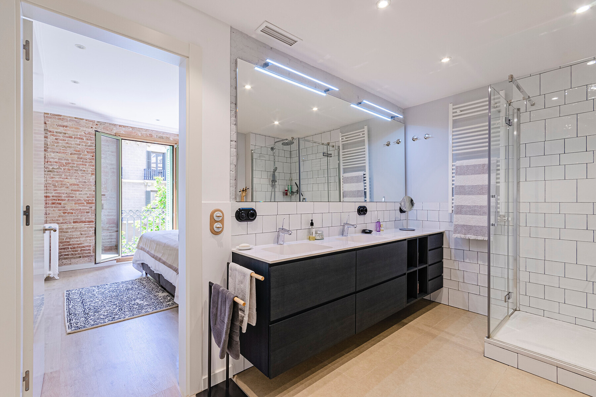 In a building with character in the Eixample Dreta, this apartment of approximately 157 m² has been transformed into a contemporary space where the distribution and light are the protagonists. A property designed to live comfortably without giving up a careful aesthetic.The entrance leads to a large hall that organizes the house with clarity. Here is integrated a full bathroom for general use and a separate laundry area, resolved in a discreet way.The night area has two bedrooms en suite, both with dressing room. They are generous spaces, well proportioned and with access to the outside, which guarantees natural light and a feeling of spaciousness.At the other end, the day area is developed in a single fluid environment. The kitchen with central island opens to the dining room and living room, creating a versatile space. A gas fireplace provides warmth without breaking the contemporary aesthetic.From the living room there is access to a terrace of approximately 10 m², an unusual differential value in the area.The renovation includes quality materials and technical solutions: natural wood floors, ducted air conditioning, radiator heating and integrated security systems.Located just minutes from Plaça de Catalunya and Passeig de Gràcia, in one of the most consolidated areas of Barcelona.A property ready to enjoy from the first moment.