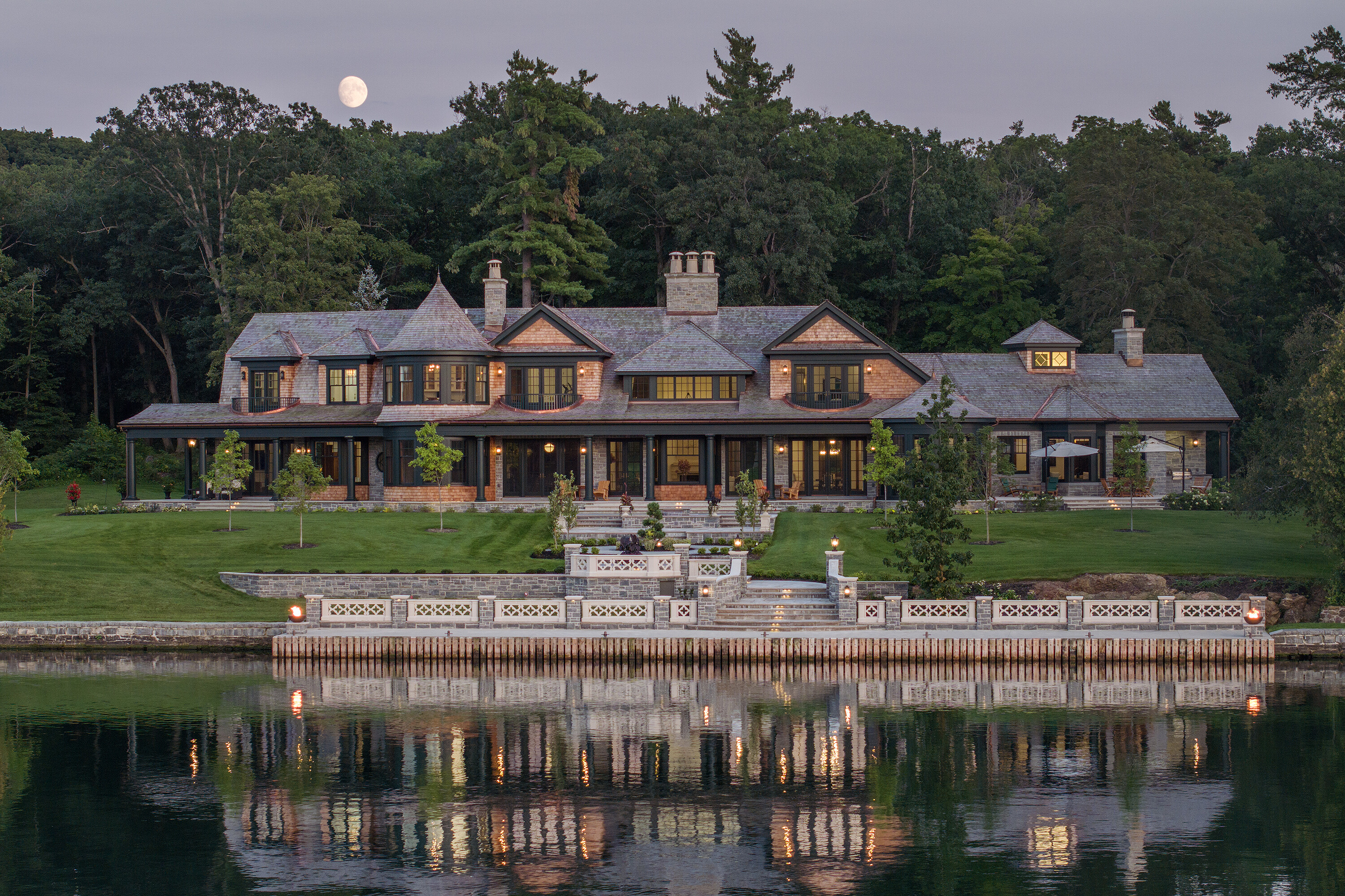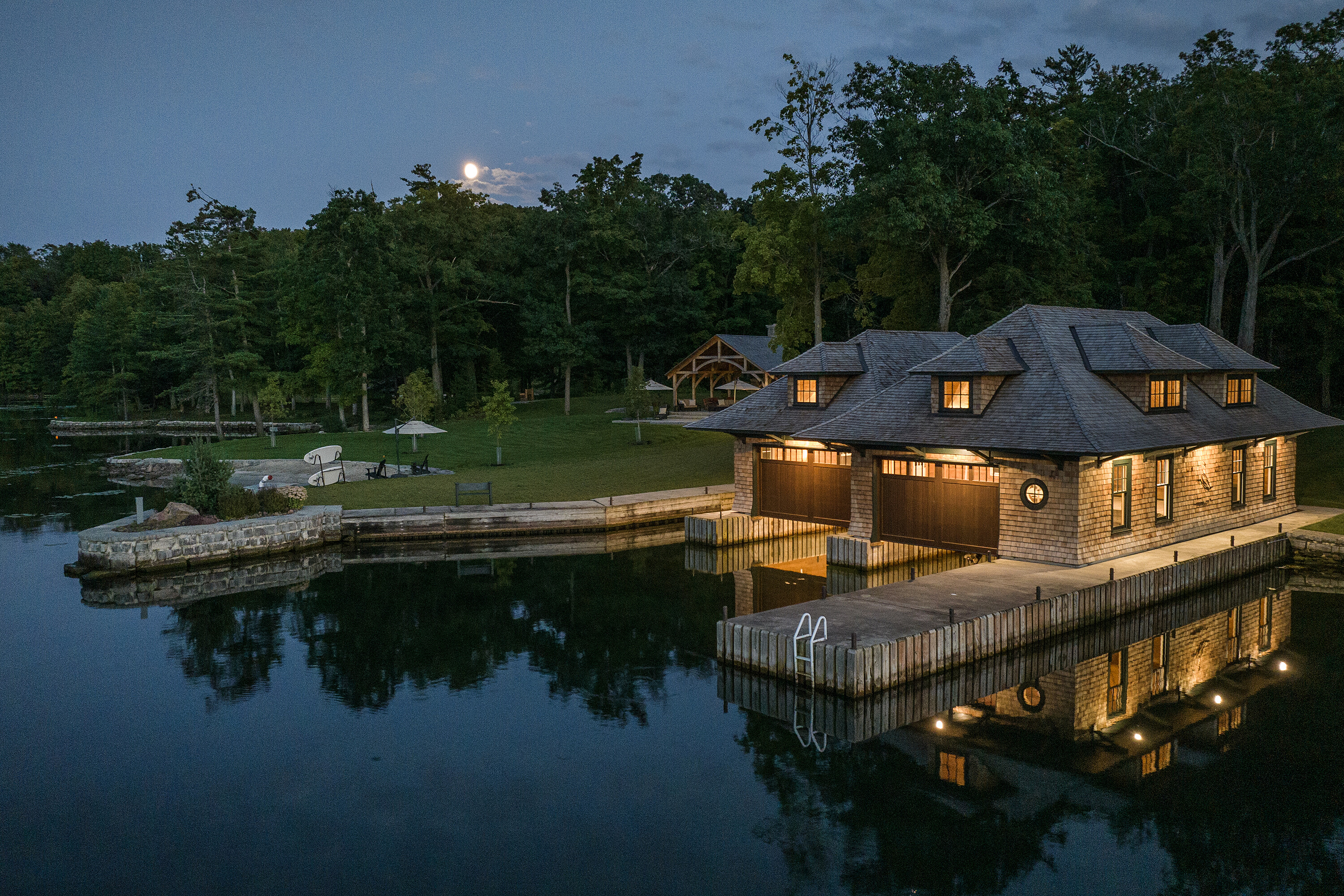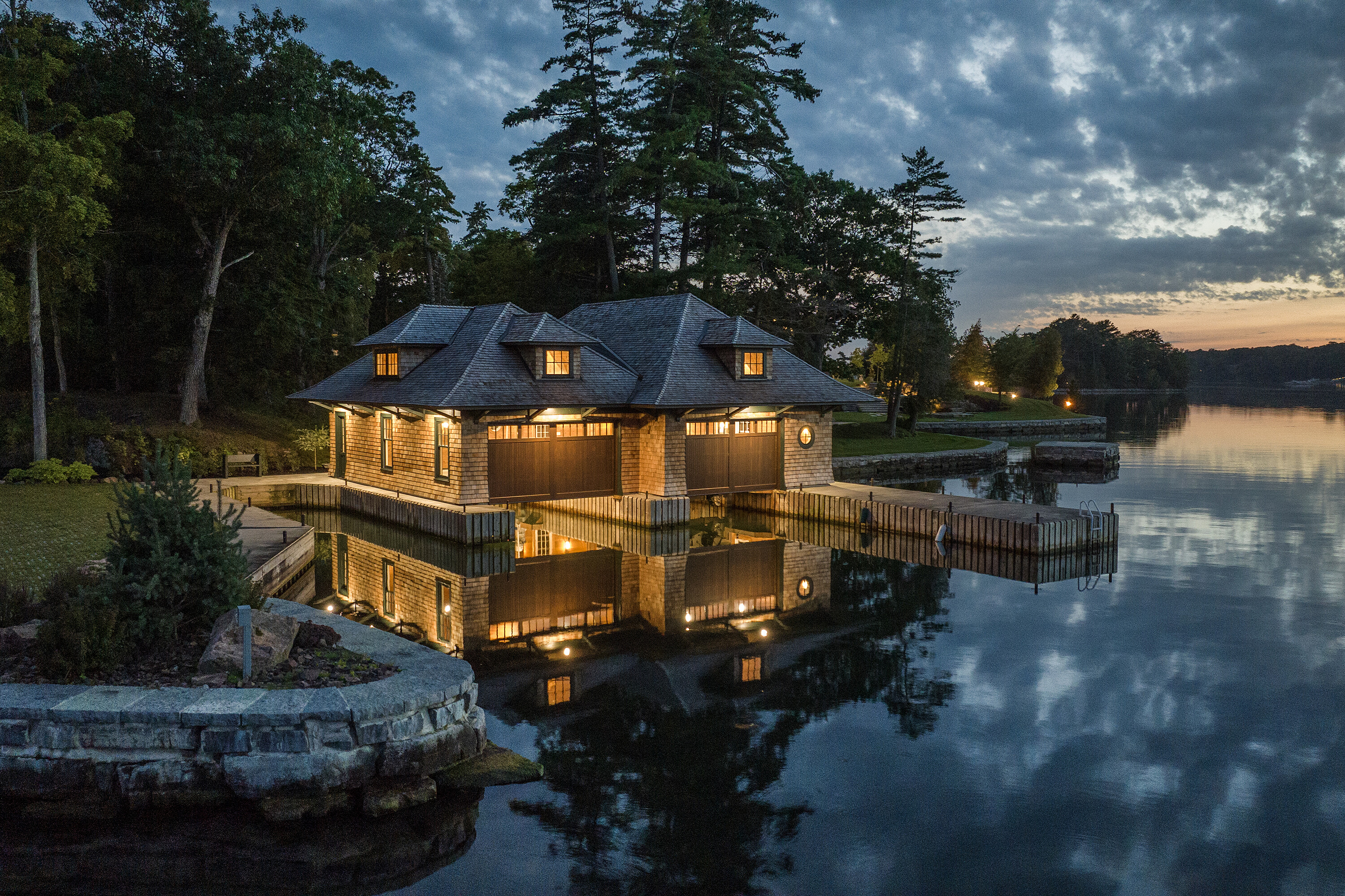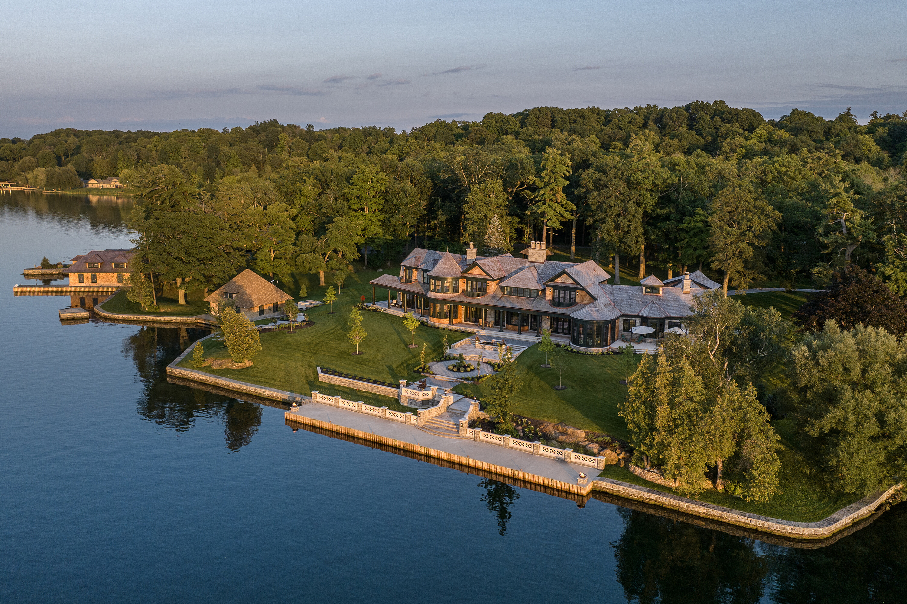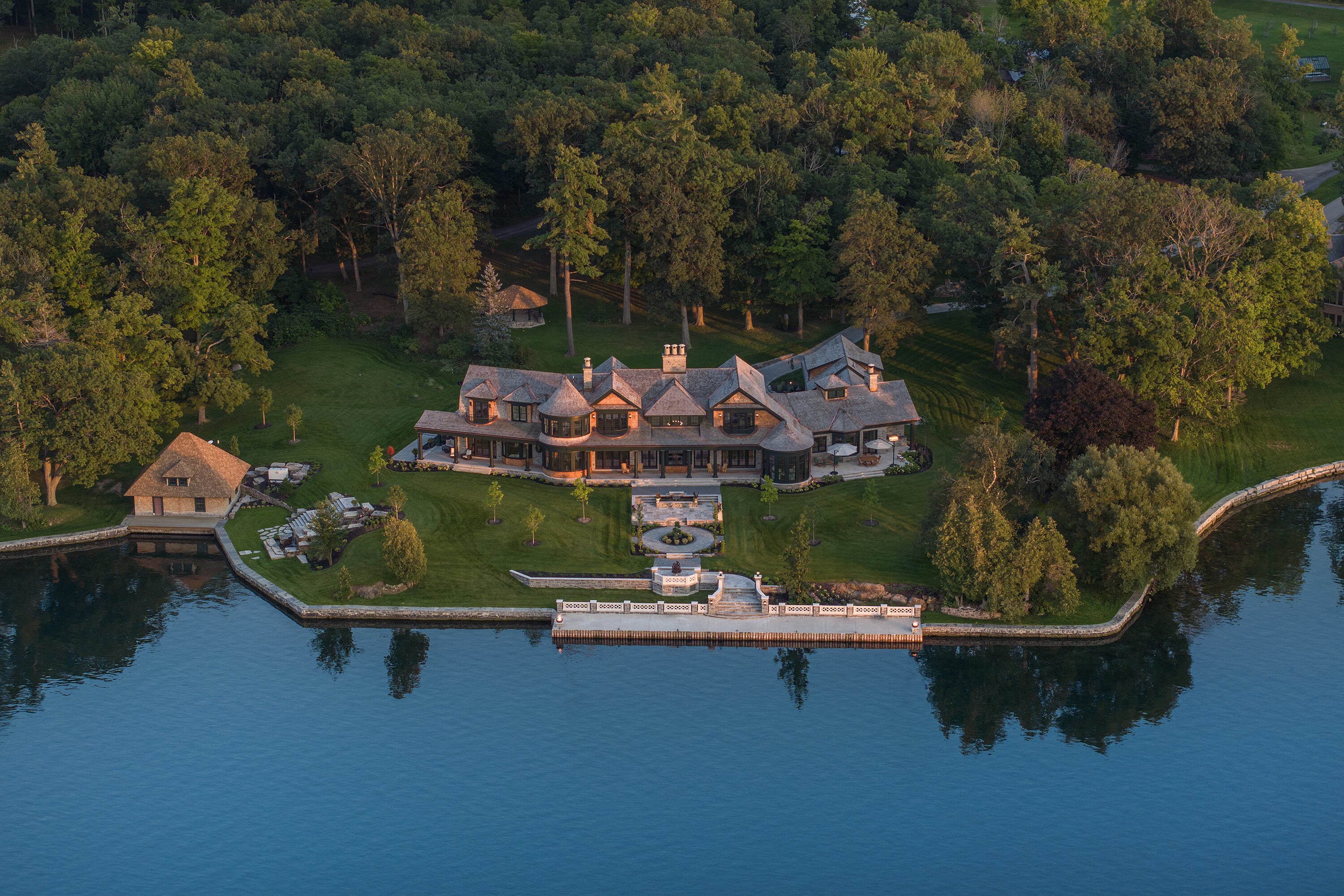 Welcome to Nokomis, a magnificent trophy estate gracing the pristine shores of Howe Island. This sprawling masterpiece, artfully completed in 2022, epitomizes architectural excellence and craftsmanship at its zenith. Conceived by renowned architect, Michael Preston, and meticulously brought to life by esteemed craftsmen, this estate pays homage to the former landmark lodge. Here, timeless elegance harmoniously merges with contemporary opulence. Indulge in the luxuries befitting a property of this caliber: state-of-the-art smart home technology, a gourmet dream kitchen boasting top-tier appliances, a multitude of bedrooms, each with its own ensuite bathroom, two opulent primary suites, two impressive home offices, three grand fireplaces, soaring ceilings, adorned with intricate millwork throughout, geothermal climate control, multiple graceful walkouts, and a whole-home automatic generator. Immerse yourself in the breathtaking, unrivalled 2,700+ feet of waterfront living, commanding sweeping vistas of the tranquil Bateau Channel. Revel in the expansive private dock facilities, accommodating multiple vessels with room for a stately 125-foot yacht. A custom double-slip boathouse with lifts and a double boat port beckon to boating enthusiasts eager to explore the world famous Thousand Islands and beyond. Set upon a secure, gated 24+ acre expanse, Nokomis assures the utmost in safety, accessibility, seclusion and exclusivity. The property boasts a charming caretaker gatehouse, various outbuildings, an intricate network of wooded trails, a timber-framed covered outdoor lounge area overlooking a sandy beach with a fireplace and a built-in BBQ/summer kitchen, a dry boathouse/workshop, and a second protected beach area perfect for accommodating float planes. A brief drive transports you to the historic heart of Kingston, while easy access to Toronto, Montreal, Ottawa, and Upstate New York ensures you remain tethered to urban amenities.