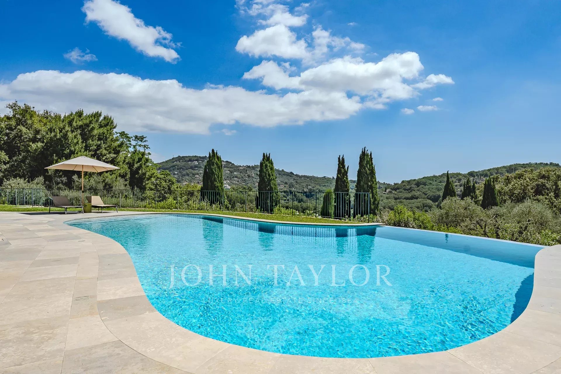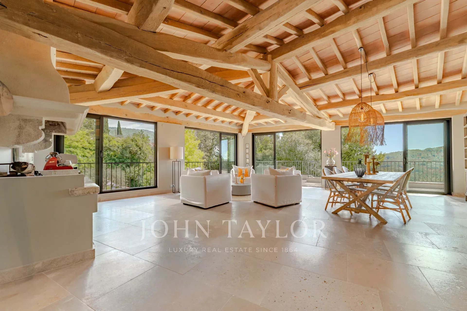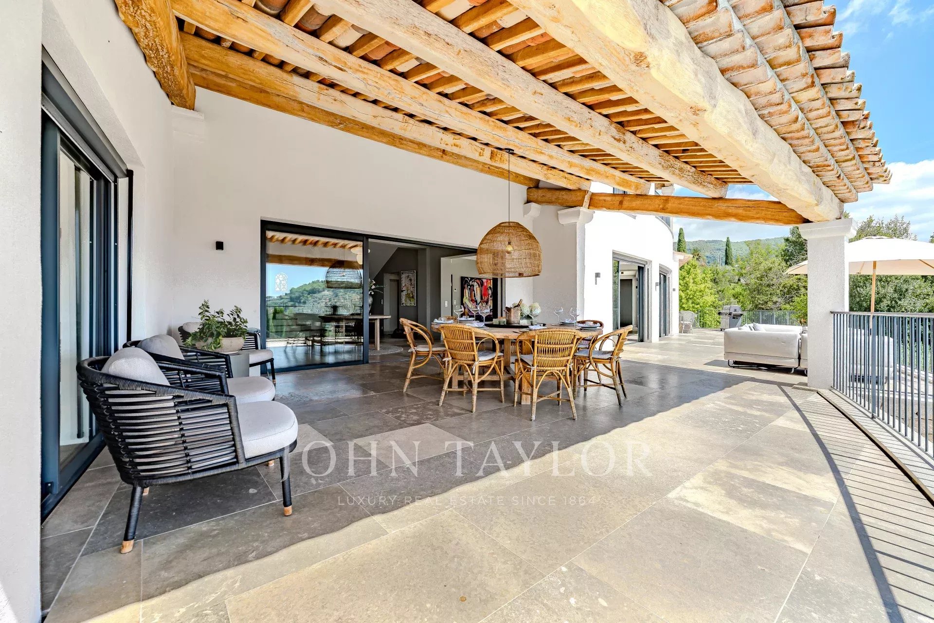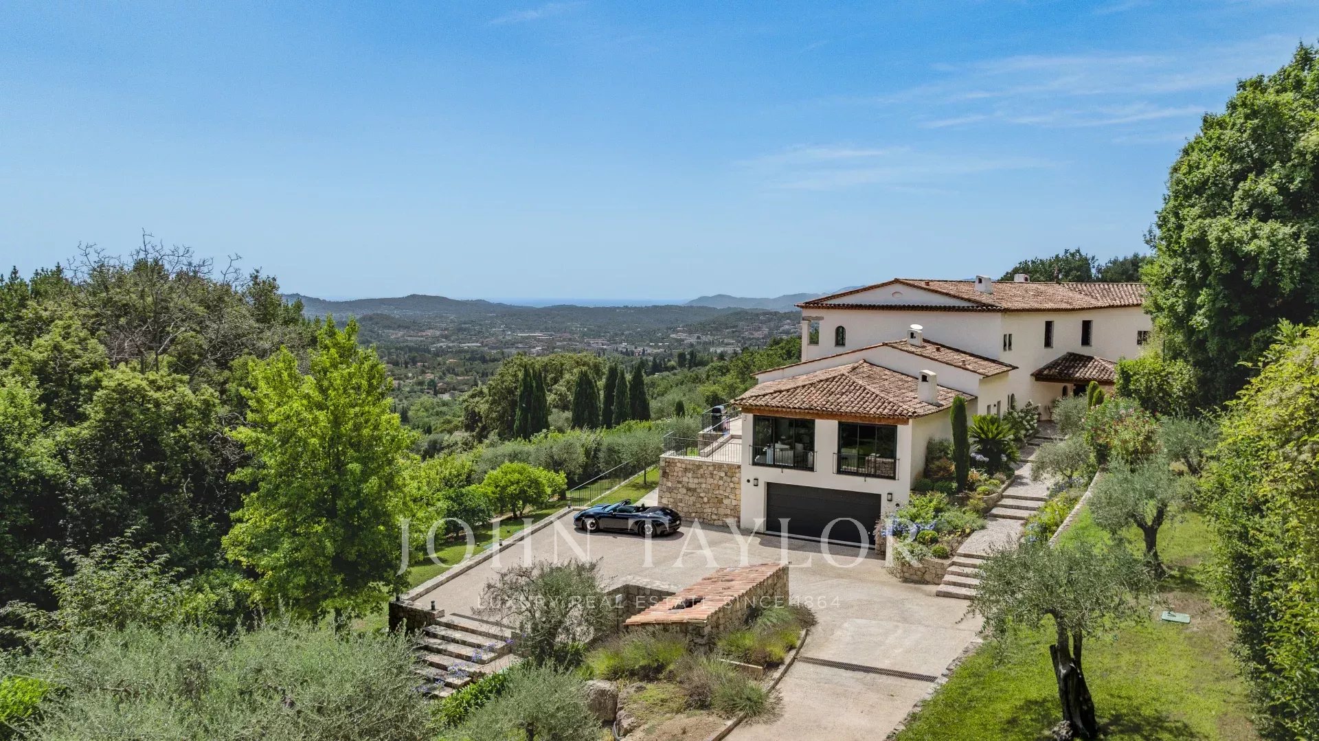 Nestled in the picturesque hills of the backcountry of Cannes, this recently renovated Provençal villa epitomises comfort, luxury, modernity and unrivalled quality, coupled with breathtaking panoramic views as far as the bay of Mandelieu.Access to the villa is through an impressive cathedral entrance, which immediately draws the eye to the spacious, light-flooded living area. The sliding doors of this entire level open onto the magnificent terrace and immediately convey a typical Mediterranean lifestyle.A double living room offers versatile functionality and promises convivial or contemplative hours in front of the open fireplace. The spacious dining room, with room for 12 guests, is directly adjacent to the open, modern Italian kitchen from the renowned Boffi brand, which makes cooking for family or guests a real pleasure.Directly adjacent is a romantic, large summer lounge with impressive ceiling beams, and here too, large sliding doors give the impression of being outside. This room offers a variety of uses that you no longer want to do without.A cosy home cinema with state-of-the-art technology completes the comfort of this level.The first floor, accessible via a lift, houses 4 suites with modern bathrooms, including the master suite with a spacious dressing room.Three of these rooms offer direct access to a large balcony with breathtaking panoramic views.The garden level of the villa inspires a variety of activities: a fitness room with shower, an air-conditioned wine cellar with separate tasting room for wine connoisseurs, a lounge, a guest room with shower and the practical laundry room of the house.From the double garage, you can easily reach all three floors by lift.The idyllic summer area offers the luxury of a pretty infinity pool with a modern pool house and functional kitchen and promises absolute joie de vivre and relaxing moments!The 5000 sq.m park with its own spring was designed by the renowned garden architect Jean Mus and gives this quietly situated property an incomparable touch and this exceptional Mediterranean charm.35 minutes from Nice and Cannes, surrounded by prestigious golf courses and first-class restaurants, this property fulfils all the criteria for a dream residence !