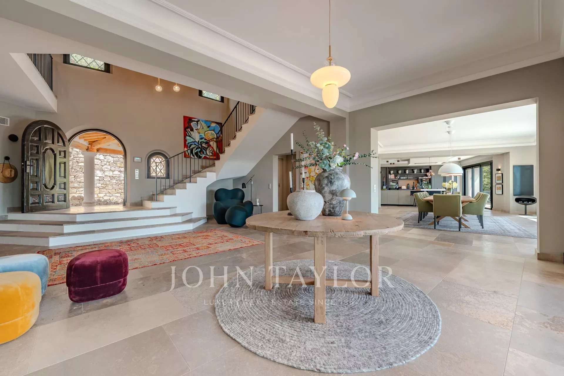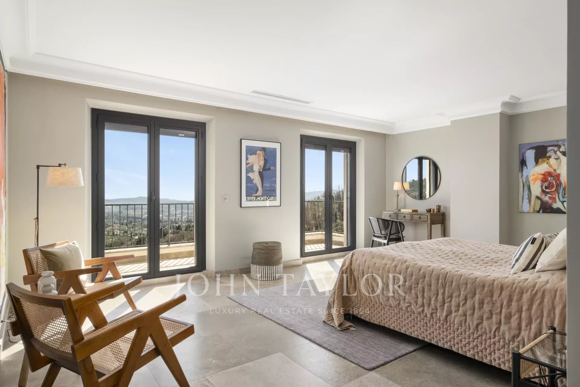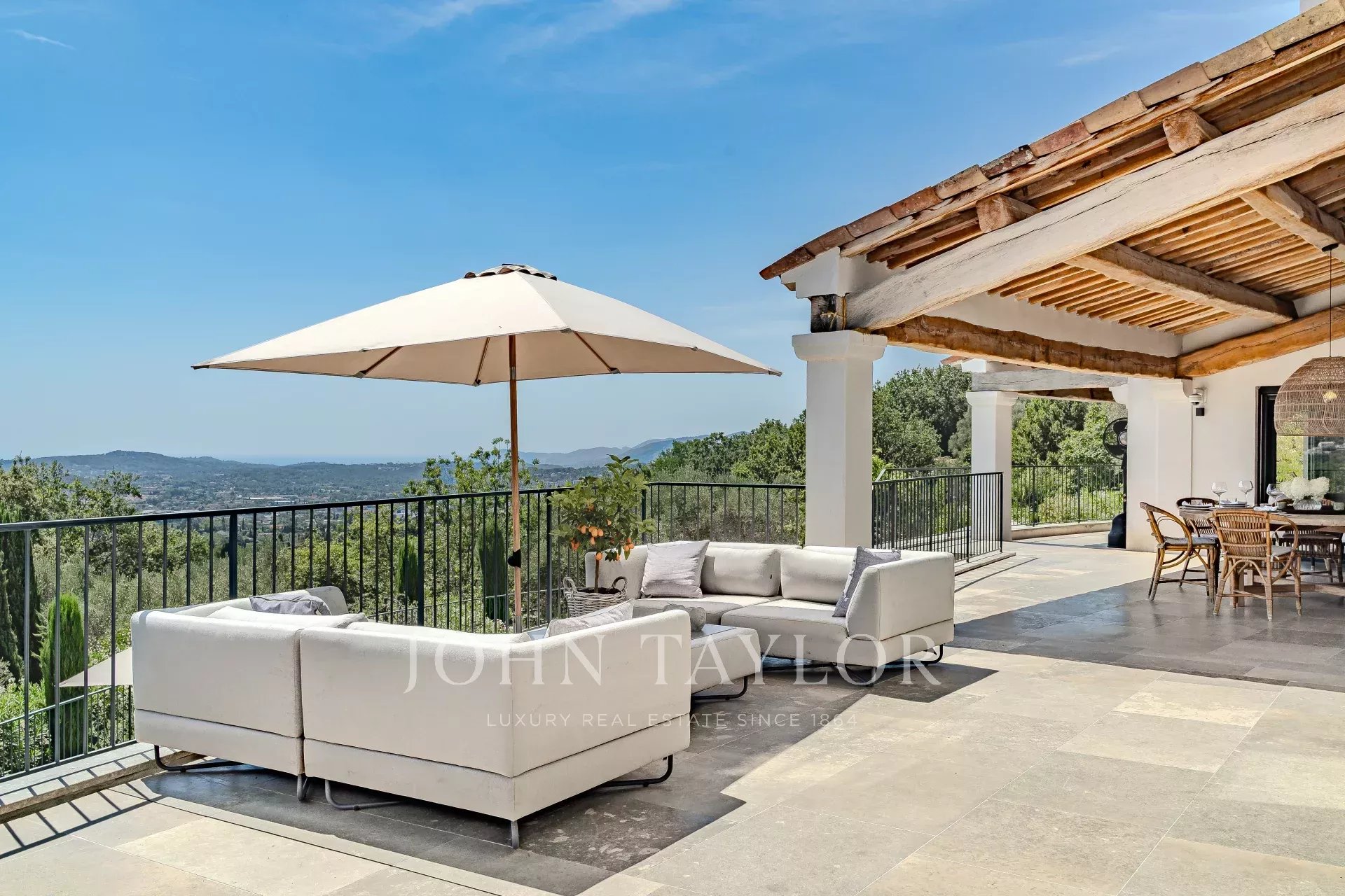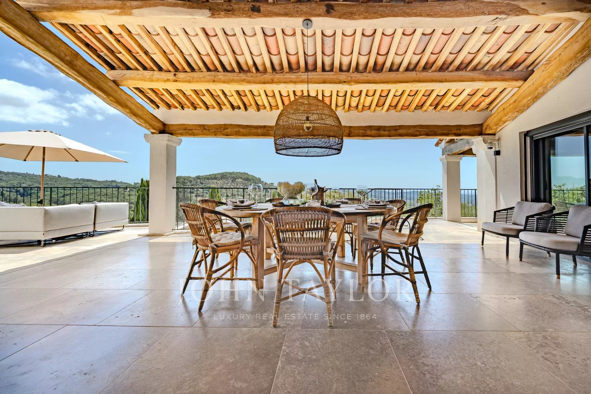 Nestled in the picturesque hills of the backcountry of Cannes, this recently renovated Provençal villa epitomises comfort, luxury, modernity and unrivalled quality, coupled with breathtaking panoramic views as far as the bay of Mandelieu.Access to the villa is through an impressive cathedral entrance, which immediately draws the eye to the spacious, light-flooded living area. The sliding doors of this entire level open onto the magnificent terrace and immediately convey a typical Mediterranean lifestyle.A double living room offers versatile functionality and promises convivial or contemplative hours in front of the open fireplace. The spacious dining room, with room for 12 guests, is directly adjacent to the open, modern Italian kitchen from the renowned Boffi brand, which makes cooking for family or guests a real pleasure.Directly adjacent is a romantic, large summer lounge with impressive ceiling beams, and here too, large sliding doors give the impression of being outside. This room offers a variety of uses that you no longer want to do without.A cosy home cinema with state-of-the-art technology completes the comfort of this level.The first floor, accessible via a lift, houses 4 suites with modern bathrooms, including the master suite with a spacious dressing room.Three of these rooms offer direct access to a large balcony with breathtaking panoramic views.The garden level of the villa inspires a variety of activities: a fitness room with shower, an air-conditioned wine cellar with separate tasting room for wine connoisseurs, a lounge, a guest room with shower and the practical laundry room of the house.From the double garage, you can easily reach all three floors by lift.The idyllic summer area offers the luxury of a pretty infinity pool with a modern pool house and functional kitchen and promises absolute joie de vivre and relaxing moments!The 5000 sq.m park with its own spring was designed by the renowned garden architect Jean Mus and gives this quietly situated property an incomparable touch and this exceptional Mediterranean charm.35 minutes from Nice and Cannes, surrounded by prestigious golf courses and first-class restaurants, this property fulfils all the criteria for a dream residence !
