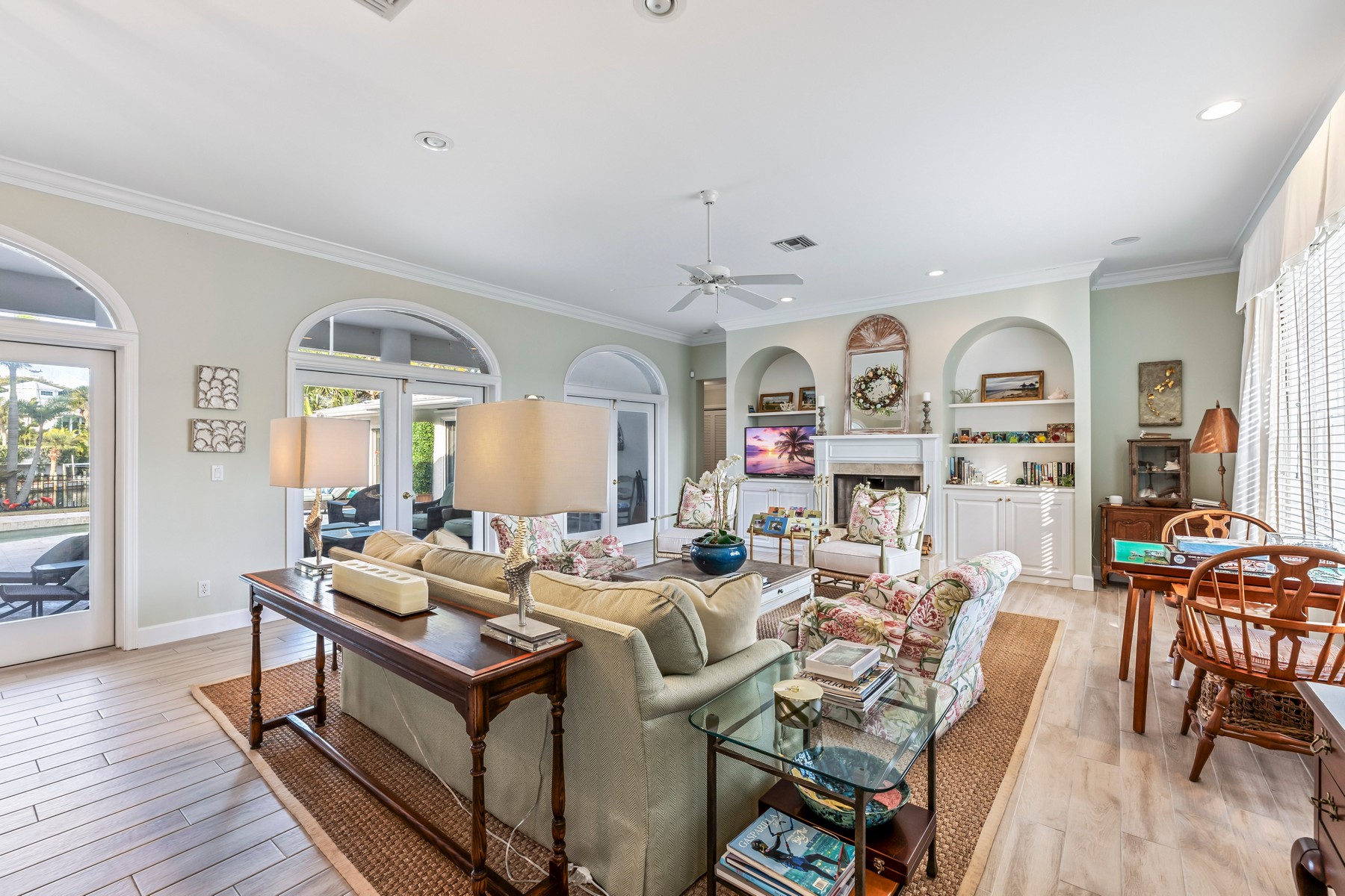 Experience the Boca Grande lifestyle in this highly desirable ground floor residence nestled in the heart of the Village on deep protected water. As you step into this lovely 4 bedroom and 4 bath classic Boca Grande style home, you will appreciate the sun filled great room which includes a beautiful coral stone fireplace and French doors that open to a stone patio, and heated pool. The unique residence is designed around the lush outdoor space which includes a fenced yard, and a dock for your large vessel. You will appreciate the convenience of single story living both indoors and out. In addition to the impressive great room, this Florida Style plan boasts a kitchen with stone counters and breakfast nook, a large primary suite and bathroom and a fantastic executive office, which can also serve as a den, and finally 3 ensuite guest rooms. This distinctive home has a new standing seam roof, tankless hot water, and beautiful mature landscaping. Outdoor activities are endless, as you take advantage of day trips to neighboring islands, world class fishing, paddleboarding and kayaking, or you can choose to bike the length of the island on the “bike path”, or golf cart to the beach for a walk on the beach or swim in the Gulf of Mexico. Boca Grande is famous for so much more than its Tarpon. Retreat to an idyllic lifestyle, where bicycles and golf carts are the preferred mode of transport, and old Florida charm abounds, where no street lights, traffic or high rises exist. There is no place quite like it!