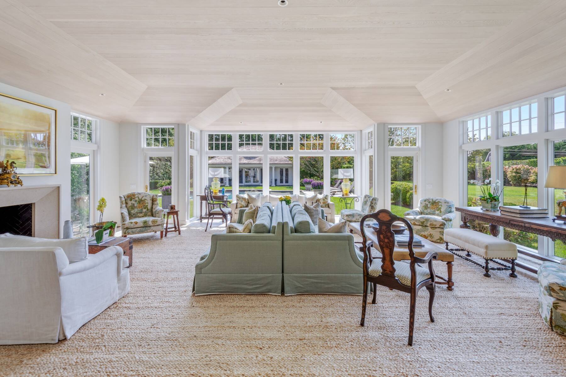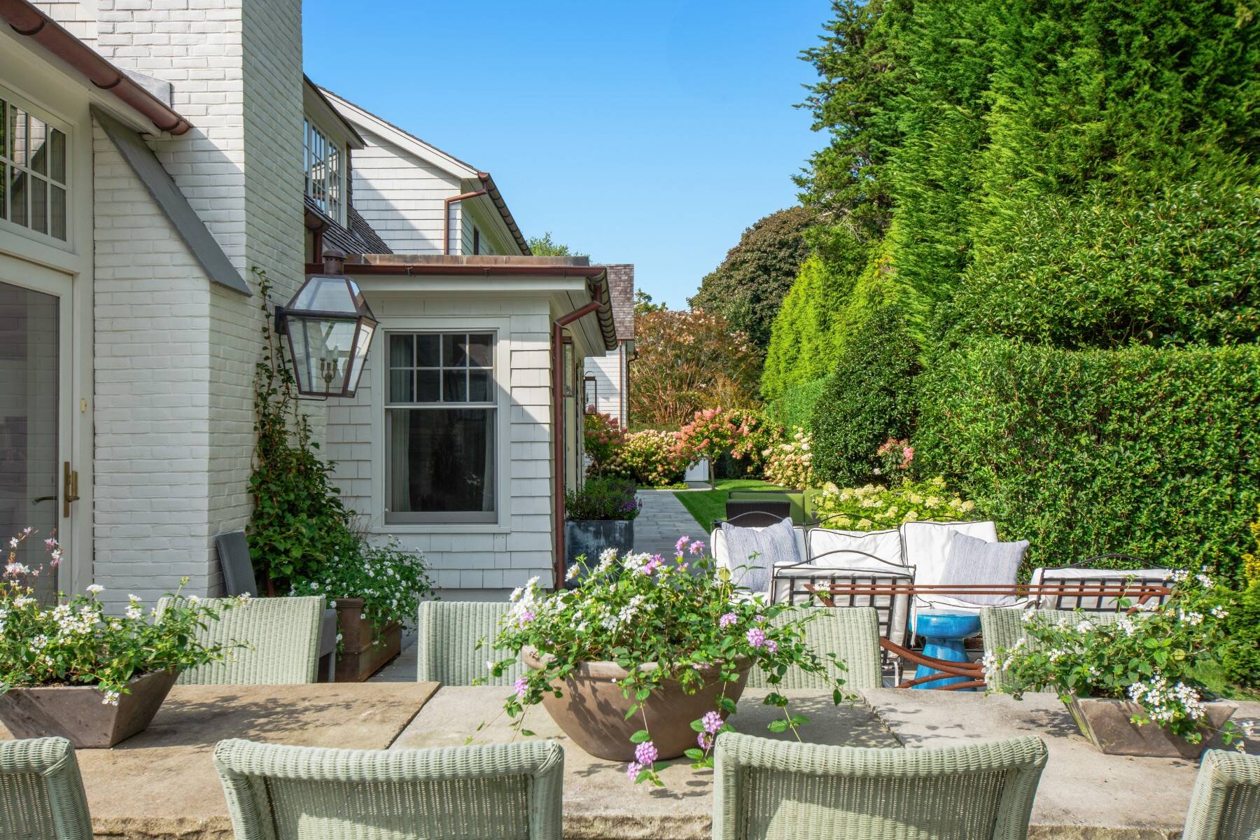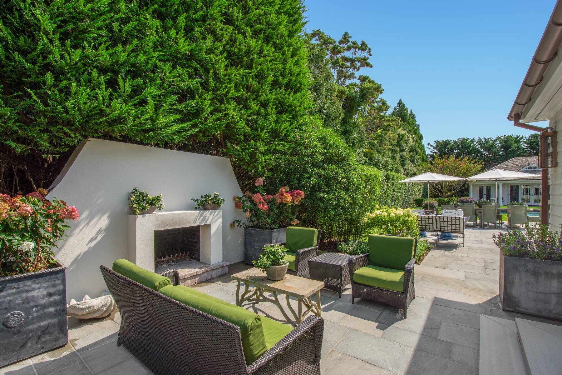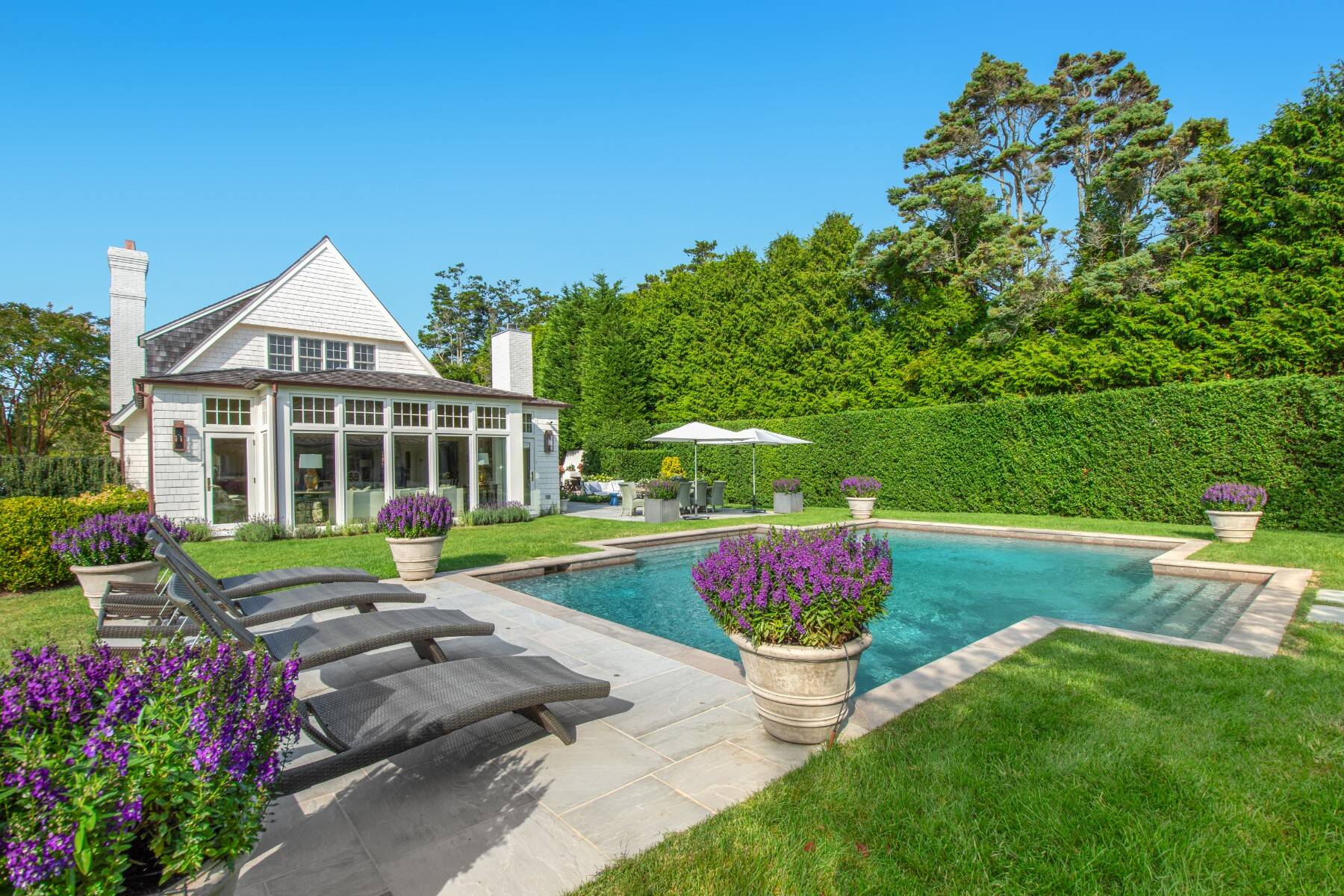 Terrific Southampton Estate Section rental property, sited one "country" block to ocean beaches offers gracious living with six bedroom suites, a full house-length patio, heated Gunite pool, pool house, and attached three-car garage. The 1.05-acre property, accessed by two driveways and semi-circular drive presents a classic clapboard, shingle-sided traditional residence, with covered, columned front entrance. The entry reception offers a powder room, and straight-line access to the residence wings on either side. Recently renovated and expanded, the south wing offers the family/game room with fireplace, that steps down to the over-sized, sun-filled living room with fireplace. The formal dining room seats 10+, and a pantry connects to the dine-in kitchen with breakfast nook and all top appliances. Numerous full-height doors open to the swimming pool area and full house-length back patio with fireplace. A second larger pantry connects to the den/office with full bath. The ground floor guest suite, garden room with dishwasher second fridge and freezer, and utility area with laundry room complete the ground floor, and the back stair leads to the gym room in the lower level. Up the main stair, the primary suite occupies one side, and a guest suite is on the other. The upstairs north wing offers three more quest bedroom suites and sitting/hangout space. Immaculate and spacious, this rental property is perfect for any time of the year.