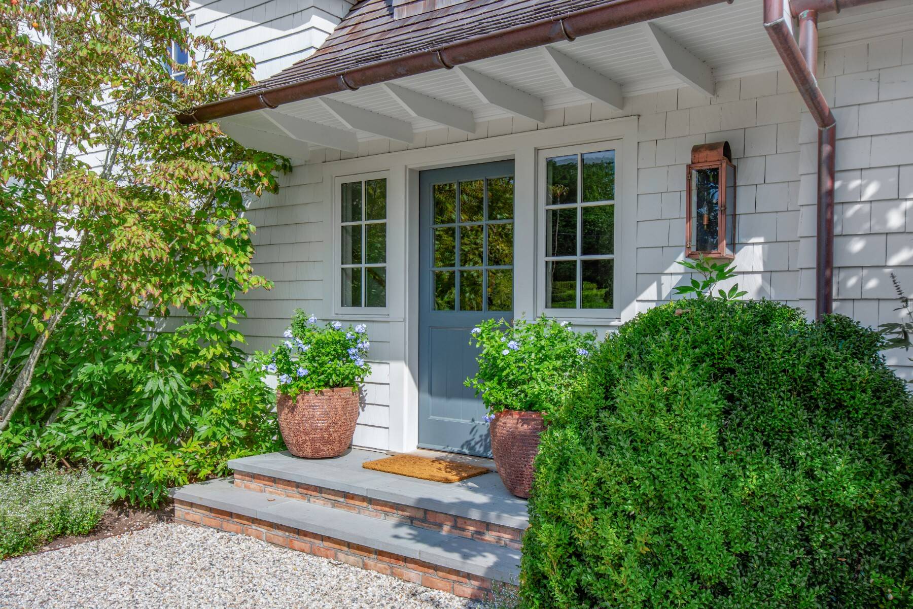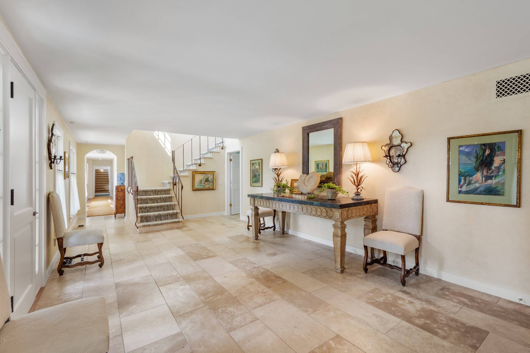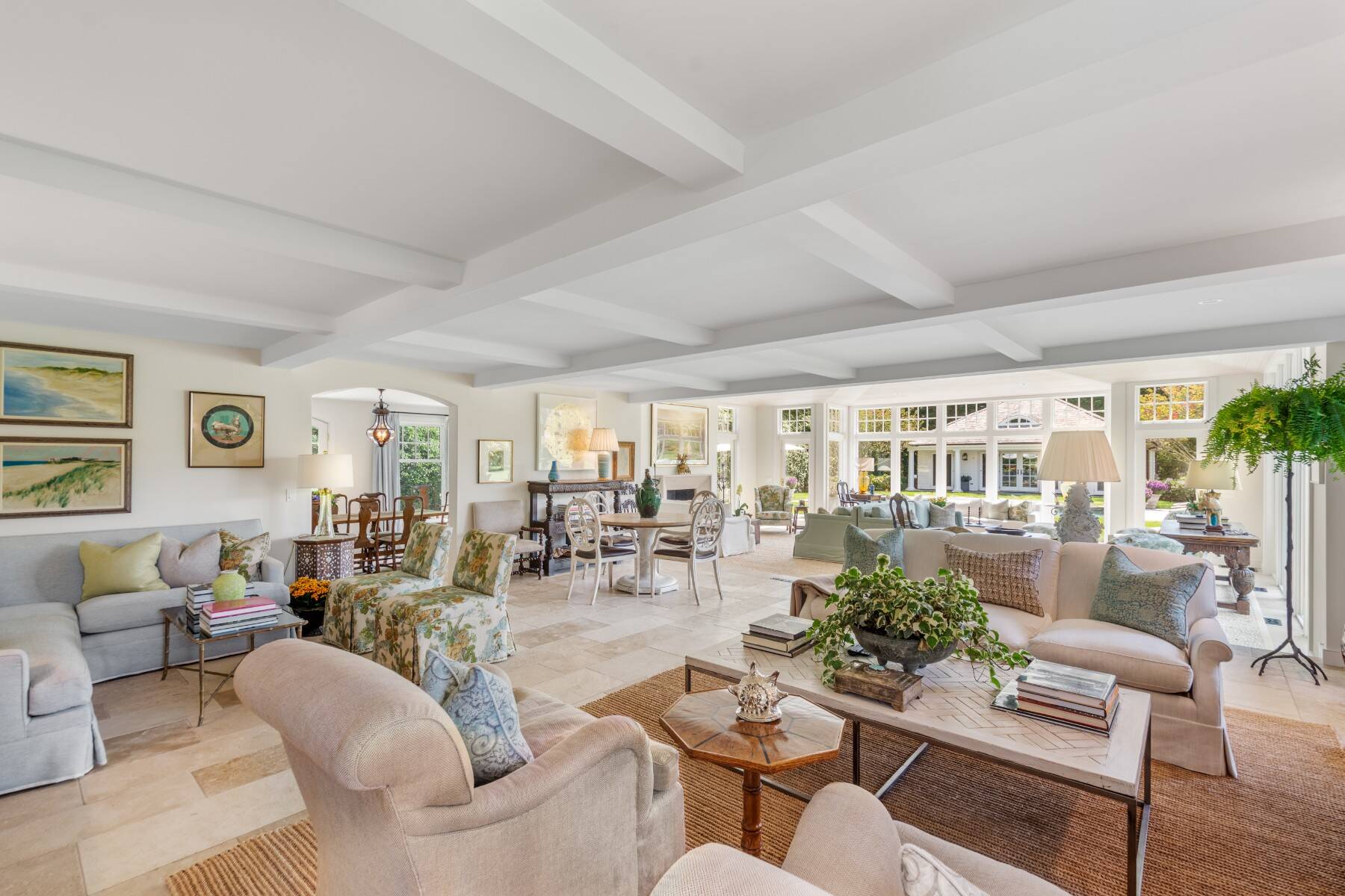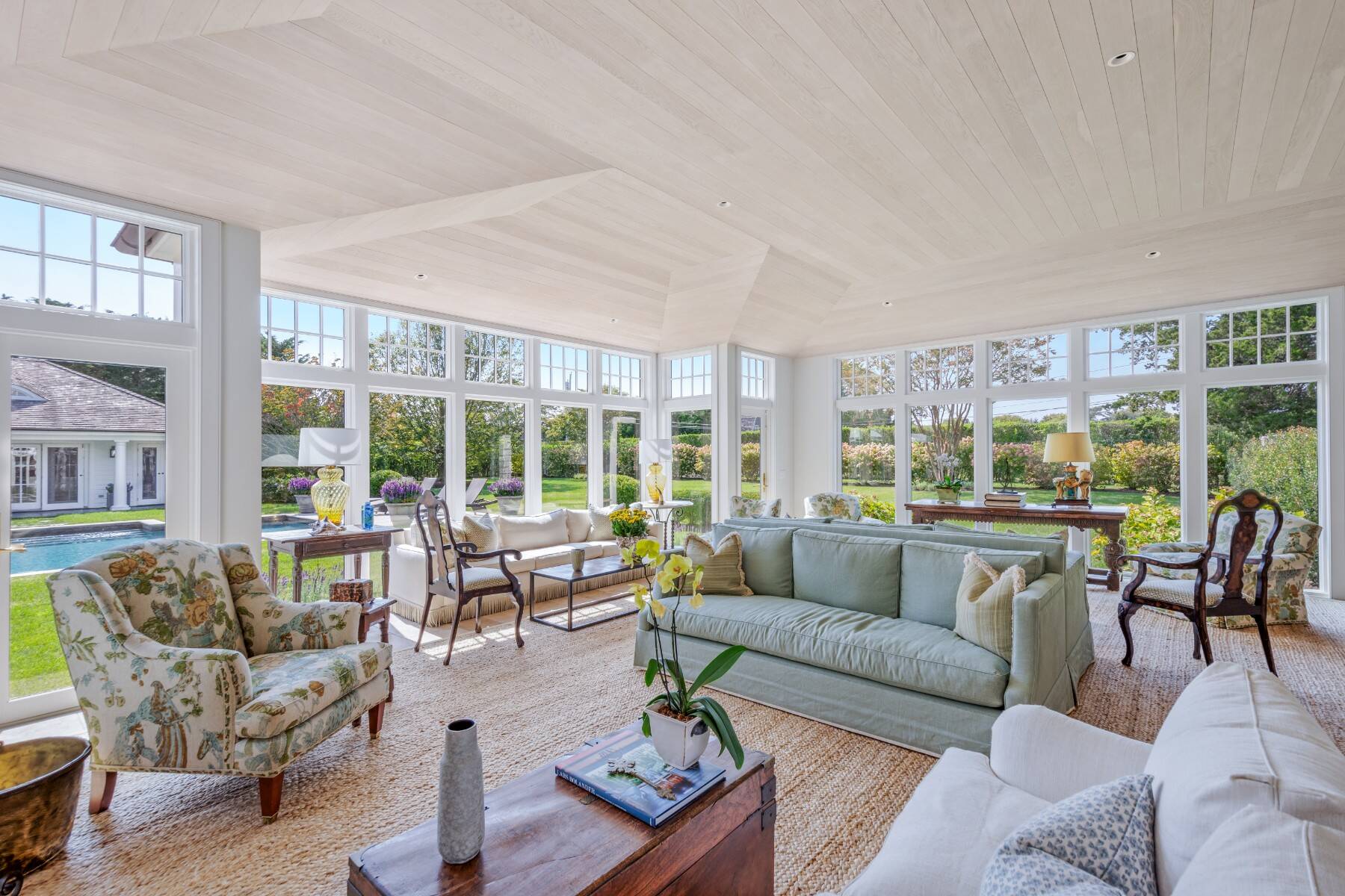 Terrific Southampton Estate Section rental property, sited one "country" block to ocean beaches offers gracious living with six bedroom suites, a full house-length patio, heated Gunite pool, pool house, and attached three-car garage. The 1.05-acre property, accessed by two driveways and semi-circular drive presents a classic clapboard, shingle-sided traditional residence, with covered, columned front entrance. The entry reception offers a powder room, and straight-line access to the residence wings on either side. Recently renovated and expanded, the south wing offers the family/game room with fireplace, that steps down to the over-sized, sun-filled living room with fireplace. The formal dining room seats 10+, and a pantry connects to the dine-in kitchen with breakfast nook and all top appliances. Numerous full-height doors open to the swimming pool area and full house-length back patio with fireplace. A second larger pantry connects to the den/office with full bath. The ground floor guest suite, garden room with dishwasher second fridge and freezer, and utility area with laundry room complete the ground floor, and the back stair leads to the gym room in the lower level. Up the main stair, the primary suite occupies one side, and a guest suite is on the other. The upstairs north wing offers three more quest bedroom suites and sitting/hangout space. Immaculate and spacious, this rental property is perfect for any time of the year.