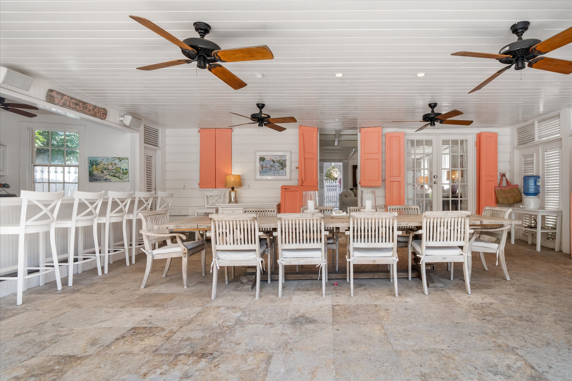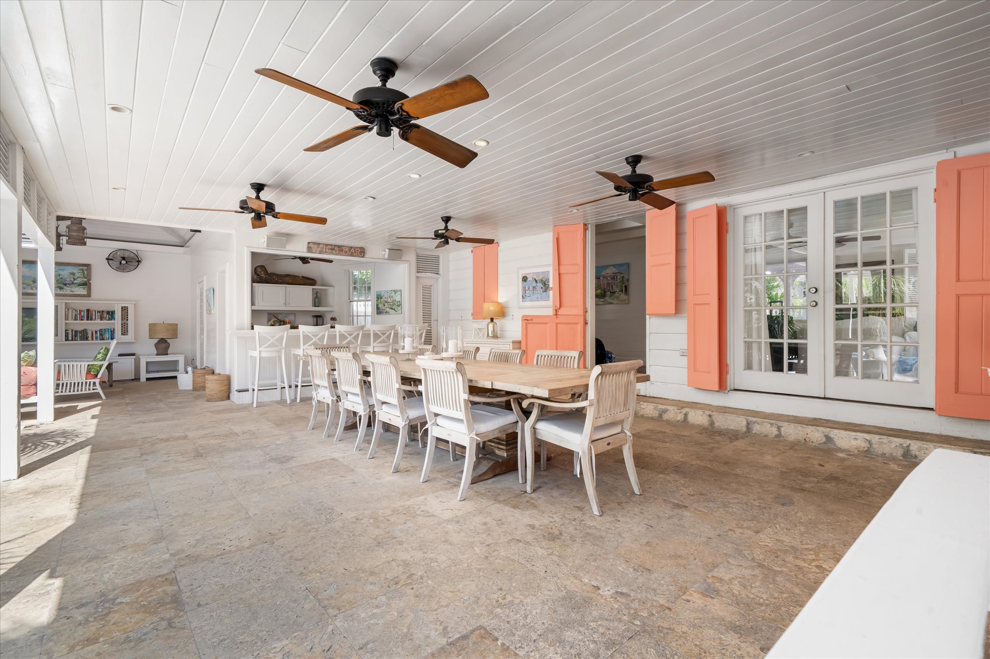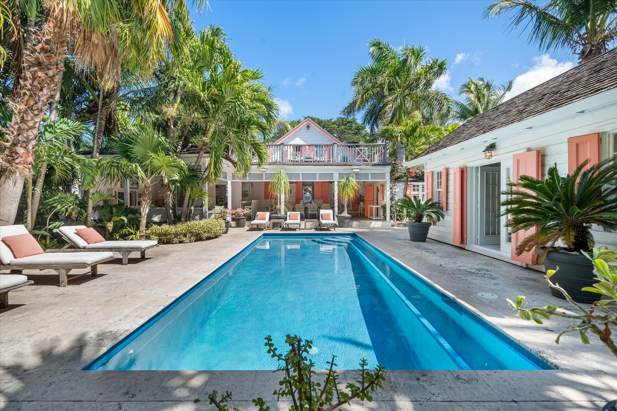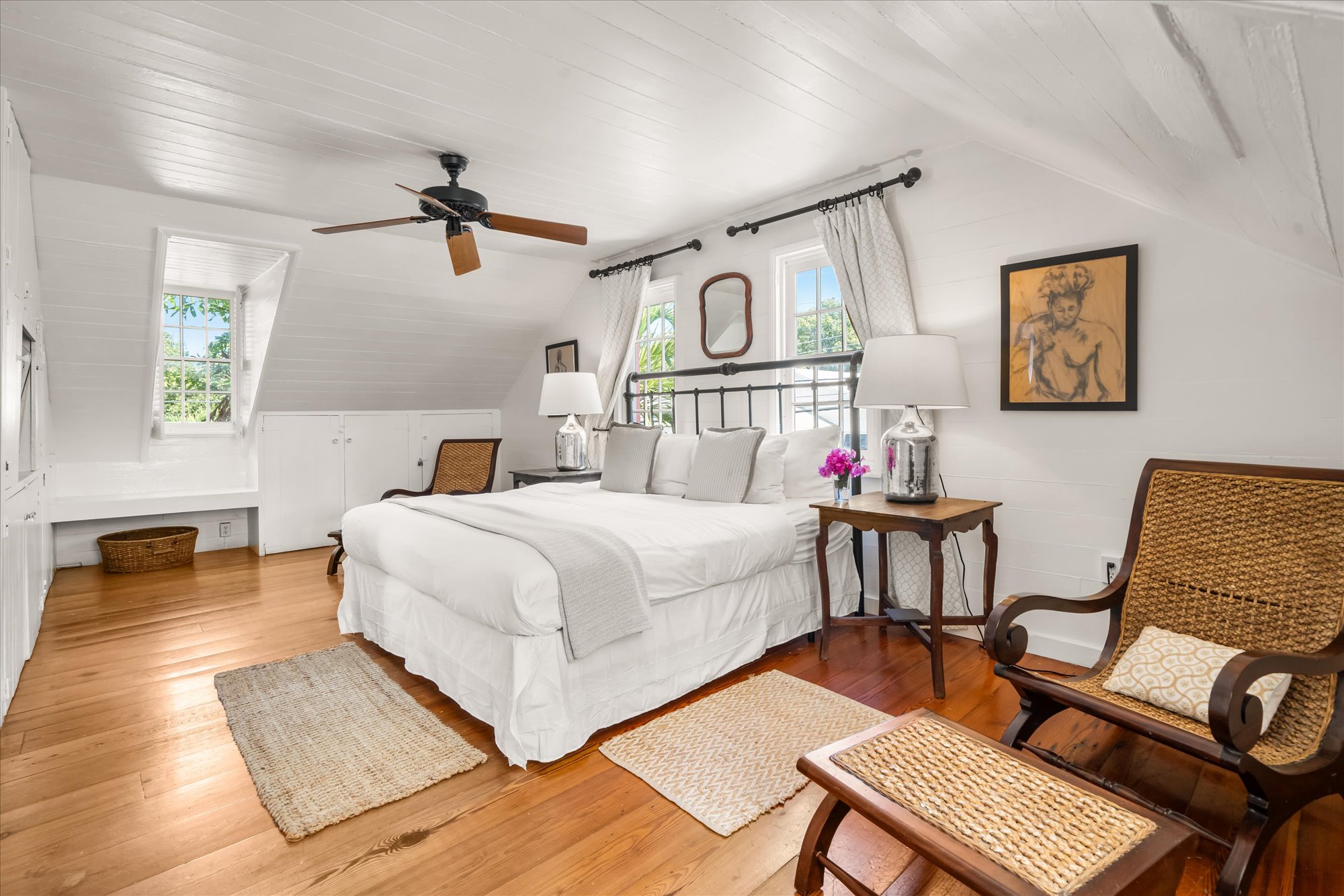 Discover The Hatch, a truly exceptional historical home that seamlessly blends authentic charm with modern conveniences and expansive tropical outdoor living. This one-of-a-kind property offers an unparalleled island lifestyle, making it both a perfect retreat and a lucrative investment opportunity. Designed for relaxation and entertaining, The Hatch features a spacious covered dining area, an open-air living room, and a seated bar, all overlooking a heated pool surrounded by lush landscaped gardens. The outdoor space is further enhanced by a poolside lounge, a billiards table, and an expansive top deck, perfect for sunset views. On the upstairs deck, the bay and sunsets can be seen, creating a breathtaking backdrop for evening relaxation. Inside, the main house offers two beautifully appointed upstairs bedrooms—a master suite with a king bed and a second bedroom with a queen bed, sharing a bathroom with a clawfoot bathtub and a separate shower. The downstairs bedroom, featuring a queen bed and en-suite bath, provides additional privacy. A separate guest house serves as the fourth bedroom, complete with its own en-suite bathroom, ensuring comfort and privacy for guests. Every bedroom is equipped with individual A/C units for maximum convenience. The gourmet kitchen boasts stainless steel appliances, hand-crafted wood cabinetry, and a traditional wooden countertop, flowing effortlessly into the covered dining area that comfortably seats 12. Two distinct living rooms—one inside, offering a tranquil space with white slipcovered sofas and chairs, and another outdoors, located beside the bar and dining area—allow for both quiet moments and lively gatherings. The outdoor living space, complete with built-in sofas and a TV, offers a seamless indoor-outdoor experience, where guests can unwind while watching their favorite show or floating in the pool. For those seeking a peaceful escape, the front porch swing and rocking chairs provide the perfect spot to enjoy a cool drink and take in the surroundings. Adding to its practicality, The Hatch is fully equipped with a generator and a rainwater cistern, ensuring self-sufficiency and peace of mind. Beyond its beauty and functionality, The Hatch is the top rental property on the island, averaging 42 weeks of bookings per year. With an impressive rental history, including 55% repeat clientele, it stands as a premier investment opportunity. Additionally, the historical property tax exemption adds even more value to this remarkable home. Whether you’re looking for a private sanctuary, an entertainer’s dream, or a proven income-generating asset, The Hatch delivers on every level. Experience the best of island living with this rare and sought-after property.
