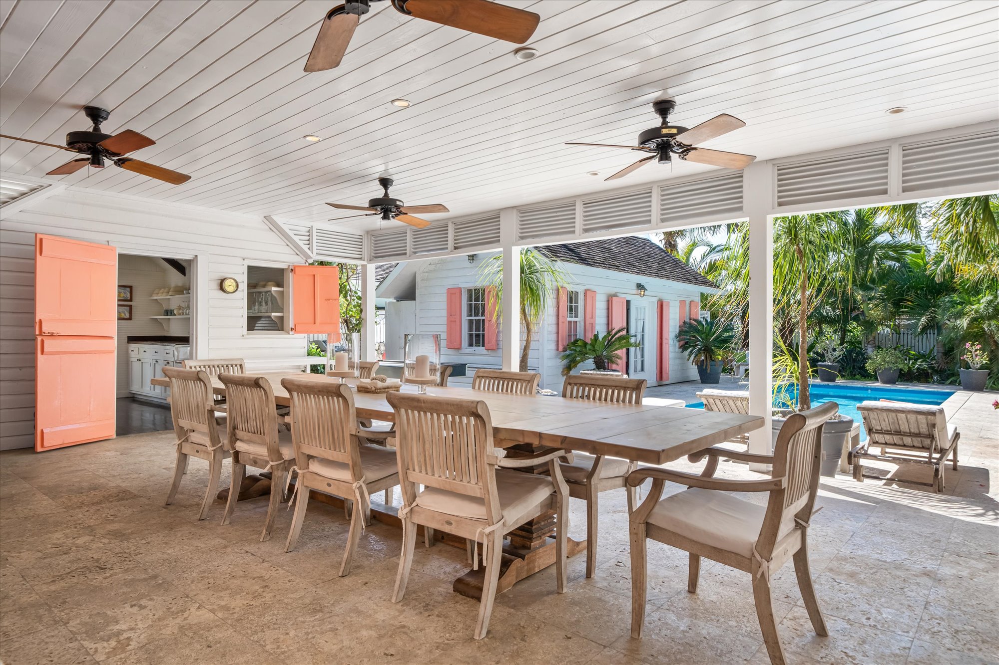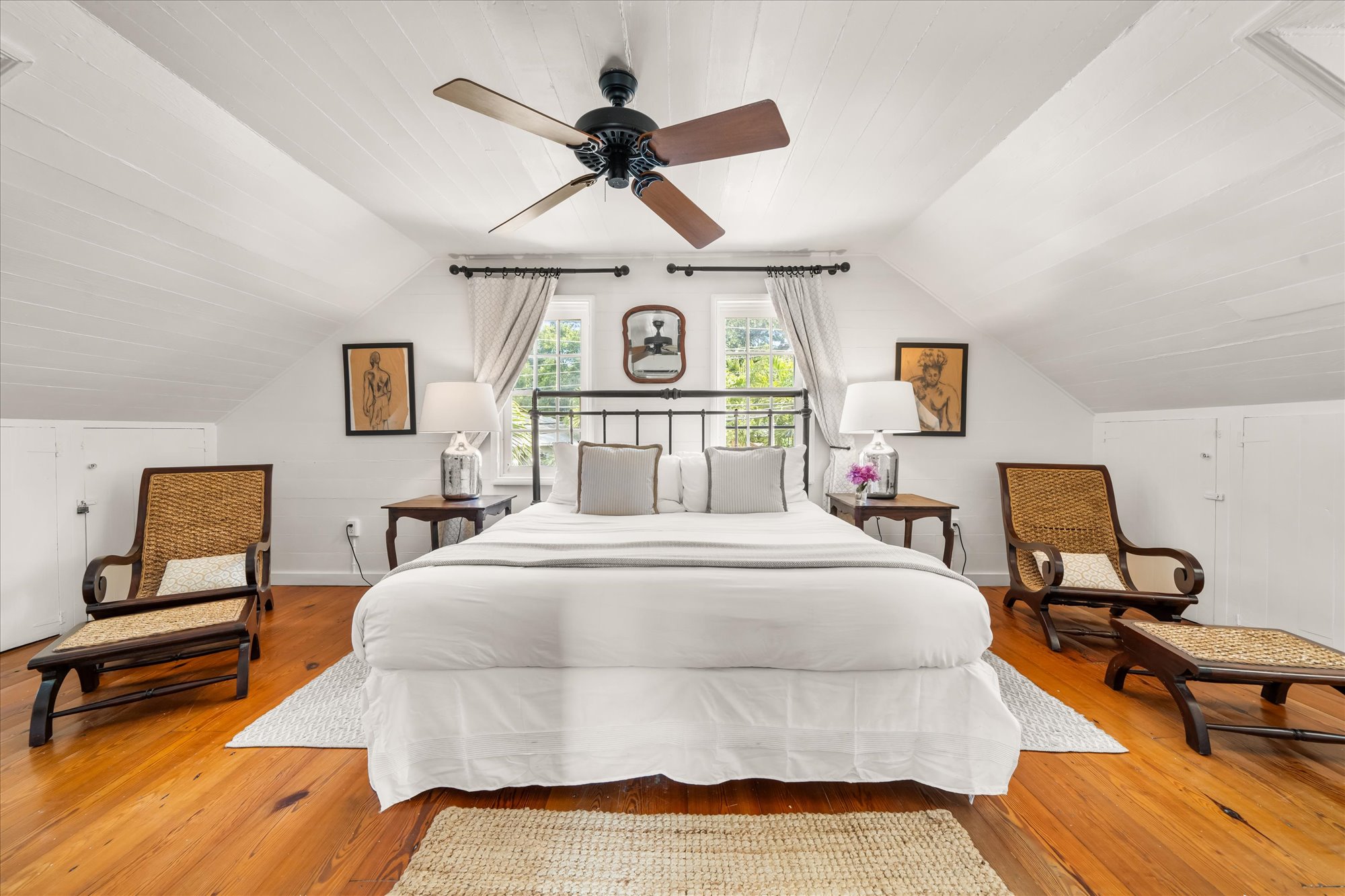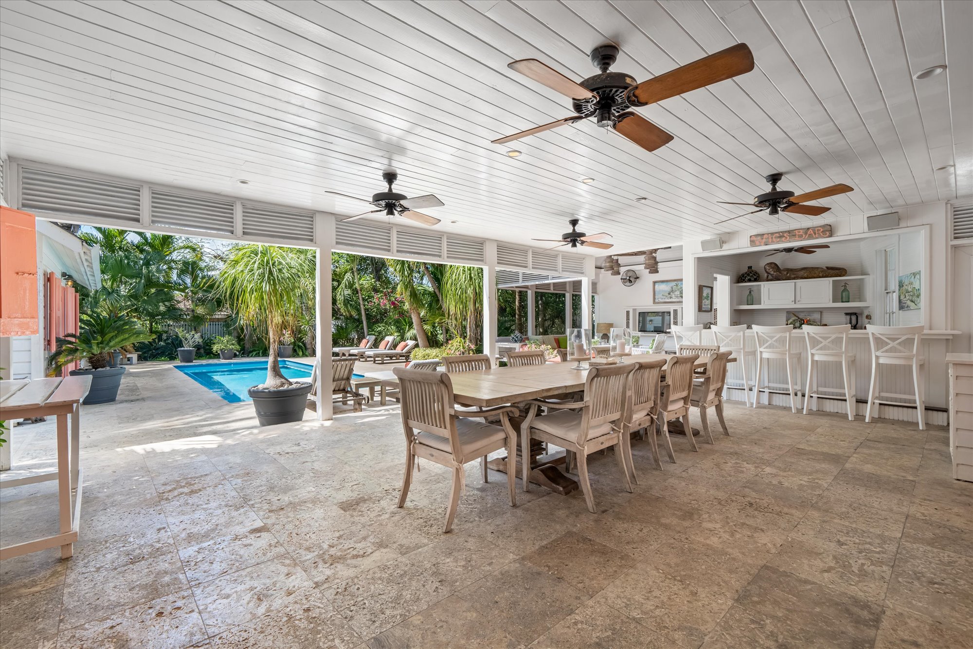 Discover The Hatch, a truly exceptional historical home that seamlessly blends authentic charm with modern conveniences and expansive tropical outdoor living. This one-of-a-kind property offers an unparalleled island lifestyle, making it both a perfect retreat and a lucrative investment opportunity. Designed for relaxation and entertaining, The Hatch features a spacious covered dining area, an open-air living room, and a seated bar, all overlooking a heated pool surrounded by lush landscaped gardens. The outdoor space is further enhanced by a poolside lounge, a billiards table, and an expansive top deck, perfect for sunset views. On the upstairs deck, the bay and sunsets can be seen, creating a breathtaking backdrop for evening relaxation. Inside, the main house offers two beautifully appointed upstairs bedrooms—a master suite with a king bed and a second bedroom with a queen bed, sharing a bathroom with a clawfoot bathtub and a separate shower. The downstairs bedroom, featuring a queen bed and en-suite bath, provides additional privacy. A separate guest house serves as the fourth bedroom, complete with its own en-suite bathroom, ensuring comfort and privacy for guests. Every bedroom is equipped with individual A/C units for maximum convenience. The gourmet kitchen boasts stainless steel appliances, hand-crafted wood cabinetry, and a traditional wooden countertop, flowing effortlessly into the covered dining area that comfortably seats 12. Two distinct living rooms—one inside, offering a tranquil space with white slipcovered sofas and chairs, and another outdoors, located beside the bar and dining area—allow for both quiet moments and lively gatherings. The outdoor living space, complete with built-in sofas and a TV, offers a seamless indoor-outdoor experience, where guests can unwind while watching their favorite show or floating in the pool. For those seeking a peaceful escape, the front porch swing and rocking chairs provide the perfect spot to enjoy a cool drink and take in the surroundings. Adding to its practicality, The Hatch is fully equipped with a generator and a rainwater cistern, ensuring self-sufficiency and peace of mind. Beyond its beauty and functionality, The Hatch is the top rental property on the island, averaging 42 weeks of bookings per year. With an impressive rental history, including 55% repeat clientele, it stands as a premier investment opportunity. Additionally, the historical property tax exemption adds even more value to this remarkable home. Whether you’re looking for a private sanctuary, an entertainer’s dream, or a proven income-generating asset, The Hatch delivers on every level. Experience the best of island living with this rare and sought-after property.
