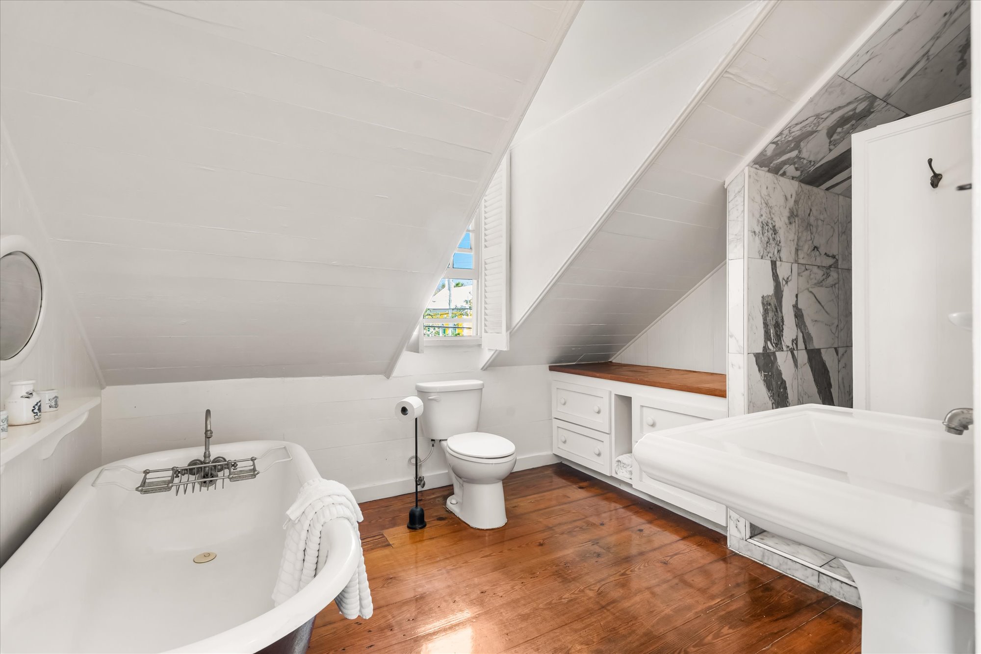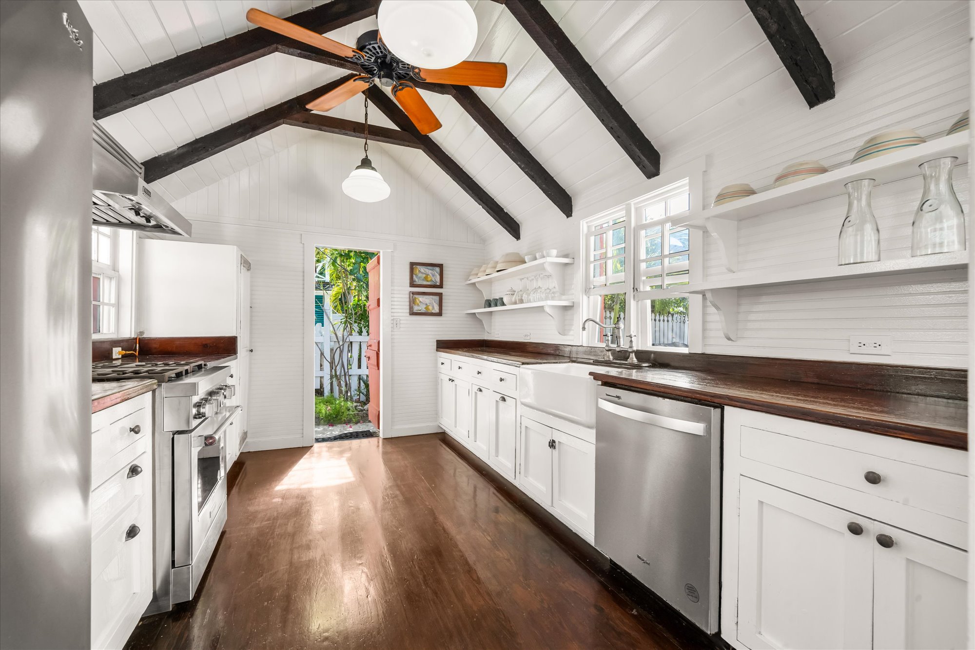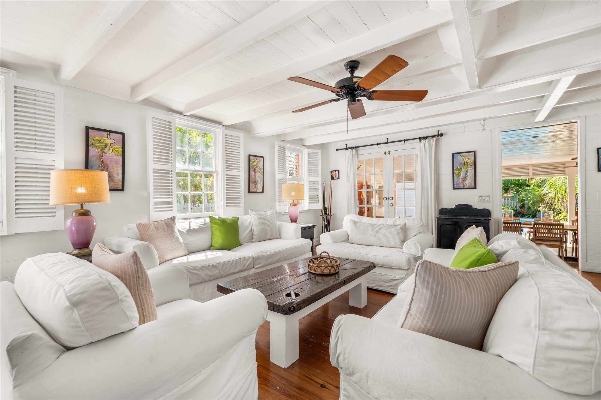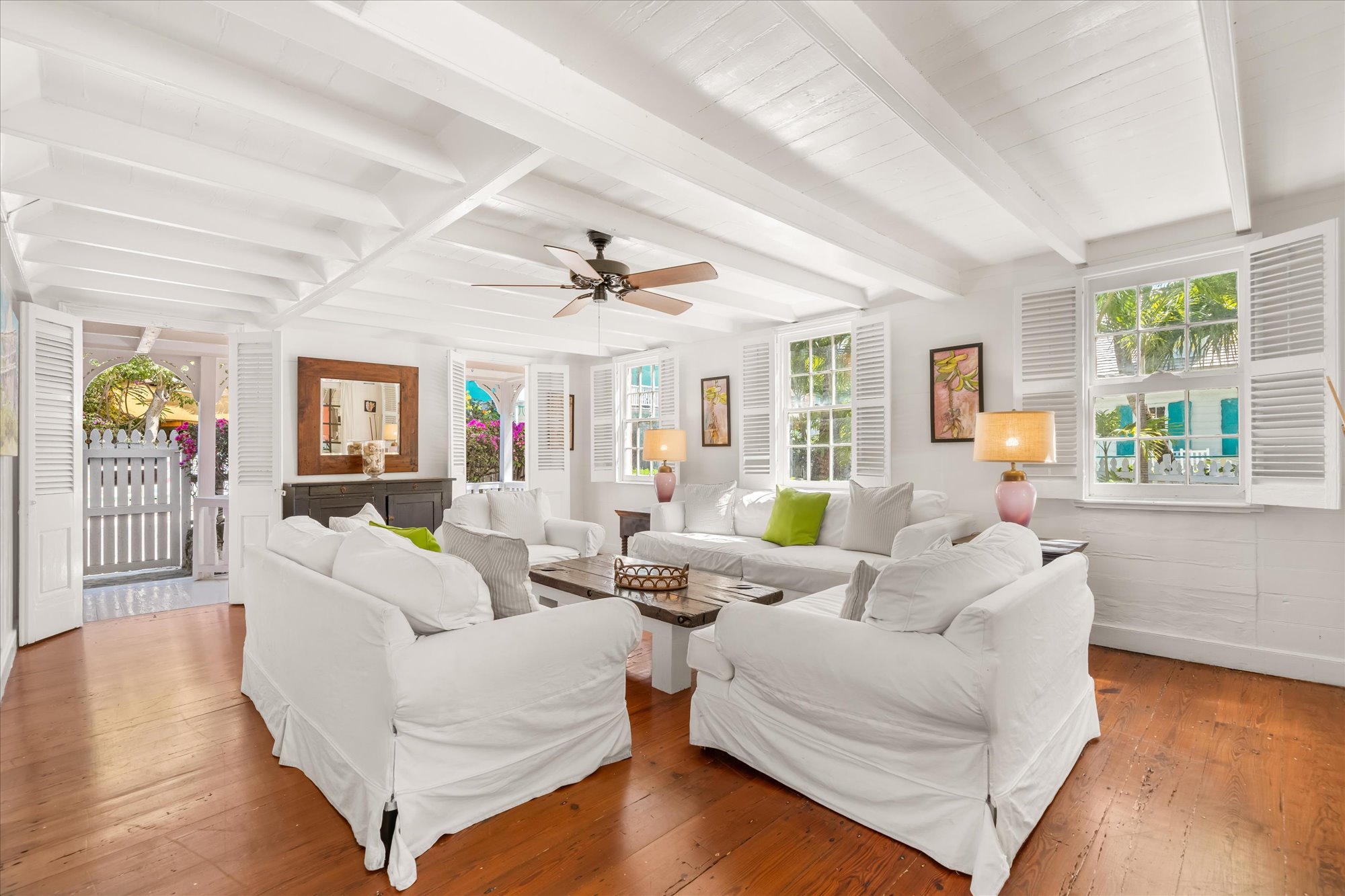 Discover The Hatch, a truly exceptional historical home that seamlessly blends authentic charm with modern conveniences and expansive tropical outdoor living. This one-of-a-kind property offers an unparalleled island lifestyle, making it both a perfect retreat and a lucrative investment opportunity. Designed for relaxation and entertaining, The Hatch features a spacious covered dining area, an open-air living room, and a seated bar, all overlooking a heated pool surrounded by lush landscaped gardens. The outdoor space is further enhanced by a poolside lounge, a billiards table, and an expansive top deck, perfect for sunset views. On the upstairs deck, the bay and sunsets can be seen, creating a breathtaking backdrop for evening relaxation. Inside, the main house offers two beautifully appointed upstairs bedrooms—a master suite with a king bed and a second bedroom with a queen bed, sharing a bathroom with a clawfoot bathtub and a separate shower. The downstairs bedroom, featuring a queen bed and en-suite bath, provides additional privacy. A separate guest house serves as the fourth bedroom, complete with its own en-suite bathroom, ensuring comfort and privacy for guests. Every bedroom is equipped with individual A/C units for maximum convenience. The gourmet kitchen boasts stainless steel appliances, hand-crafted wood cabinetry, and a traditional wooden countertop, flowing effortlessly into the covered dining area that comfortably seats 12. Two distinct living rooms—one inside, offering a tranquil space with white slipcovered sofas and chairs, and another outdoors, located beside the bar and dining area—allow for both quiet moments and lively gatherings. The outdoor living space, complete with built-in sofas and a TV, offers a seamless indoor-outdoor experience, where guests can unwind while watching their favorite show or floating in the pool. For those seeking a peaceful escape, the front porch swing and rocking chairs provide the perfect spot to enjoy a cool drink and take in the surroundings. Adding to its practicality, The Hatch is fully equipped with a generator and a rainwater cistern, ensuring self-sufficiency and peace of mind. Beyond its beauty and functionality, The Hatch is the top rental property on the island, averaging 42 weeks of bookings per year. With an impressive rental history, including 55% repeat clientele, it stands as a premier investment opportunity. Additionally, the historical property tax exemption adds even more value to this remarkable home. Whether you’re looking for a private sanctuary, an entertainer’s dream, or a proven income-generating asset, The Hatch delivers on every level. Experience the best of island living with this rare and sought-after property.