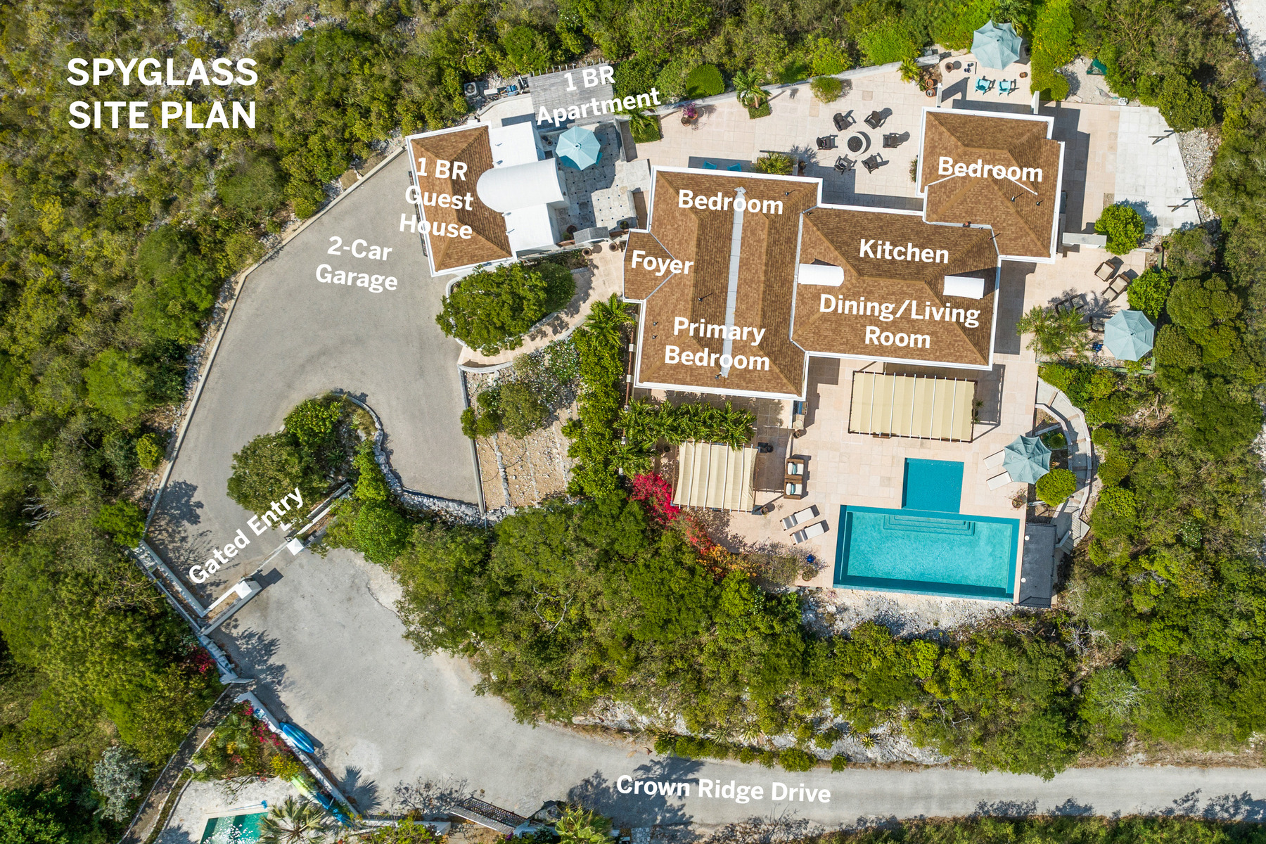 Perched atop Blue Mountain at one of the highest elevations in Providenciales, Spyglass is a private sanctuary commanding unobstructed ocean views on both sides of the island. Set on an expansive 0.85-acre lot, this reimagined luxury estate blends timeless Caribbean elegance with modern comfort. Originally built in 1990 and completely transformed between 2016 and 2018, Spyglass features 5 bedrooms, 5.5 bathrooms, and over 3,160 sq. ft. of refined interiors. The 2,350 sq. ft. main house boasts an open-concept living and dining area, framed by 10-foot sliding glass doors leading to an expansive pool terrace. The chef’s kitchen is beautifully appointed with an induction cooktop, electric oven, wine fridge, and travertine flooring throughout. For privacy and flexibility, the estate includes two self-contained guest residences. The upper-level guest house (460 sq. ft.) offers a private balcony, full kitchen, and spa-like bath, while the lower apartment (350 sq. ft.) provides an independent one-bedroom retreat with its own entrance. A two-car garage below completes this exclusive residence. Designed for seamless indoor-outdoor living, the estate features a 36-foot-long pool, two gazebos, and a south terrace with a built-in propane firepit, creating a spectacular setting for relaxation and entertaining. Gated access ensures privacy and security, while the lush tropical surroundings enhance the sense of tranquility. Just minutes from Babalua Beach, Grace Bay, and the island’s best snorkeling, Spyglass is located in one of the most coveted enclaves of the North Shore, surrounded by premier developments such as Beach Enclave North Shore, The Summit, and the soon-to-be-completed M-House. With its expansive layout, independent guest accommodations, and breathtaking views, Spyglass is a one-of-a-kind Caribbean sanctuary, offering the ultimate in privacy, luxury, and investment potential.