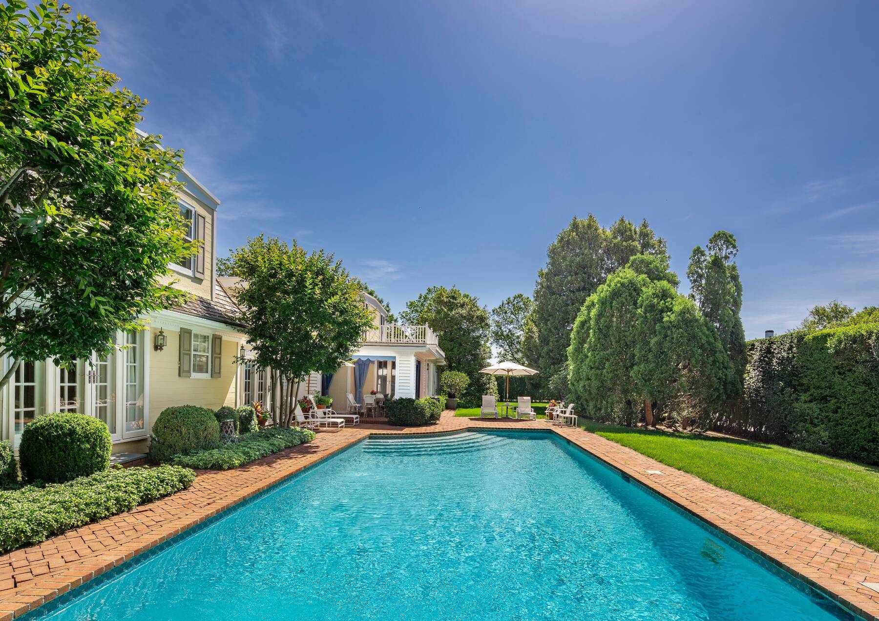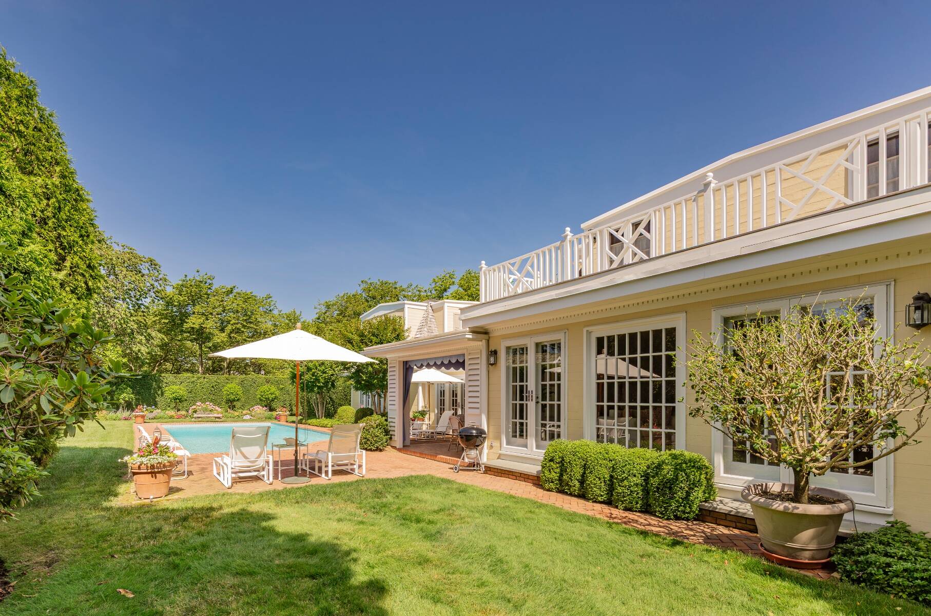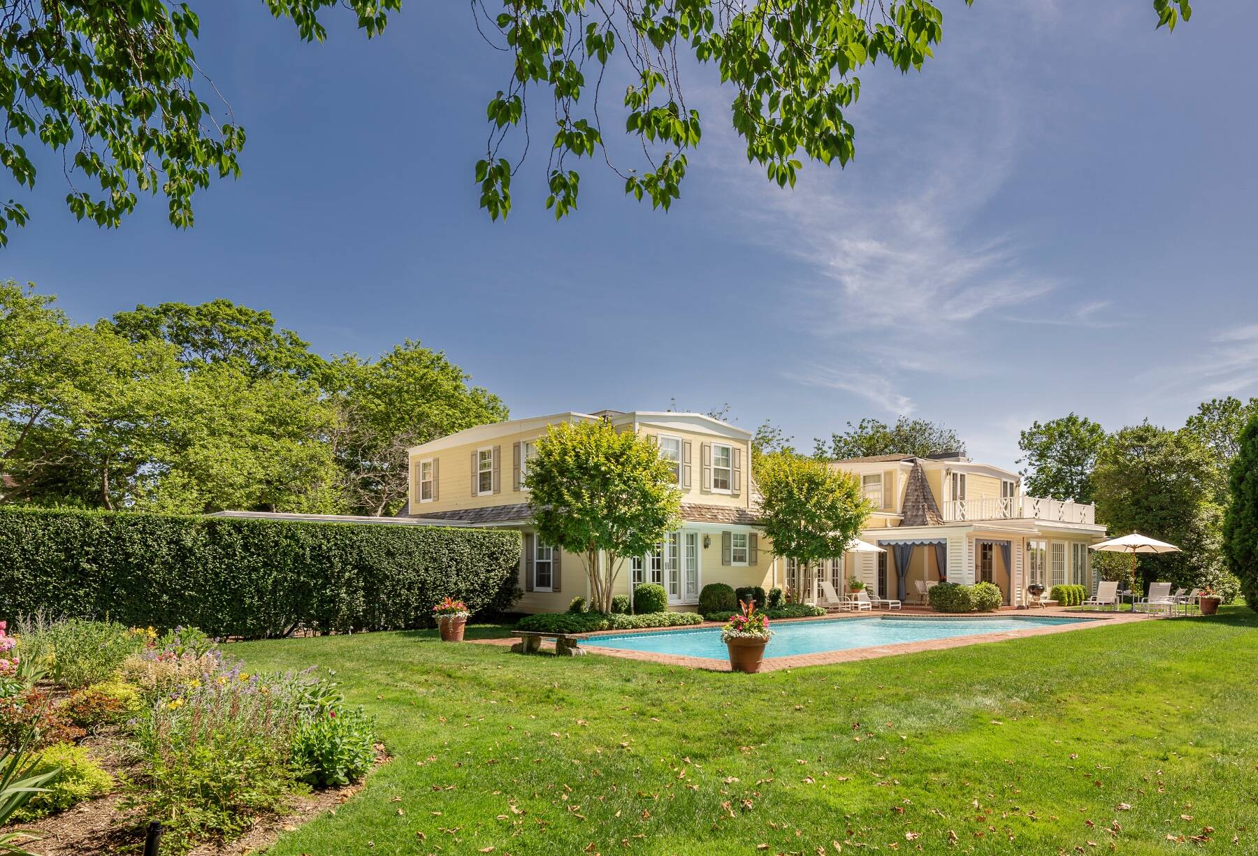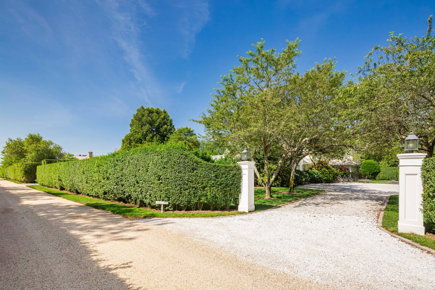 Tucked away on one of the most iconic private streets off world-famous Gin Lane, this classic Southampton residence offers timeless charm, privacy, and exclusive beach access. Set on beautifully landscaped grounds, the property is surrounded by lush greenery, creating a serene oasis just moments from the ocean. Inside, the home is filled with natural light, with large windows and French doors that invite the outdoors in. The main house features five bedrooms and six bathrooms across two levels, including a sun-drenched primary suite with dual baths, walk-in closets, and a private terrace. A separate guest wing offers additional space and comfort for visitors. Gracious living and dining rooms, a bright and functional chef's kitchen, and a cozy den all open to the gardens, perfect for relaxed summer living. Outdoors, the covered porches and patios are ideal for entertaining, while a heated gunite pool is nestled among mature landscaping. With private access to one of the most beautiful beaches in the Hamptons, this is a rare opportunity in the heart of Southampton Village.