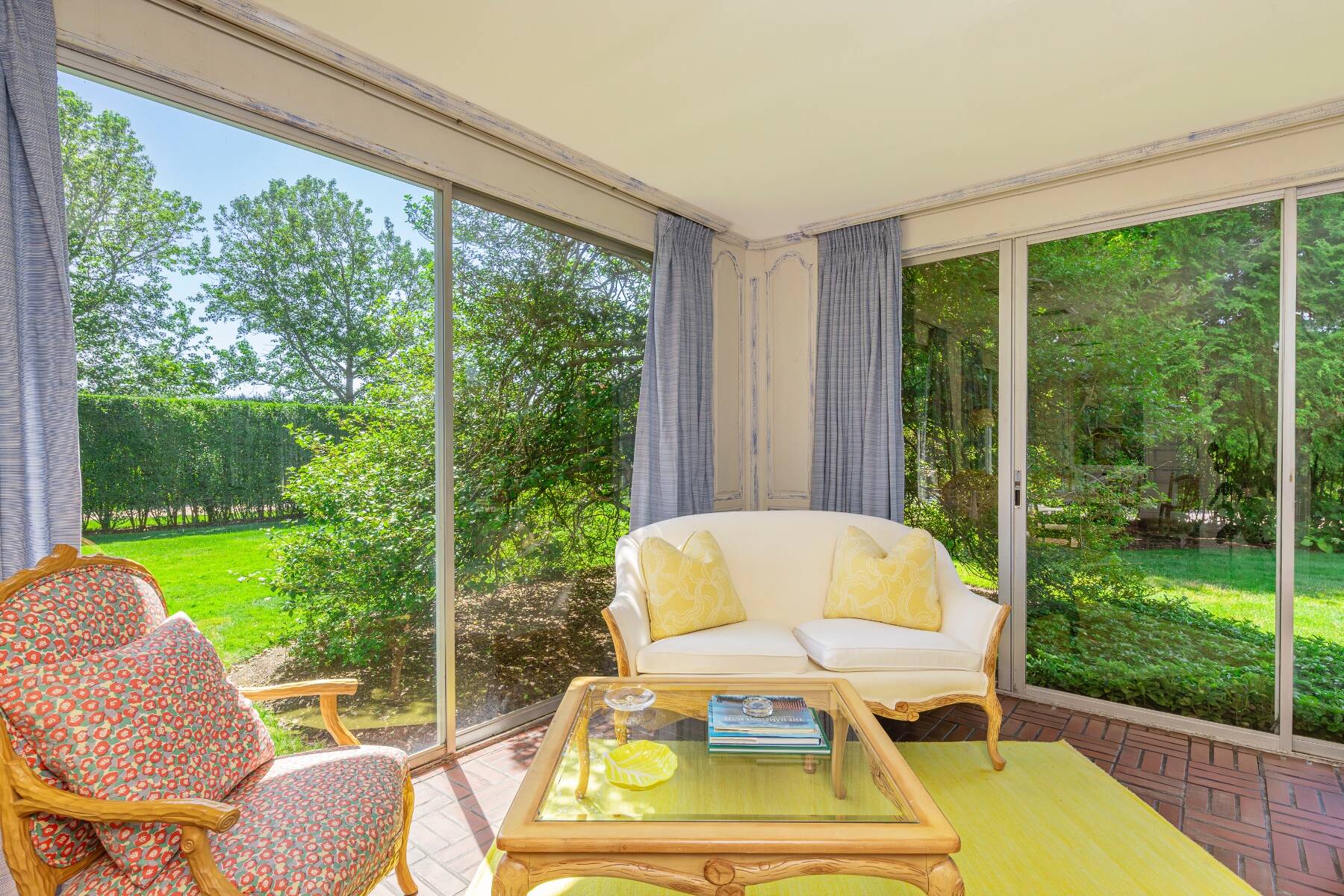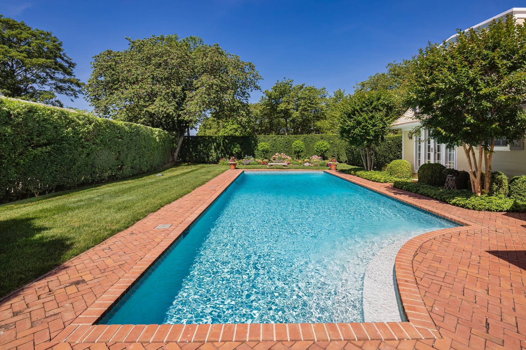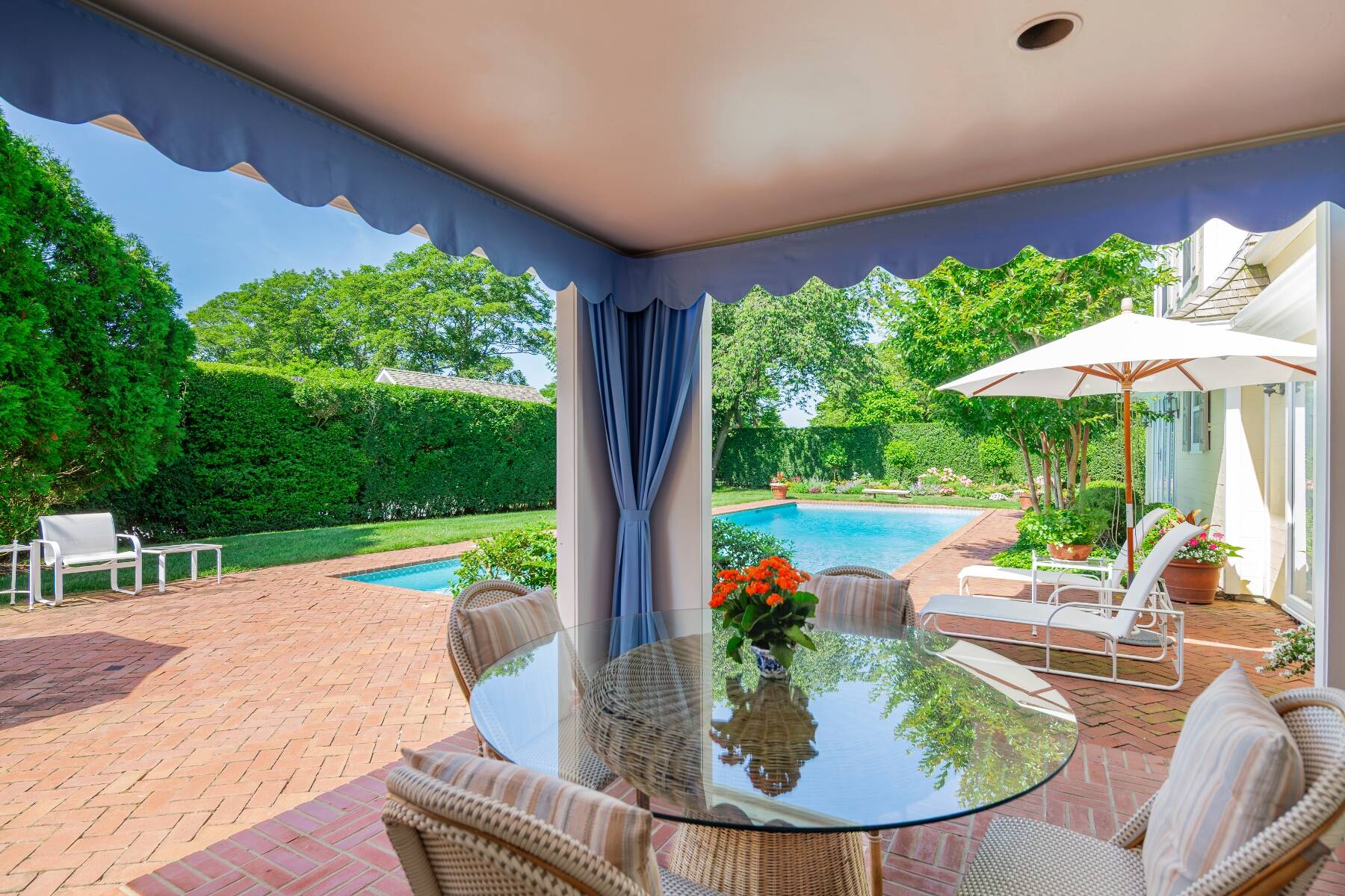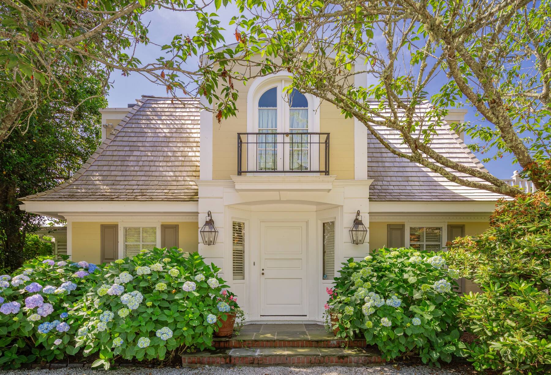 Tucked away on one of the most iconic private streets off world-famous Gin Lane, this classic Southampton residence offers timeless charm, privacy, and exclusive beach access. Set on beautifully landscaped grounds, the property is surrounded by lush greenery, creating a serene oasis just moments from the ocean. Inside, the home is filled with natural light, with large windows and French doors that invite the outdoors in. The main house features five bedrooms and six bathrooms across two levels, including a sun-drenched primary suite with dual baths, walk-in closets, and a private terrace. A separate guest wing offers additional space and comfort for visitors. Gracious living and dining rooms, a bright and functional chef's kitchen, and a cozy den all open to the gardens, perfect for relaxed summer living. Outdoors, the covered porches and patios are ideal for entertaining, while a heated gunite pool is nestled among mature landscaping. With private access to one of the most beautiful beaches in the Hamptons, this is a rare opportunity in the heart of Southampton Village.