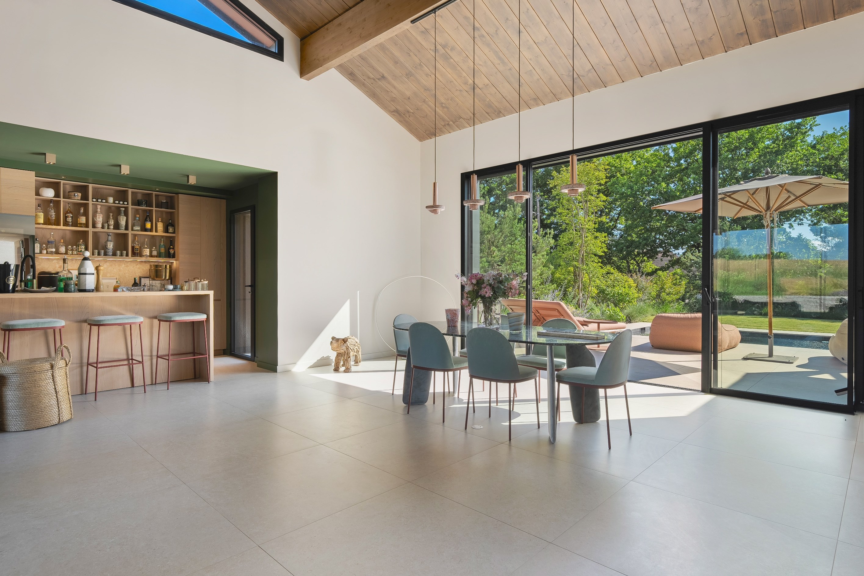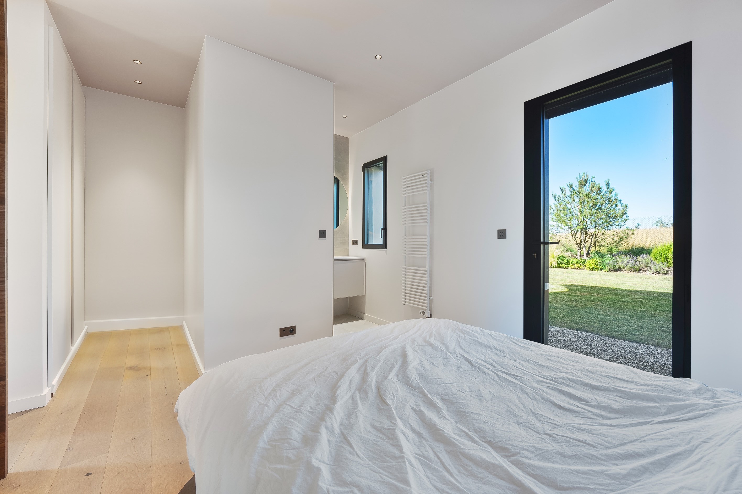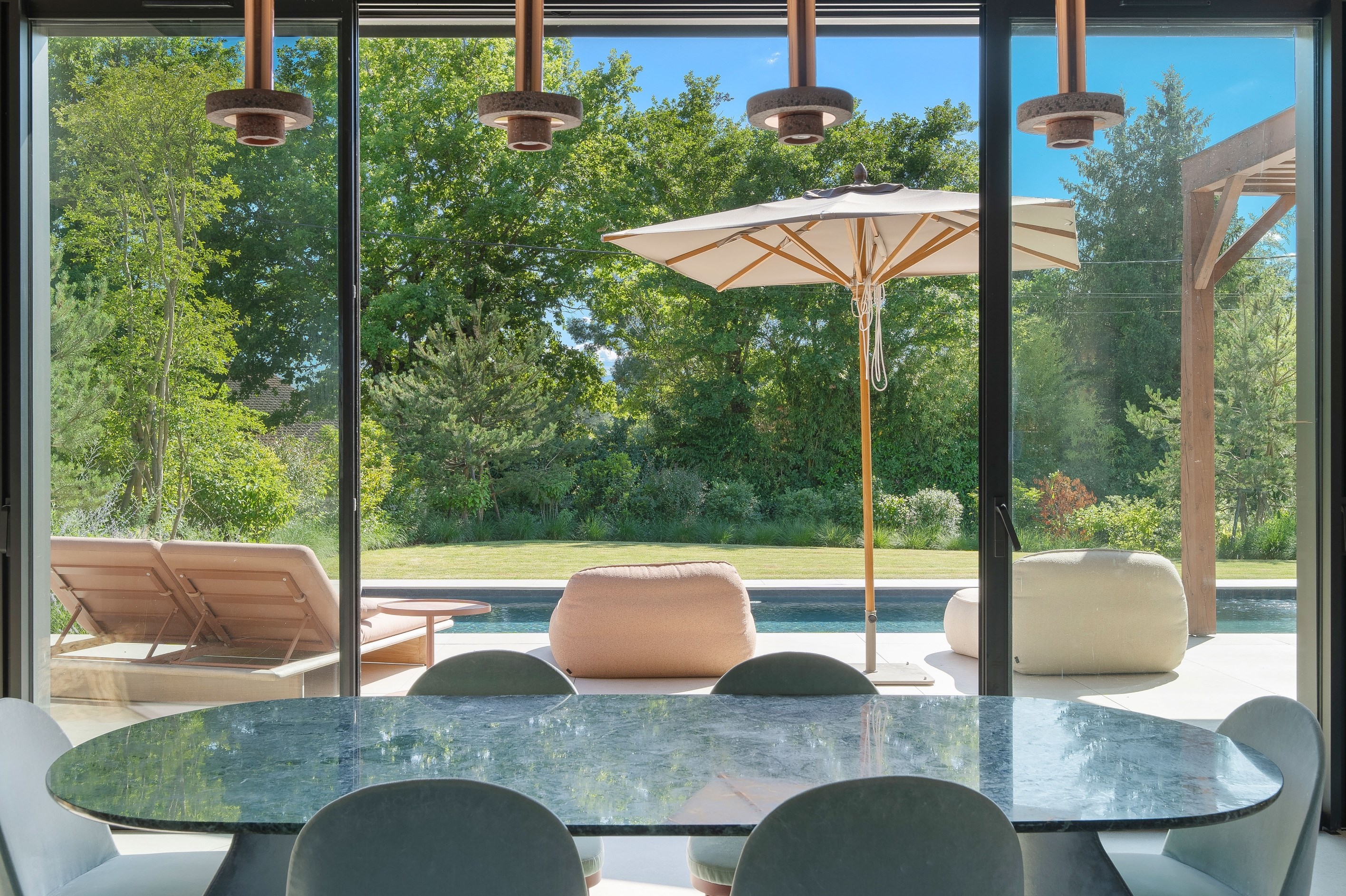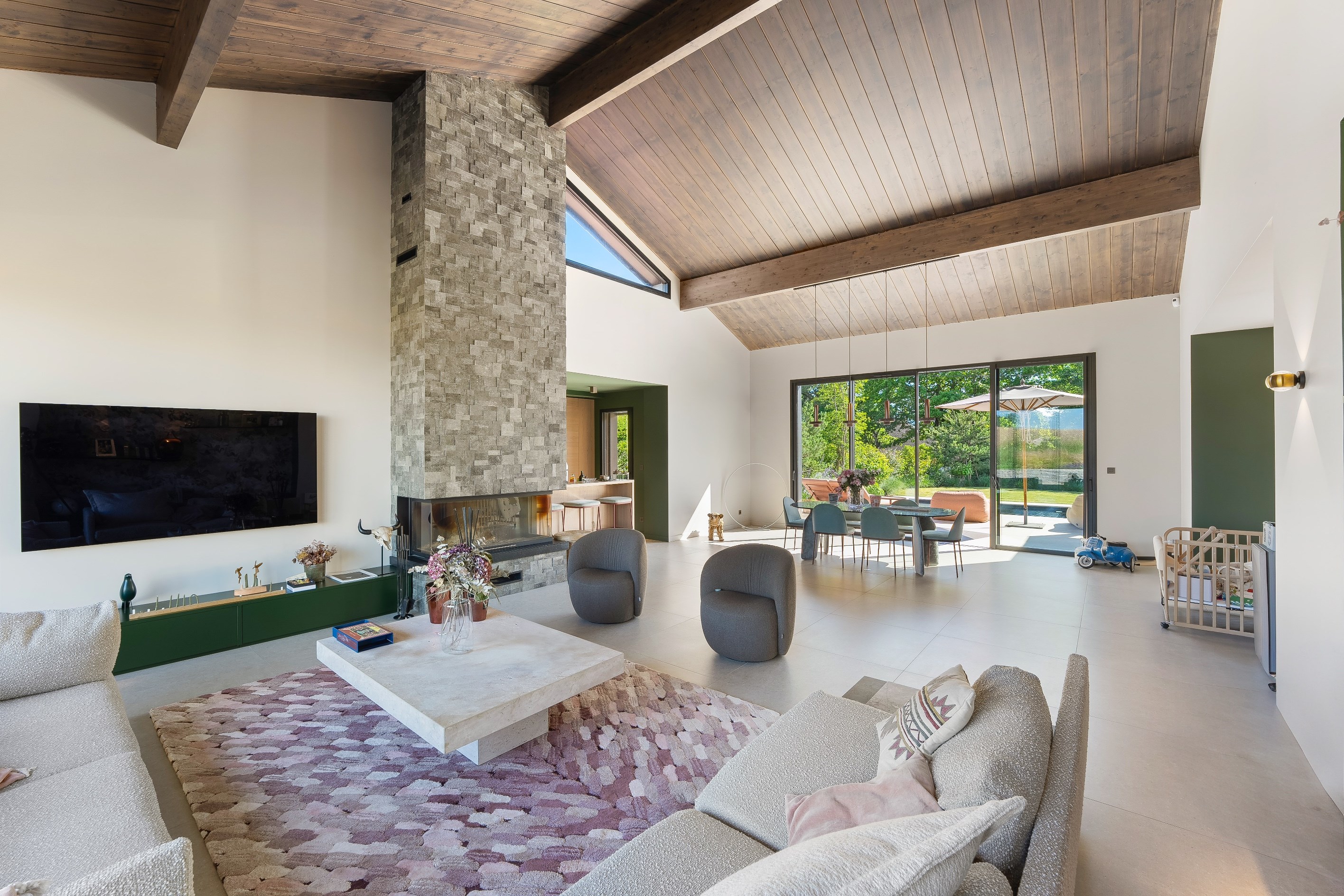 DIVONNE SOTHEBY'S INTERNATIONAL REALTY presents a contemporary villa, recently completed in 2022, enjoying a prime location near the Swiss border. Set on a 1,400 m² plot, this property offers a usable area of 300 m² and stands out for its serene surroundings. Designed by a local architect, the villa elegantly combines stone and wood in a modern style. Spread over two levels, it comprises, on the ground floor, an entrance hall, two bedrooms with en-suite showers, separate toilets, and a fully equipped kitchen with a pantry and laundry room, leading to a spacious living area crowned with a cathedral ceiling. This space includes a living room featuring a fireplace, a dining area that opens onto a terrace and the pool. On the upper floor, the villa features a master suite with its own dressing room, private bathroom, and balcony, as well as two additional bedrooms, a bathroom, and separate toilets. Outside, you will discover a terrace equipped with a pergola, a landscaped garden designed by a professional landscaper, a heated swimming pool, a double garage, and a garden shed, all set in a peaceful residential environment. DIVONNE SOTHEBY'S INTERNATIONAL REALTY, your expert in luxury property sales in the Pays de Gex and Geneva region (Grand Genève). For information on the risks associated with this property, please visit the Géorisques website at https://www.georisques.gouv.fr.