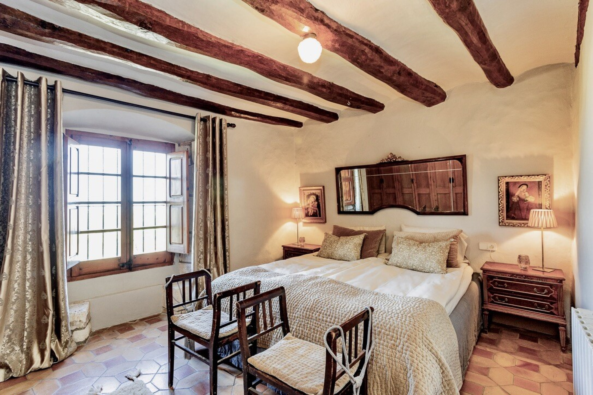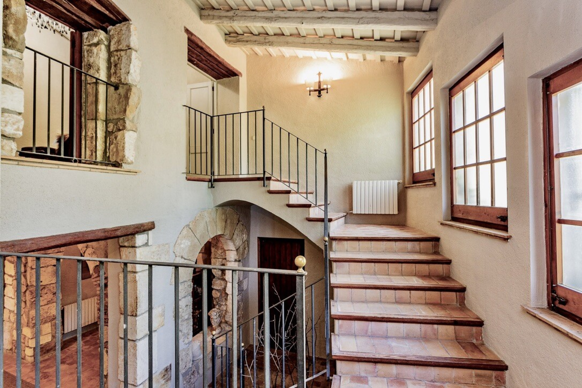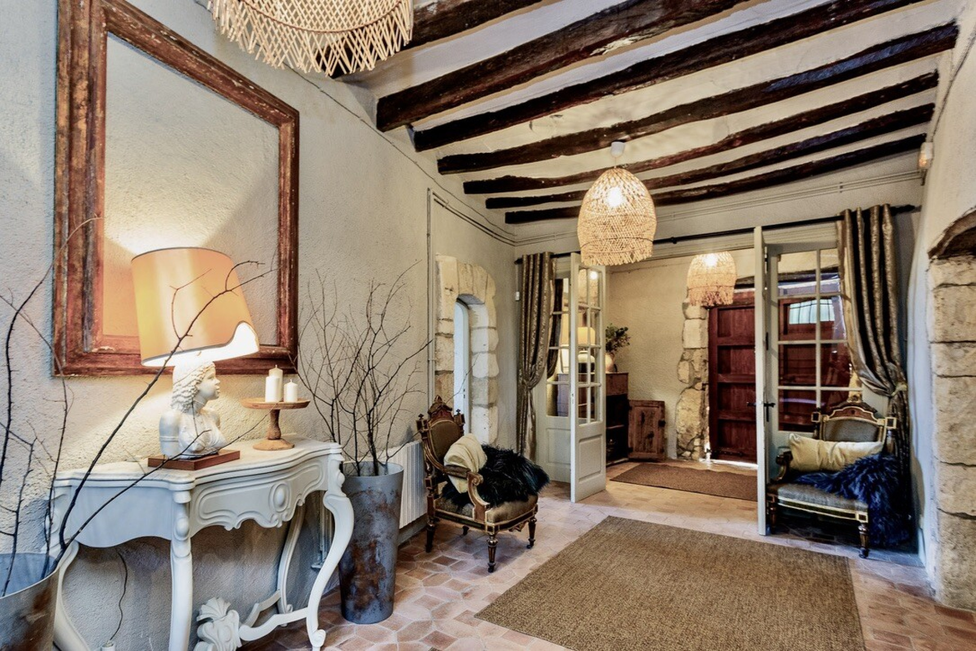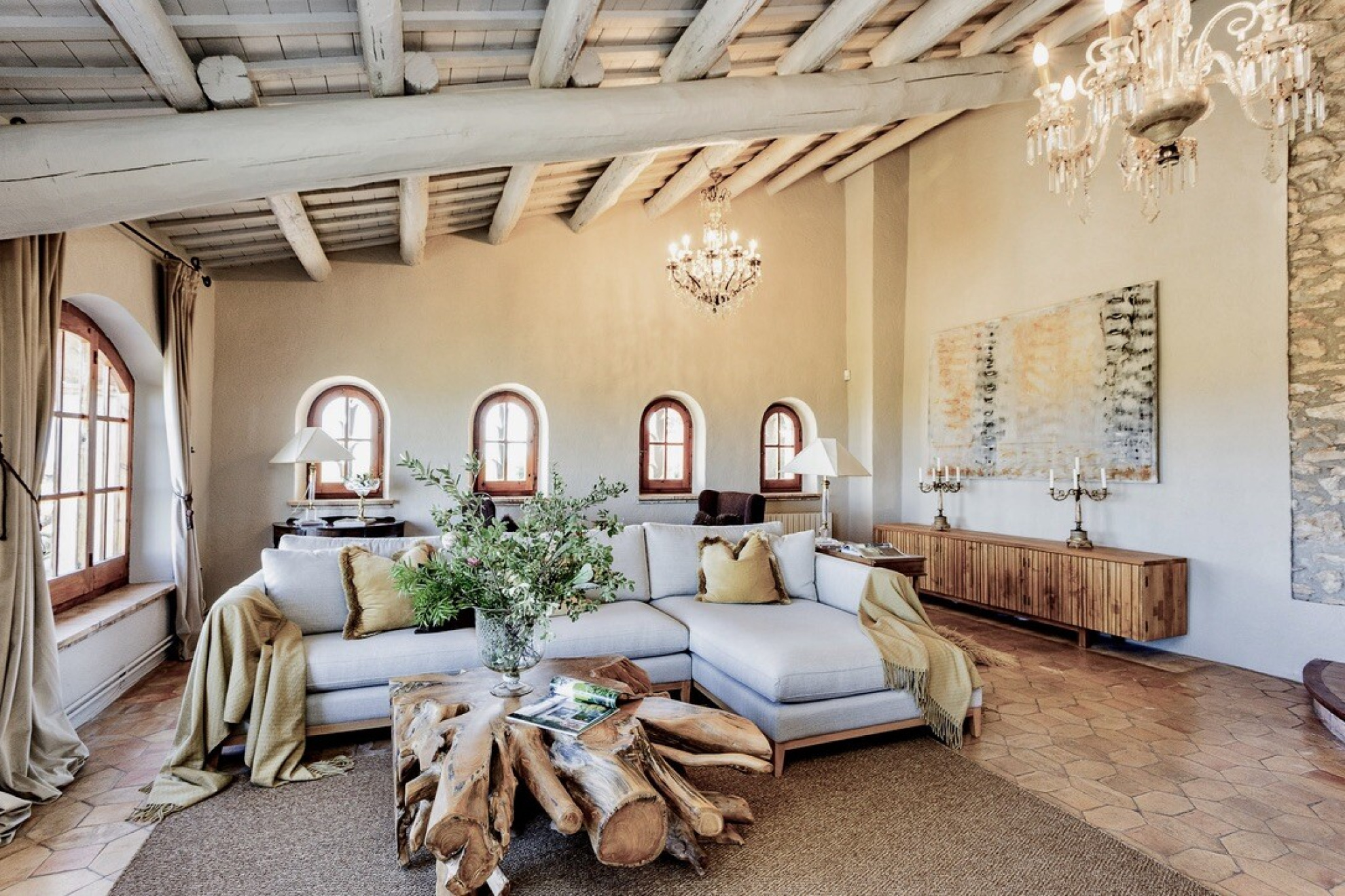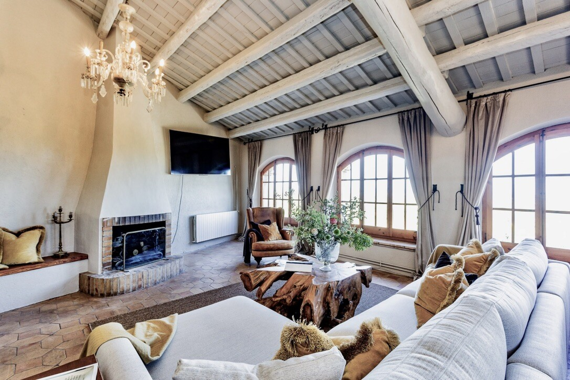 Ascending half a level, one finds an intimate sitting area leading to two double bedrooms, each with its own en-suite. Another half level higher, a further sitting nook gives access to two charming mezzanine bedrooms, again en-suite. On this floor, a second grand living room with soaring ceilings and striking arched windows frames the countryside views to perfection. Continuing upwards, the main living level offers two further en-suite double bedrooms.