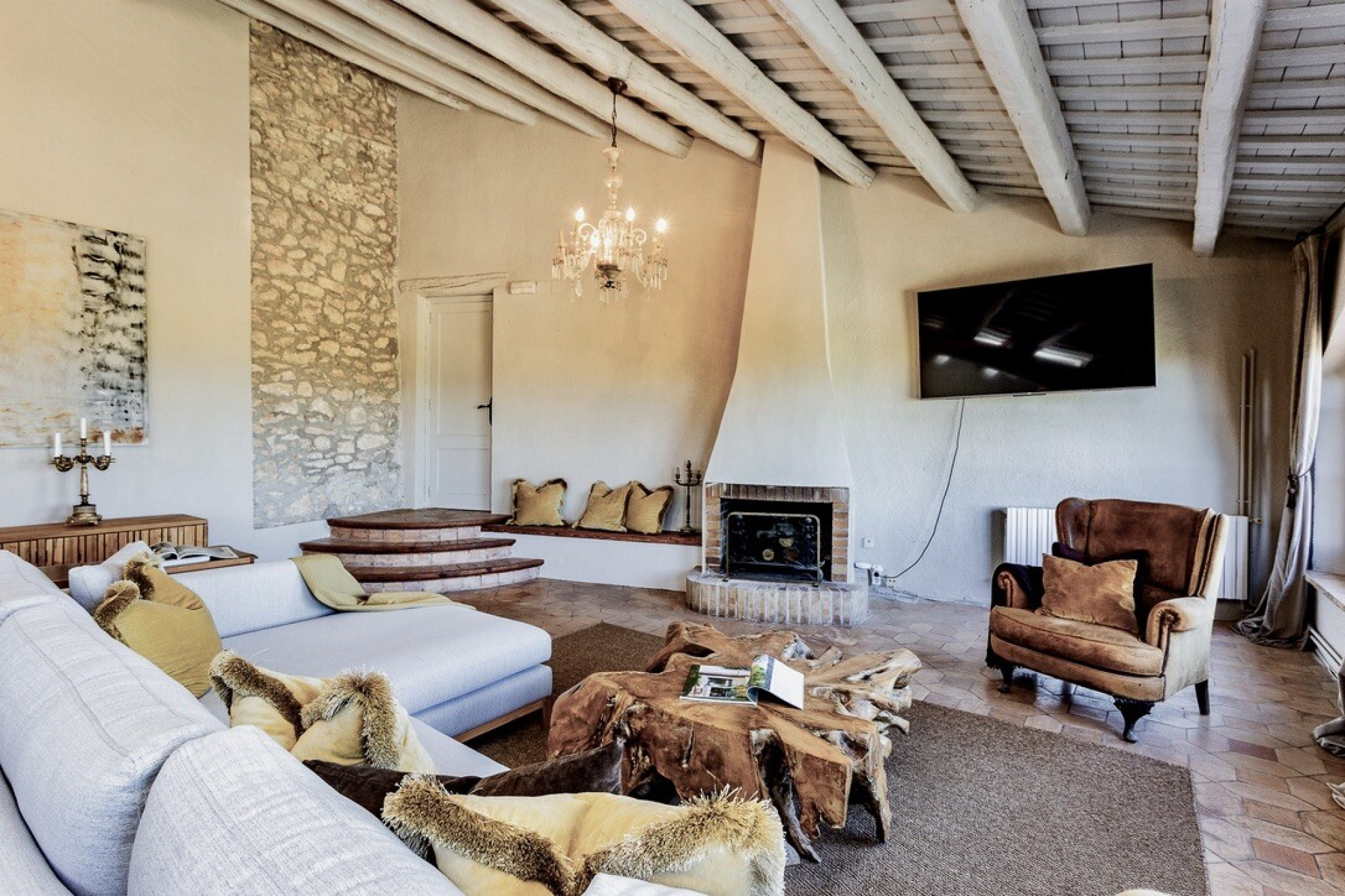 Built across four natural levels, the home unfolds beautifully along the slope of the land. Through the grand wooden entrance doors lies a warmly decorated hall that sets the tone. To the right, a large sitting and dining room with a welcoming fireplace opens onto a covered L-shaped terrace, where breath-taking vineyard and mountain vistas can be savoured. To the left, a fully equipped professional kitchen, storage room and a guest cloakroom complete the space.