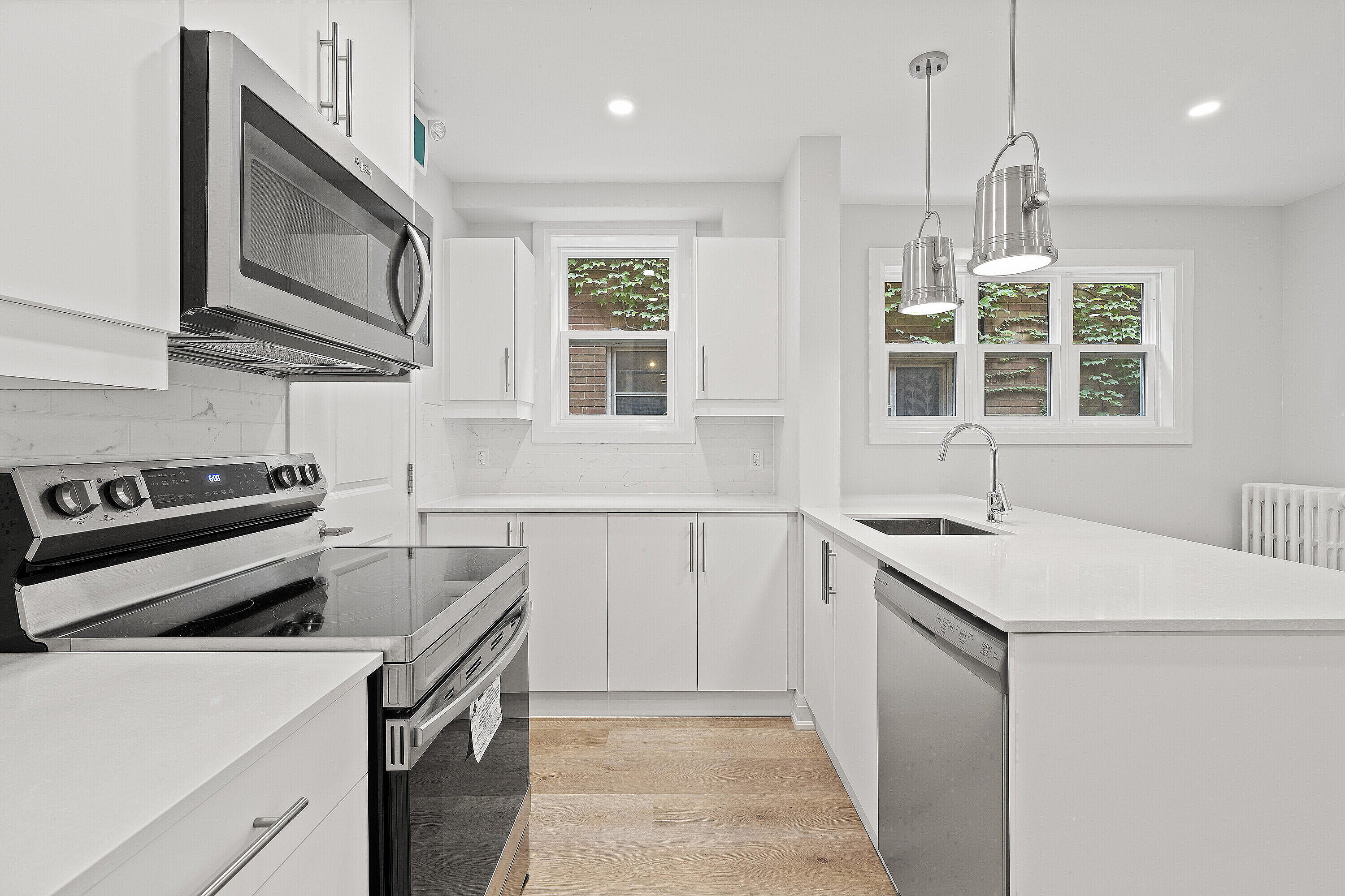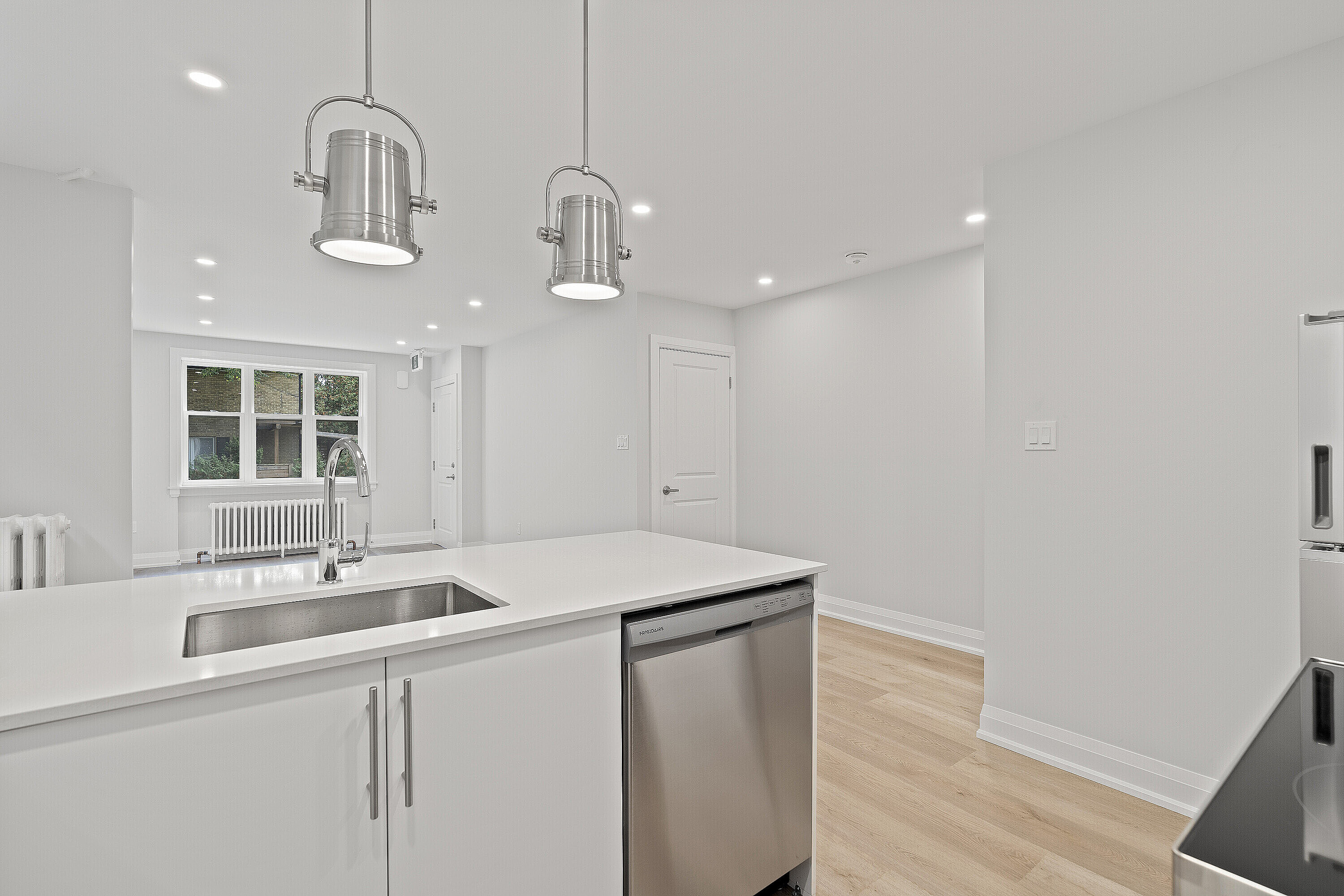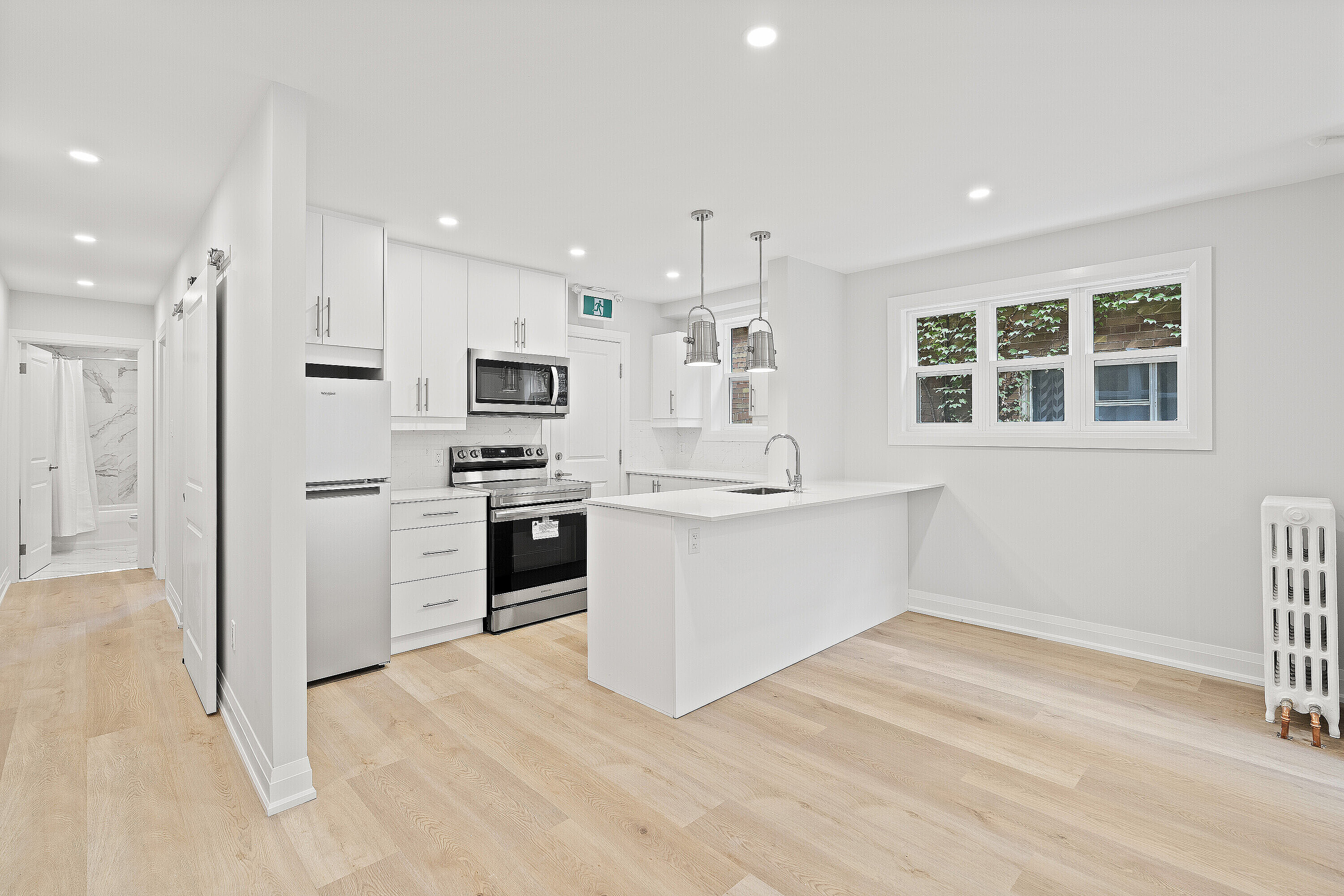This beautifully renovated main-floor one-bedroom plus den apartment is perfectly nestled on a quiet, dead-end street in the highly sought-after Lawrence Park neighborhood of Toronto. Flooded with natural light, the open-concept living and dining spaces create a warm and welcoming atmosphere. The updated kitchen features stone countertops, stainless steel appliances, and a convenient island perfect for hosting gatherings. The spacious bedroom offers plenty of closet space and a sunny vibe for ultimate comfort. The roomy den, complete with a window, is a blank canvas-ideal for a nursery, a cozy home office, or even an extra bedroom. You'll also love the new ensuite laundry for added convenience. This desirable main-floor unit offers easy access and a dog lover's dream lifestyle, with ravine trails just down the street-perfect for peaceful walks and outdoor enjoyment. The professionally managed building ensures hassle-free living, and the location can't be beat - just steps to the Lawrence subway station, top schools, parks, boutique shops, and popular restaurants. This rental property embodies both sophistication and convenience in one of Lawrence Park's most coveted settings.