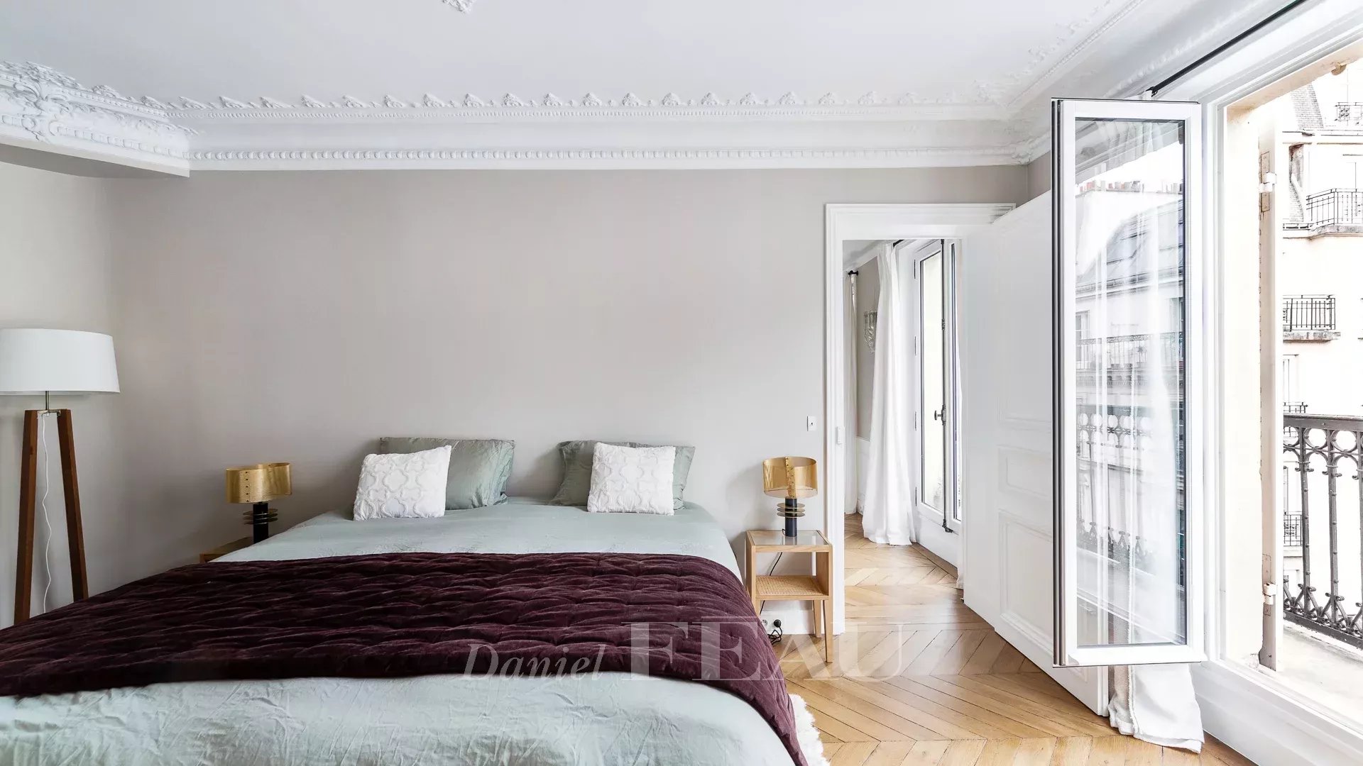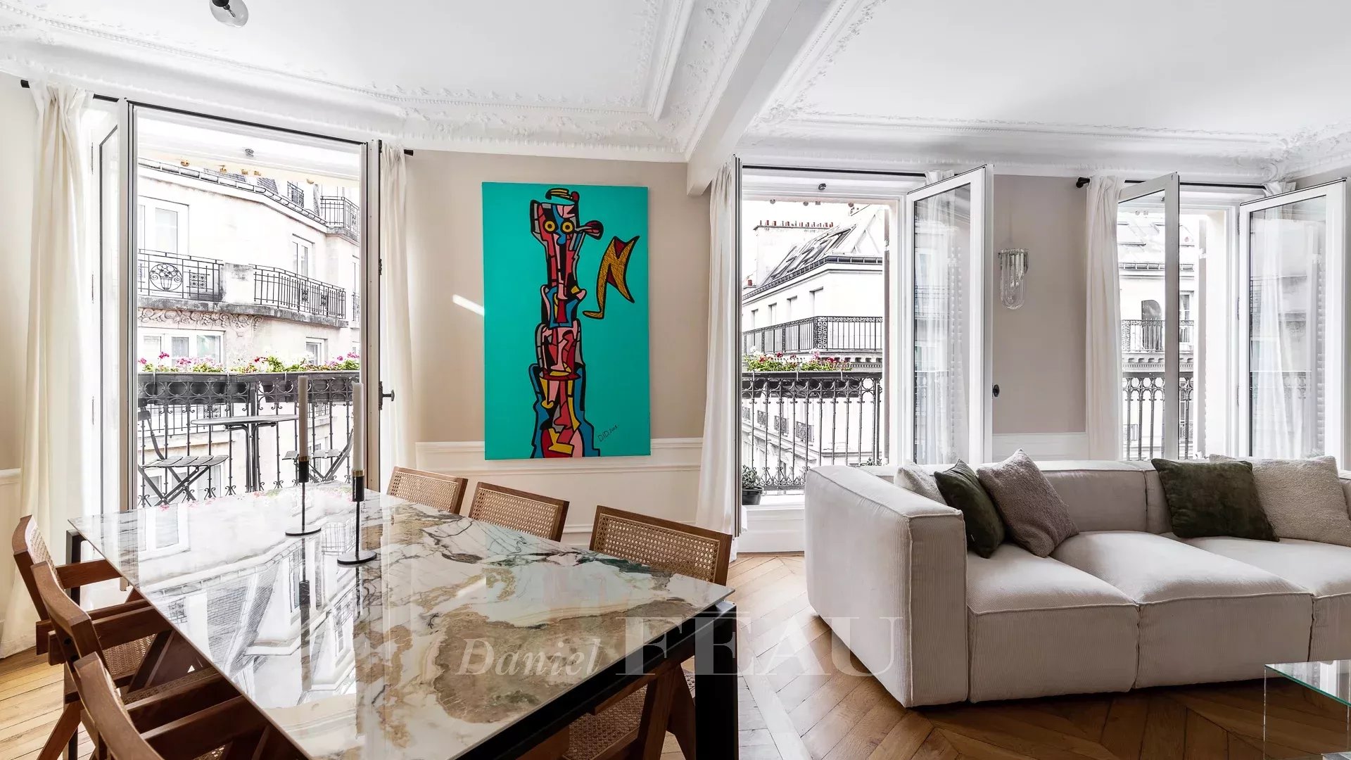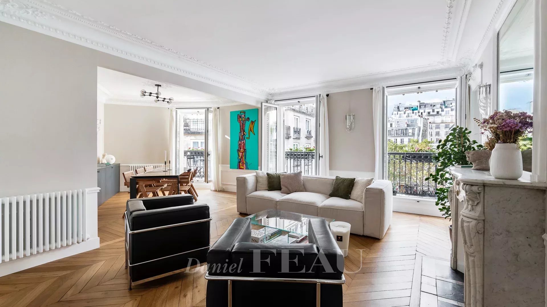 Sole Agent. This bright dual-aspect apartment is on the 5th floor of a fine freestone building with a lift located in a peaceful sought-after in the immediate vicinity of lively rue des Martyrs and avenue Trudaine. Renovated throughout by an interior decorator, it offers 91.42 sqm of floor space and 90.07 sqm of living space as defined by the Carrez Law including a double living/reception room opening onto a balcony enjoying an open view, a separate fully equipped kitchen, a master suite, a second bedroom with a shower room, and a separate wc.