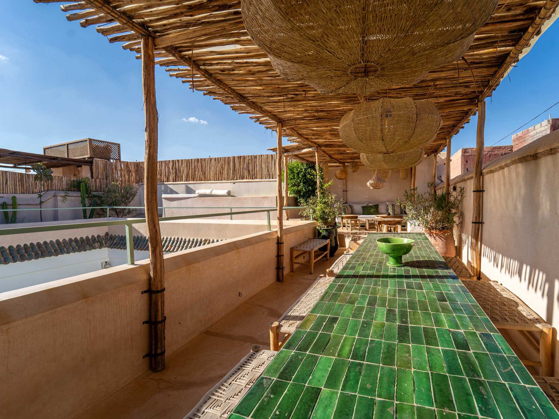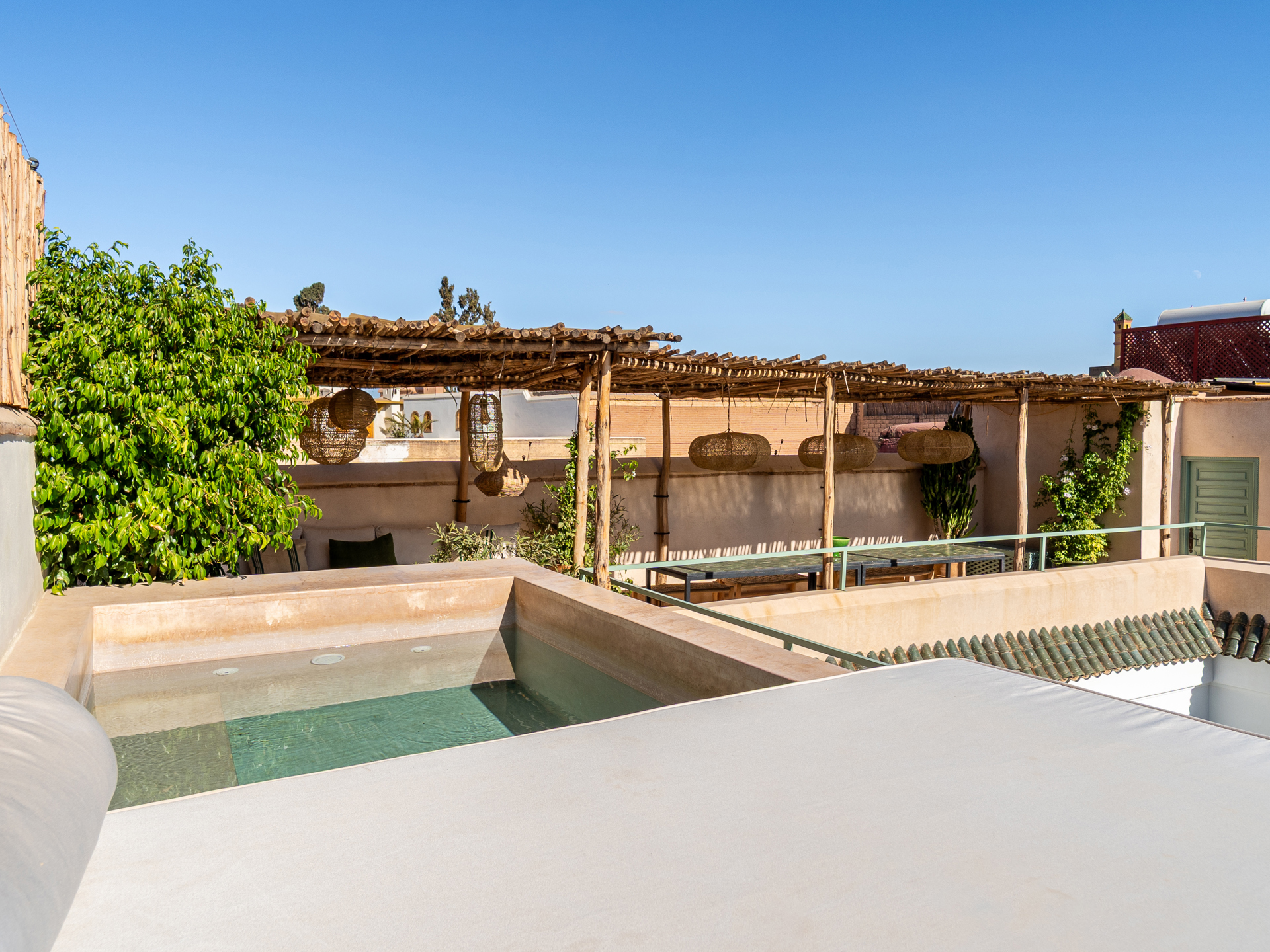Arranged over two levels around a spacious and landscaped patio, the ground floor features generous open living spaces, a dining room, a fully equipped kitchen, as well as a pool located in the heart of the patio, ideal for cooling off during the hottest hours. Upstairs, a gallery serves five elegant bedrooms, each with its own private bathroom and refined finishes showcasing noble materials and Moroccan craftsmanship. The terraces are designed as lounge areas, a solarium, and a dining corner, and feature a second rooftop pool, creating a true rooftop oasis with breathtaking views over the medina’s rooftops and, on clear days, the Atlas Mountains, perfect for breakfast at height or private dinners under the stars.