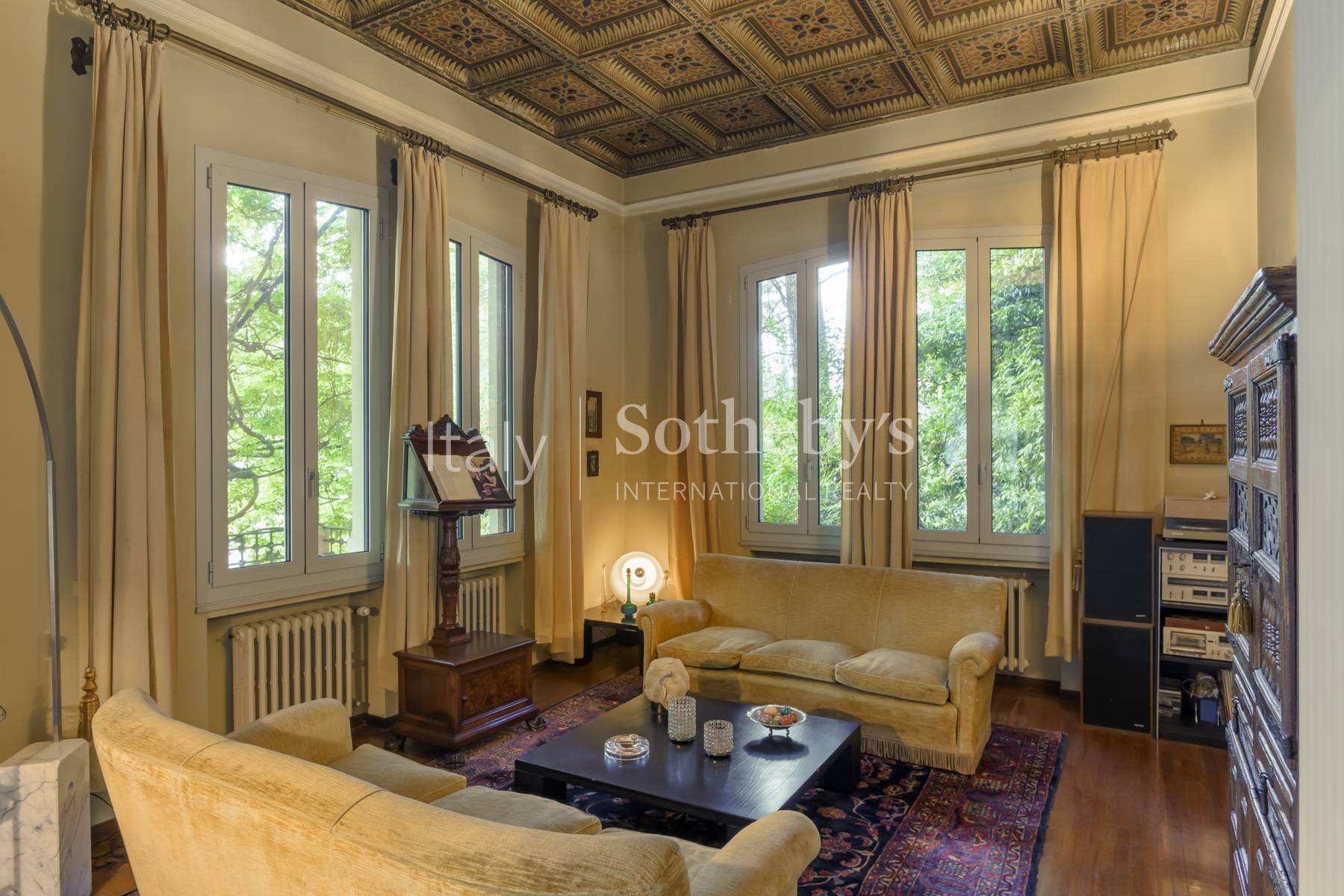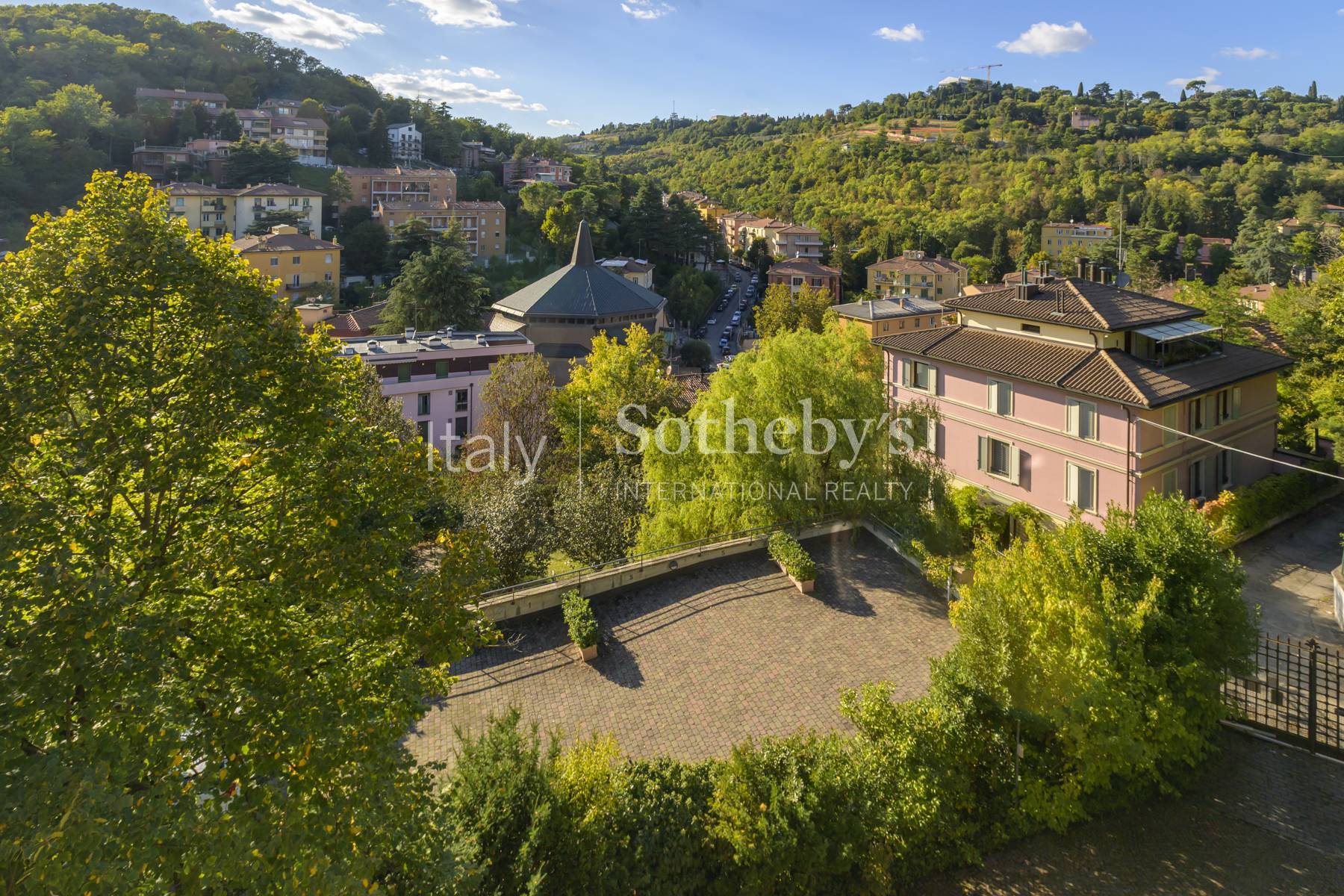Just steps from the center of Bologna, this splendid Art Nouveau villa from the early 1900s represents a rare example of elegance and historical charm. The property is spread over four levels, with a total internal surface area of approximately 460 m2, and is surrounded by a 900 m2 garden. On the ground floor, the entrance leads to a spacious living room with coffered ceilings, which opens onto a 40 square meter panoramic terrace overlooking the Bologna hills. This level also includes an elegant dining room, a kitchen, a second, more informal dining room, and a bathroom. The first floor houses the main sleeping area, with five bedrooms, including a master suite with a balcony, and two bathrooms. On the second floor, two versatile spaces, suitable as bedrooms, studies, or creative spaces, open onto a second terrace and a balcony, offering picturesque views of the city. The villa is further enhanced by a characteristic turret, a distinctive element that lends charm and personality to the property's architecture. The basement level houses a separate apartment complete with a living room, bathroom, and bedroom with a large walk-in closet. A utility room, cellar, laundry room, and garage complete the floor. An elegant residence, surrounded by greenery yet just a short distance from the city center, where the refinement of the Art Nouveau style is expressed in every detail.