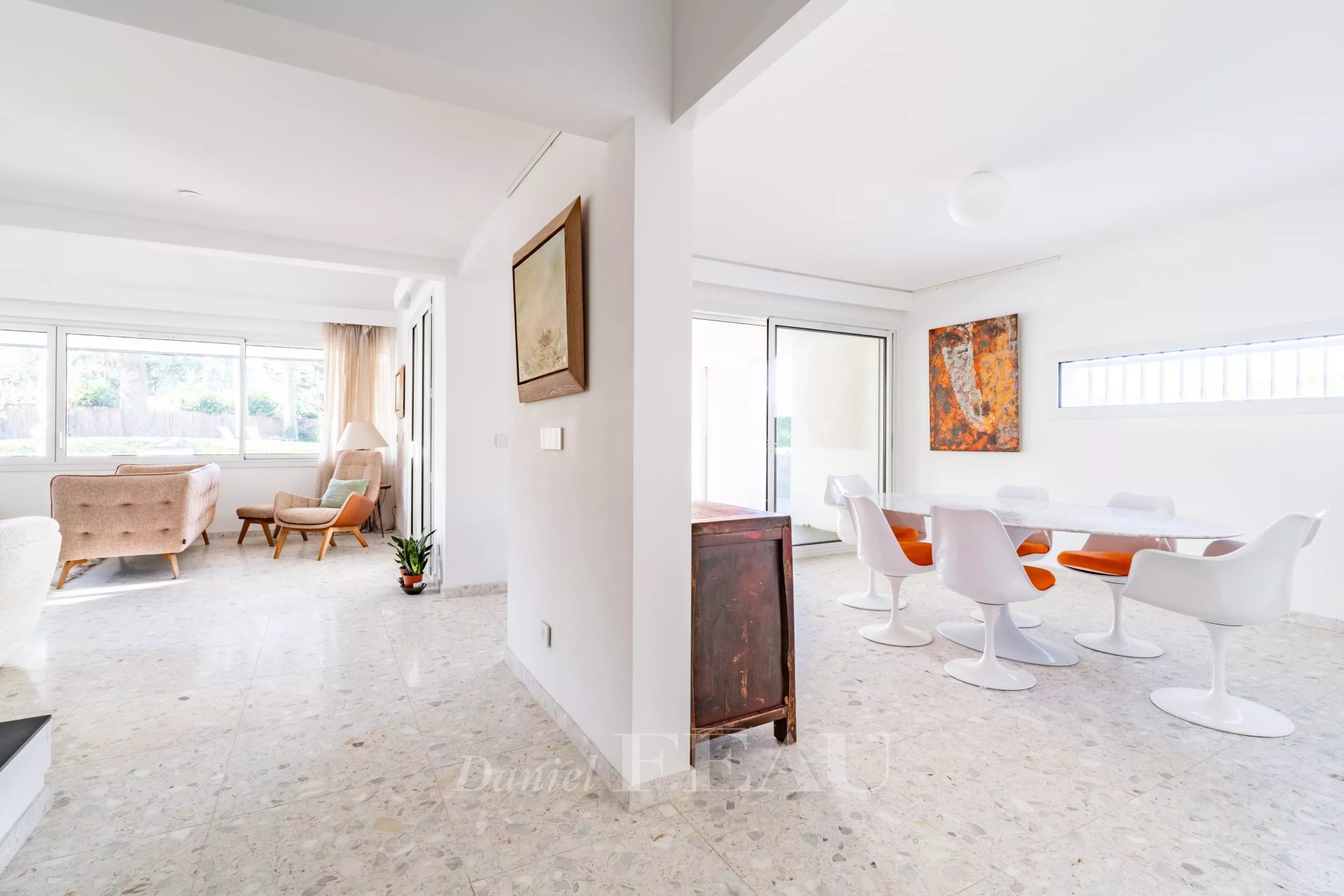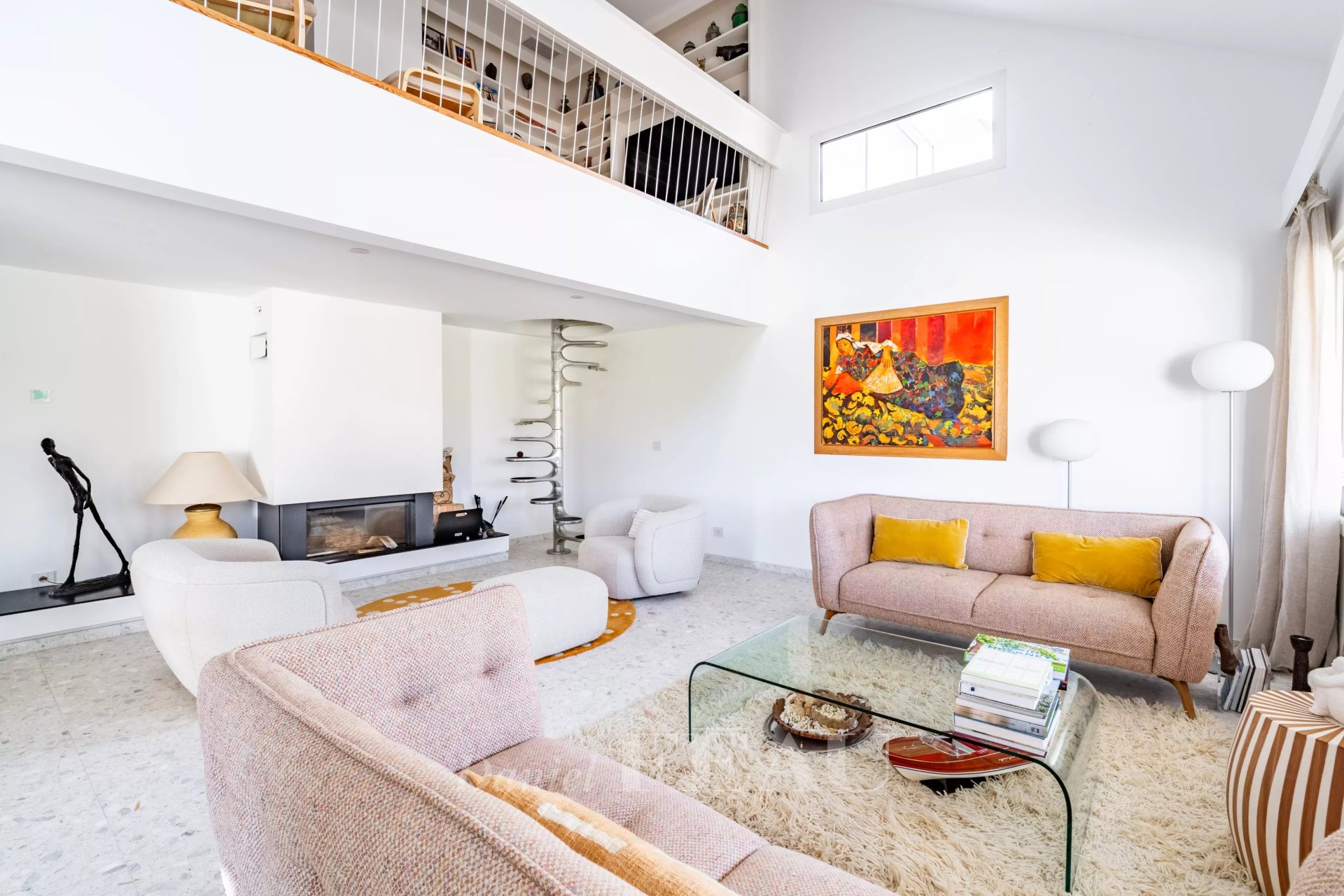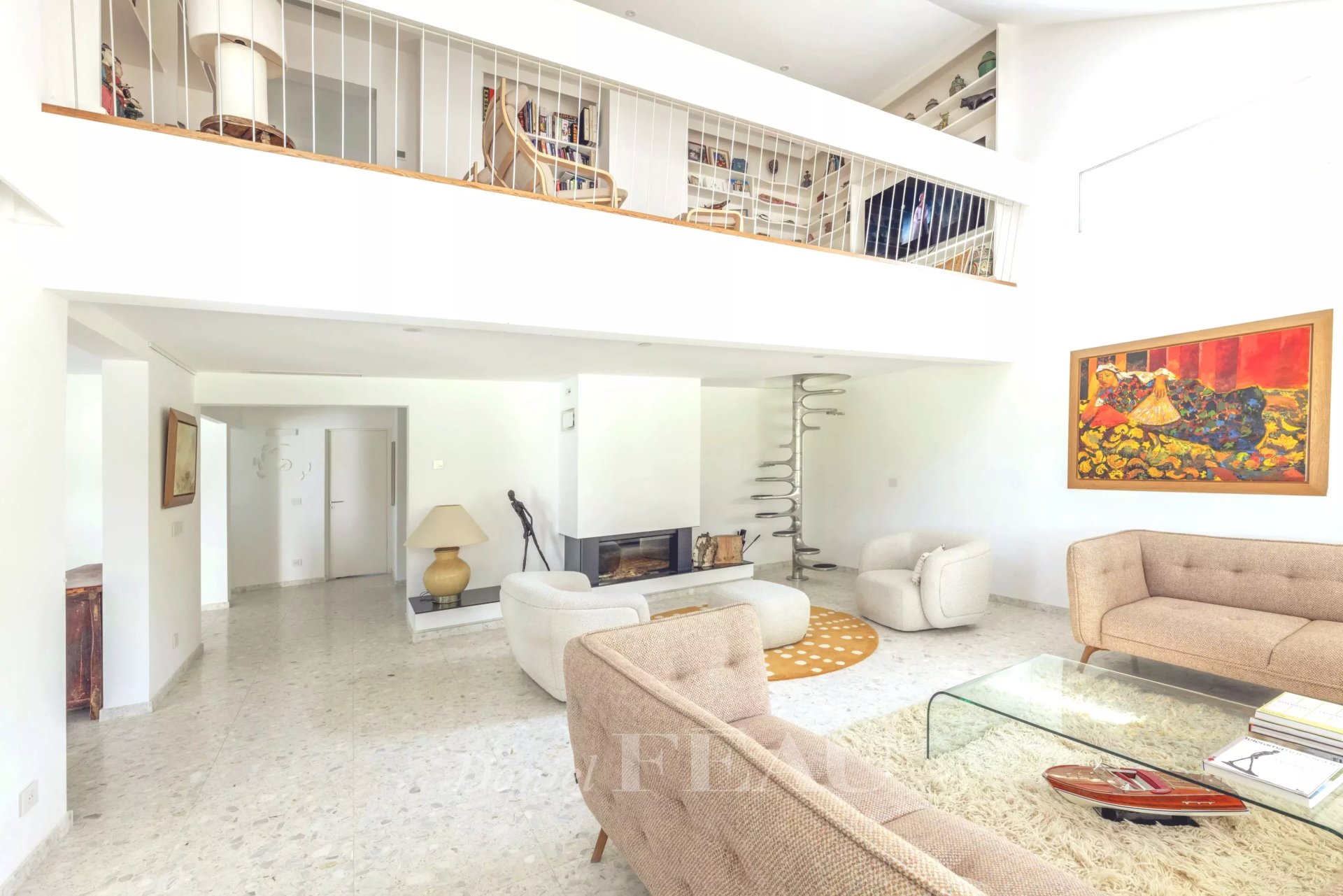 Renovated throughout in 2021, it includes a living/reception room featuring a soaring ceiling and a fireplace opening onto terraces, a mezzanine with a TV lounge/library accessed by means of a staircase designed by Roger Tallon, a luxuriously fitted and equipped separate kitchen, a dining room with a covered terrace, a utility room, a storage room, five bedrooms each with terraces, and four bath or shower rooms.