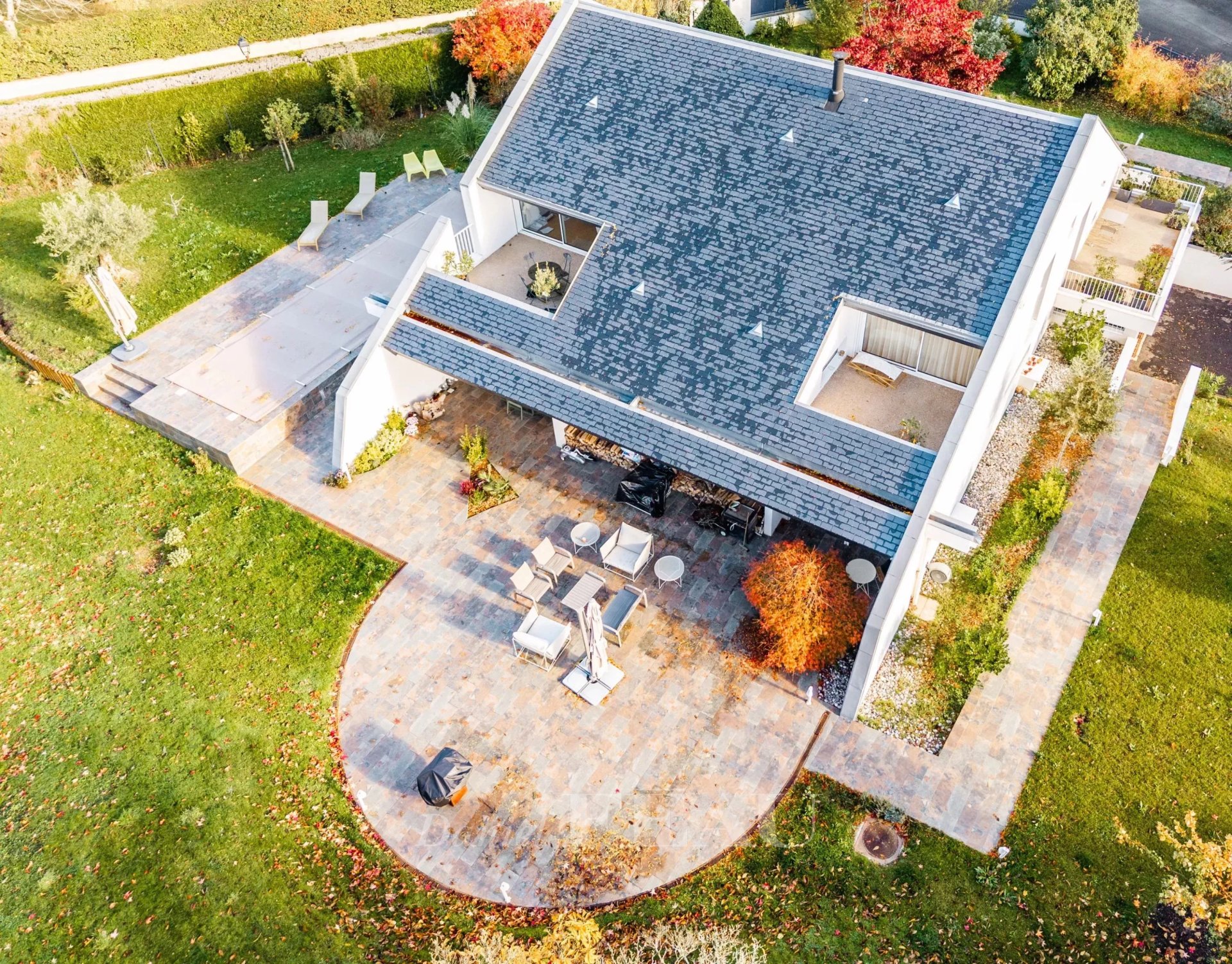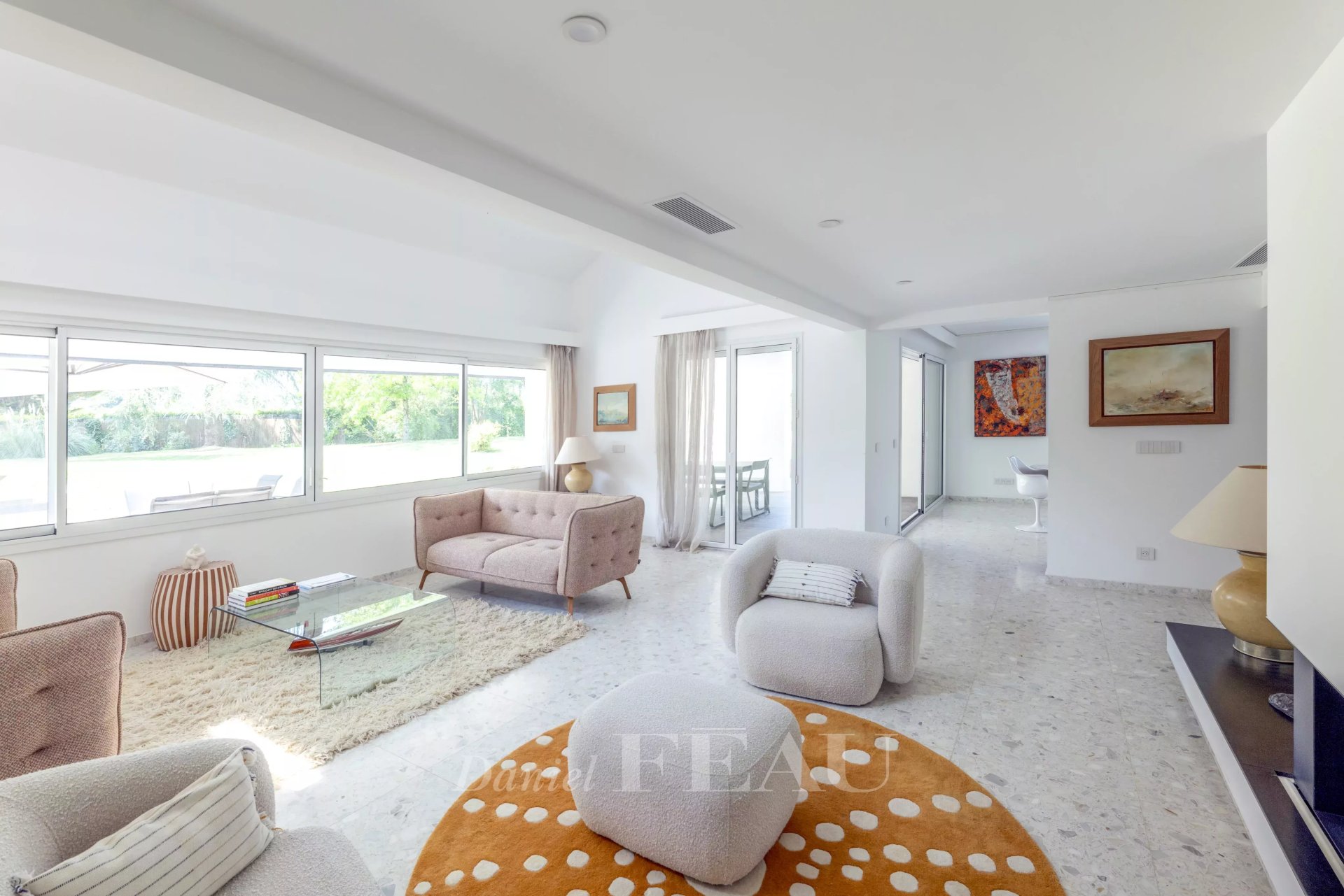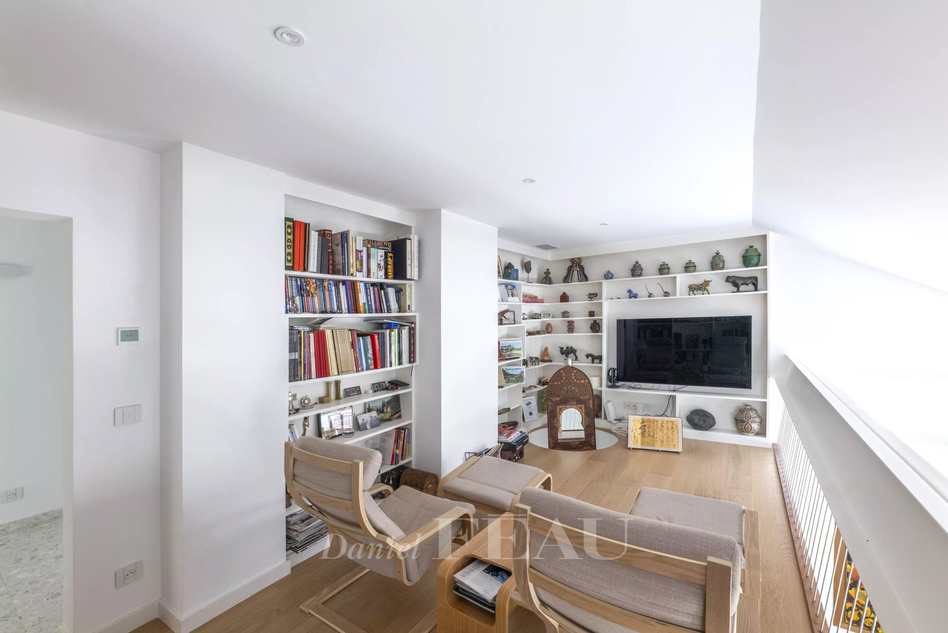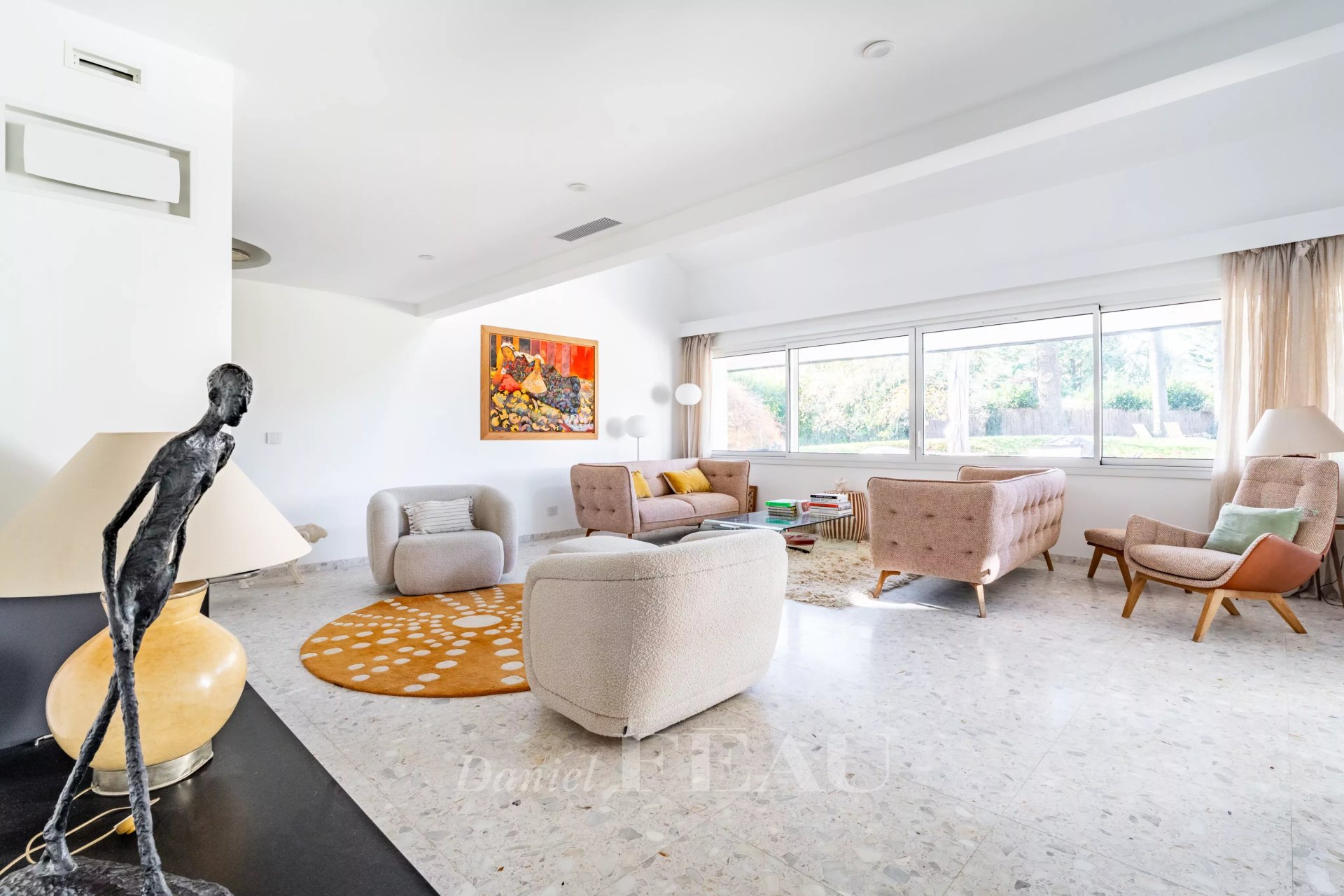 Renovated throughout in 2021, it includes a living/reception room featuring a soaring ceiling and a fireplace opening onto terraces, a mezzanine with a TV lounge/library accessed by means of a staircase designed by Roger Tallon, a luxuriously fitted and equipped separate kitchen, a dining room with a covered terrace, a utility room, a storage room, five bedrooms each with terraces, and four bath or shower rooms.