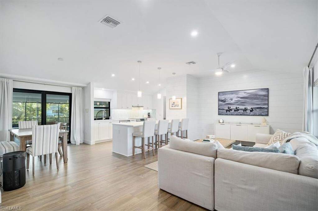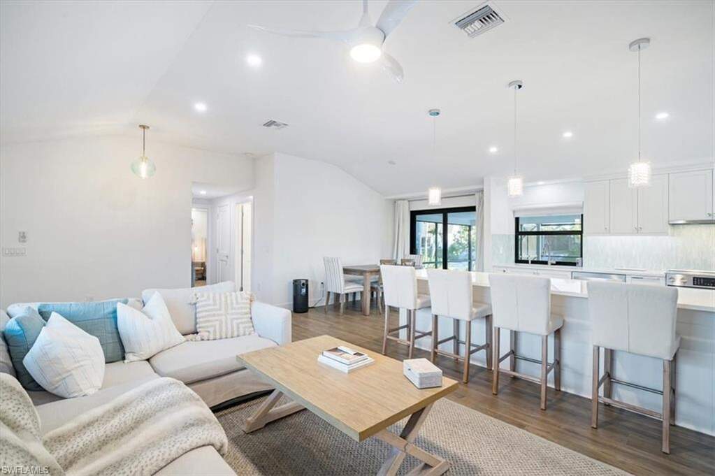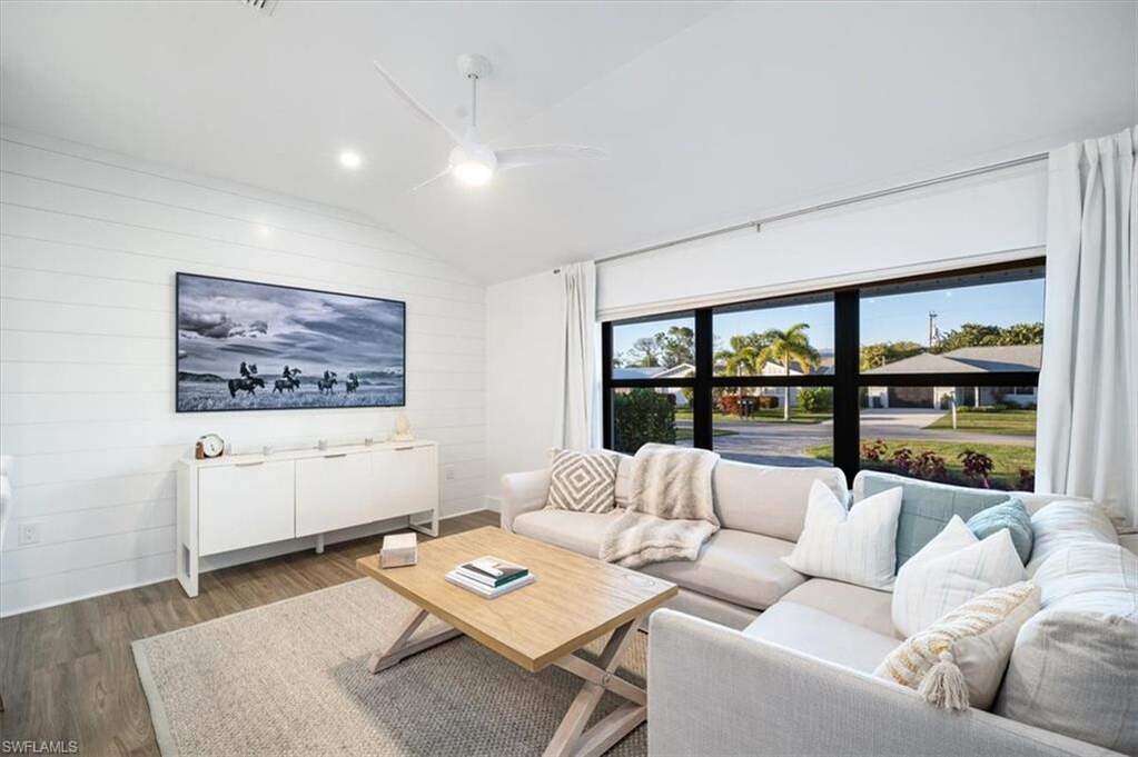 AMAZING RENOVATION & GORGEOUS CURB APPEAL! 1.2 MILES TO THE BEACH!! Noteworthy updates include a new roof in 2023, impact windows and sliders, a tankless water heater installed in 2021, and a 2020 AC unit. 2 fully remodeled baths - main bath is a STEAM SHOWER. The interior showcases a spacious great room with vaulted ceilings and exquisite detailing, complemented by "wood look" tiled flooring. The Shaker-style kitchen, the heart of the home, features an island with quartz countertops and an elegant tiled backsplash. A private guest wing offers its own entrance, a morning kitchen, and a serene patio off the bedroom, ideal for a peaceful retreat. Two additional bedrooms boast vaulted ceilings, ceiling fans, and generous closet space, providing a bright and airy feel. Outdoors, enjoy the Naples lifestyle with a newly renovated pool and spa adorned with mosaic tiles, stone coping, and a paver deck. The screened lanai overlooks the beautifully landscaped yard, creating a serene outdoor haven. A custom-built fire pit invites relaxation while you savor stunning sunsets over the lake from the western-exposure backyard. Additional outdoor features include a shed, LED landscape lighting lushly landscaped. Neighborhood has a community center, boat ramp and perfectly located steps to open waters, boating, kayaking, paddle boarding activities in this northern Collier County community.