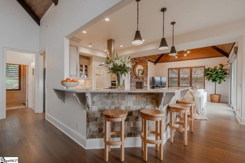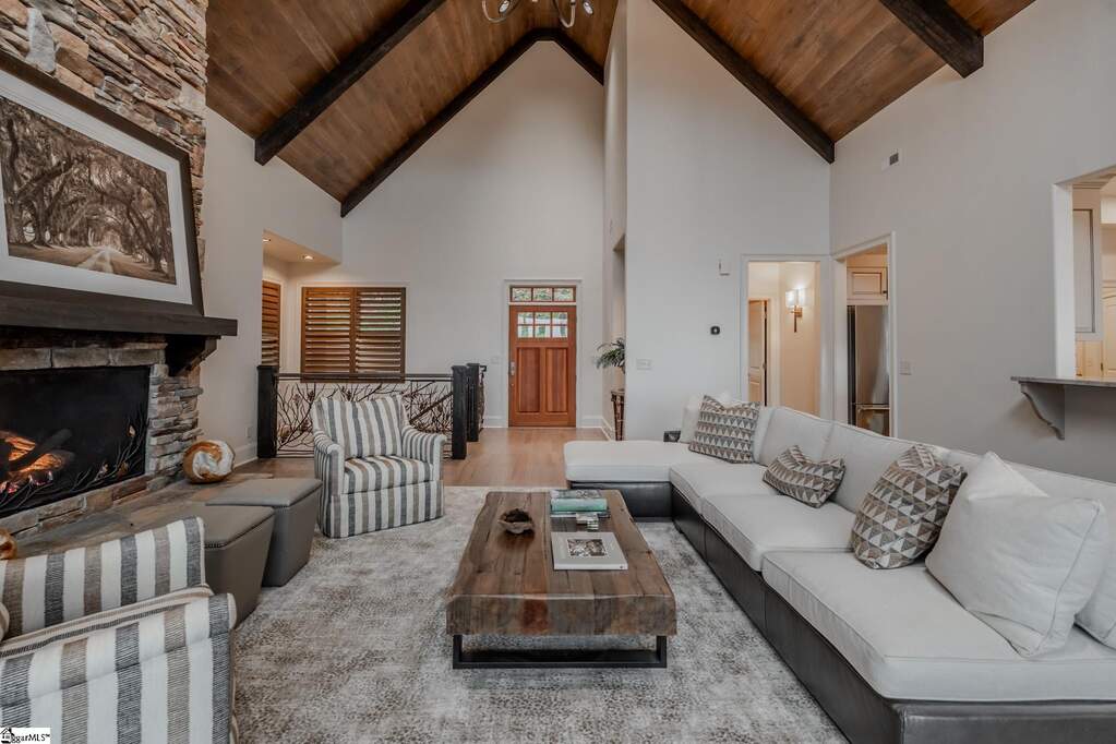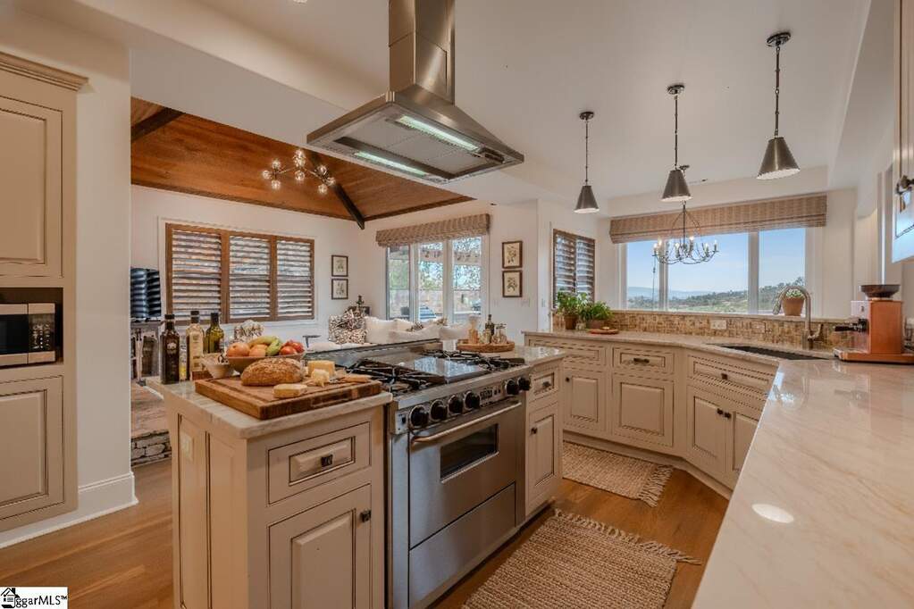Discover the pinnacle of luxury mountain living at 94 Eagle Rock, a stunning home perched atop Glassy Mountain in the prestigious Cliffs at Glassy community. This custom-built residence offers 4,600 square feet of meticulously designed living space, featuring 4 bedroom Ritz Carlton level suites, 4.5 bathrooms, and breathtaking 75-mile panoramic views of the Blue Ridge Mountains visible from nearly every room. Brand new hot tub, refinished decks and grilling area. The heart of the home is the expansive great room, showcasing soaring vaulted wooden ceilings, a magnificent stacked stone gas fireplace with chic floating shelves and LED lighting, and stunning oak hardwood floors. The gourmet kitchen is a chef's dream, featuring custom alder wood cabinetry, quartzite countertops, a large island, high-end stainless-steel appliances including an industrial four-burner gas stove with griddle, a walk-in pantry, and a vented hood. The adjacent keeping room provides a cozy retreat with a fireplace and access to the grilling deck. The main-level master suite is a sanctuary of luxury, offering a spacious walk-in closet, trey ceilings, and an opulent totally renovated ensuite bathroom with dual vanities, quartzite countertops, porcelain sinks, a soaking tub, and a separate tiled walk-in shower. All bathrooms have been updated with designer finishes by the current owner. The lower level provides exceptional accommodations for family and guests, with three generously sized ensuite bedrooms. One is a second primary suite, while another features a luxurious steam shower. A newly added third guest suite includes a private bath, substantial closet, beverage center, and direct access to a private deck. This level also features a recreation room with a wet bar, perfect for entertaining. Outdoor living is equally impressive, with an expansive, partially covered deck stretching the length of the house. An outdoor kitchen with a built-in grill and Big Green Egg smoker makes al fresco dining a delight. The lower-level deck leads to a private hot tub, a serene meditation garden, and a grassy, fenced-in backyard. The property is beautifully landscaped with meticulously maintained gardens throughout. A bonus room above the garage provides an ideal space for a home office or hobby room. Additional features include custom metal and copper railings on the stairway, a tankless water heater with a recirculating pump, and ample walk-in closets and storage throughout. Living at The Cliffs at Glassy offers access to world-class amenities, including seven award-winning golf courses, seven clubhouses, state-of-the-art wellness centers, restaurants, lakes, trails, tennis, pickleball, swimming, and an equestrian center. The community is conveniently located just 30 minutes from Greenville, SC, and 1 hour from Asheville, NC. This is a rare opportunity to own a truly exceptional mountain home in one of the Southeast's most desirable communities.