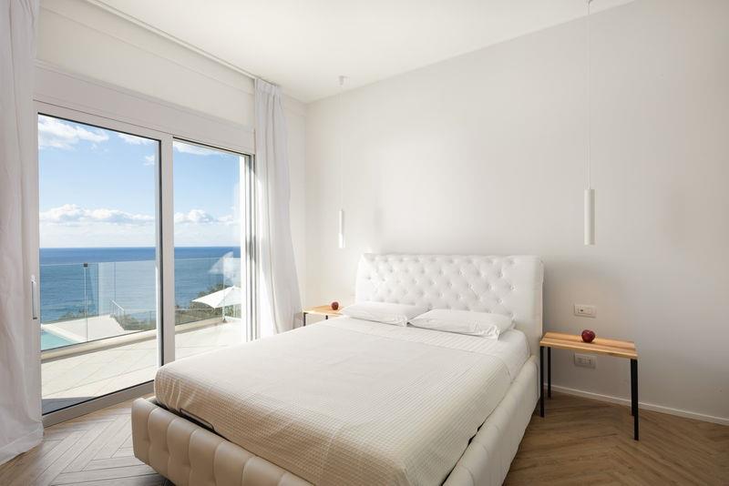 The villa itself is offers approximately 200 sqm of living space spread over two levels. On the ground floor there is a large modern living room and dining room. Light, bright and airy, there are large sliding patio doors that ensure the stunning views are enjoyed from the interior as well as giving convenient access out the pool area. The separate kitchen is sleek and modern and fully equipped by VENETA CUCINE. This level also has a double bedroom with ensuite bathroom and a further guest bathroom.