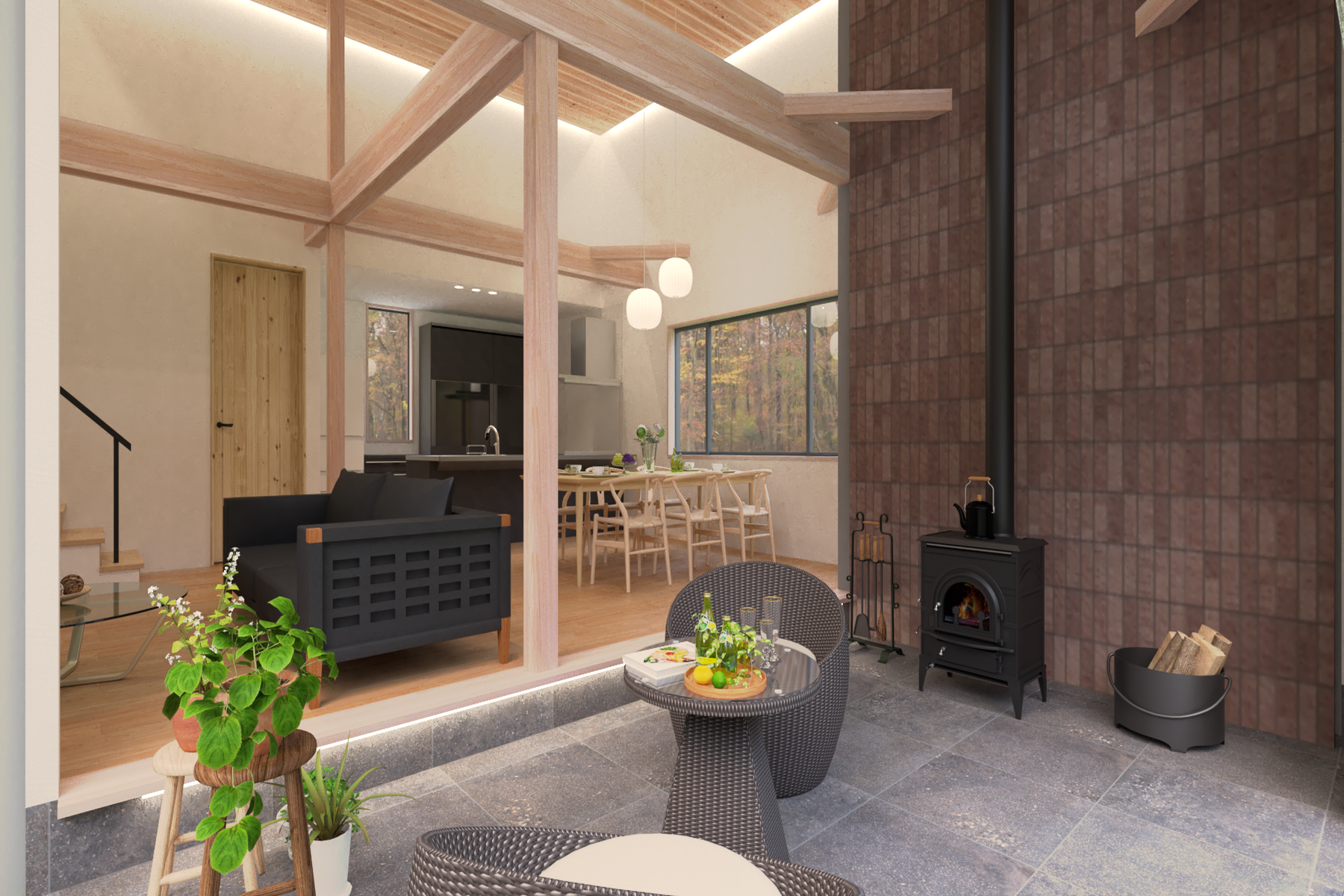 ・The double-height space dynamically displays beams and pillars, bringing the gaps and spaces woven by trees in nature indoors