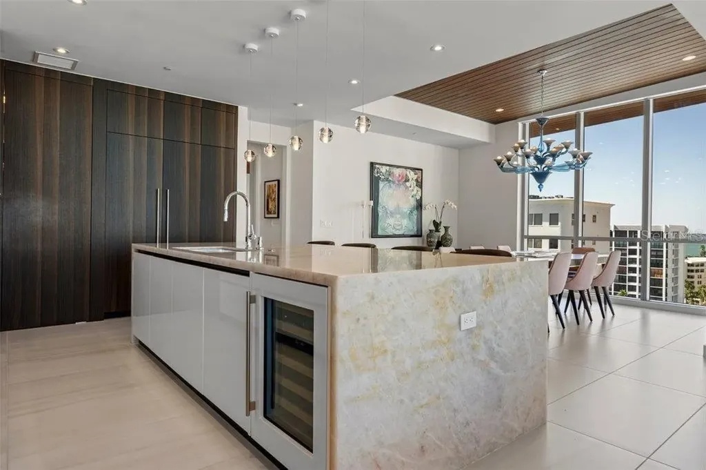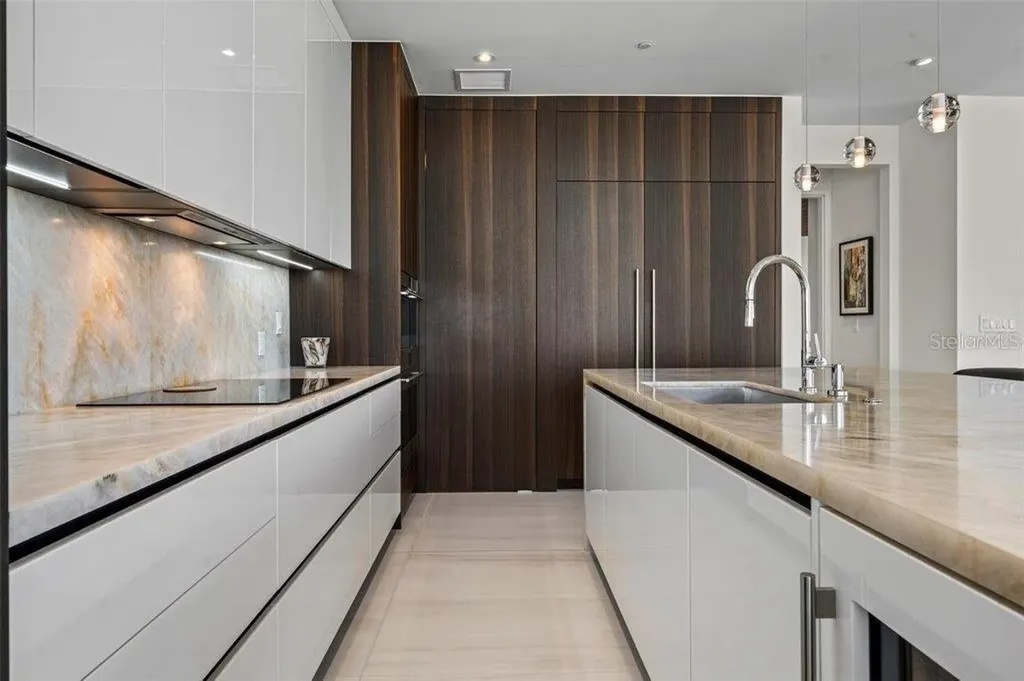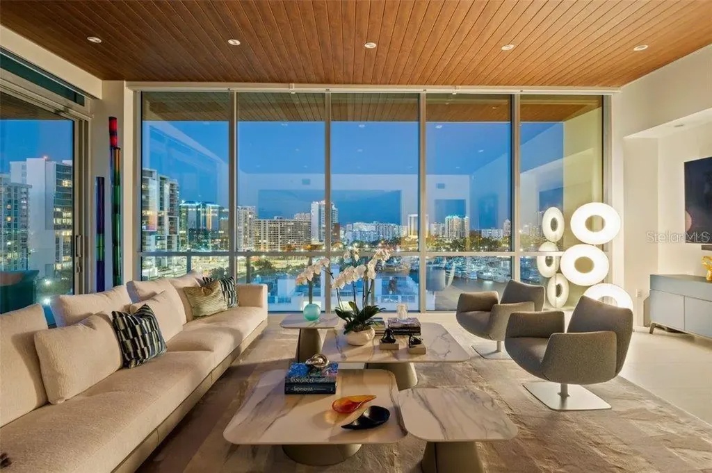 Offered at $5,995,000 over $1,250,000 below what the sellers have into this unmatched value penthouse at The Evolution is downtown Sarasota's most exclusive high-rise opportunity - and is just steps away from dining and downtown living. This one-of-a-kind, top-floor penthouse spans three thousand five hundred twenty-seven square feet of interior living plus five hundred sixty-two square feet of wraparound terrace space across three generous balconies for endless possibilities of indoor/outdoor living. Offering four bedrooms plus a den and four and a half bathrooms, this residence provides the comfort of a single-family home with the elegance of high-rise living. Sweeping north, east, and south water views showcase Sarasota Bay, the Gulf, marina, and the city skyline. Floor-to-ceiling windows fill the home with natural light and allow year-round coastal breezes, and designer Lutron electronic shades grace each window, allowing privacy with ease. Interior features include onyx quartz countertops, porcelain tile slabs, oversized porcelain flooring, designer light fixtures, and custom European cabinetry in the kitchen, bathrooms, and closets. The primary suite features silk wallpaper and a spa-inspired bath with dual sinks, a freestanding soaking tub ,and onyx quartz and porcelain slab finishes. The chef's kitchen includes Wolf appliances ,sub-zero refrigerator-freezer with filtered water feature ,induction cooktop ,steam oven ,built-in coffee station ,a wine refrigerator ,and a hidden walk-in pantry. Imported European fixtures complete the space. Enjoy three wraparound terraces for alfresco dining,yoga or sunset cocktails. The unit includes a deeded private two-car garage and is move-in ready with every upgrade imaginable. Community amenities at The Evolution include a pool with outdoor kitchen ,fitness center ,yoga room ,sauna ,club room,and a rooftop terrace with panoramic views,outdoor lounge,sparkling spa,and fireplace .Experience the pinnacle of waterfront luxury in downtown Sarasota's largest and most exclusive penthouse residence at The Evolution,a boutique community designed by architect Mark Sultana,dSDG.With only twenty residences,this is a rare opportunity to own one of Sarasota's most exclusive penthouses.Schedule your private tour today and experience the ultimate in penthouse living.Square footage developer plans.Buyer to verify dimensions.Golden Gate Point improvement and maintenance built into taxes.