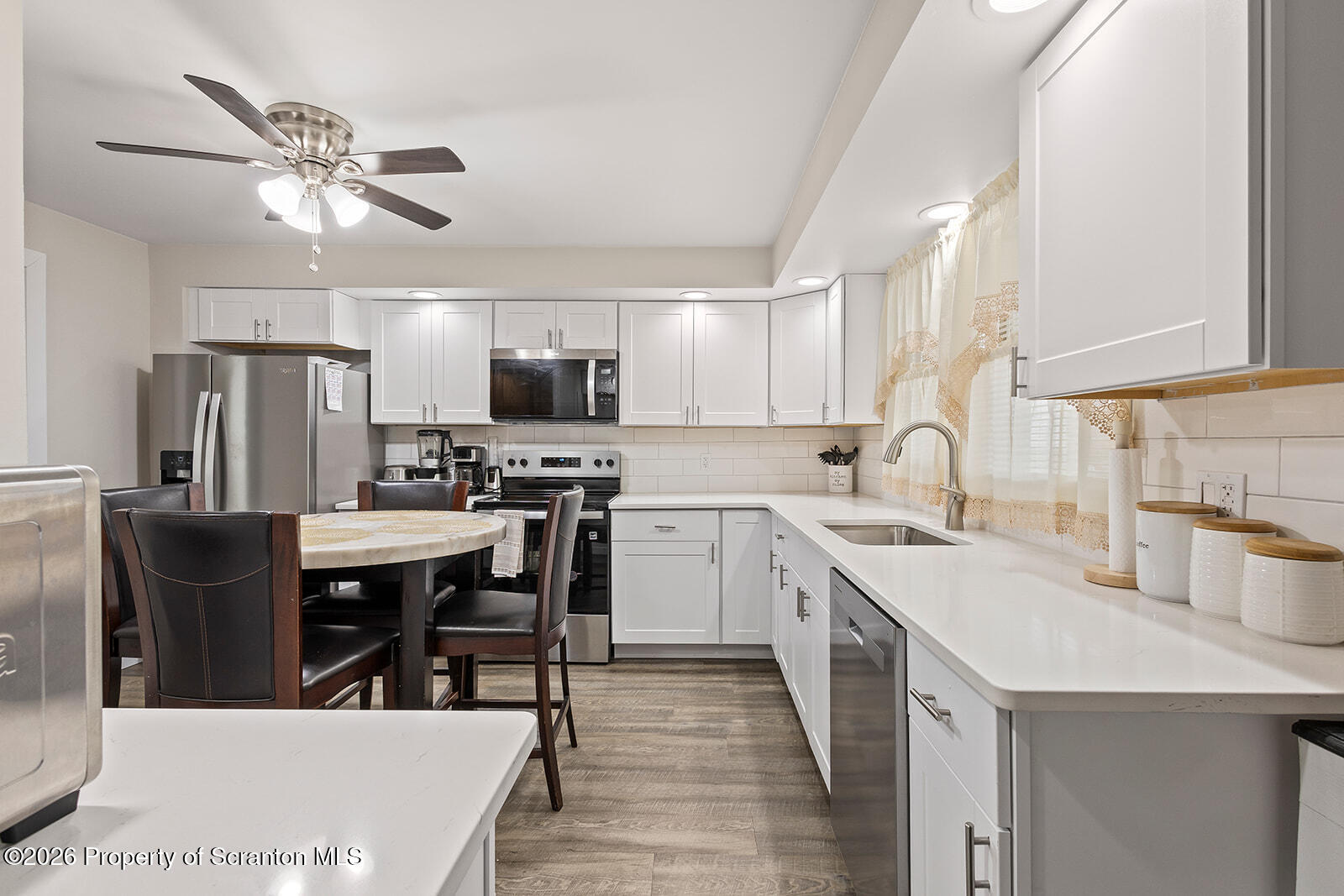 Move in ready and fully updated, this 2 bedroom, 1 bath home offers thoughtful finishes, functional living spaces, and off street parking for multiple vehicles. A covered front porch provides a defined entry and leads into a home that reflects pride of ownership throughout. Inside, the first floor features luxury vinyl plank flooring, fresh neutral paint, and custom radiator covers that blend the home's character with a clean, modern look. The living room and dining room offer well defined spaces for everyday living and entertaining. The updated kitchen includes stainless steel appliances, modern cabinetry, and a stylish tile backsplash. According to the seller, the previous owner completed the kitchen, bathroom, and flooring updates in 2025, and replaced the furnace in 2024. Sliding doors lead to the rear deck overlooking a partially fenced backyard with convenient access to the parking pad. Upstairs, you will find two nicely sized bedrooms with generous closet space, including a walk in closet with dual access and ample storage. The updated full bath features a modern vanity, beautifully designed flooring, and adjustable lighting for a relaxing atmosphere. A separate sitting area on this level offers flexibility for a home office, reading nook, or walk through third bedroom option. An unfinished partial basement provides storage space. Conveniently located close to shopping, dining, and everyday amenities, this home offers modern updates with comfort and functionality.