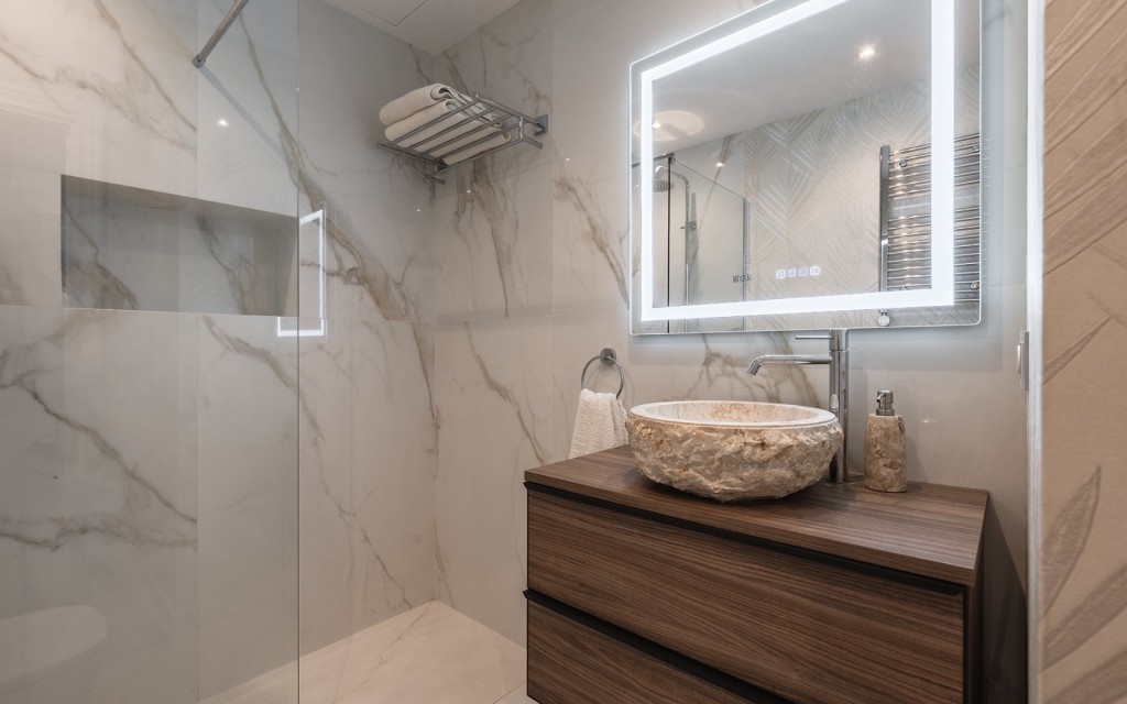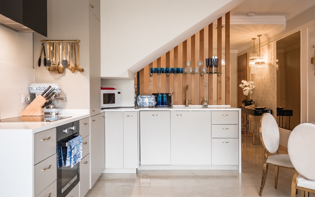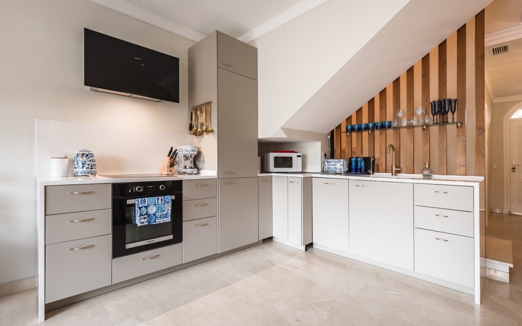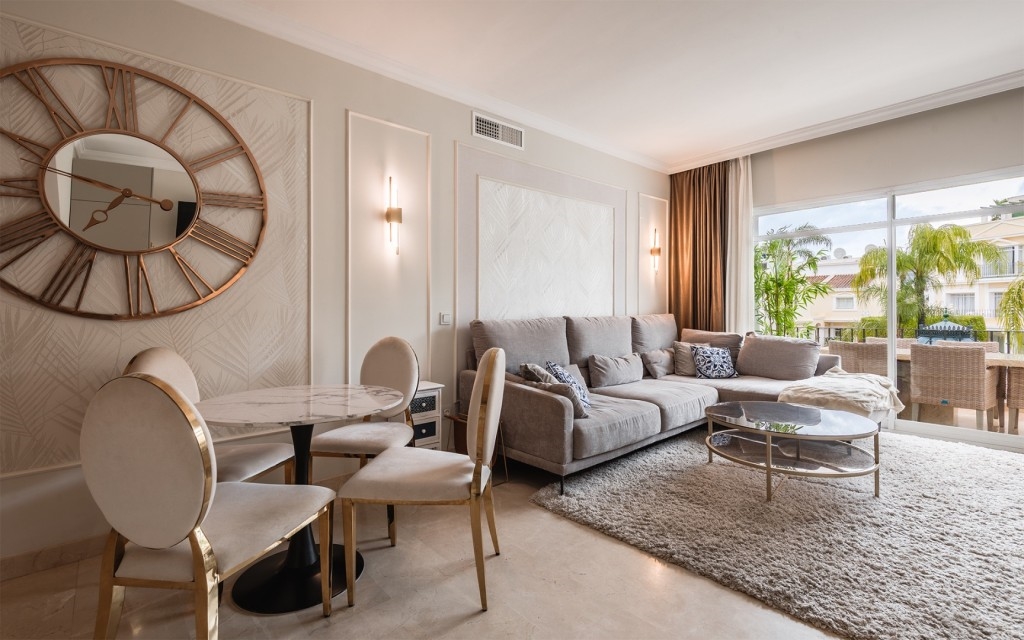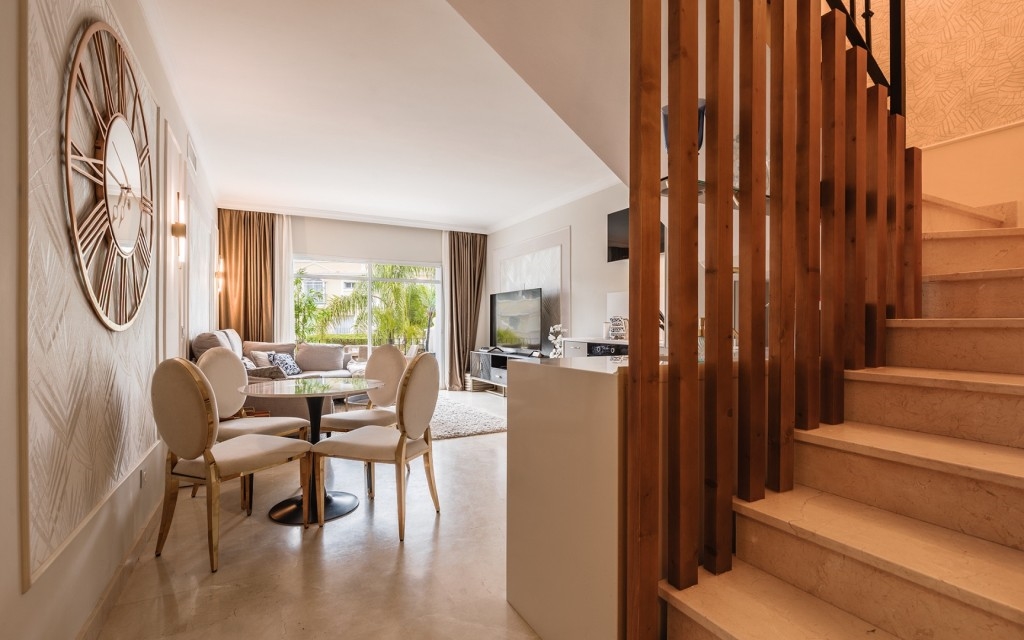 Set within a secure and beautifully maintained gated complex in one of Nueva Andalucía’s most desirable areas, this exceptional triplex penthouse offers elegant interiors, generous outdoor spaces, and a prime Golf Valley location.Tastefully renovated, the property blends contemporary comfort with classic style. A welcoming entrance hall with marble floors leads to a bright living area that opens onto a private terrace overlooking manicured communal gardens, creating a seamless indoor–outdoor flow ideal for both everyday living and entertaining.The open-plan kitchen and dining area features modern appliances, sleek cabinetry, and refined finishes. The home offers three beautifully appointed bedrooms, one of them en-suite. The master suite stands out for its elegant proportions and luxurious marble bathroom.The expansive rooftop terrace has been transformed into a private open-air lounge, complete with comfortable seating, a fully equipped bar, and panoramic views of the surrounding area and mountains — perfect for sunset gatherings and relaxed afternoons in the Marbella sun. On this level, there is also a spacious utility and storage room with washer and dryer, vacuum space, and extensive built-in storage, adding excellent practicality.The complex enjoys lush tropical gardens and three communal swimming pools, one heated for year-round use. Community fees include water consumption. Peaceful and secure, it is ideal for both permanent living and holidays.Just minutes from Aloha Golf Club and close to Las Brisas and Los Naranjos, the property is surrounded by top golf courses, restaurants, cafés, and a popular pool club. Supermarkets and a new organic market are nearby, while Puerto Banús is only six minutes away by car.A rare opportunity to own a stylish home in a prime Nueva Andalucía location, combining refined living with exceptional outdoor space and close proximity to golf, dining, and the coast.