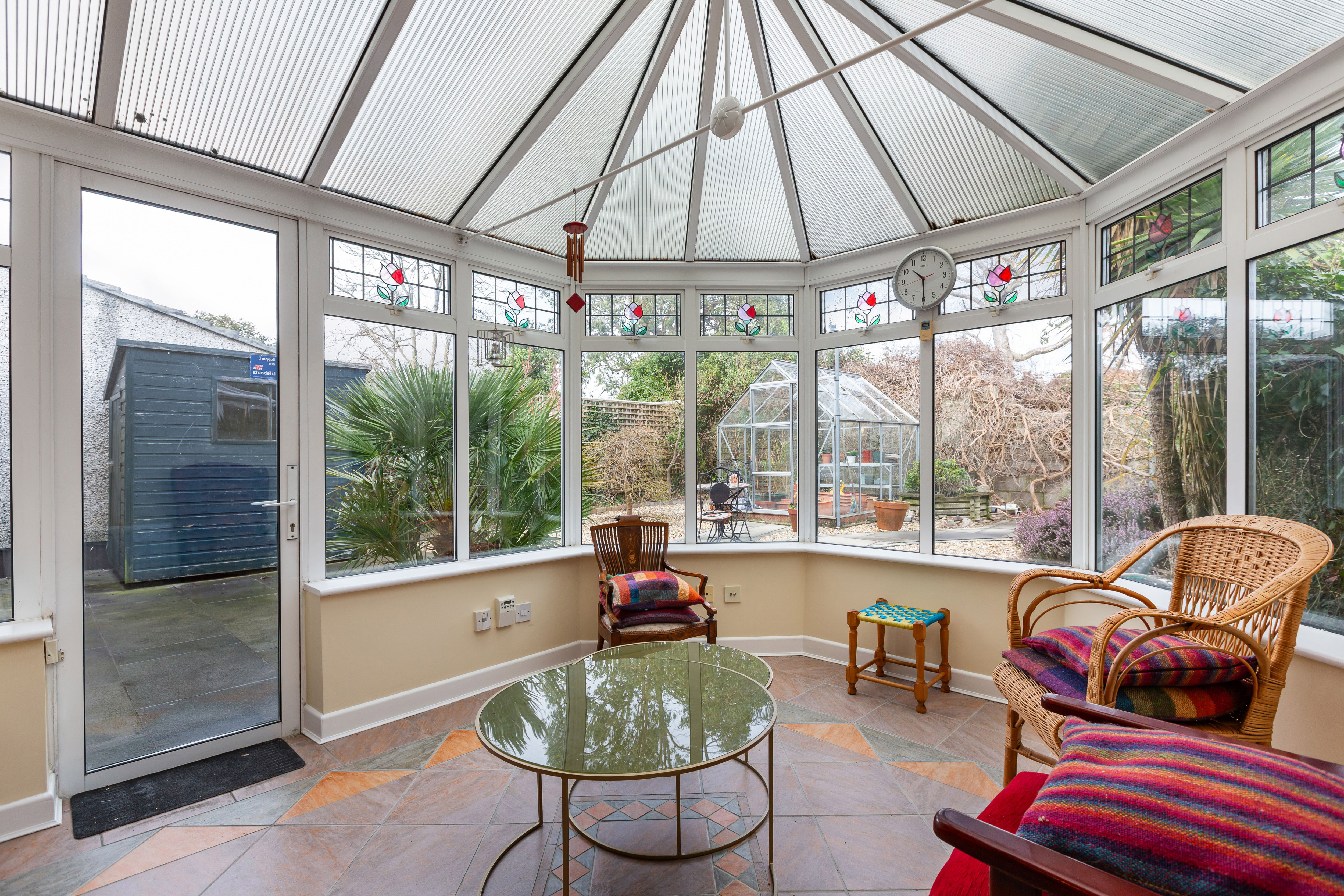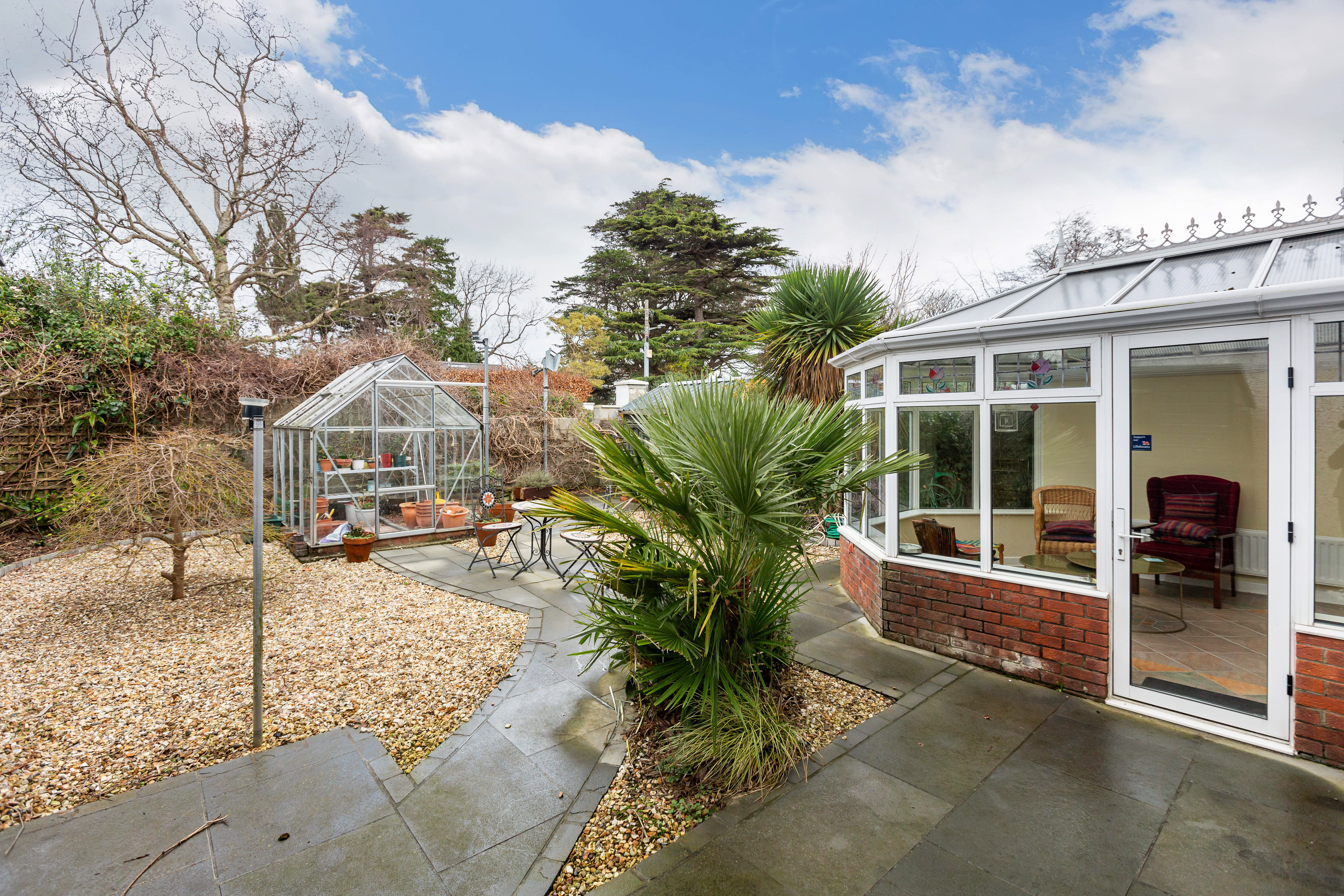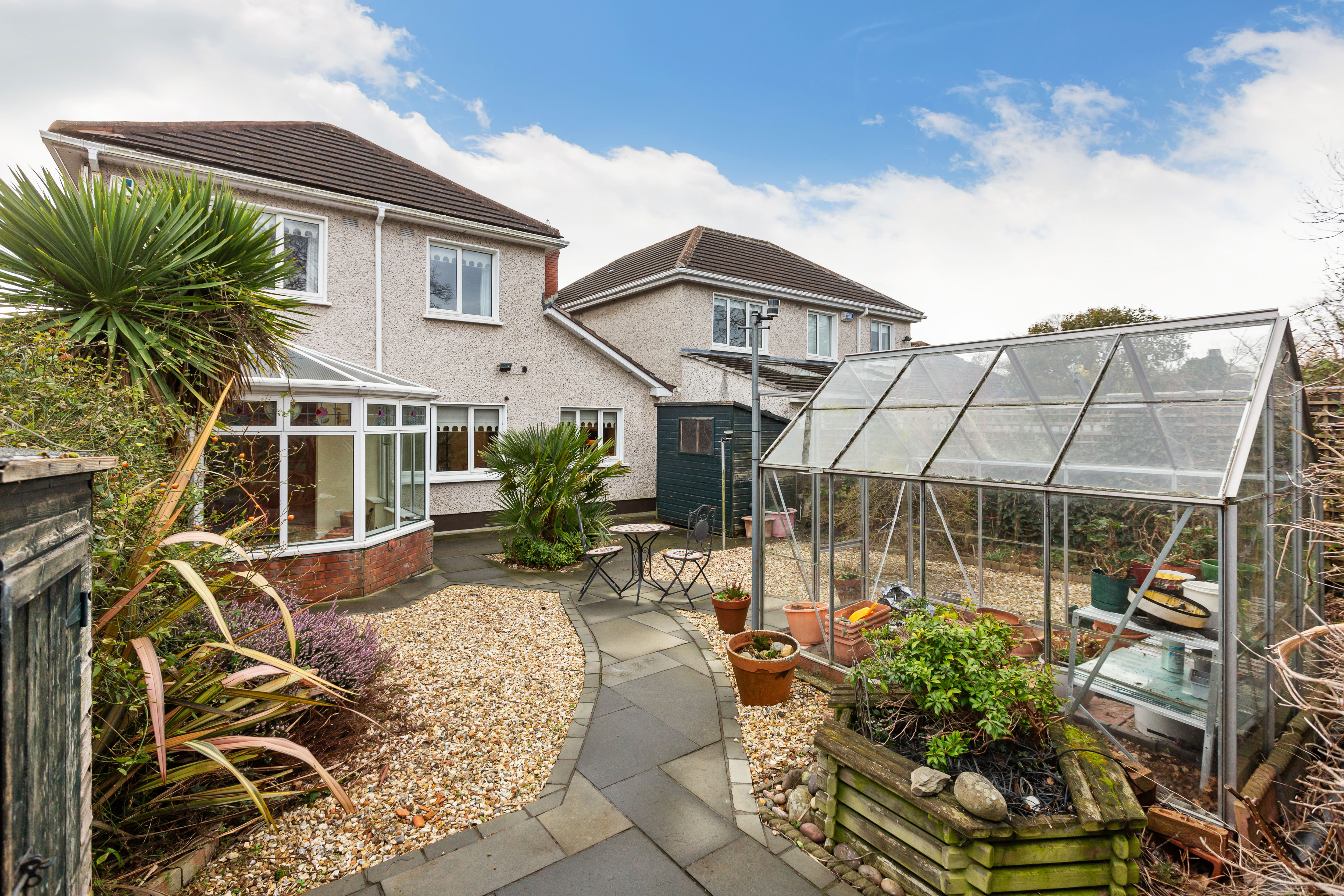 The sunny rear garden is attractively landscaped with a combination of patio paving, gravel beds and mature planting, including acers and palm. It benefits from westerly sunshine. A greenhouse and timber shed provide additional storage, while side access enhances functionality. To the front, the landscaped cobble-lock garden incorporates gravel and shrubbery, with private parking for two vehicles.