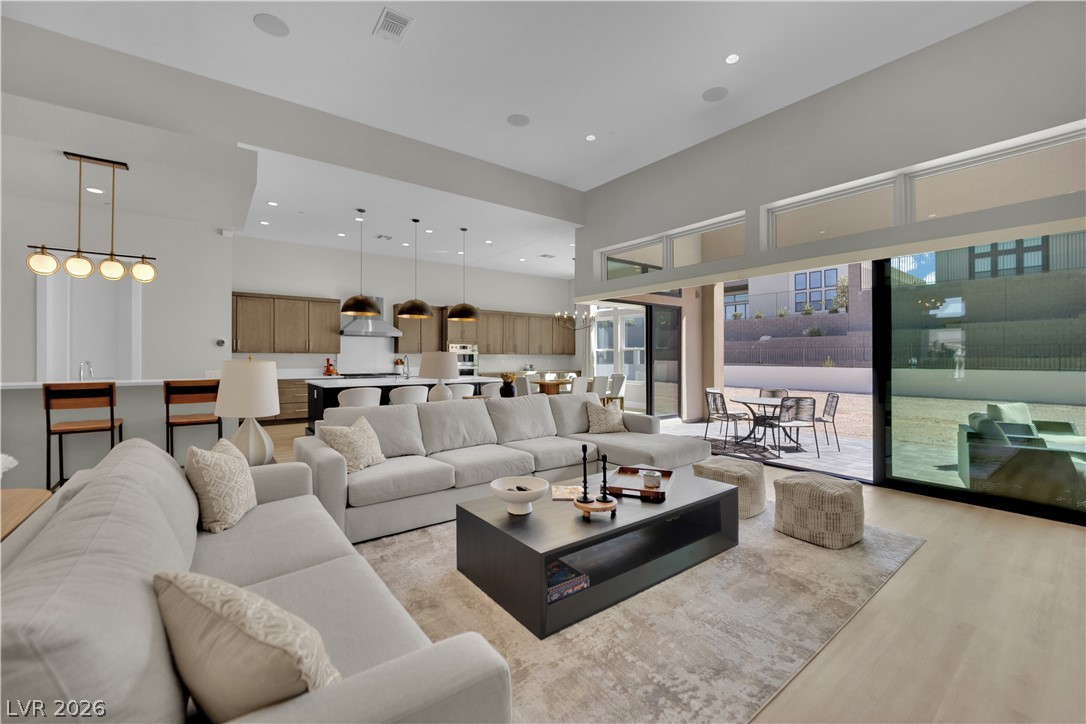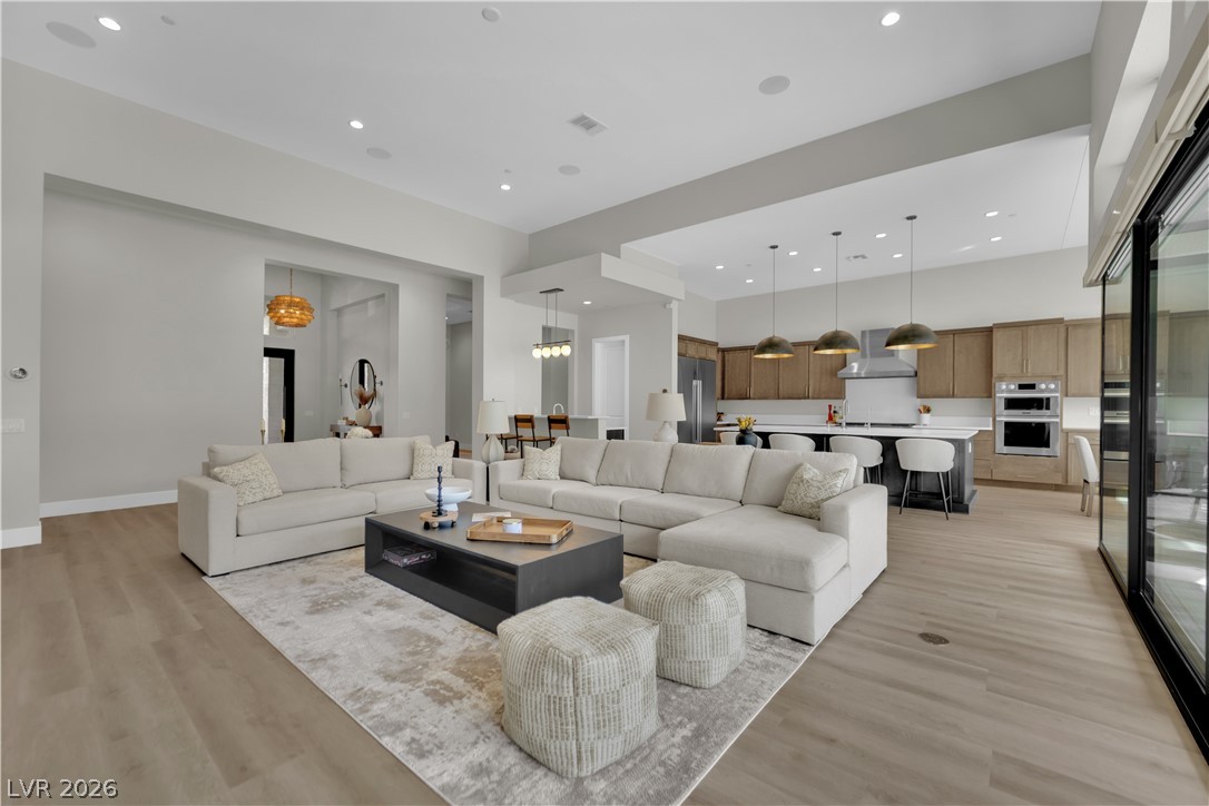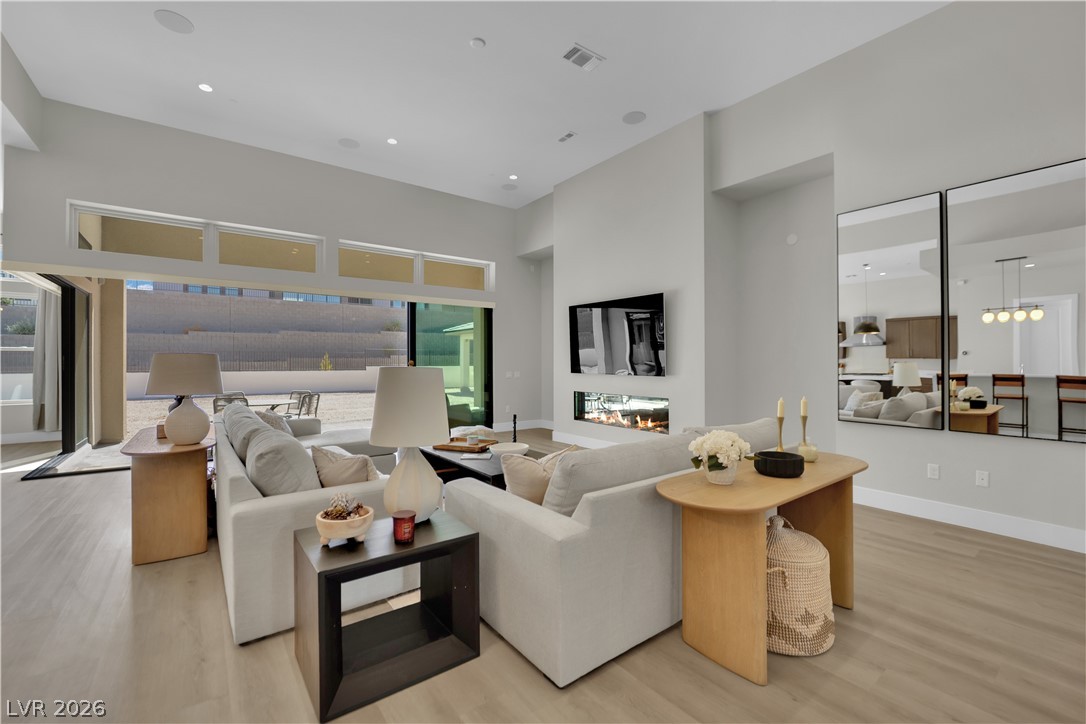 2025-built, 1-story home in The Pointe at Ascension in Summerlin offers luxury living in a highly sought-after guard-gated community. This spacious home features approx. 4,300 sq ft, 5 beds, 5 baths, 3 dens/offices, and a 4-car tandem garage. The gourmet kitchen showcases an expansive island, quartz countertops, and stainless steel appliances, opening to the main living and dining areas. The great room features a modern gas fireplace and oversized corner sliders with automated roller shades for seamless indoor-outdoor living. Primary suite offers a private den/sitting area, spa-inspired bath with oversized shower, dual vanities, and a walk-in closet. Detached casita with corner sliders ideal for guests, office, or future pool house. Situated on a .35-acre lot with Strip views, the backyard features a covered patio, outdoor gas fireplace, and space for a custom retreat. Community exclusive amenities include clubhouse, fitness center, pickleball courts, pools, spa, and golf simulator.