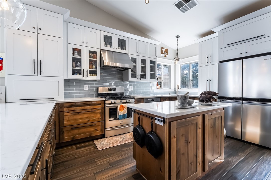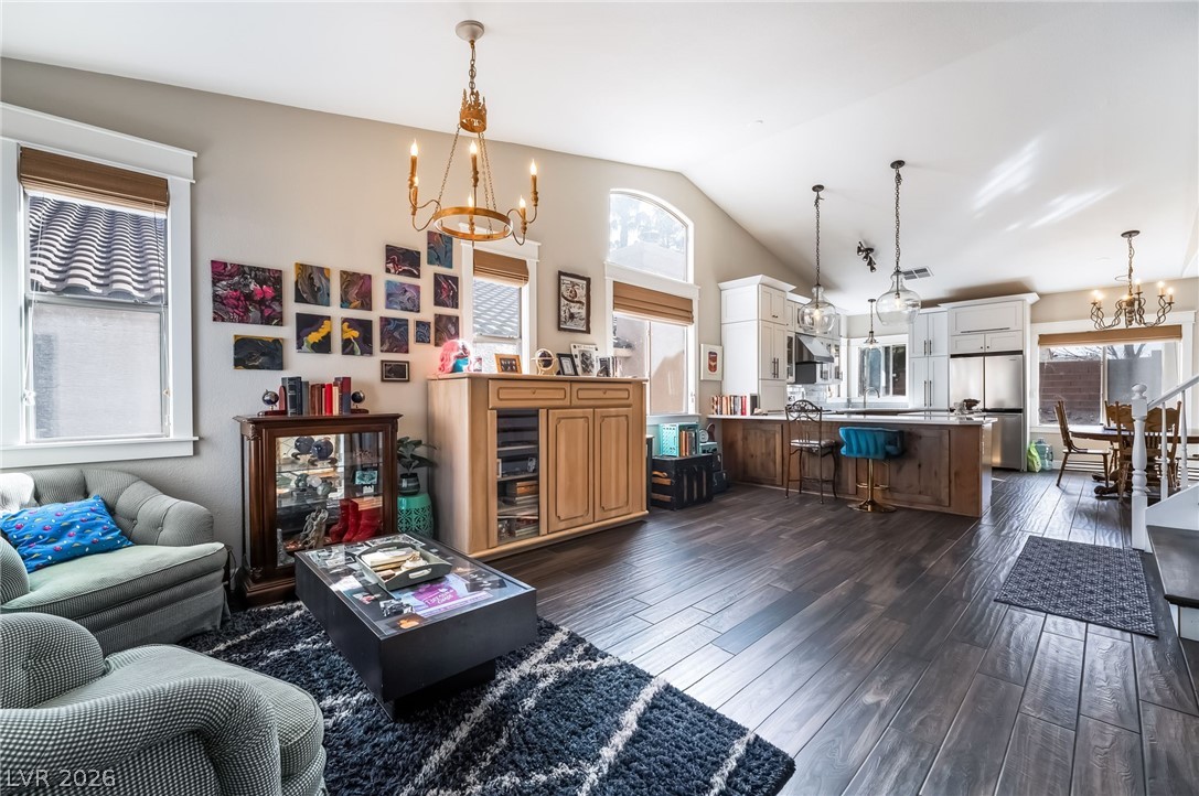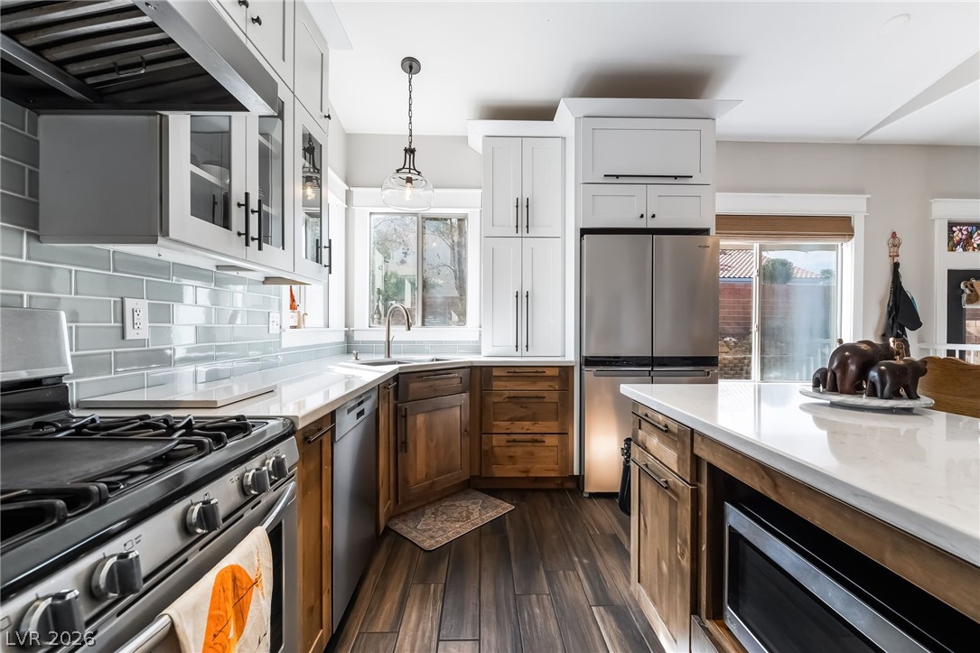 Gated community! STUNNING! Step into this amazing home with bright and open floorplan. LVP flooring throughout. Custom window & door casing throughout home along w/upgraded light fixtures. Front living & dining room. Completely remodeled, Chef's DREAM kitchen is a true SHOWSTOPPER with an open-concept design, custom cabinetry with soft-close doors and drawers, upgraded hardware, and abundant cabinet space - perfect for entertaining. Separate sunken family room with fireplace. The spacious primary suite offers a cozy fireplace and a private balcony ideal for enjoying breathtaking sunset views. Spacious secondary bedrooms. Step outside to a large, private oversized backyard with covered patio and synthetic grass. Separate dog run enclosed with custom gate. Located just minutes from the freeway, airport, the Las Vegas Strip, shopping, and dining. Won't Last!!