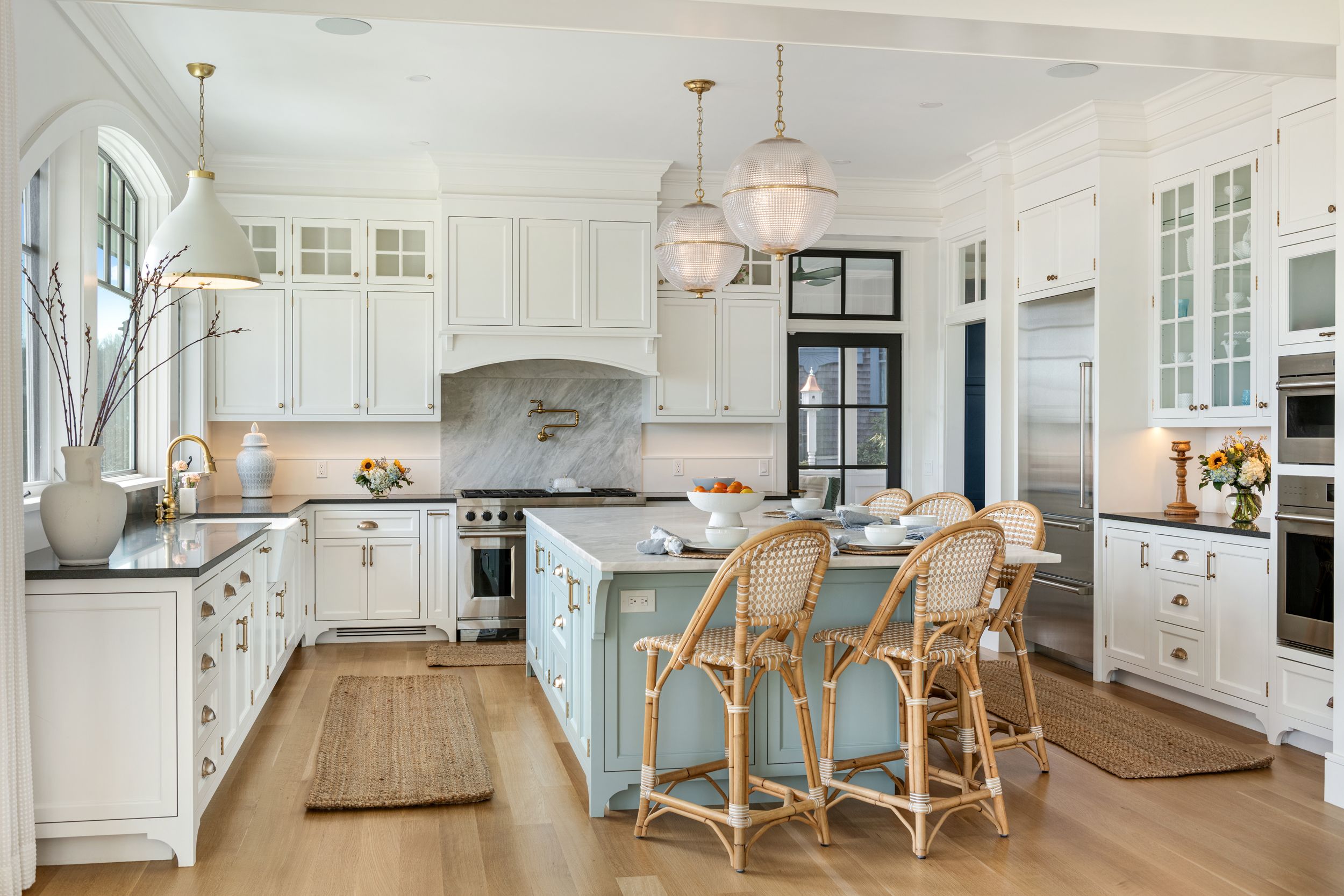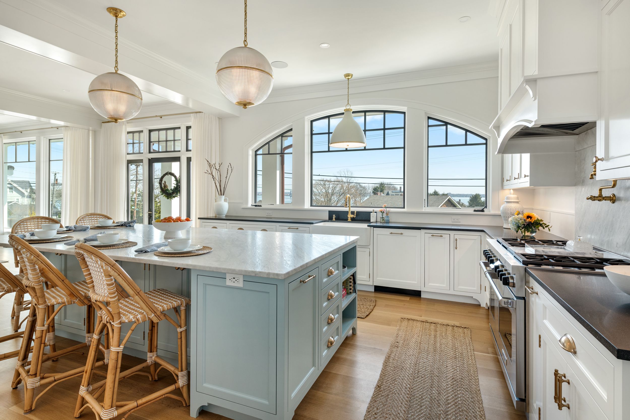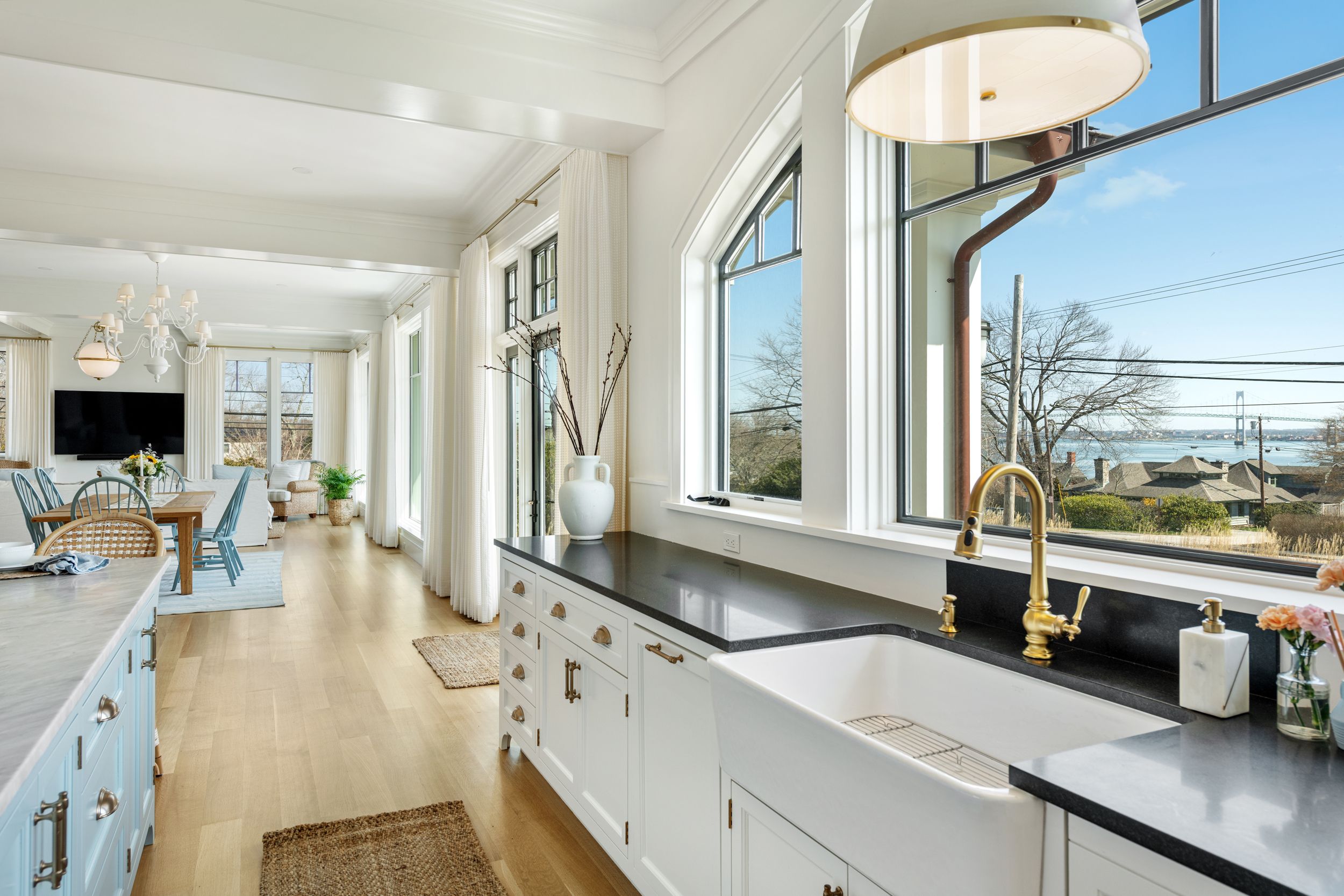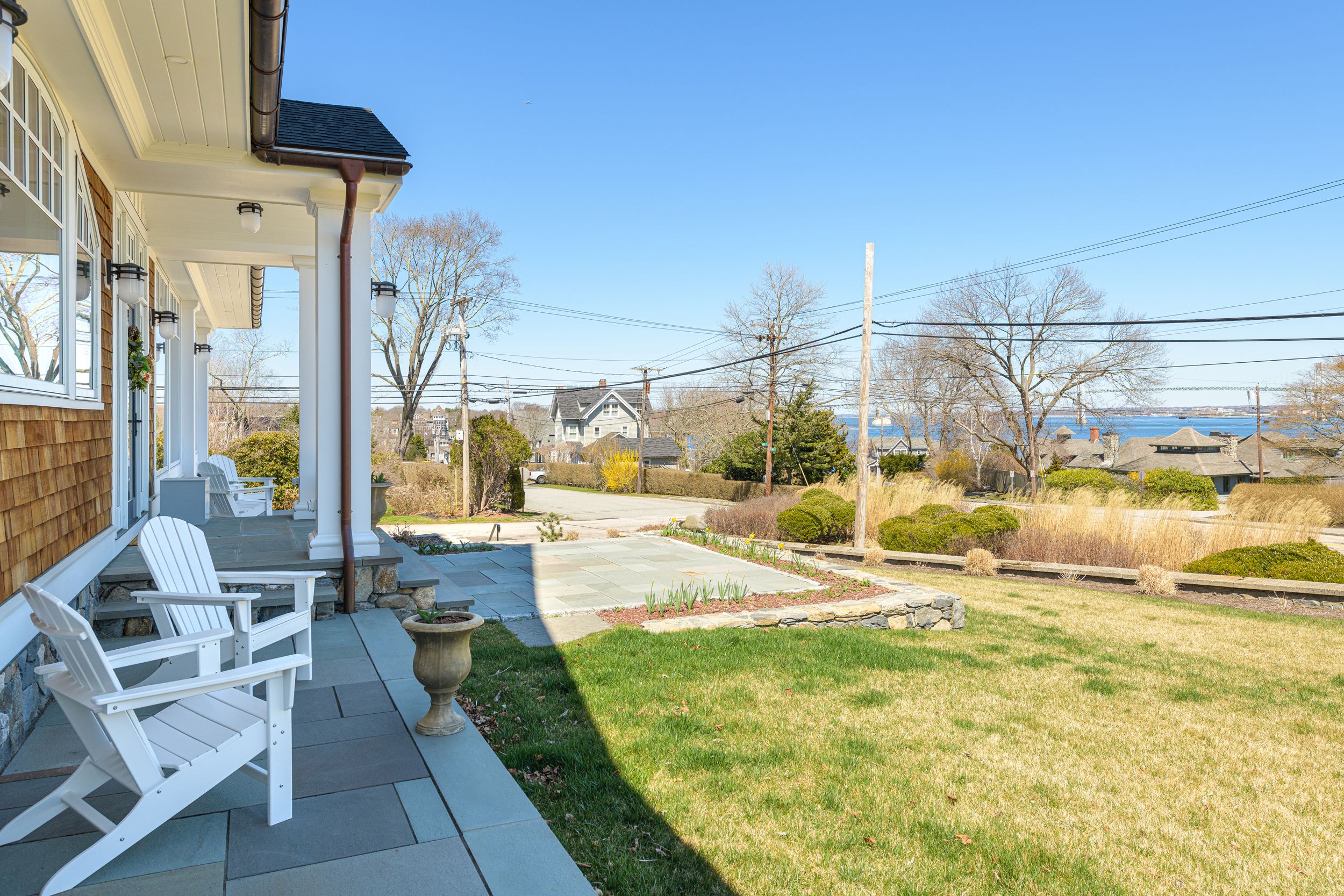 Welcome to 30 Walcott Avenue, a custom-built coastal retreat in the idyllic seaside village of Jamestown, offering sweeping views of Narragansett Bay and the iconic Newport Bridge. Completed in 2024, this exceptional residence is just a short stroll to the village's shops, restaurants, and vibrant marina, an unbeatable location that captures the very best of island living. Showcasing refined elegance and modern innovation, rich finishes and impeccable craftsmanship are paired with high-performance systems, creating a residence that is as efficient as it is beautiful. Oversized windows, soaring ceilings, and exquisite millwork frame the water and bridge views while adding architectural interest throughout. An elevator provides seamless access across all four levels, and an infrared-heated yoga room with adjacent full bath creates a private wellness sanctuary at home. Geothermal heating, solar panels, and generator ensure sustainable comfort and peace of mind. Complementing the main house, a guest cottage with 4th bedroom and full bath provides inviting accommodations for guests, and a 4 car garage offers ample storage for vehicles and coastal gear alike. The property also includes a separate abutting lot, enabling future expansion, a potential compound, or enhanced privacy. Whether envisioned as a year-round residence or a luxurious coastal escape, this property delivers timeless design, forward-thinking sustainability and an extraordinary setting in the heart of Jamestown.