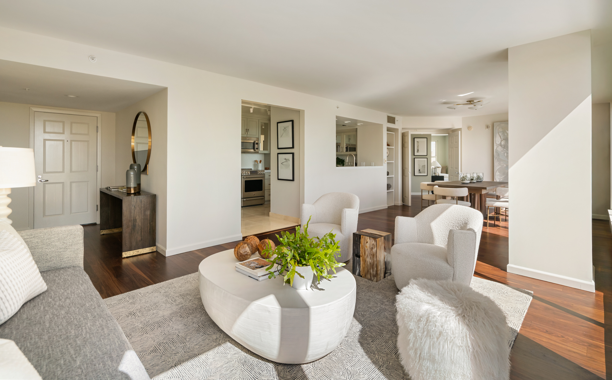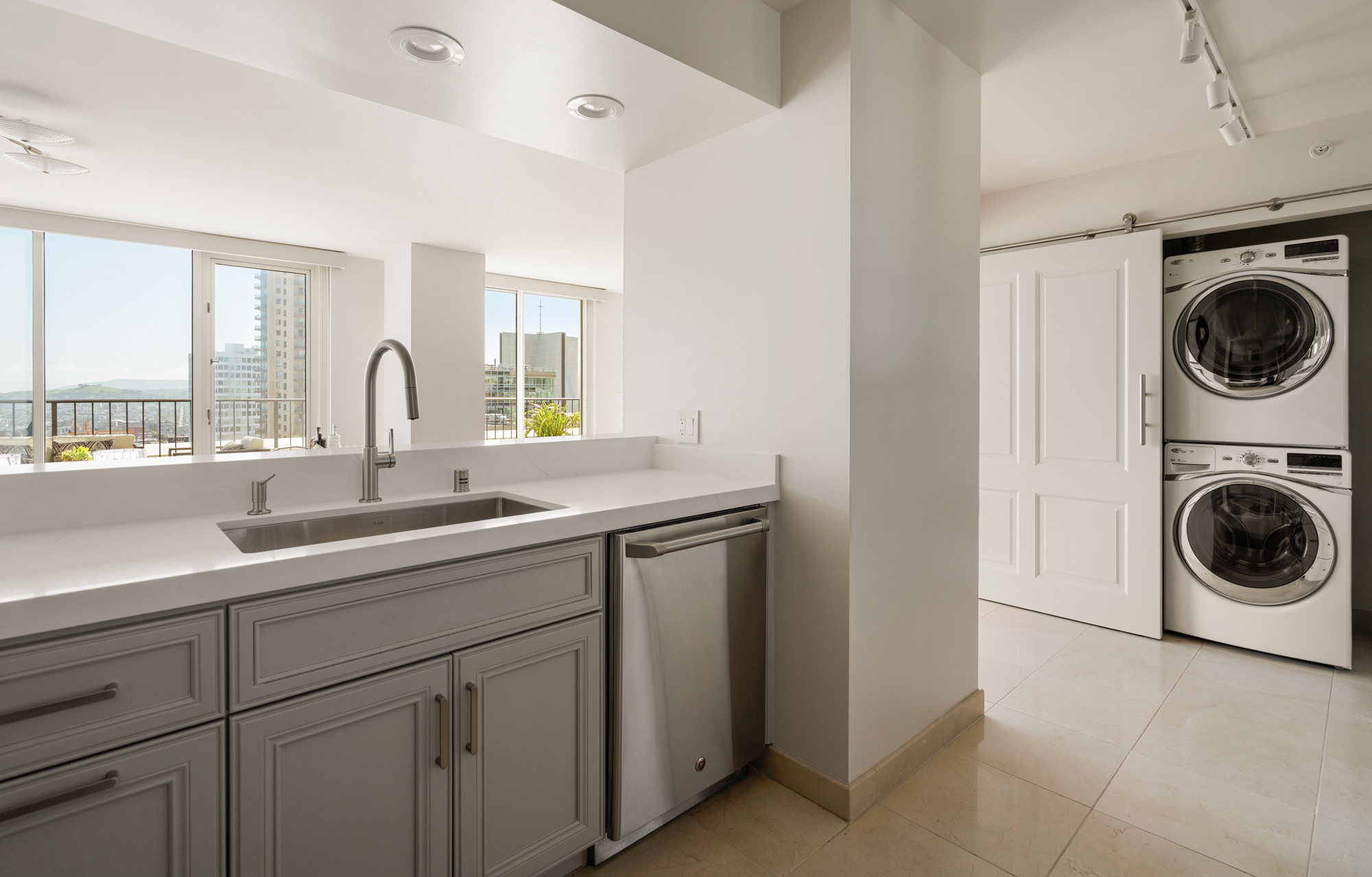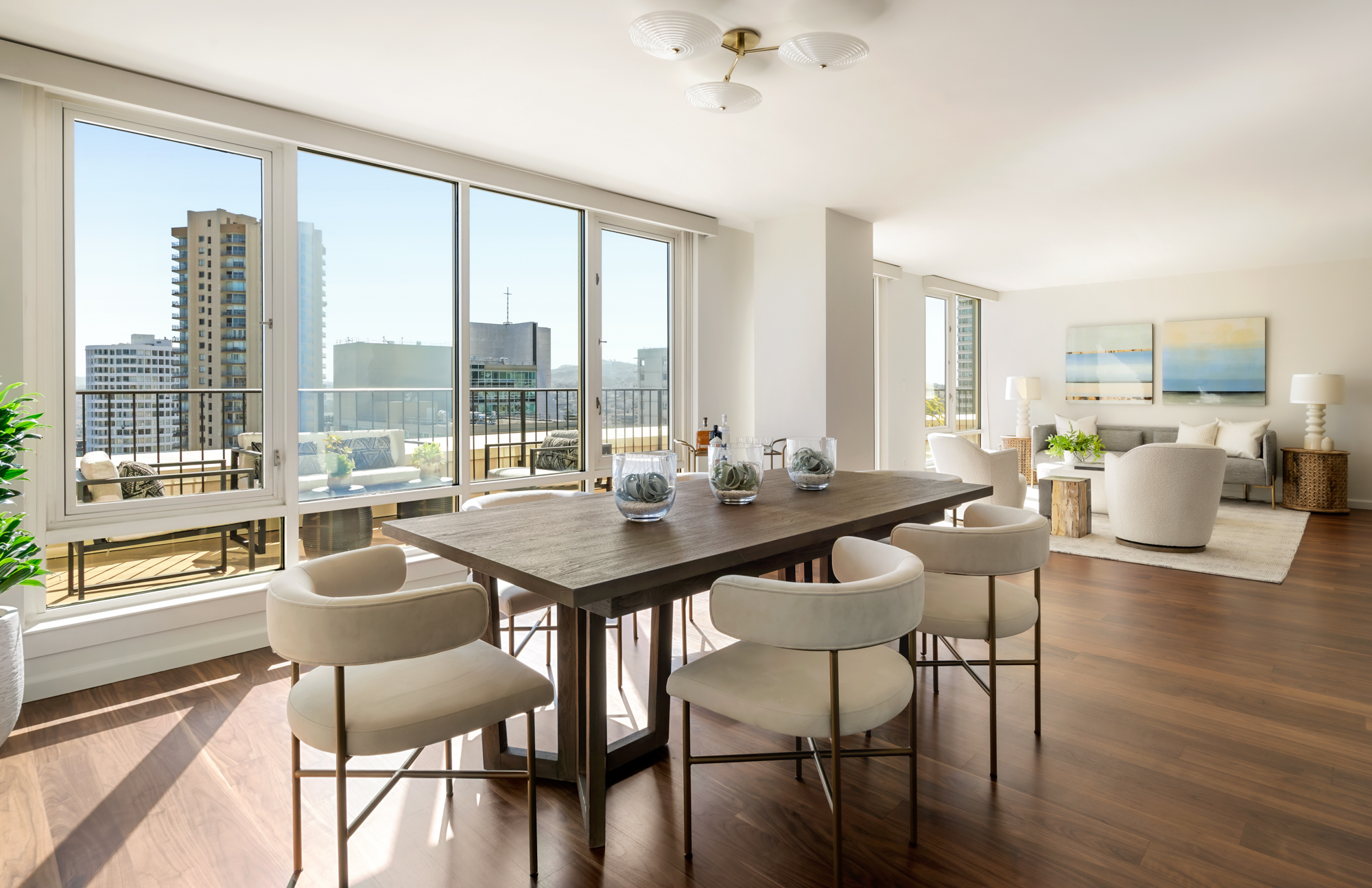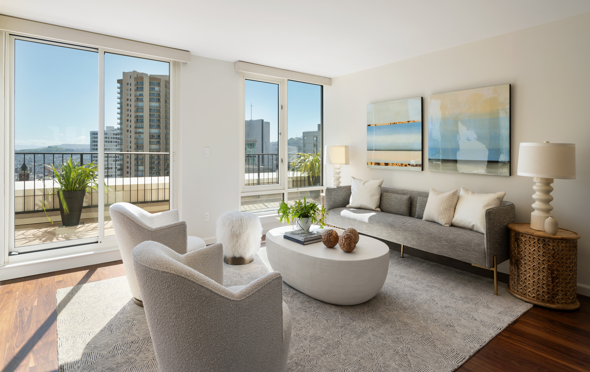 Exceptional view condominium at The Sutterfield! Featuring three expansive south-facing walkout terraces spanning the full length of the residence, offering sweeping outlooks of Salesforce Tower, the downtown skyline, Grace Cathedral, and the Bay. Inside, an updated kitchen flows into an open-concept living and dining space ideal for entertaining, with seamless access to the terraces for indoor-outdoor living. The generous primary suite features two closets, including a walk-in. Two additional bedrooms provide flexibility for guests or a home office. In-unit laundry is also included. Located in a full-service luxury building with 24-hour door person, elegant lobby, fitness center, spa and secure two-car garage parking. Sophisticated San Francisco living at The Sutterfield.
