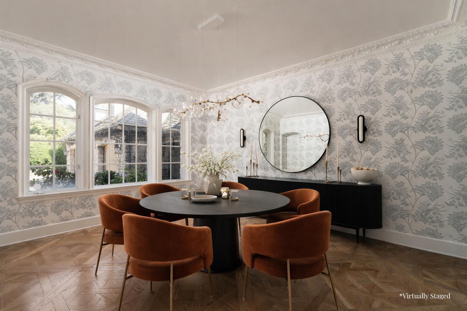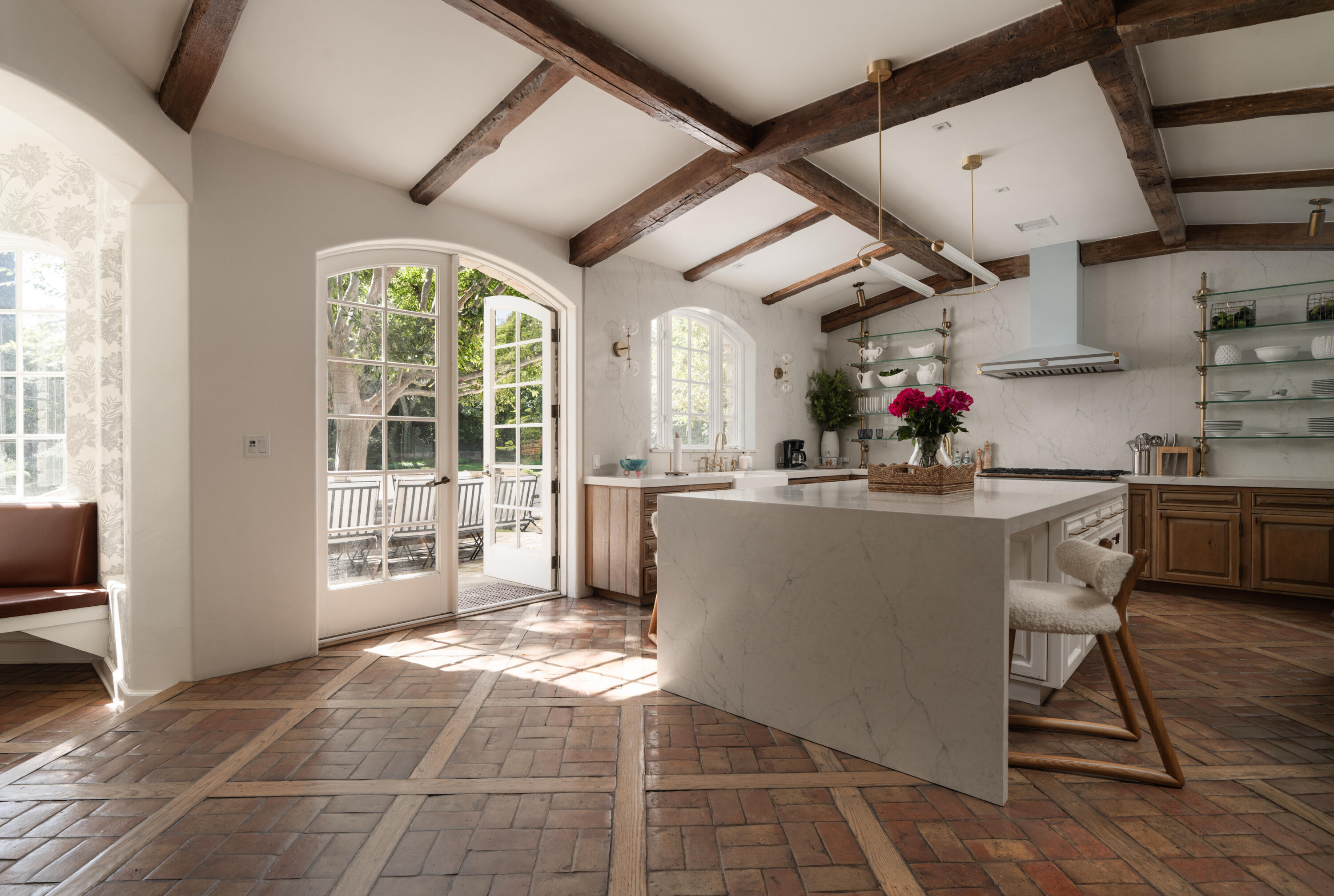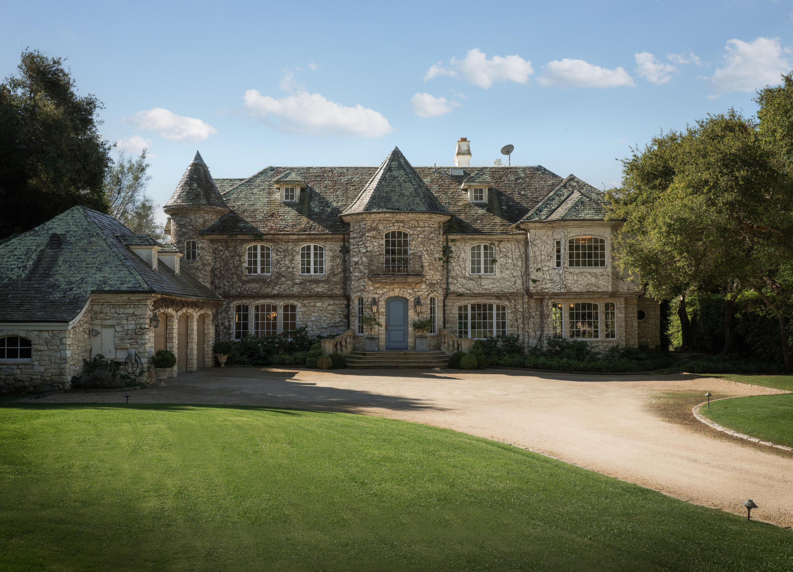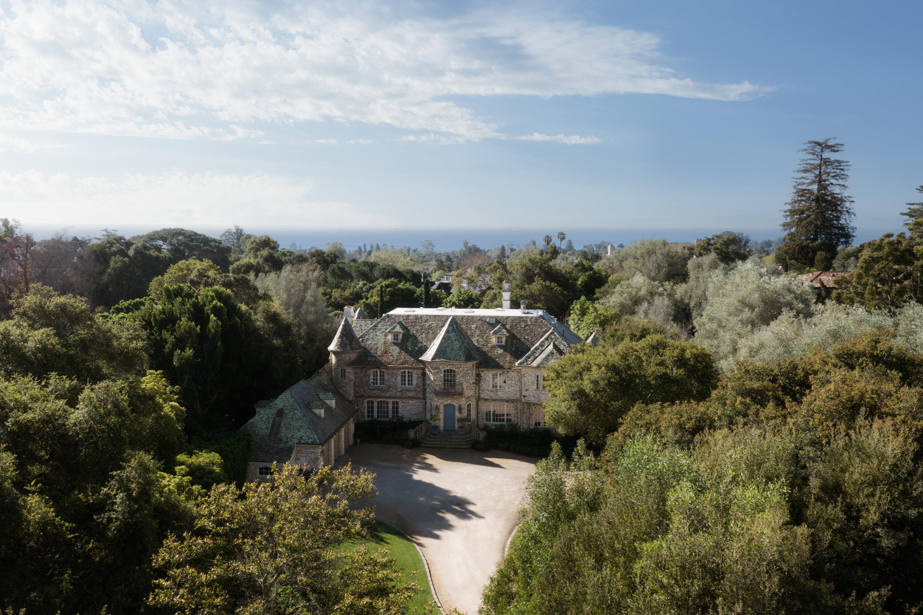 Moments from Montecito's Upper Village, return home to privacy behind gates. Set along a charming lane in a coveted trophy location, this gated estate offers the rare pairing of convenience and a quiet, private setting. The 8,372 sq. ft. residence features stone exteriors, slate rooflines, cathedral ceilings, custom millwork, and multiple fireplaces. In the kitchen, hand-hewn beams reclaimed from a 300-year-old European barn add warmth and character. Five bedroom suites are arranged on one level, while a top-floor media lounge provides a retreat for movie nights and gatherings. The 1.49-acre grounds feature citrus and mature elm trees, expansive lawns, and a bocce court, with approved plans for a future pool and cabana near the heart of the Upper Village.