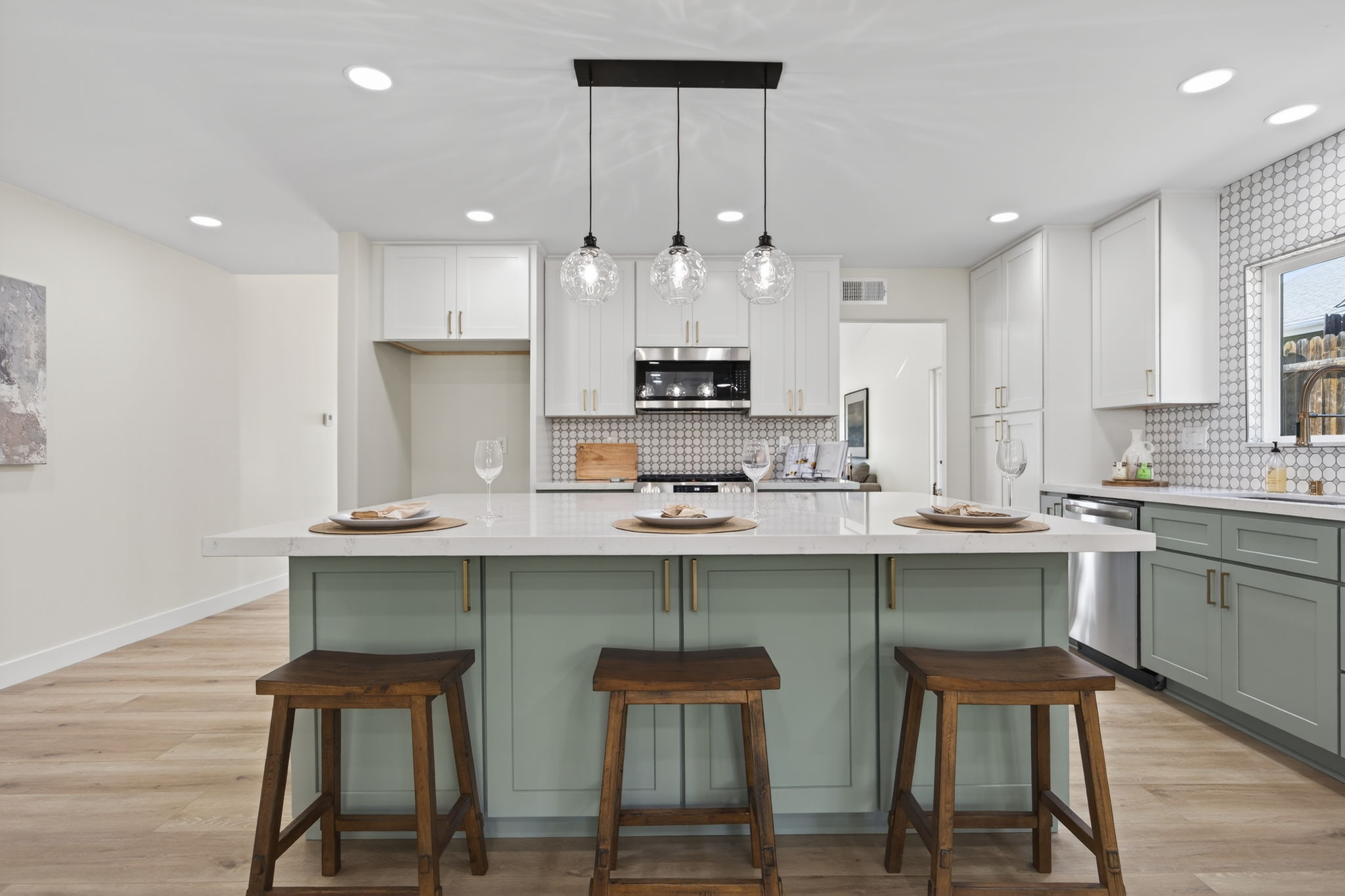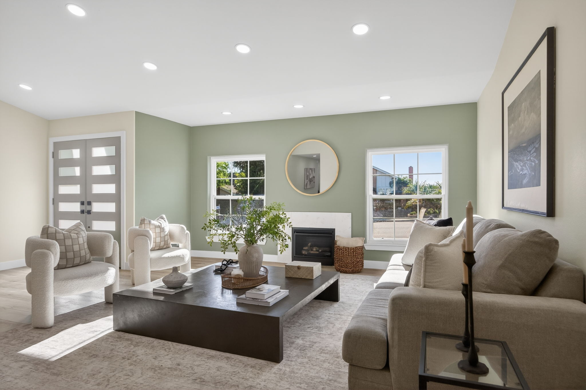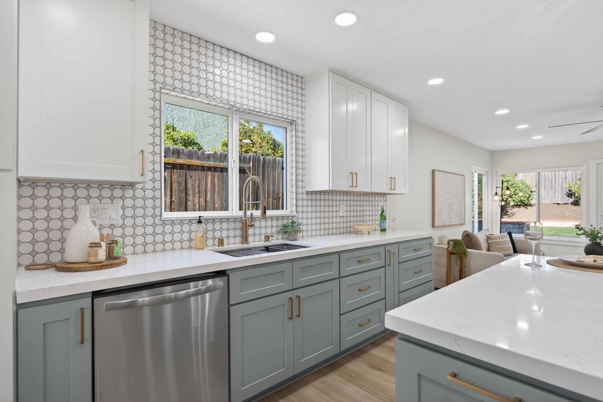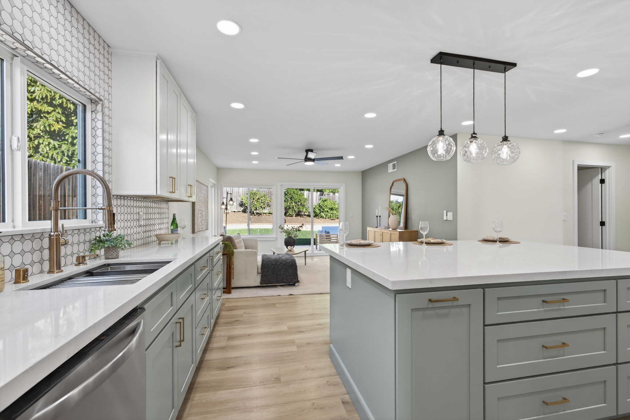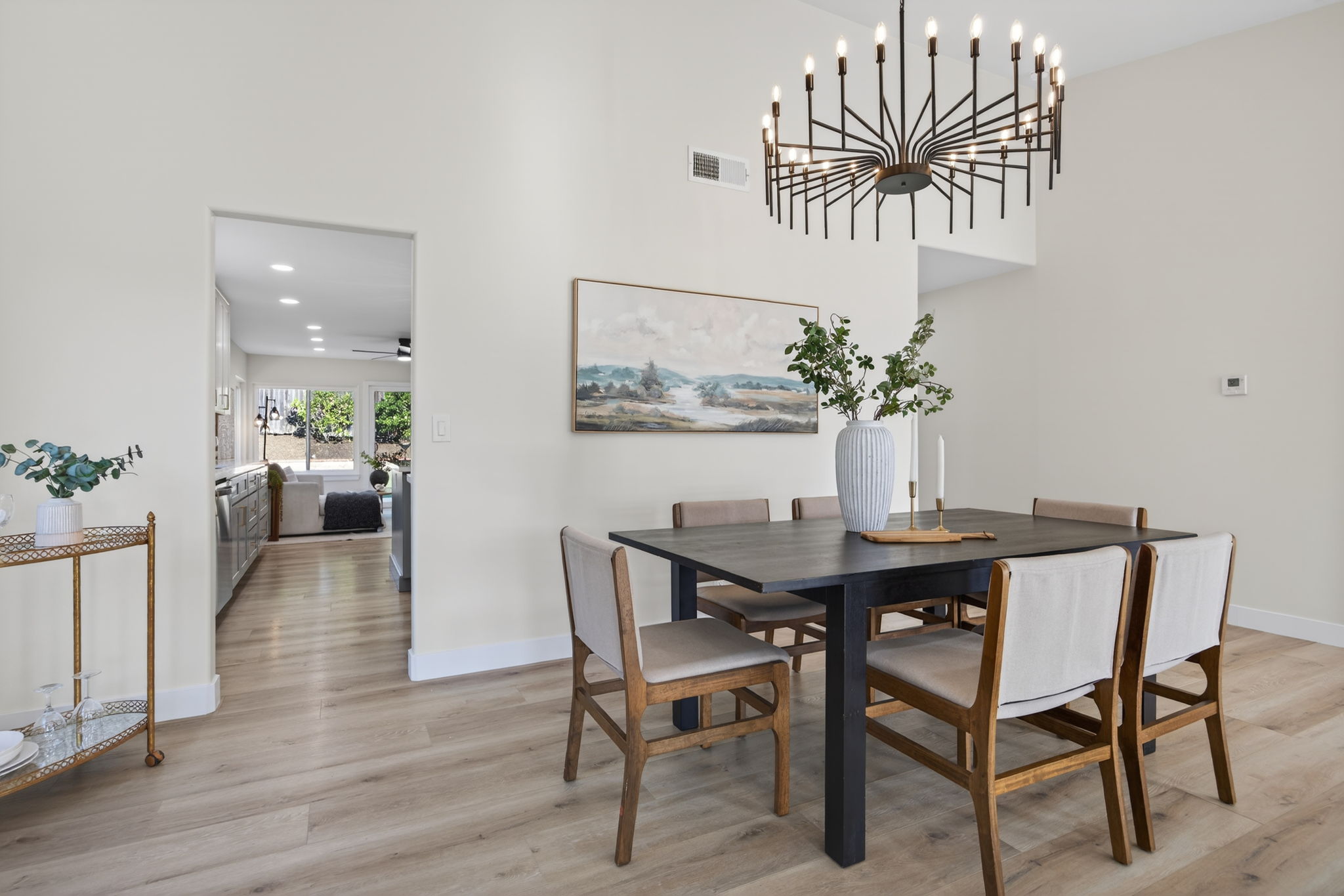 Beautifully renovated and thoughtfully designed, this single-story home in Camarillo Heights offers a bright and inviting layout with no interior steps. Inside, high ceilings and an open living and dining area create an immediate sense of space, while a stunning chandelier above the dining area draws your eye the moment you enter. Natural light pours through the windows, creating an airy atmosphere and highlighting the seamless flow between the main living spaces. Just beyond the dining area, you'll find the newly remodeled kitchen, designed to be both functional and stylish. The kitchen features a large center island with counter seating, perfect for casual dining or gathering with guests, along with new appliances, soft-close cabinetry, and pull-out pantry drawers for convenient storage. The kitchen opens to the second living area and flows seamlessly to the backyard, creating an ideal setup for indoor-outdoor living. The primary suite is spacious and serene, featuring double door entry, abundant natural light, and a generous walk-in closet. The renovated ensuite bathroom includes a dual-sink vanity, a linen closet, a separate water closet, and a stunning tiled walk-in shower. Three additional bedrooms provide flexibility for family, guests, or a home office. The backyard offers multiple areas to enjoy the outdoors, including a patio space ideal for lounging or dining, a large grassy yard, and a dedicated fire pit seating area perfect for gathering on cooler evenings. A variety of mature citrus trees add to the peaceful, garden-like setting. Additional features include an attached garage with washer and dryer area and utility sink, a large driveway providing ample parking, and potential RV access along the side of the home. With recessed lighting, new flooring, fresh interior and exterior paint, updated fixtures, and high-end finishes throughout, this home offers a truly turnkey opportunity in one of Camarillo's most desirable neighborhoods, ready for its next owner to simply move in and enjoy.