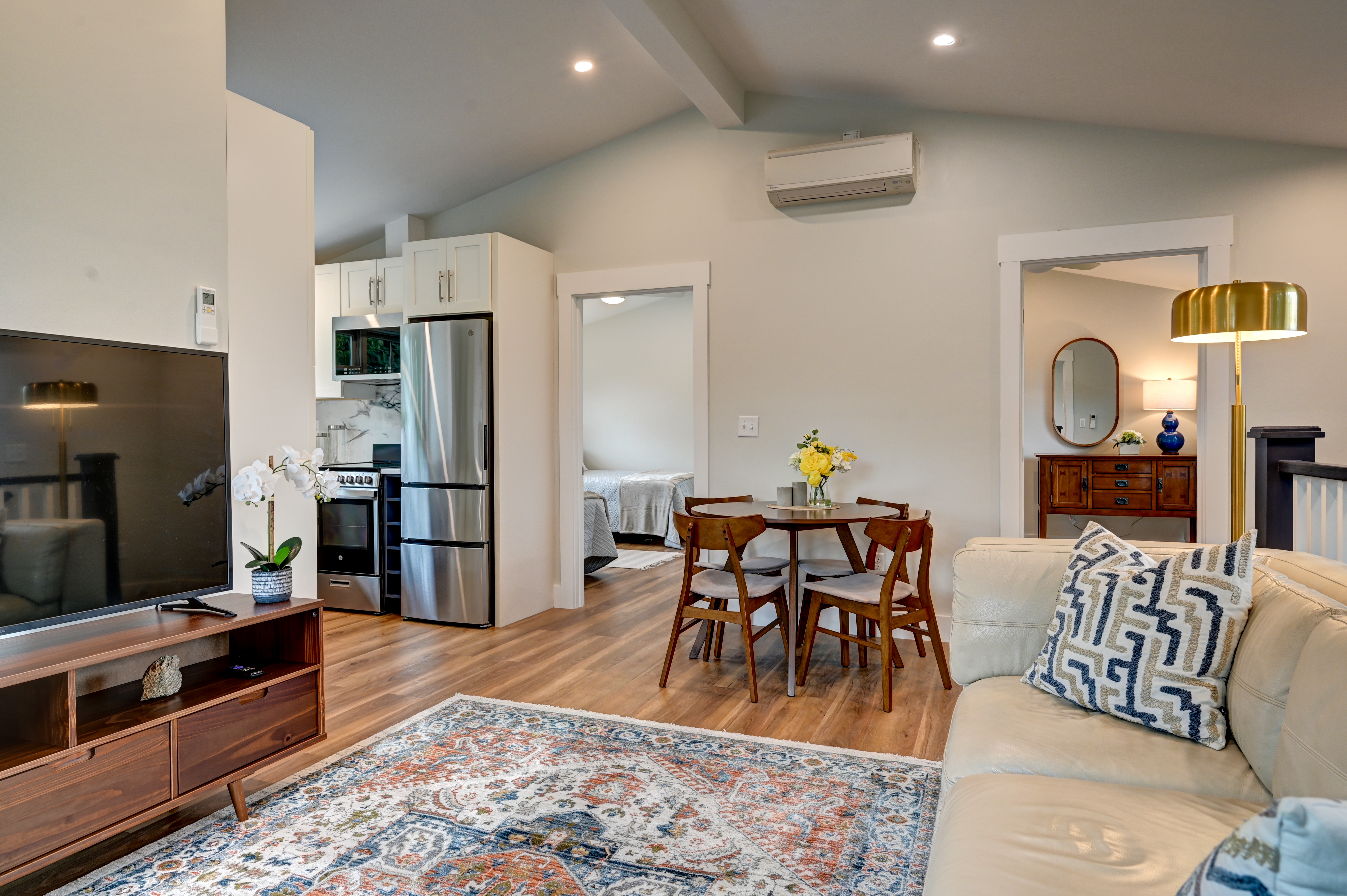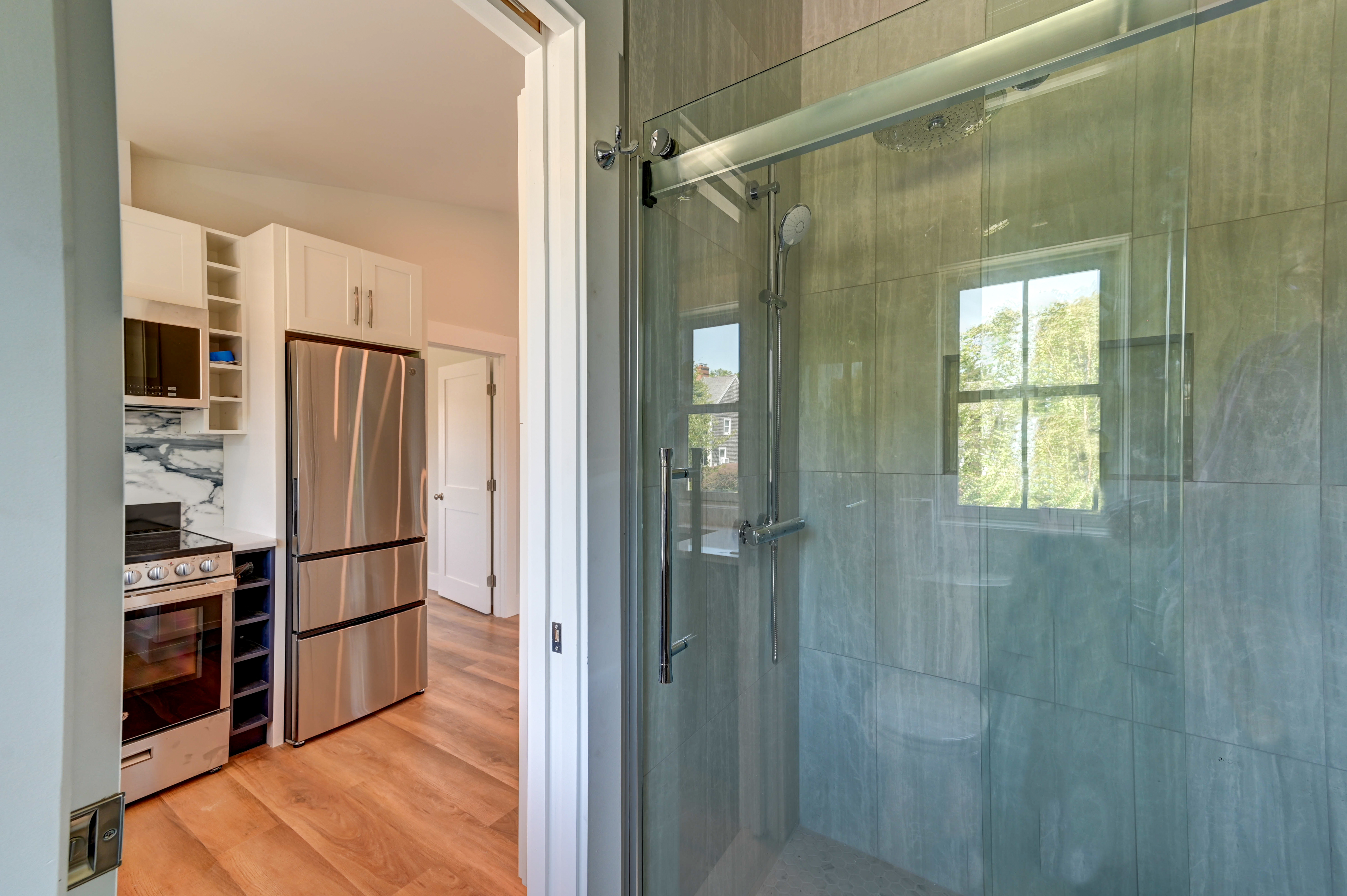 SUMMER RENTAL - Available July and August 2026. Perfect summer home in one of the best spots in Newport. Close to Bailey's/Reject Beach and Cliff Walk. Built in 2024, charming, freestanding, like an individual home, this two-bedroom, one bathroom apartment with 11 ft ceiling, offers individual entry, secluded private yard with patio, outdoor grill and dining area and outdoor hot and cold water shower. Laundry in unit. AC. Parking on site. Located on a quiet street, easy walk to sandy beach, near Cliff Walk and Newport mansions, 1.5 mile to downtown, restaurants, shops and marinas. Flooded with natural light, high (10 ft) ceilings; beautiful, with quarts countertops, fully equipped kitchen, generous (17x11) living/dining area, two good size (12x11) bedrooms, both with large closets. Full bathroom with porcelain tile shower and tiled floor. Every two weeks cleaning is included. Also available for off season term, starting September 1, 2026 through June 15, 2027 $2,450/month. Additional utilities fee ($350.00/month) applies.