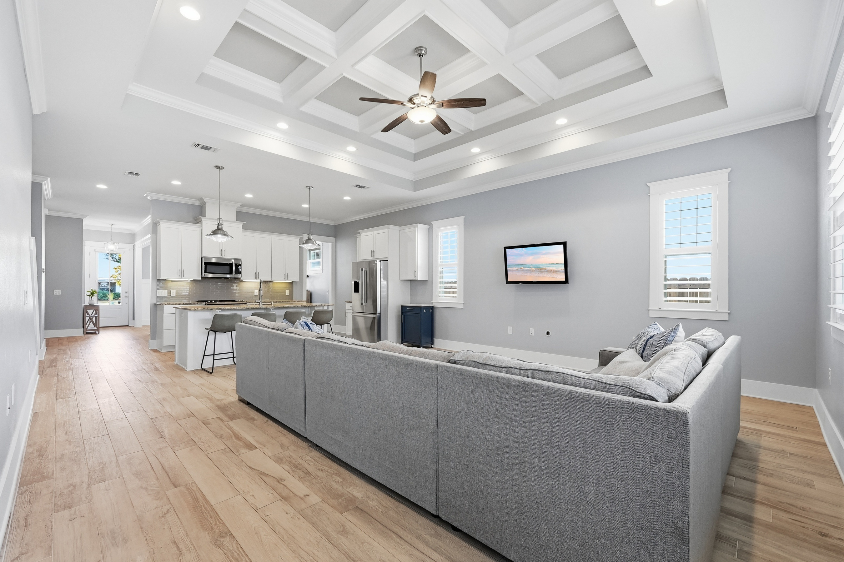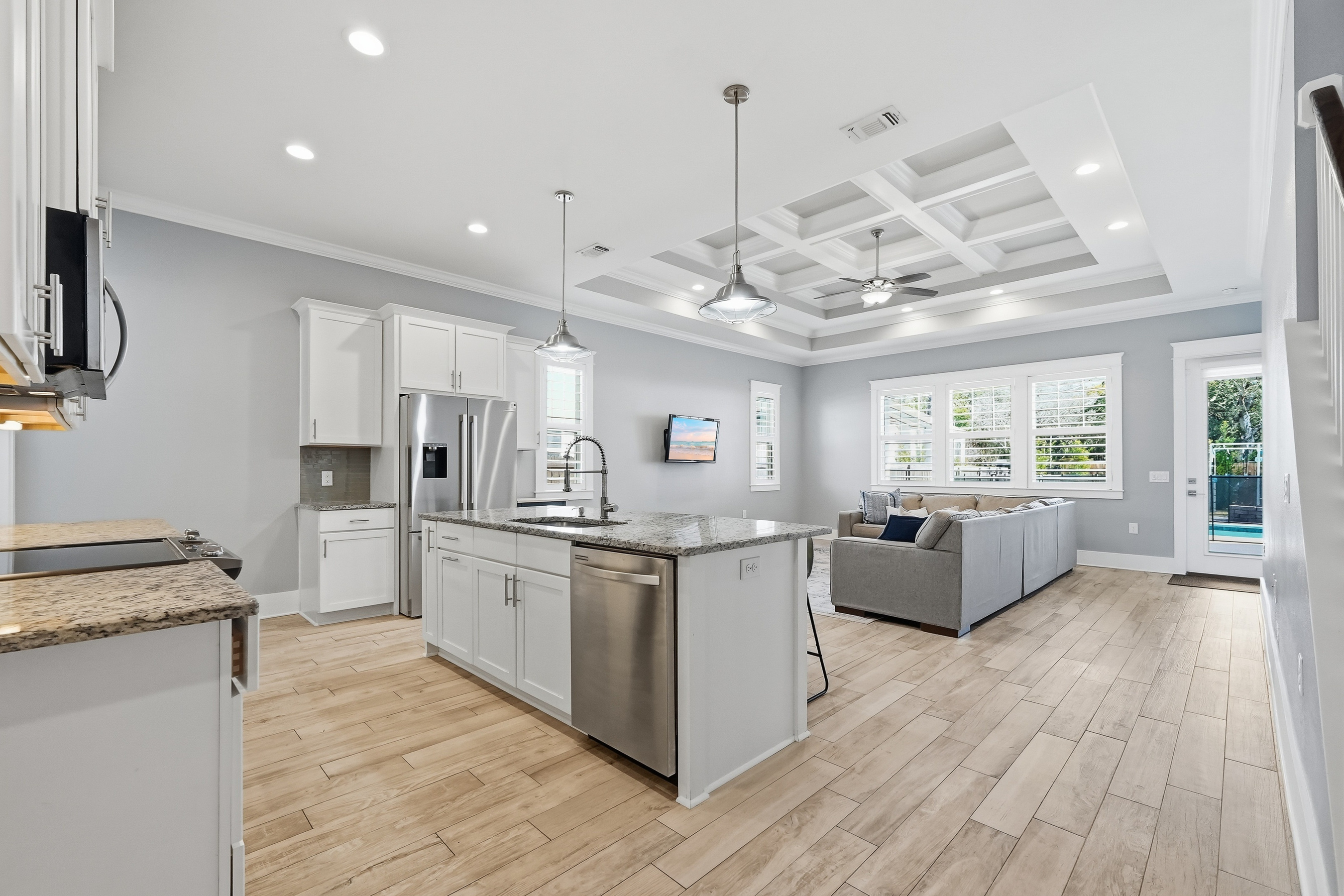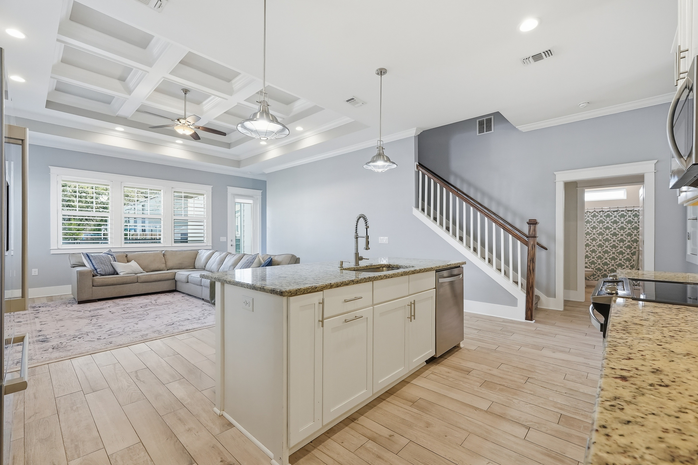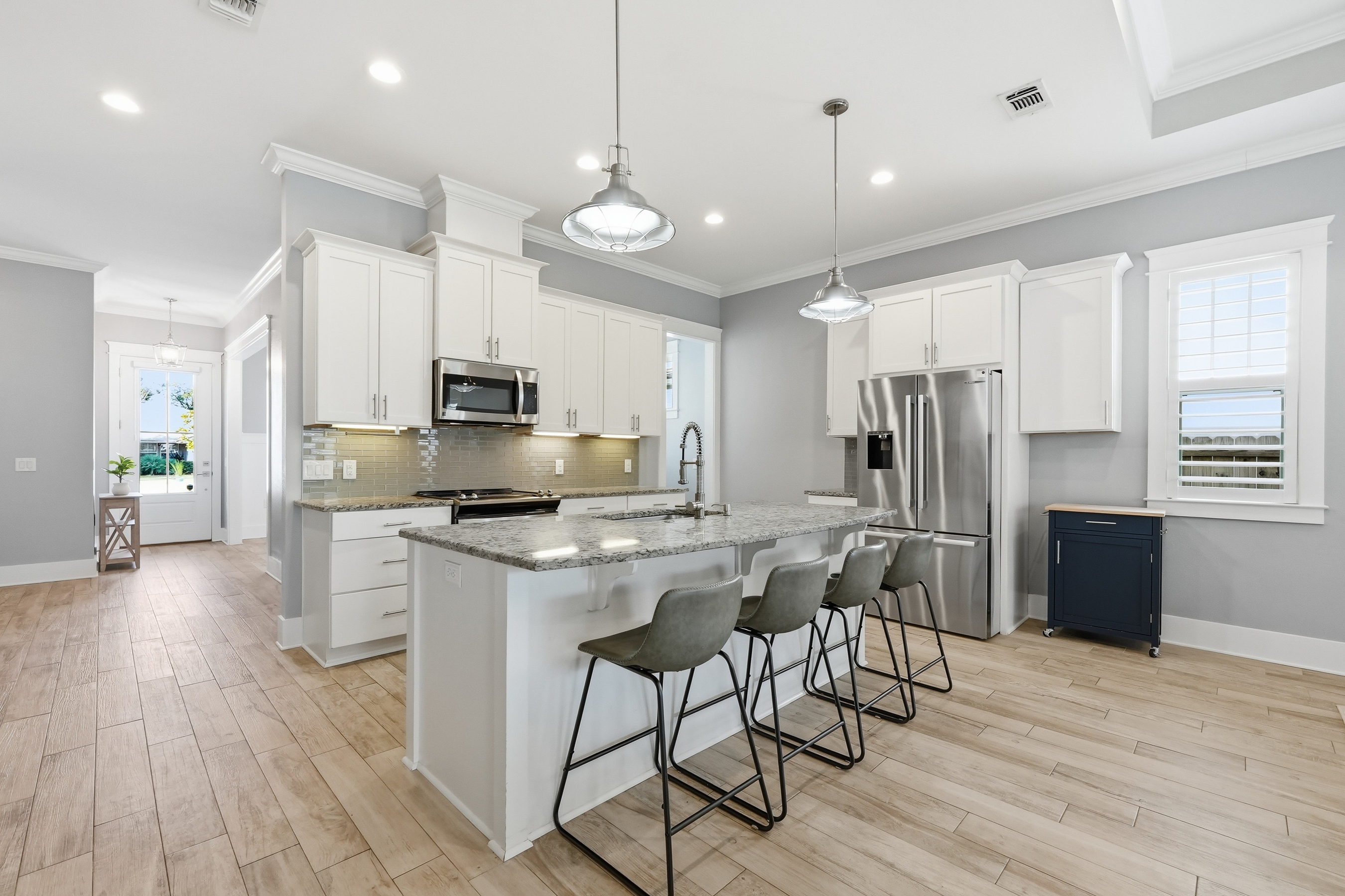 Built in 2018 and thoughtfully designed for both everyday comfort and entertaining, this spacious four-bedroom, three-bath residence sits in Elliot Pointe in the heart of downtown Fort Walton Beach, just moments from the water. Positioned in a golf cart-friendly area with convenient access to boating, beaches, dining, and local events, the home offers an exceptional blend of modern construction, flexible living space, and coastal lifestyle appeal.Inside, the two-story layout offers a bright and open atmosphere highlighted by 10-foot ceilings and quality finishes throughout. The main level features three bedrooms and two full bathrooms, including a private primary suite with a split floor plan that provides both comfort and privacy. Wood-grain tile flooring flows throughout the living spaces while coffered ceilings, recessed lighting, plantation shutters, and fresh interior paint create a polished and inviting environment. The kitchen serves as the central gathering space with shaker-style cabinetry, soft-close doors and drawers, granite countertops, stainless steel appliances, and plenty of room for both cooking and conversation.A second living room upstairs adds valuable flexibility to the floor plan. This level also includes a fourth bedroom with two closets and a full bathroom, making it ideal for guests, a media room, a home office, or a private retreat for extended family.Outdoor living takes center stage in the private backyard, where a heated in-ground gunite pool creates a resort-style setting perfect for relaxing afternoons or weekend gatherings. The fenced yard provides added privacy while the removable pool safety gate offers peace of mind. Energy-efficient solar panels, already paid off, add long-term savings and sustainability.Location enhances the lifestyle even further. A public boat launch sits just a few blocks away, making spontaneous days on the water effortless. The nearby Fort Walton Yacht Club offers optional membership with dining, a private beach, event space, boat slips, a pool, and a vibrant calendar of activities just about a mile from the home.With no HOA and no rental restrictions, the property offers rare flexibility for homeowners and investors alike. The surrounding downtown area continues to evolve with redevelopment momentum and the highly anticipated Brooks Bridge project, expected to enhance connectivity and long-term property values.This is a modern coastal home positioned perfectly for enjoying the Emerald Coast lifestyle, whether as a primary residence, second home, or investment opportunity.