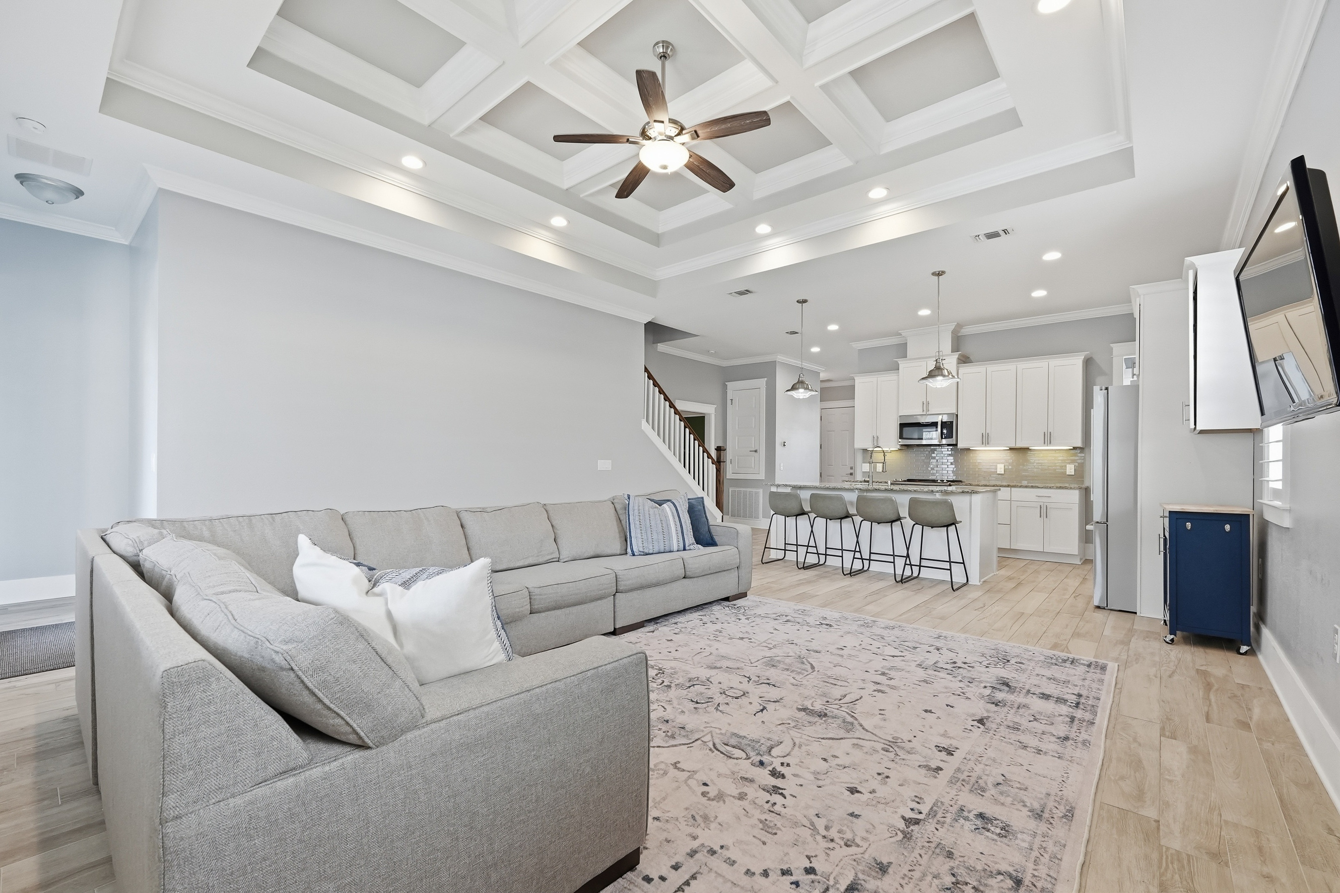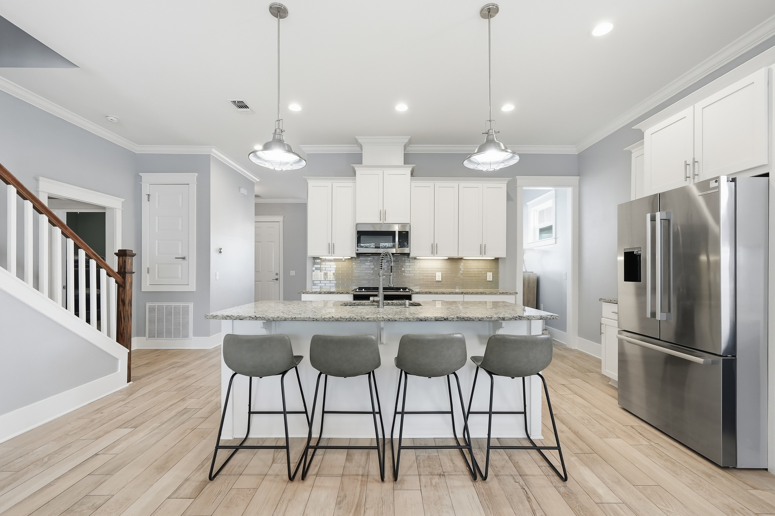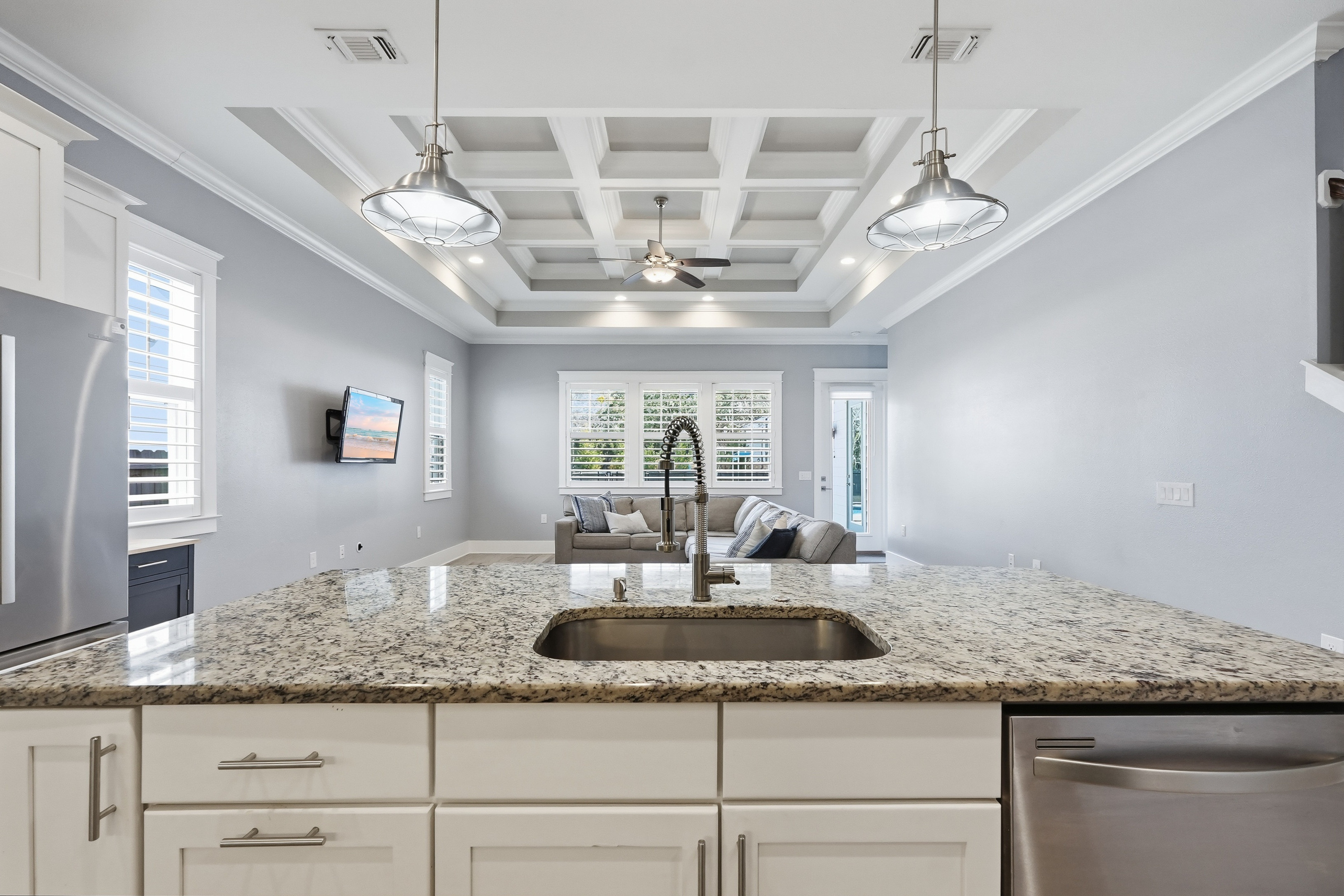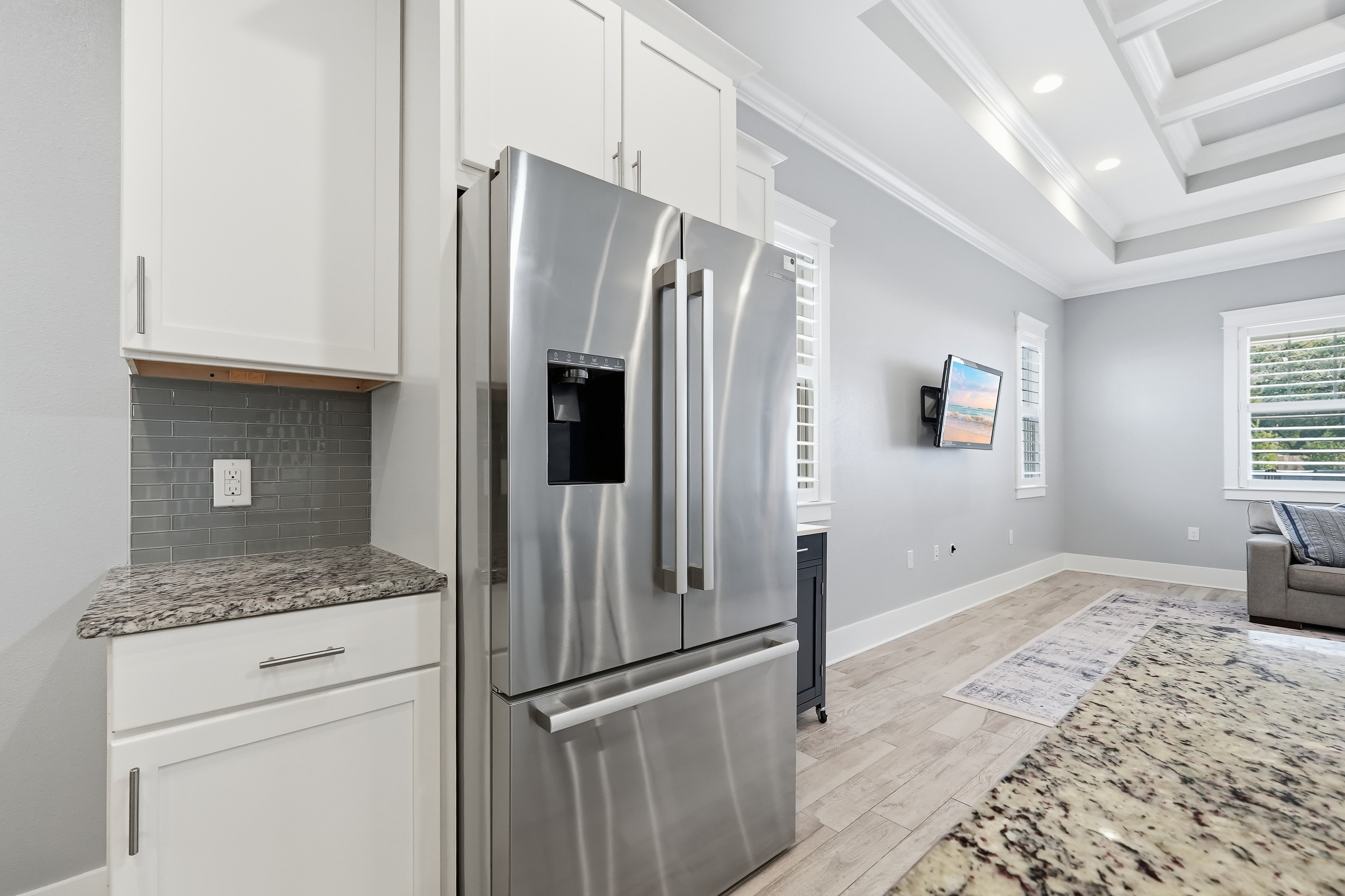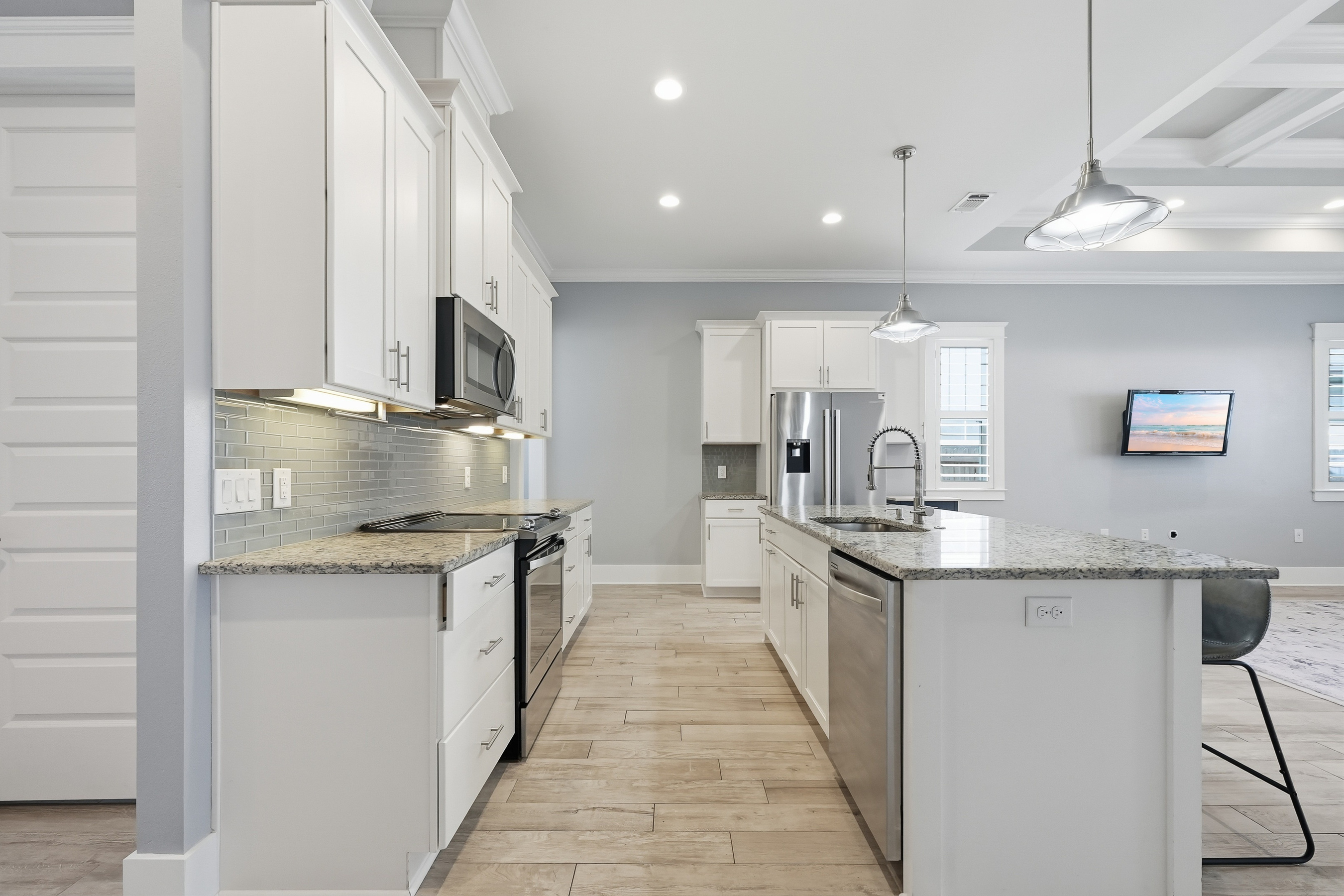 Built in 2018 and thoughtfully designed for both everyday comfort and entertaining, this spacious four-bedroom, three-bath residence sits in Elliot Pointe in the heart of downtown Fort Walton Beach, just moments from the water. Positioned in a golf cart-friendly area with convenient access to boating, beaches, dining, and local events, the home offers an exceptional blend of modern construction, flexible living space, and coastal lifestyle appeal.Inside, the two-story layout offers a bright and open atmosphere highlighted by 10-foot ceilings and quality finishes throughout. The main level features three bedrooms and two full bathrooms, including a private primary suite with a split floor plan that provides both comfort and privacy. Wood-grain tile flooring flows throughout the living spaces while coffered ceilings, recessed lighting, plantation shutters, and fresh interior paint create a polished and inviting environment. The kitchen serves as the central gathering space with shaker-style cabinetry, soft-close doors and drawers, granite countertops, stainless steel appliances, and plenty of room for both cooking and conversation.A second living room upstairs adds valuable flexibility to the floor plan. This level also includes a fourth bedroom with two closets and a full bathroom, making it ideal for guests, a media room, a home office, or a private retreat for extended family.Outdoor living takes center stage in the private backyard, where a heated in-ground gunite pool creates a resort-style setting perfect for relaxing afternoons or weekend gatherings. The fenced yard provides added privacy while the removable pool safety gate offers peace of mind. Energy-efficient solar panels, already paid off, add long-term savings and sustainability.Location enhances the lifestyle even further. A public boat launch sits just a few blocks away, making spontaneous days on the water effortless. The nearby Fort Walton Yacht Club offers optional membership with dining, a private beach, event space, boat slips, a pool, and a vibrant calendar of activities just about a mile from the home.With no HOA and no rental restrictions, the property offers rare flexibility for homeowners and investors alike. The surrounding downtown area continues to evolve with redevelopment momentum and the highly anticipated Brooks Bridge project, expected to enhance connectivity and long-term property values.This is a modern coastal home positioned perfectly for enjoying the Emerald Coast lifestyle, whether as a primary residence, second home, or investment opportunity.