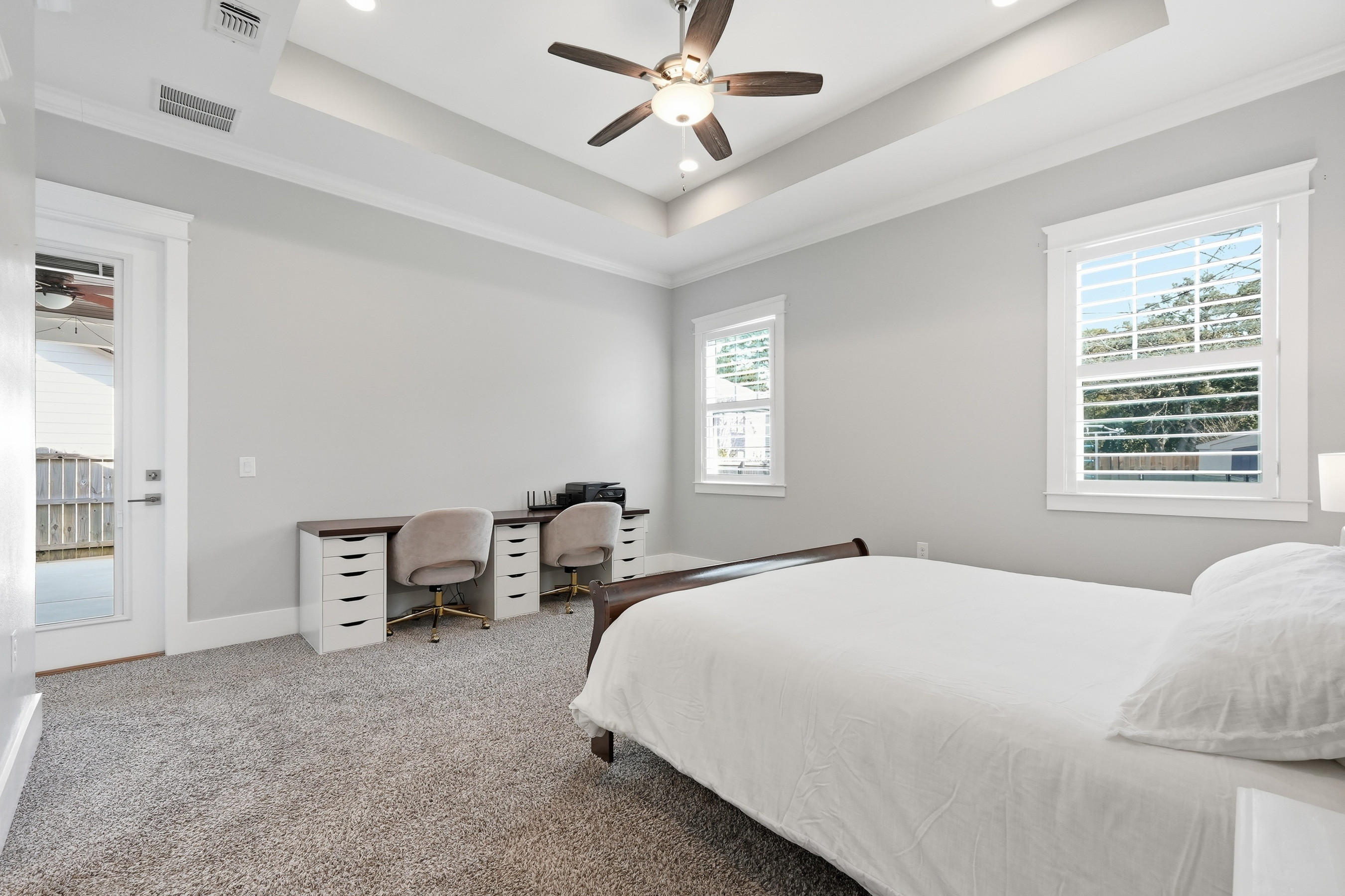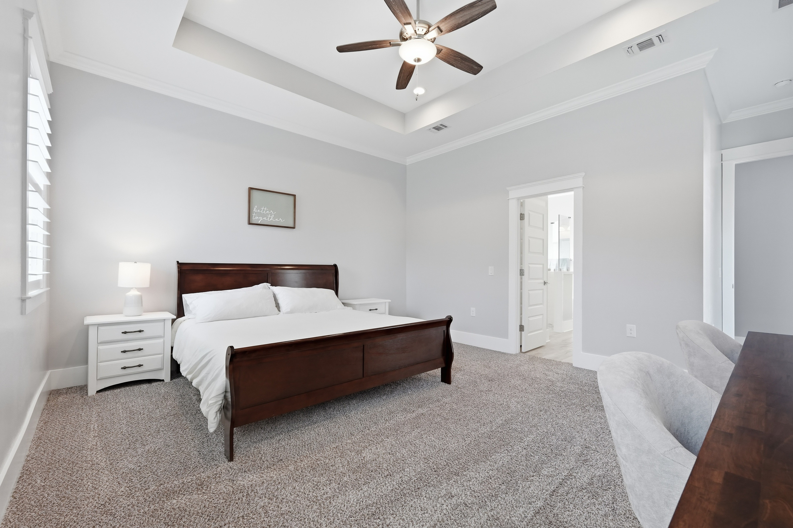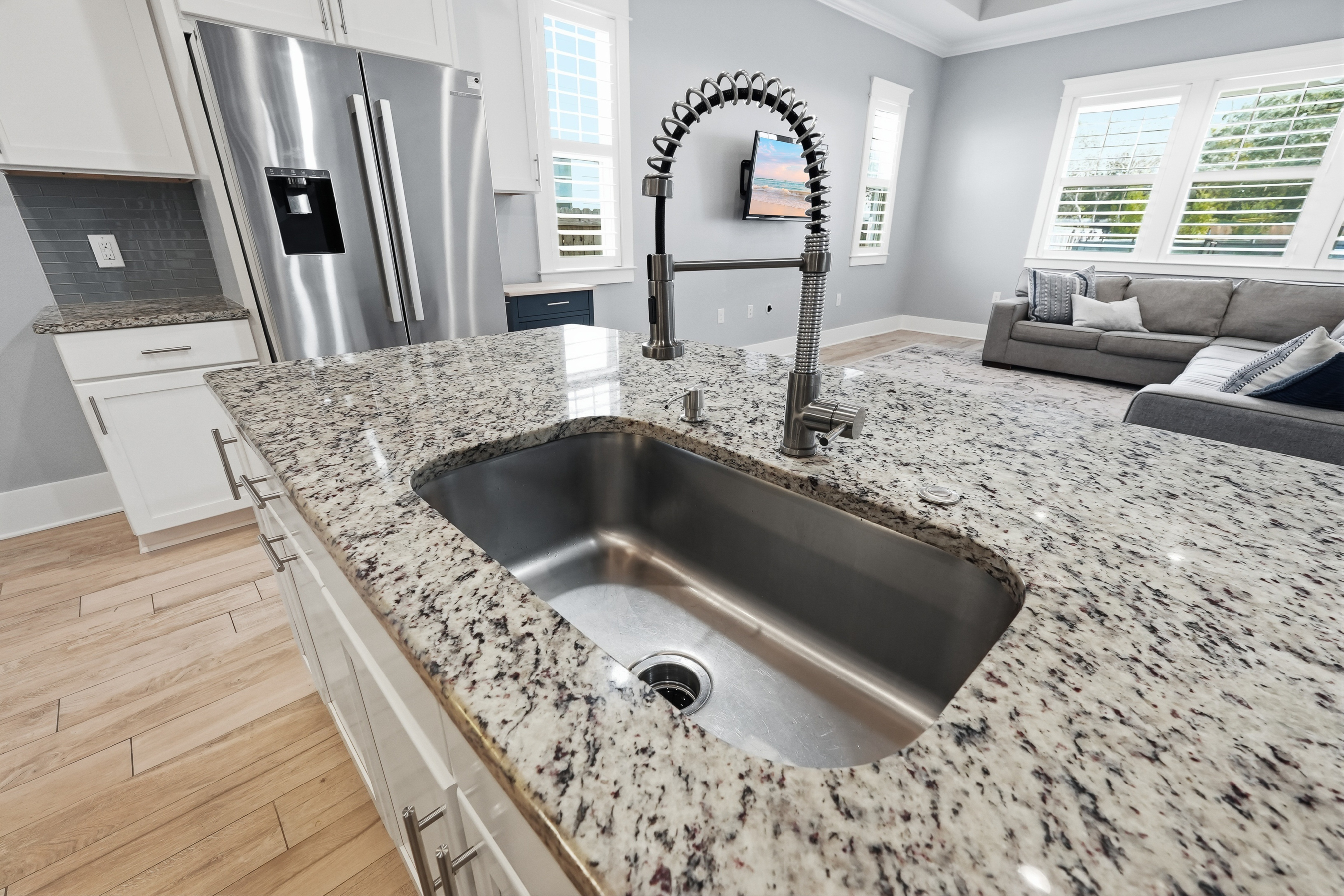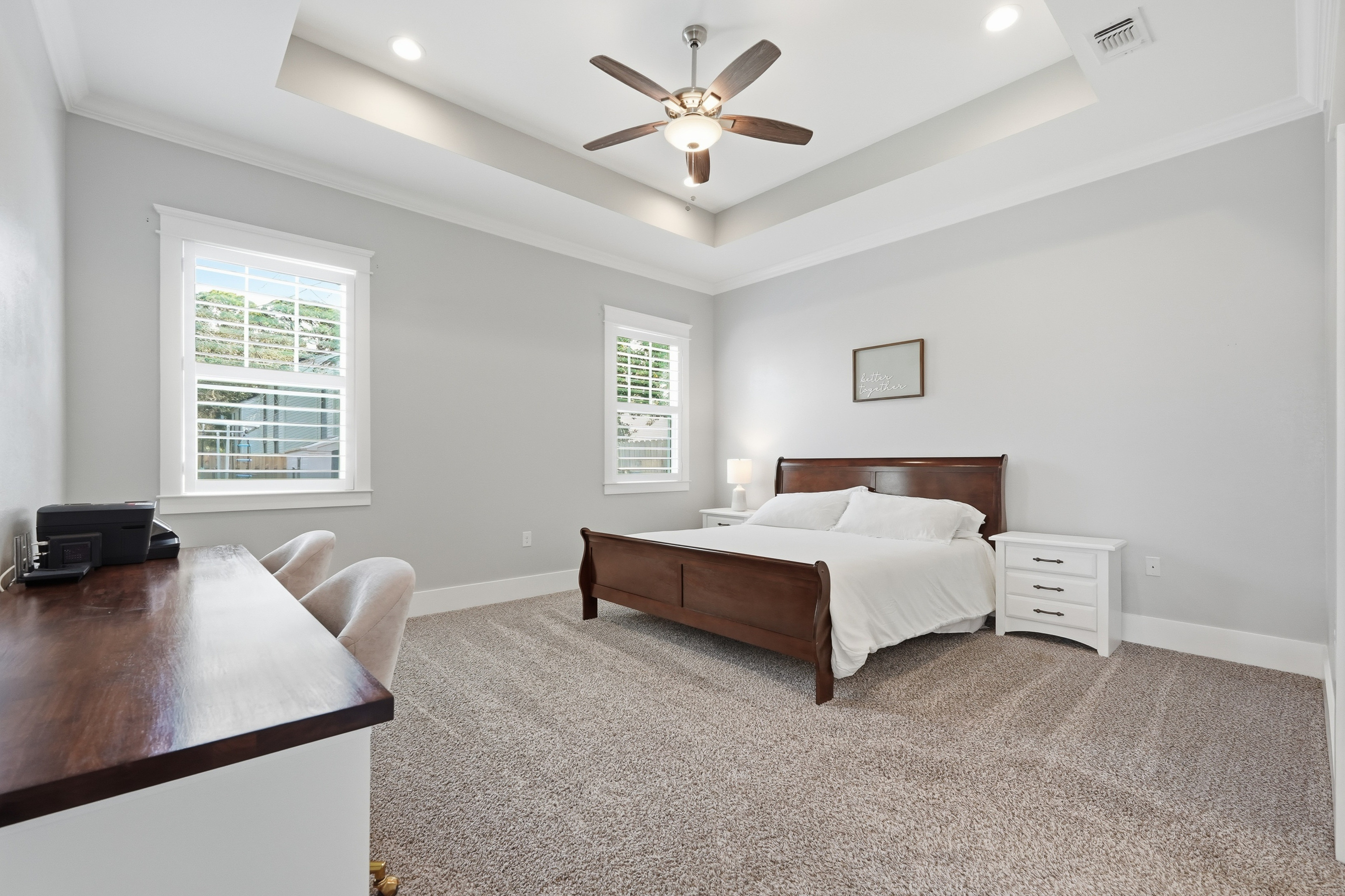 Built in 2018 and thoughtfully designed for both everyday comfort and entertaining, this spacious four-bedroom, three-bath residence sits in Elliot Pointe in the heart of downtown Fort Walton Beach, just moments from the water. Positioned in a golf cart-friendly area with convenient access to boating, beaches, dining, and local events, the home offers an exceptional blend of modern construction, flexible living space, and coastal lifestyle appeal.Inside, the two-story layout offers a bright and open atmosphere highlighted by 10-foot ceilings and quality finishes throughout. The main level features three bedrooms and two full bathrooms, including a private primary suite with a split floor plan that provides both comfort and privacy. Wood-grain tile flooring flows throughout the living spaces while coffered ceilings, recessed lighting, plantation shutters, and fresh interior paint create a polished and inviting environment. The kitchen serves as the central gathering space with shaker-style cabinetry, soft-close doors and drawers, granite countertops, stainless steel appliances, and plenty of room for both cooking and conversation.A second living room upstairs adds valuable flexibility to the floor plan. This level also includes a fourth bedroom with two closets and a full bathroom, making it ideal for guests, a media room, a home office, or a private retreat for extended family.Outdoor living takes center stage in the private backyard, where a heated in-ground gunite pool creates a resort-style setting perfect for relaxing afternoons or weekend gatherings. The fenced yard provides added privacy while the removable pool safety gate offers peace of mind. Energy-efficient solar panels, already paid off, add long-term savings and sustainability.Location enhances the lifestyle even further. A public boat launch sits just a few blocks away, making spontaneous days on the water effortless. The nearby Fort Walton Yacht Club offers optional membership with dining, a private beach, event space, boat slips, a pool, and a vibrant calendar of activities just about a mile from the home.With no HOA and no rental restrictions, the property offers rare flexibility for homeowners and investors alike. The surrounding downtown area continues to evolve with redevelopment momentum and the highly anticipated Brooks Bridge project, expected to enhance connectivity and long-term property values.This is a modern coastal home positioned perfectly for enjoying the Emerald Coast lifestyle, whether as a primary residence, second home, or investment opportunity.