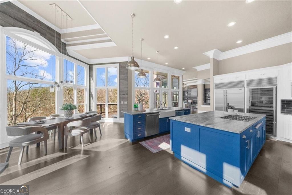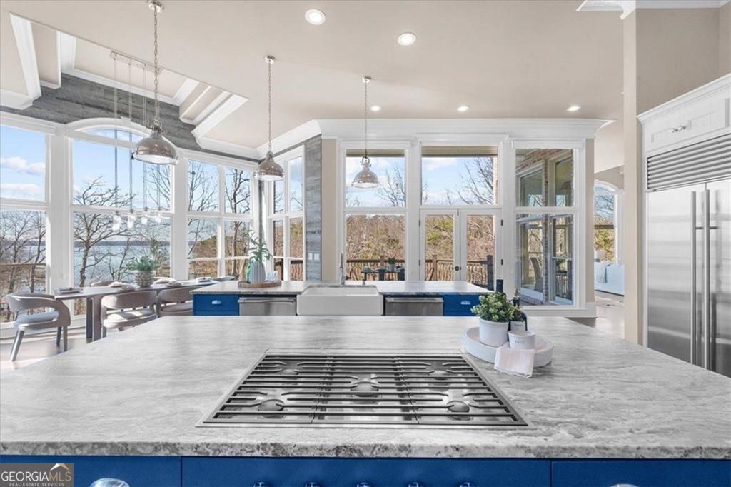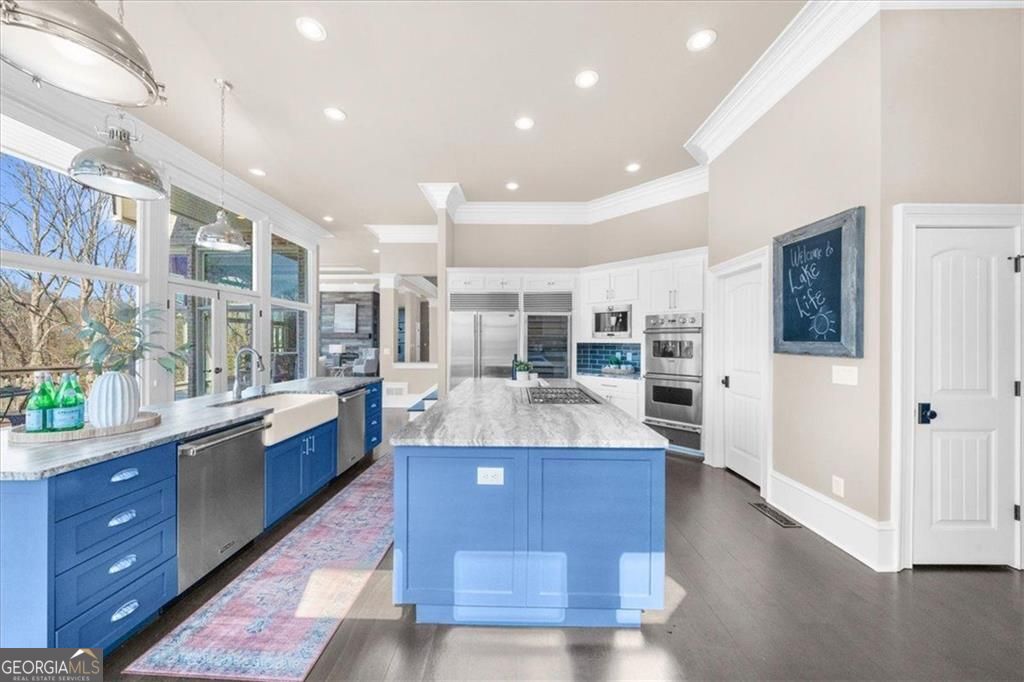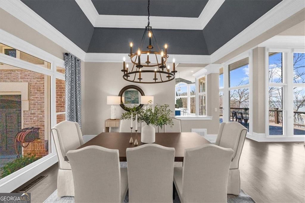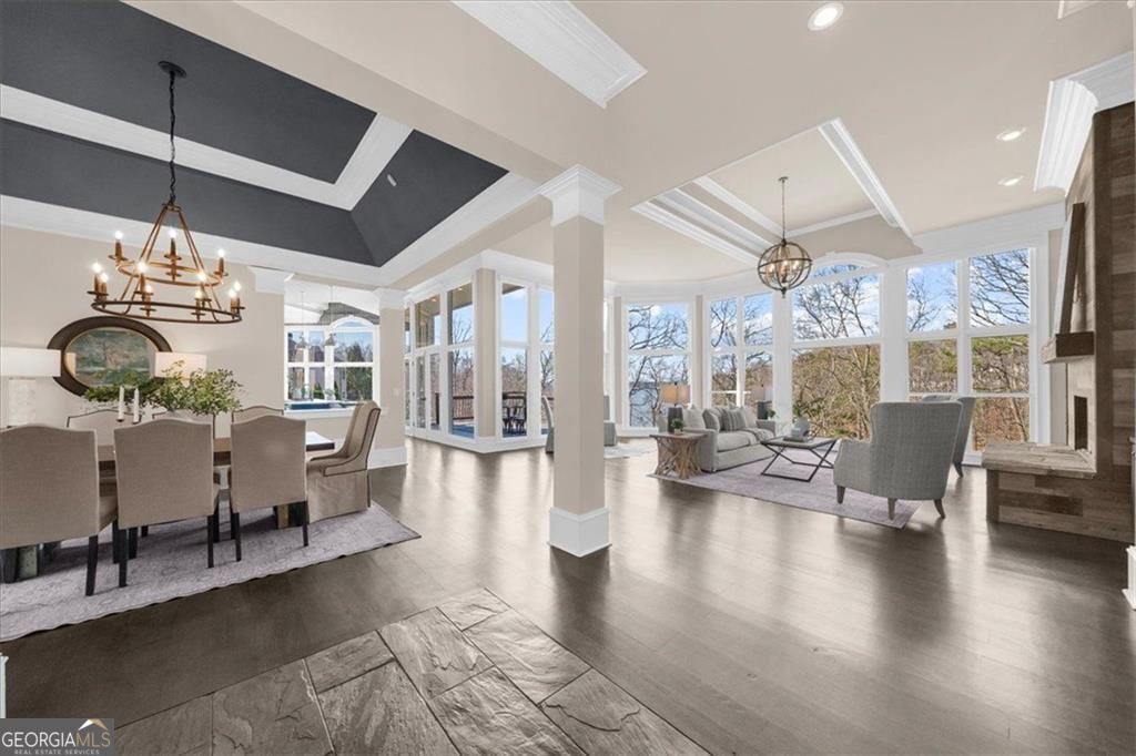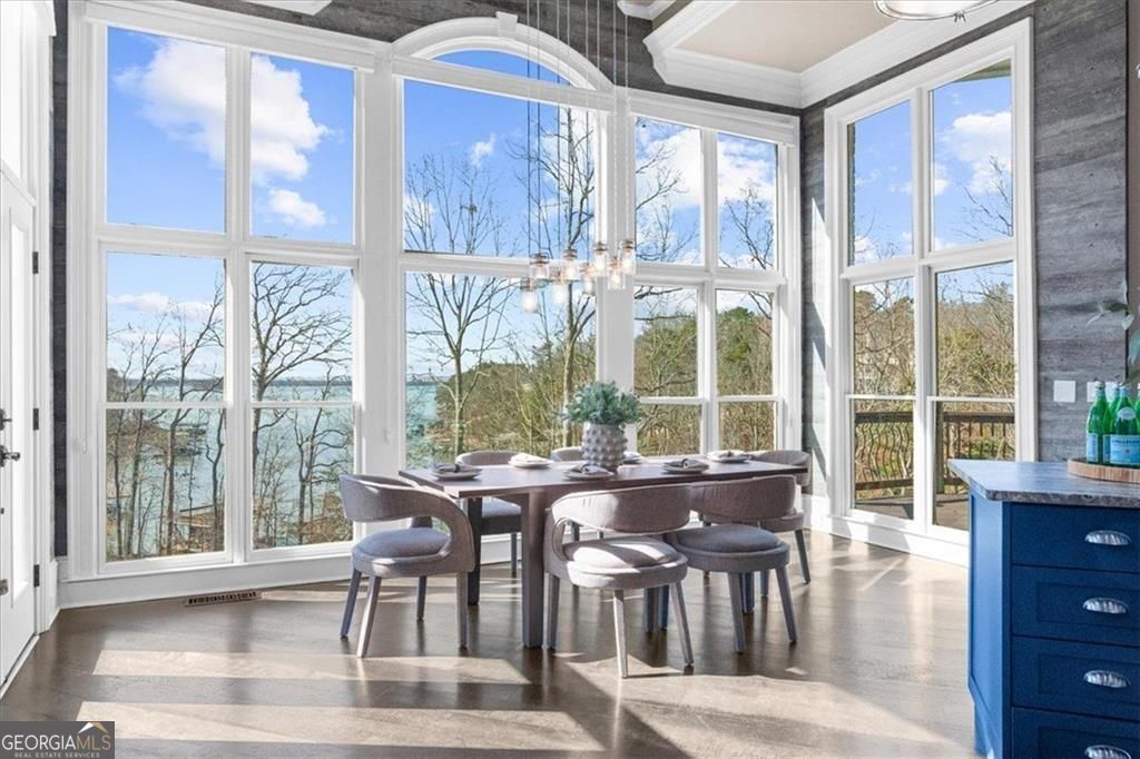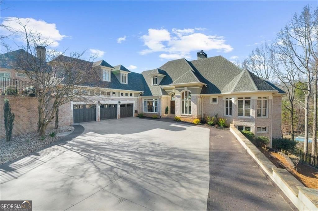 Sunset Serenity ~Perfectly positioned on the coveted south end of Lake Lanier in the gated community of Pointe West, this exceptional all-brick lakefront estate offers breathtaking sunset views and rare legacy lake living in a neighborhood where homes seldom become available. Designed for seamless indoor-outdoor living, the resort-style setting features a saltwater pool, cedar-beamed pergola, expansive outdoor living and dining areas with fireplace, all overlooking a protected cove that opens to big, deep water. Gentle steps lead to a private double-slip aluminum dock with party deck, boat hoist, and jet ski ports for effortless access to South Lake Lanier. Inside, walls of windows capture lake views and fill the home with natural light. Beautiful Hardwood floors and an open floor plan create ideal spaces for everyday living and entertaining. The chef's kitchen features dual islands, Sub-Zero and Viking appliances, beverage refrigerator, double dishwashers, and a custom walk-in pantry. The main-level owner's suite offers a spa-inspired bath with clawfoot soaking tub, boutique-style dressing rooms, and a Bosch coffee station, a main level flex room/home office and upper level guest en suite complete the main level. The terrace lives much like the main level & includes a second full kitchen, fireside family room, guest en suites, home gym, home theater, secondary laundry, pool side full bath, and covered porch ideal for extended stays or multi-generational living. Additional features include elevator shaft from main to pool level for future installation, expanded three-car garage, whole-house generator, and smart home system. Pointe West offers resort-style swim and tennis amenities and convenient boating access to popular South Lake destinations like Sunset Cove Marina, Pelican Petes, Lake Lanier Resort & on-water dining destinations. This home is centrally located on Lake Lanier and convenient to access Atlanta, Gainesville and NE GA. Arrive by land or by water: **3413'45"N, 8354'34"W.**