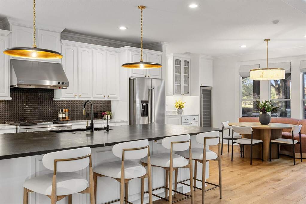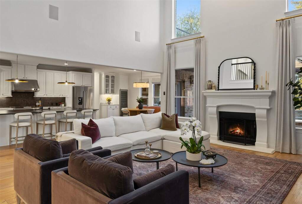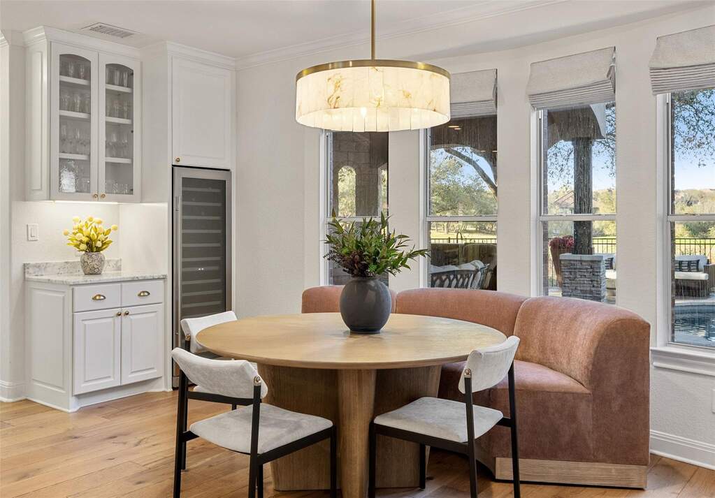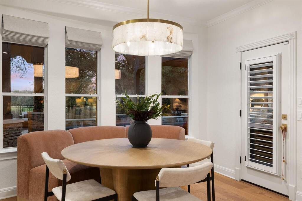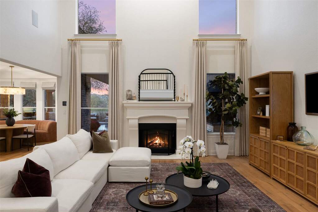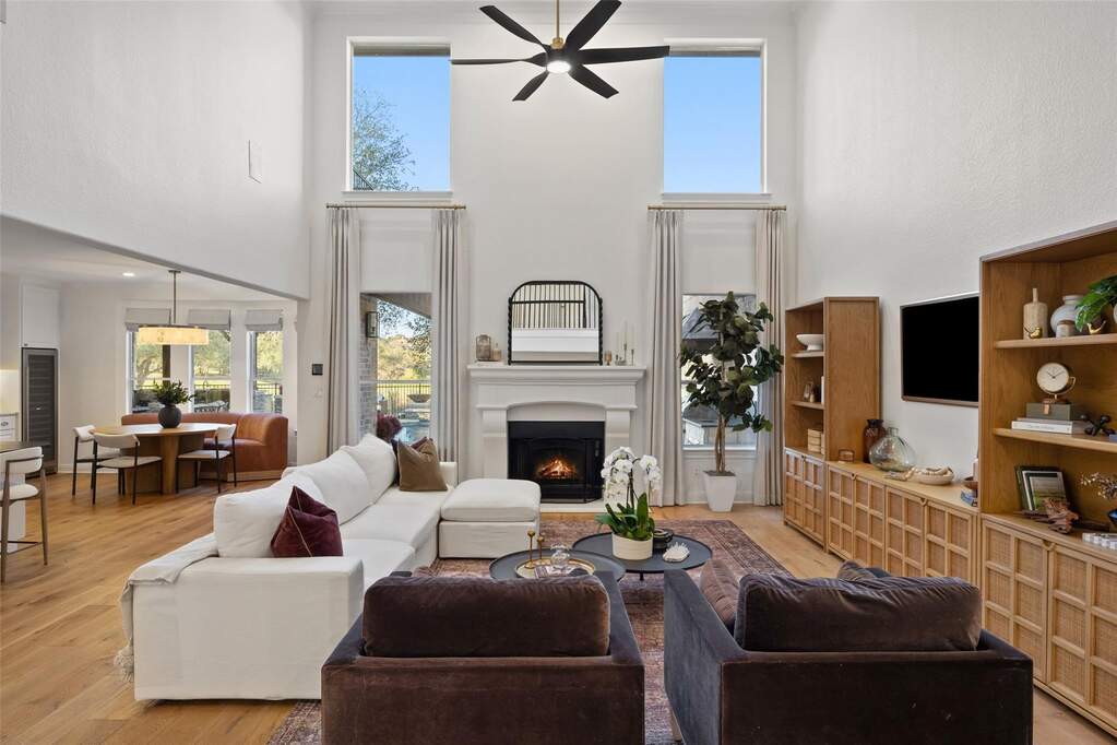 Located within the prestigious guard-gated community surrounding the The University of Texas Golf Club, Eagles Glen Estate offers a rare blend of Hill Country elegance, resort-style amenities, and an active lifestyle in the heart of Steiner Ranch. Designed for both entertaining and everyday living, the home opens with a grand foyer and soaring ceilings that lead into light-filled living spaces and a thoughtfully designed open floor plan. The updated kitchen features quartz countertops, stainless steel appliances, bar seating, and a breakfast area overlooking the expansive family room and stunning outdoor views. The outdoor living experience is nothing short of exceptional. A beautifully designed backyard retreat features a resort-style pool and spa with waterfall, a fully equipped outdoor kitchen, a covered living area with heaters for year-round enjoyment, and a separate pergola with a striking fire feature-creating multiple spaces for gathering and relaxation. Supporting a wellness-focused lifestyle, the home also includes a private Pilates studio and dedicated fitness gym, offering a convenient and inspiring space for daily movement and personal training. With four well-appointed bedrooms and an array of flexible living areas-including a main-level home office with custom built-ins, formal living and dining rooms, and an upstairs game and media room-the residence balances functionality with refined design. Residents enjoy convenient access to championship golf, tennis, dining, and a vibrant social atmosphere at The University of Texas Golf Club, along with the extensive amenities of Steiner Ranch, including community centers, pools, parks, hiking trails, and the Lake Austin lifestyle. Eagles Glen Estate presents a unique opportunity to experience resort-style Hill Country living in one of Austin's most sought-after golf communities.
