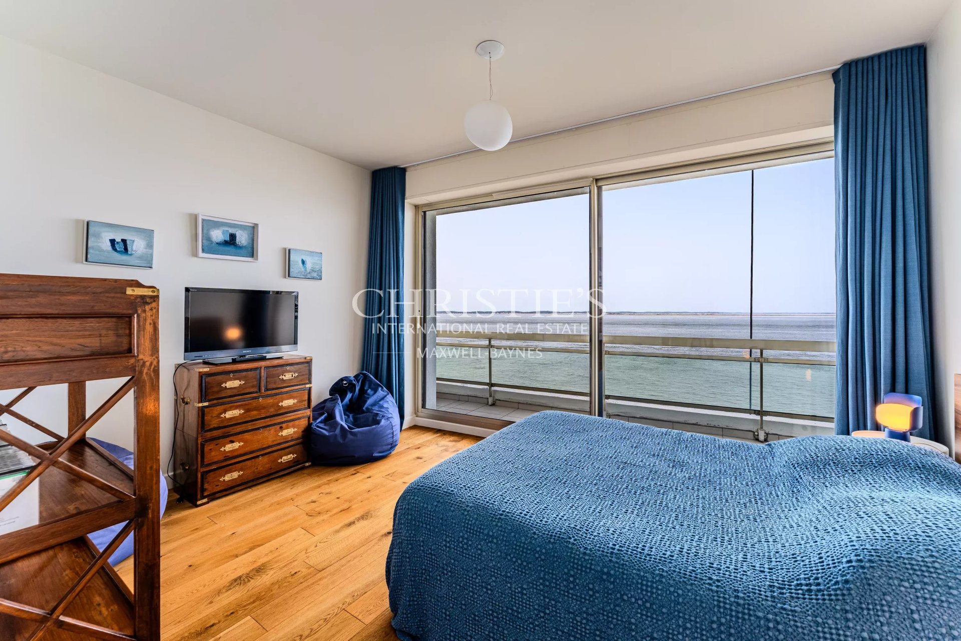 To the North, a balcony offers panoramic views over Arcachon Bay, accessible from several rooms of the apartment.