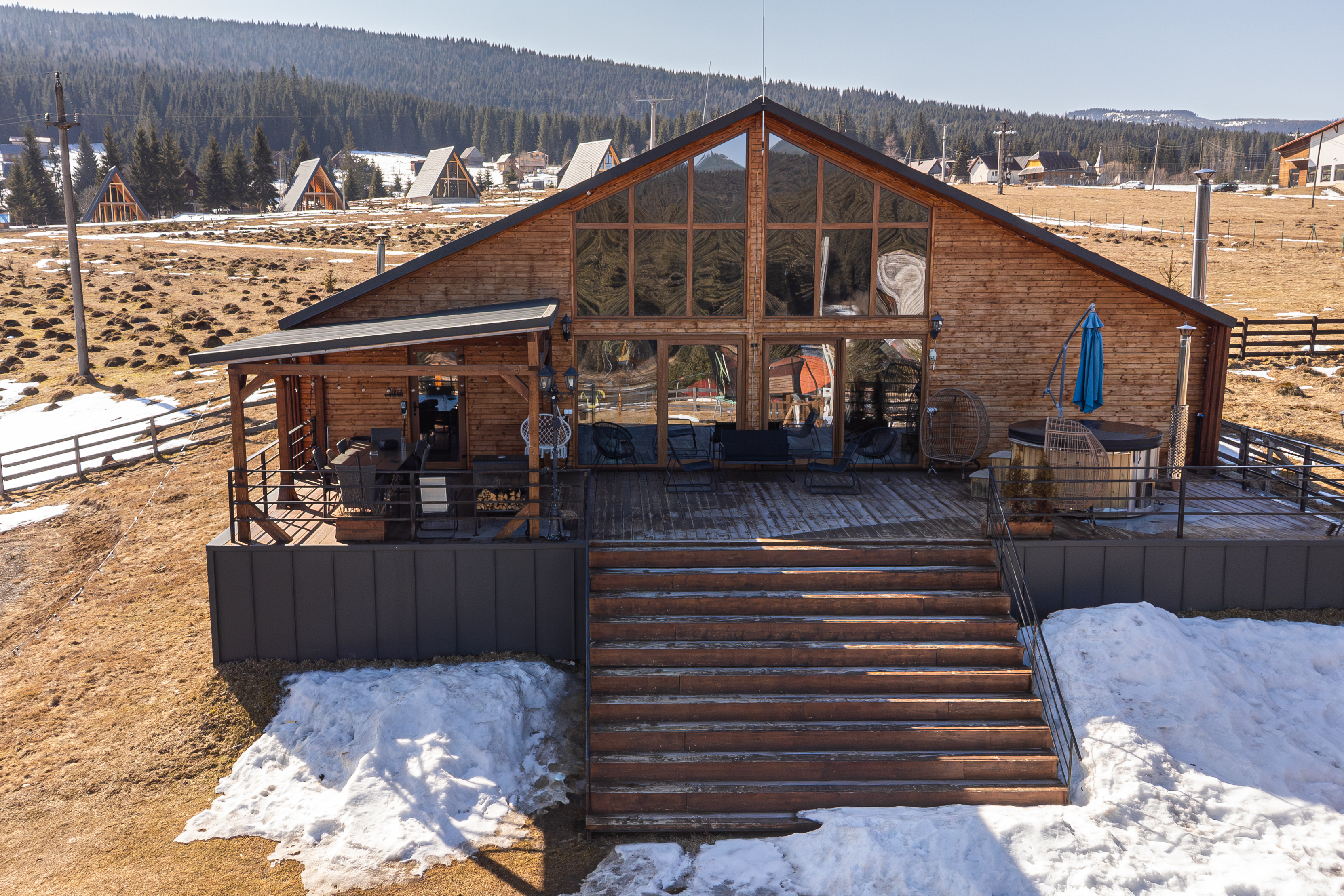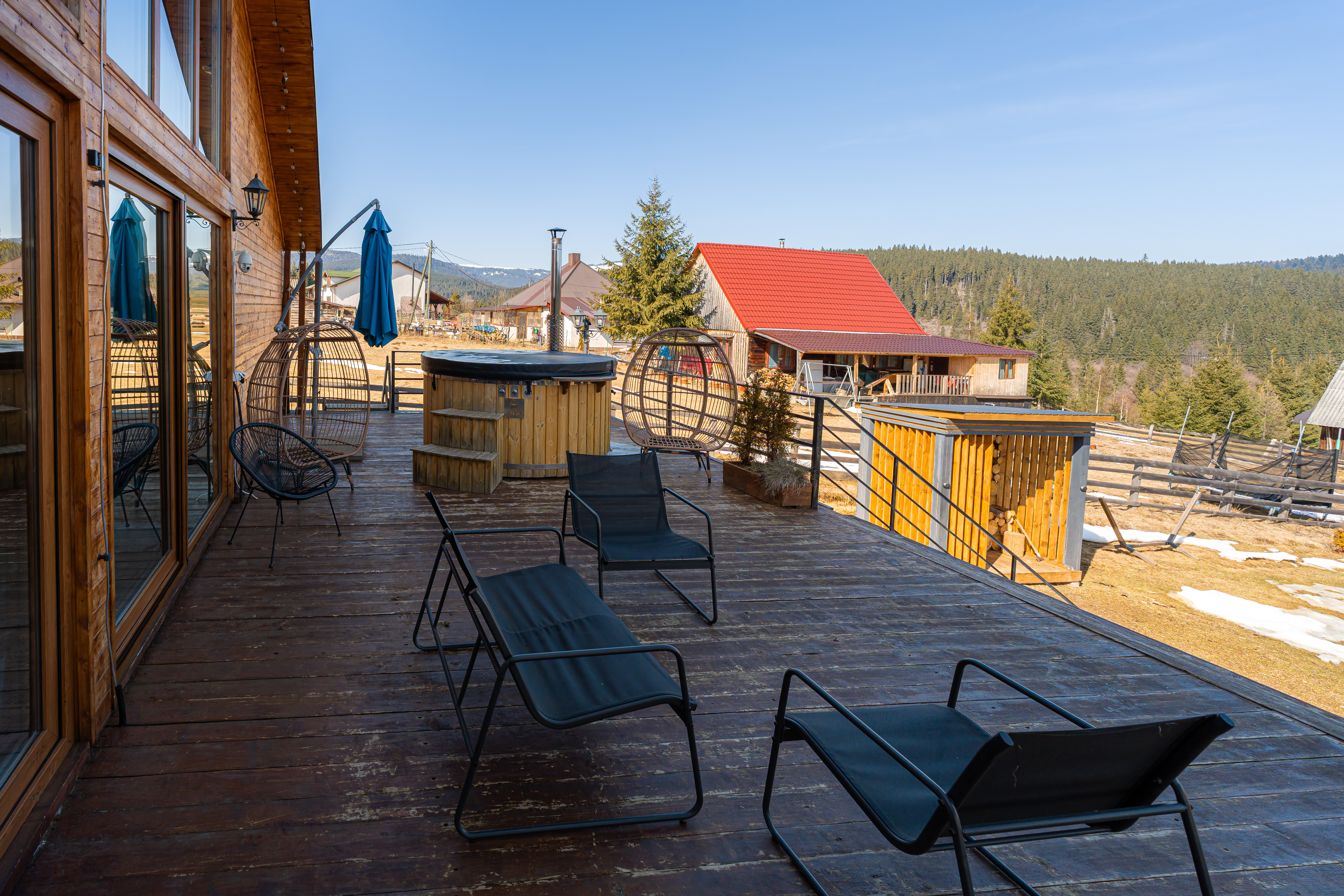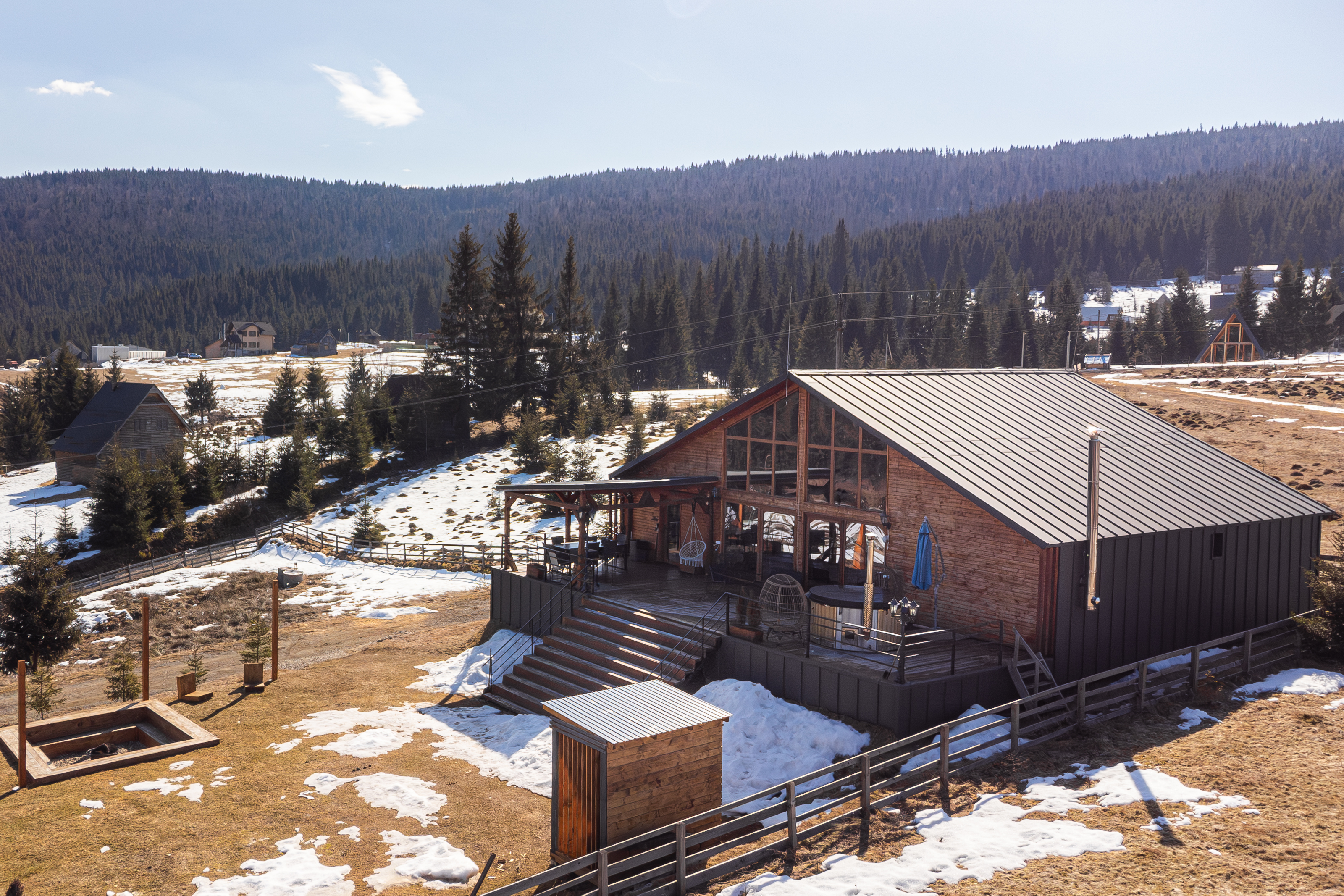 The sleeping quarters comprise five bedrooms, each with its own en-suite bathroom — a configuration ideally suited for hosting multiple families or groups while preserving privacy, a key advantage for premium rental operations. A panoramic terrace extends the interior toward the outdoors, while the exterior amenities, including a hot tub overlooking nature and a dedicated fire-pit area, create an inviting environment for relaxation throughout all seasons, from cool summer evenings to the dramatic landscapes of winter. The expansive grounds further provide generous green space for outdoor leisure, including areas well suited for families and children.