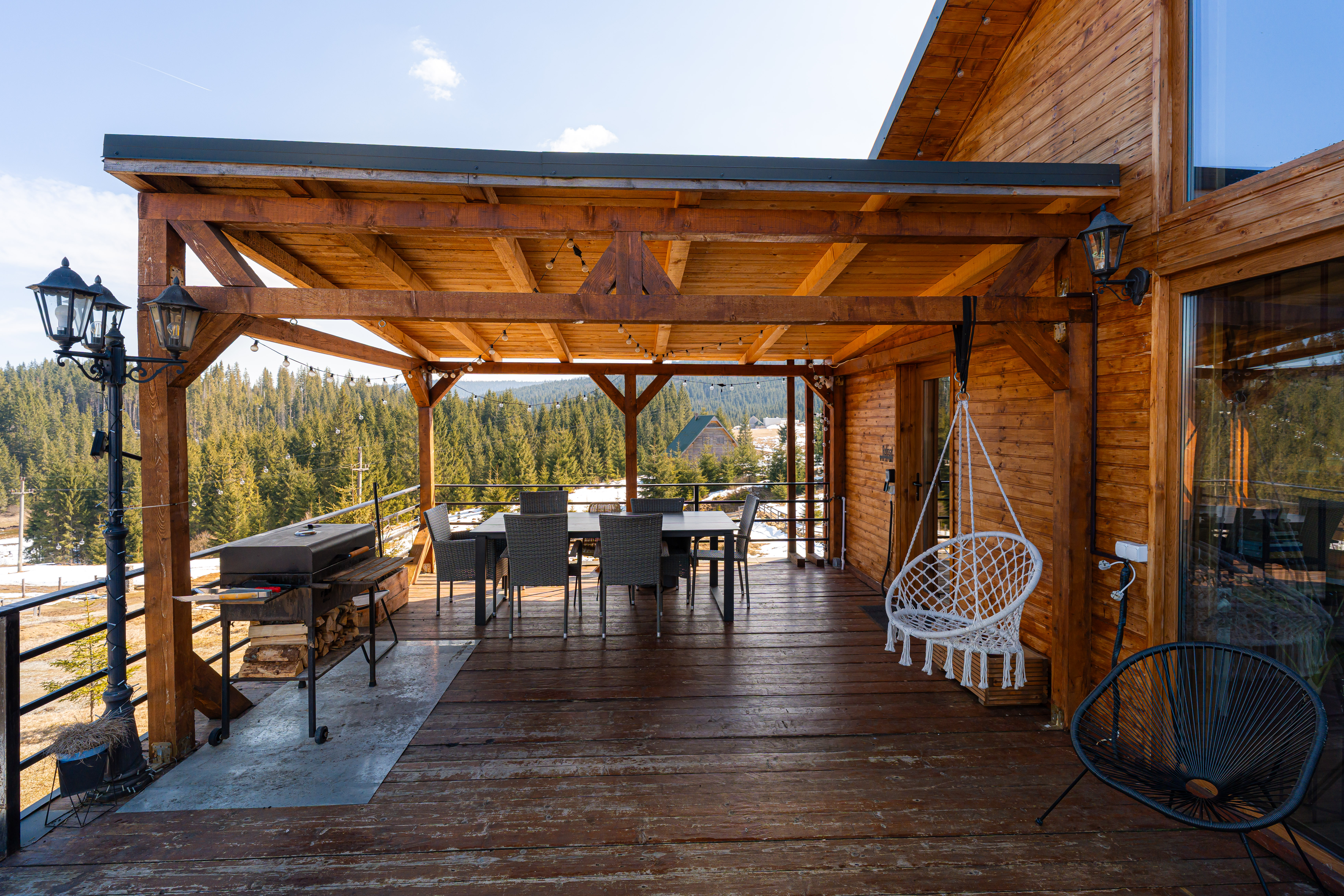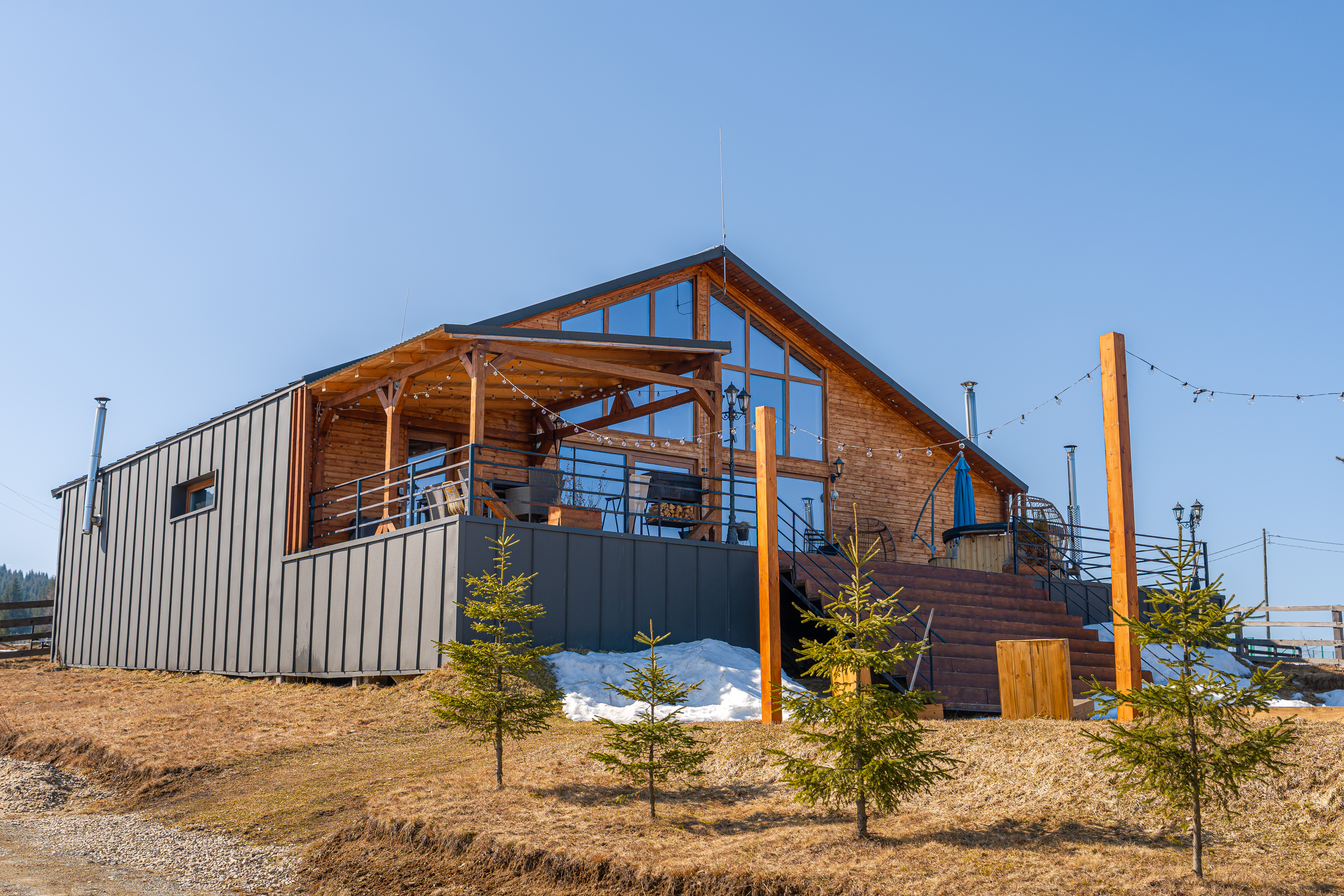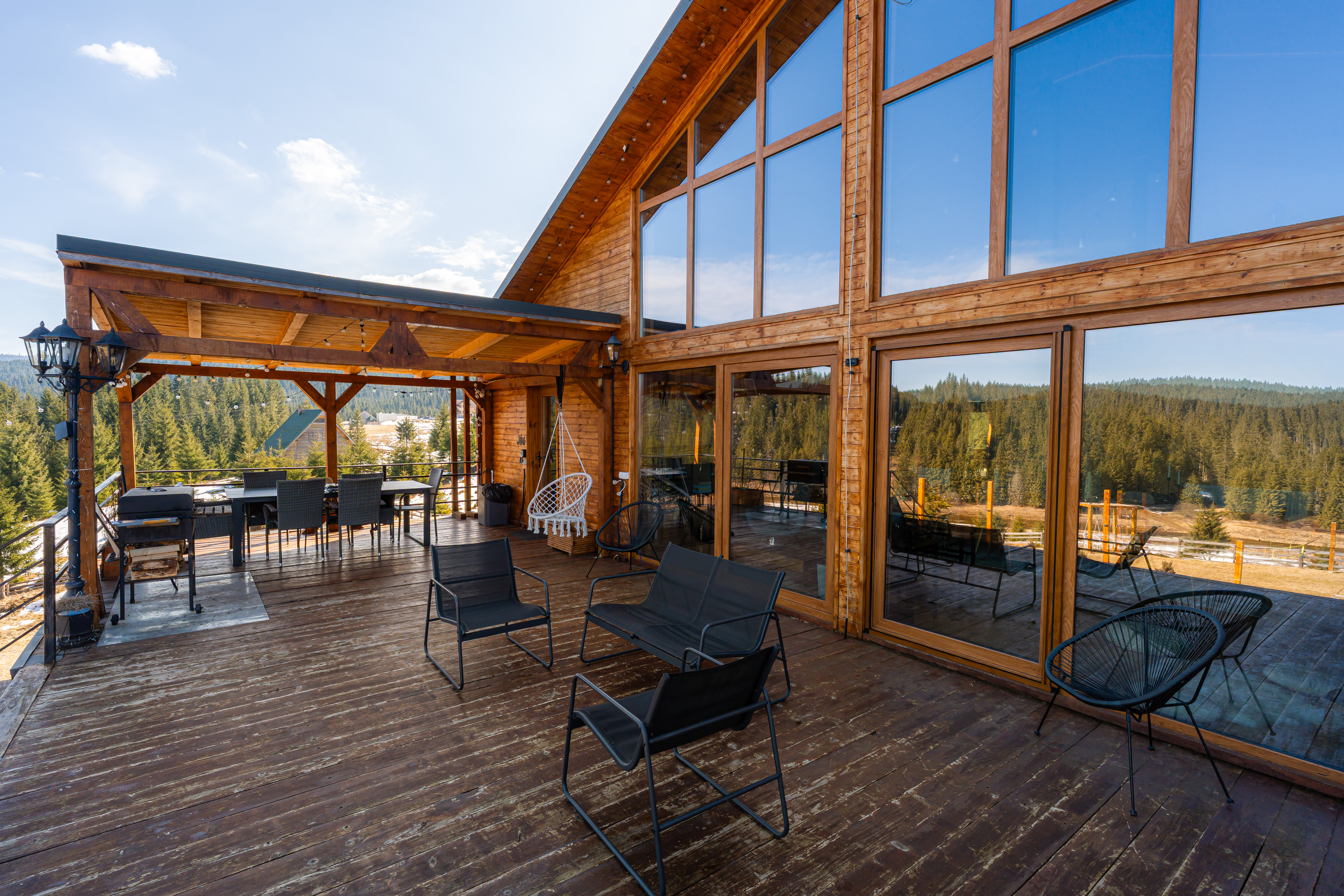 The sleeping quarters comprise five bedrooms, each with its own en-suite bathroom — a configuration ideally suited for hosting multiple families or groups while preserving privacy, a key advantage for premium rental operations. A panoramic terrace extends the interior toward the outdoors, while the exterior amenities, including a hot tub overlooking nature and a dedicated fire-pit area, create an inviting environment for relaxation throughout all seasons, from cool summer evenings to the dramatic landscapes of winter. The expansive grounds further provide generous green space for outdoor leisure, including areas well suited for families and children.